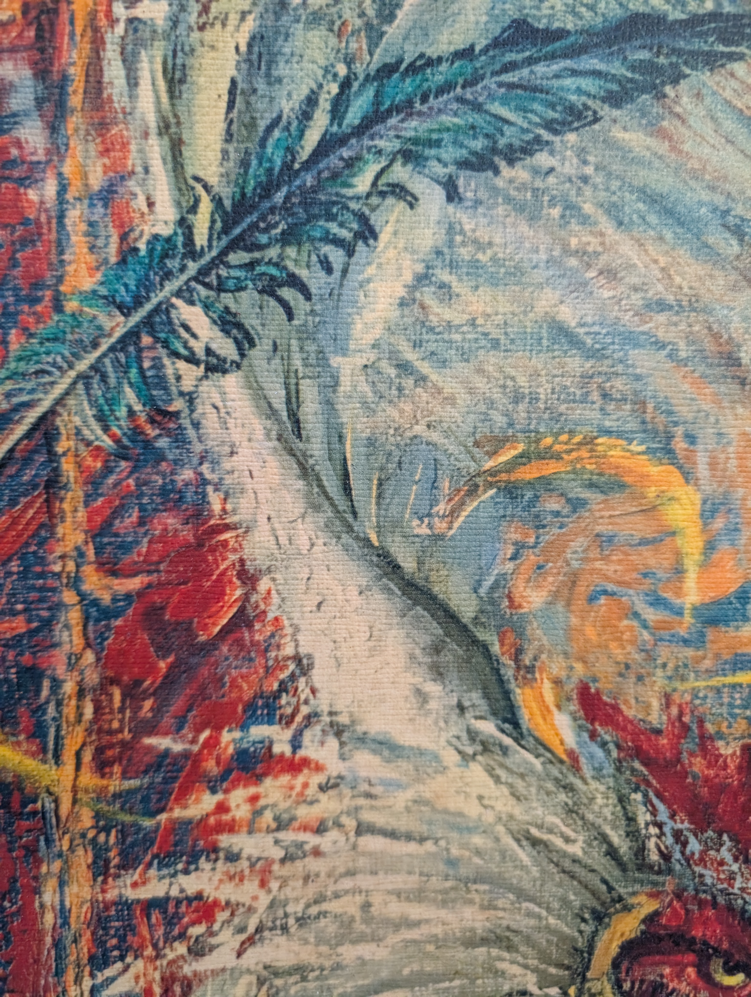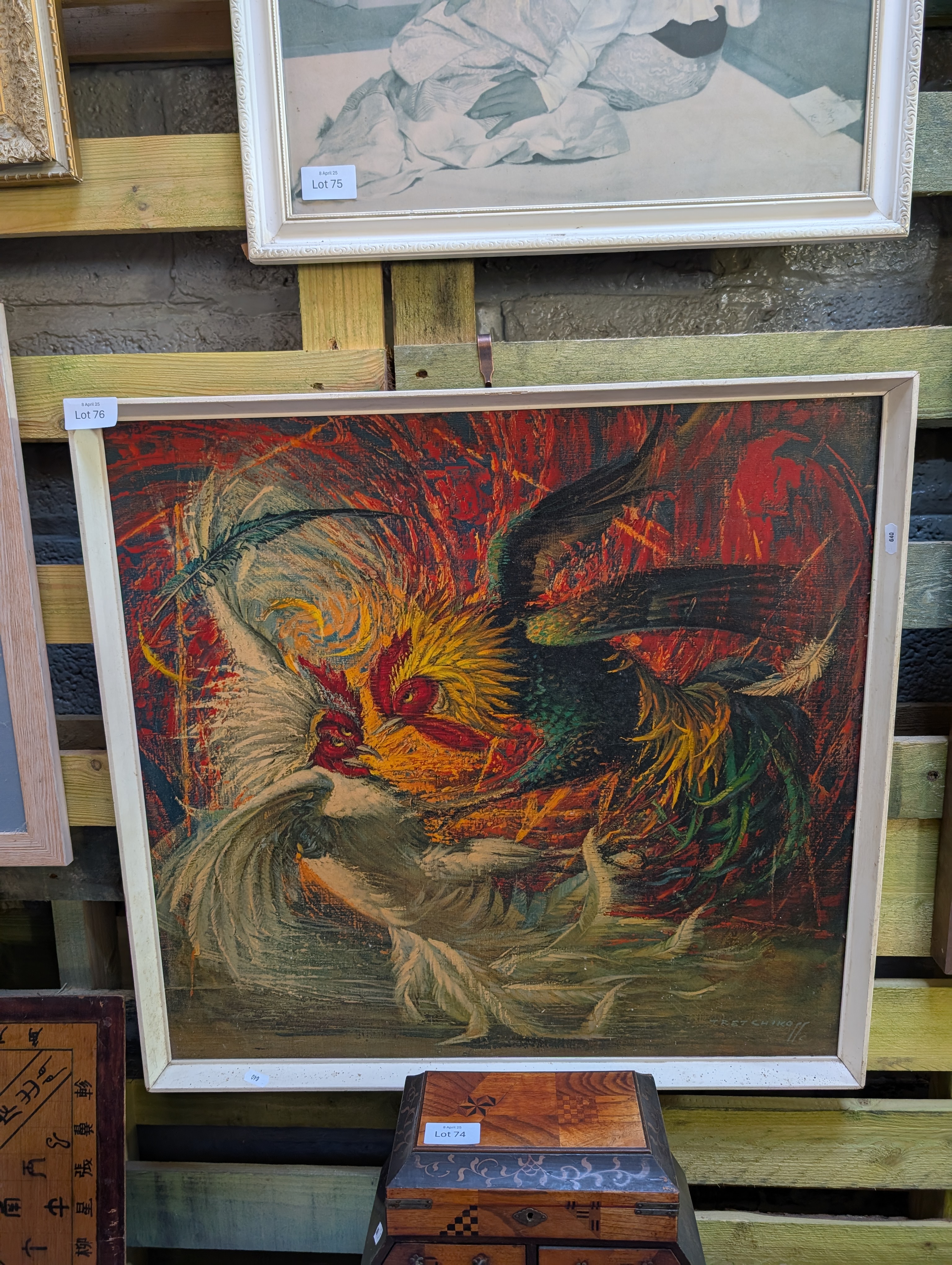 A mid-century print on board after Tretchikoff of two cocks fighting