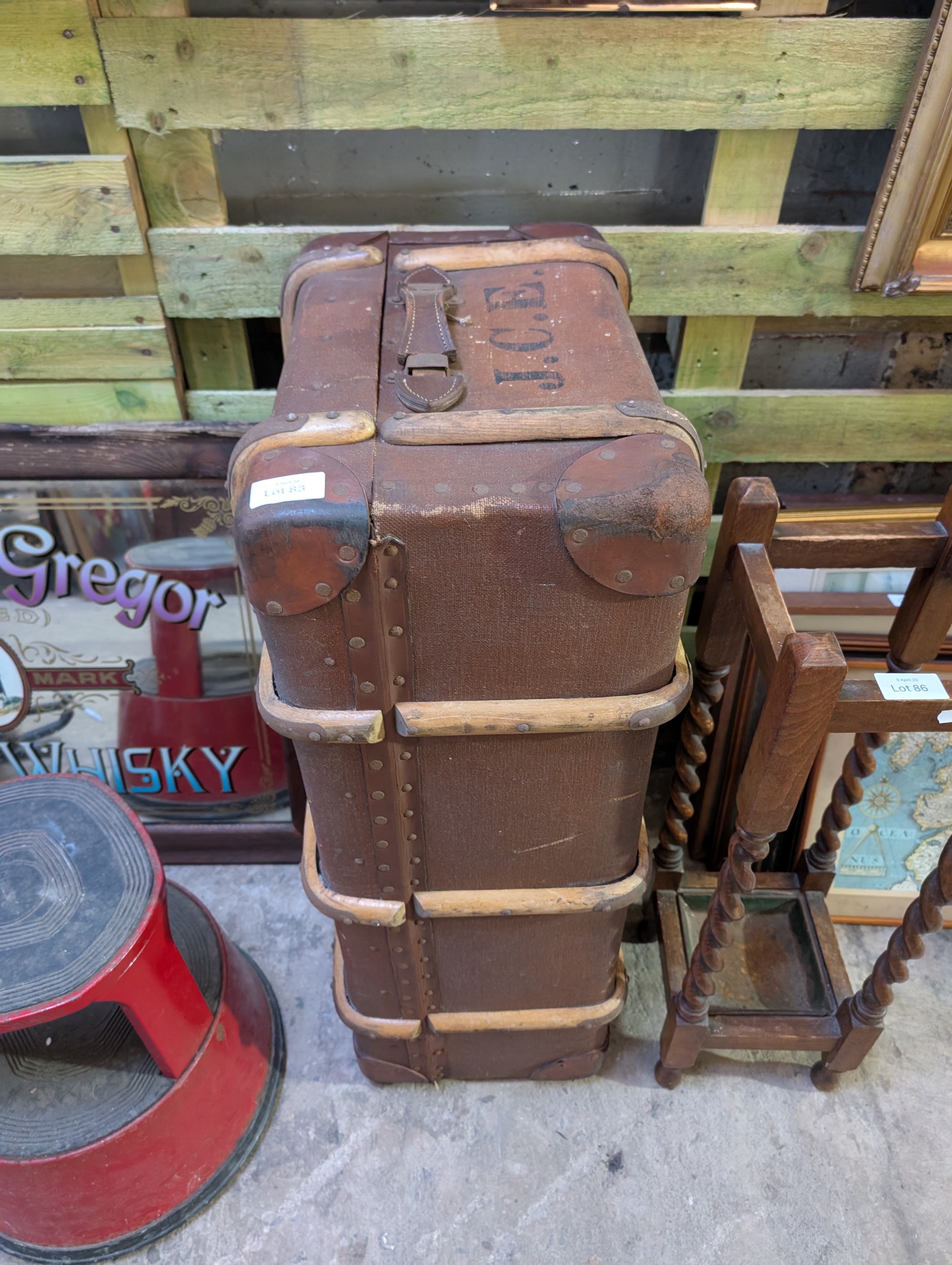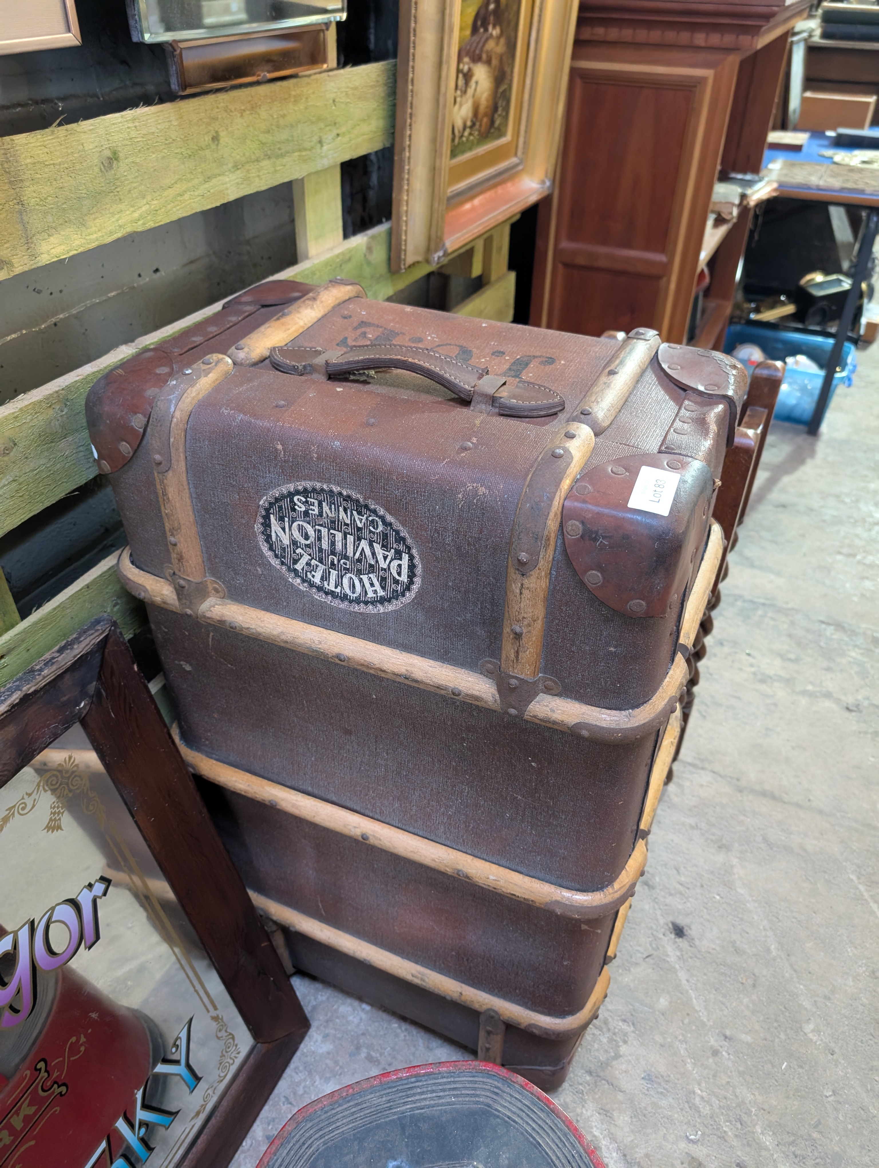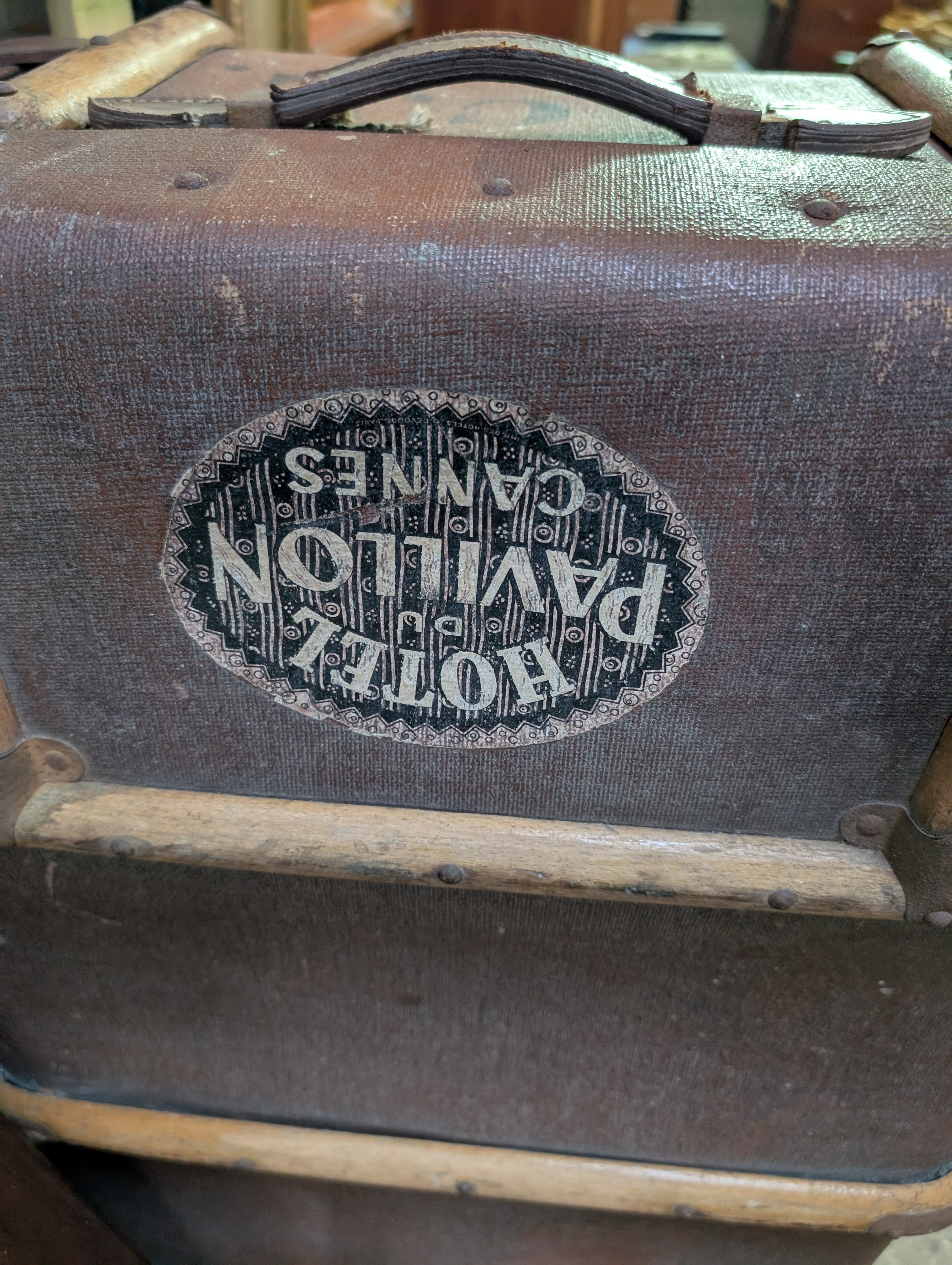 A vintage luggage case marked J.C.E with Hotel Du Pavillion badge