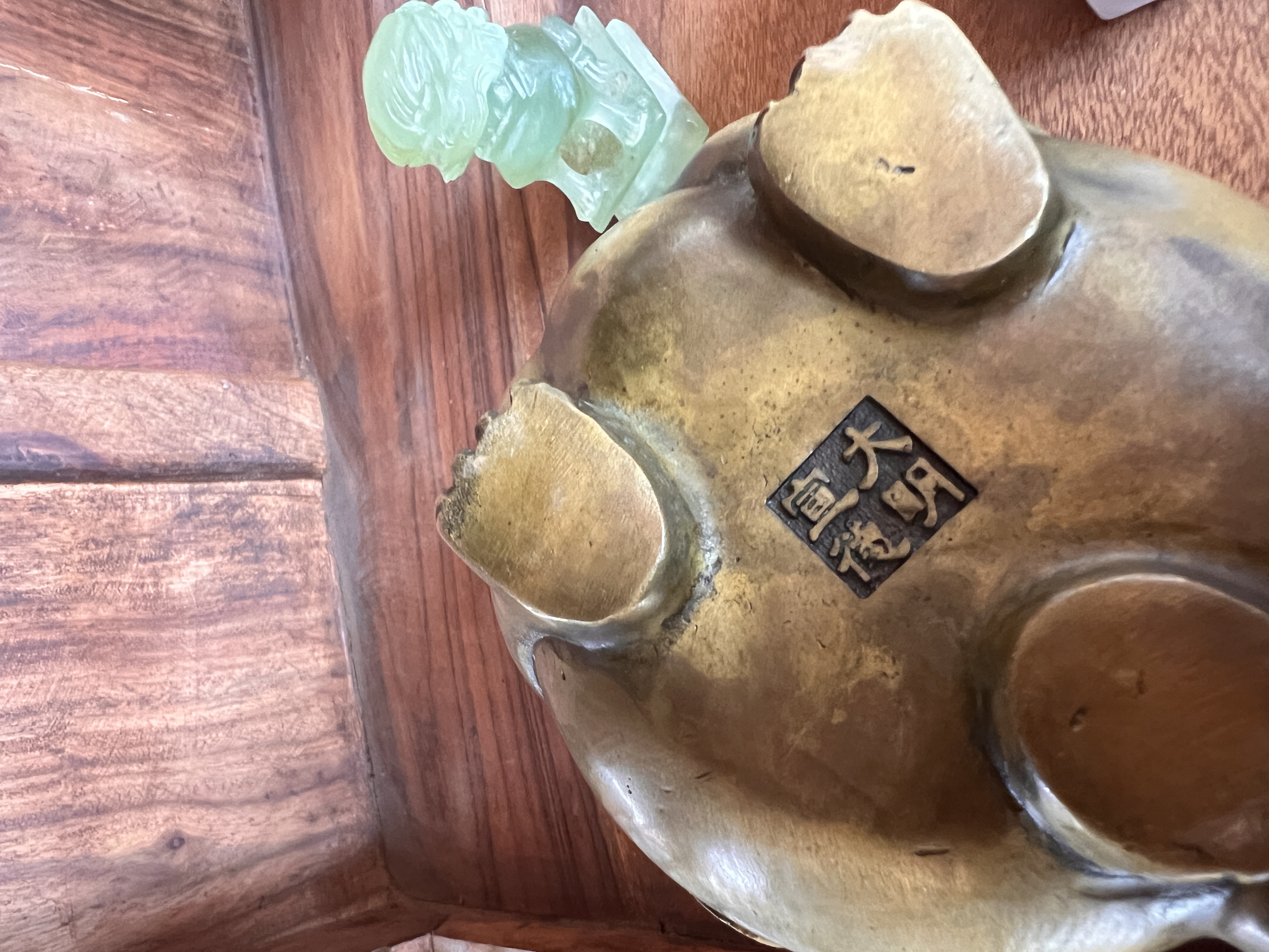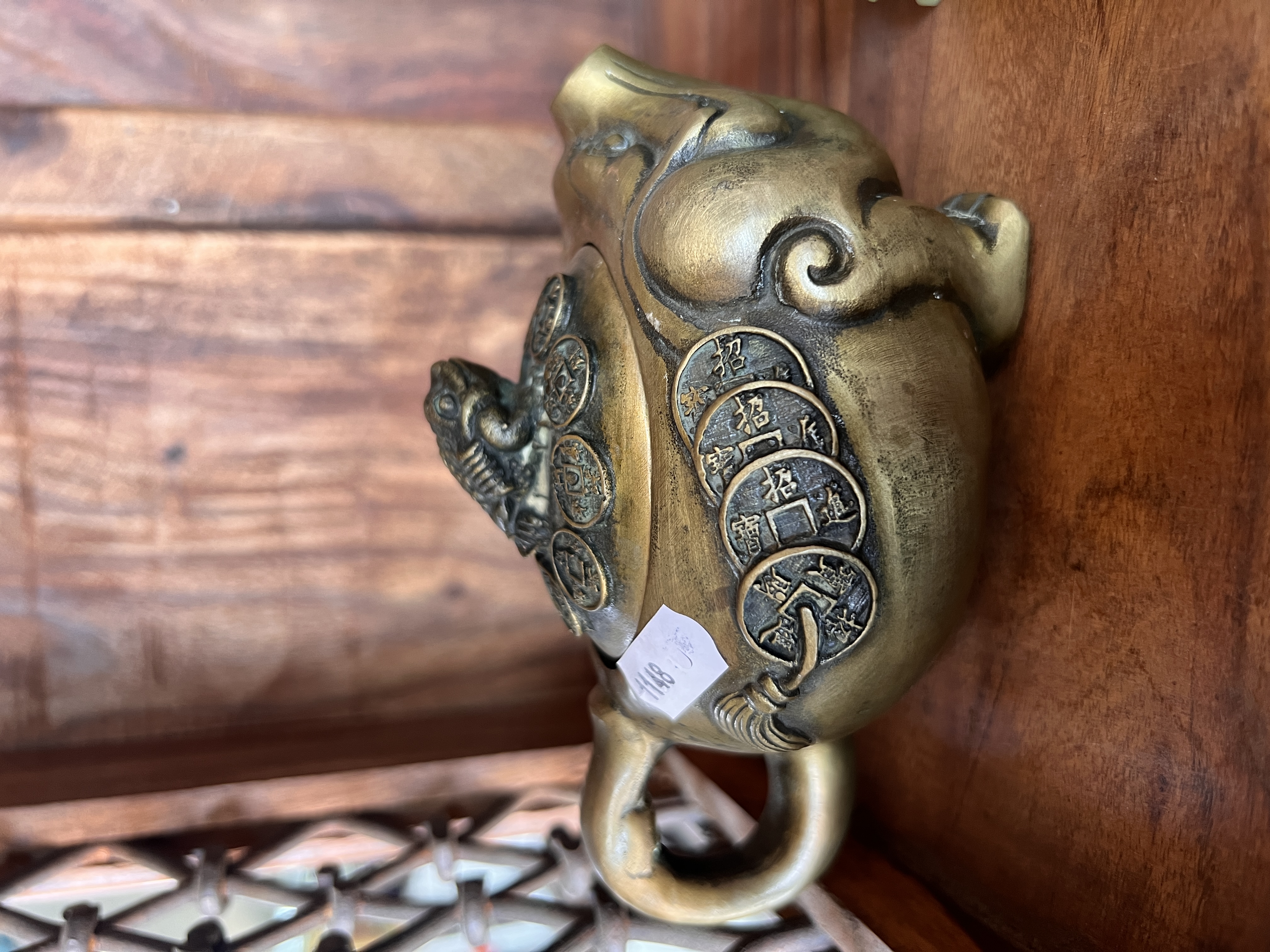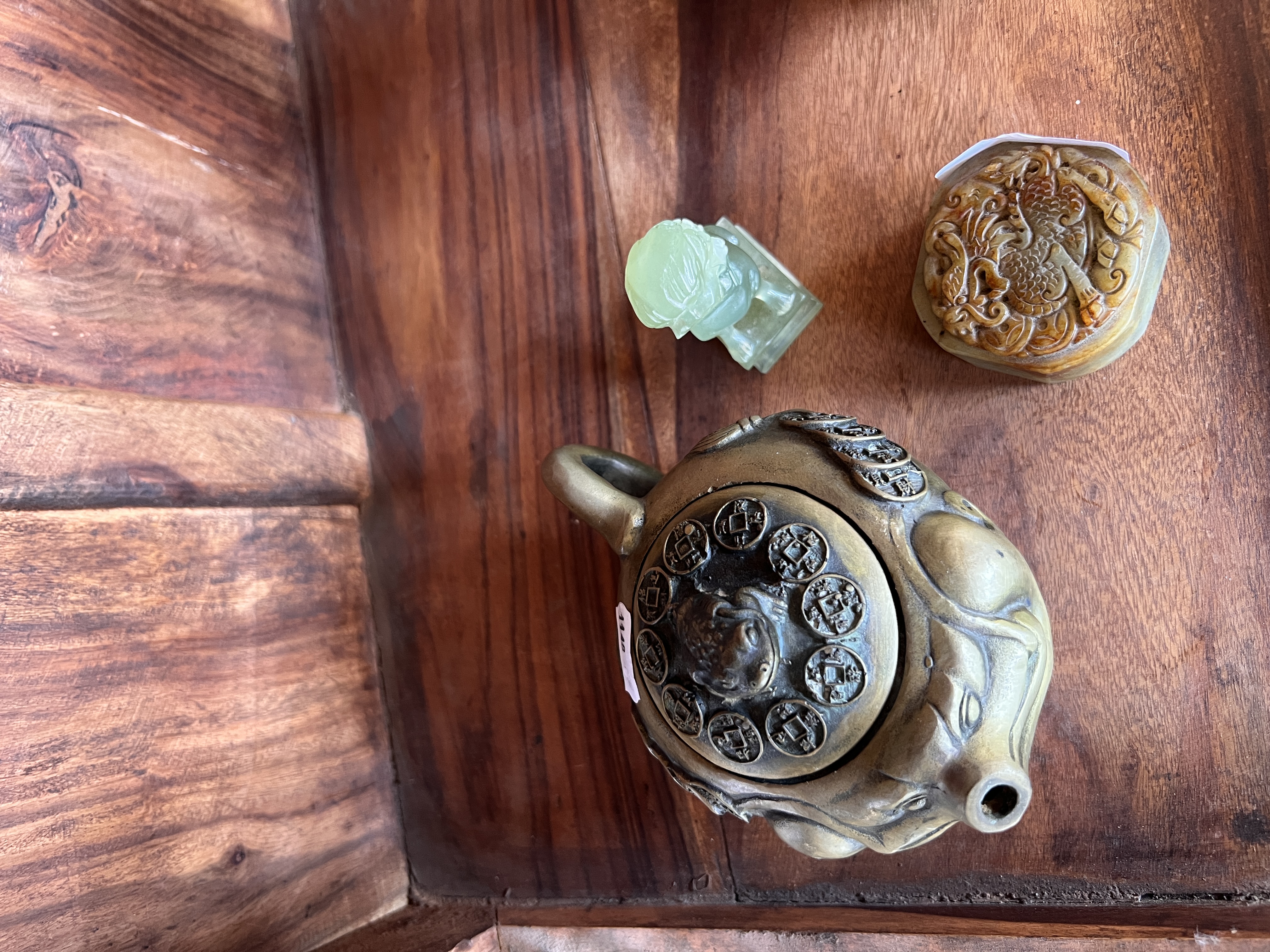 A 19th century Chinese bronze cast tea pot in the form of a toad decorated with lucky coins and bearing seal stamp to base, also with seal stamp and Jade Fu dog.