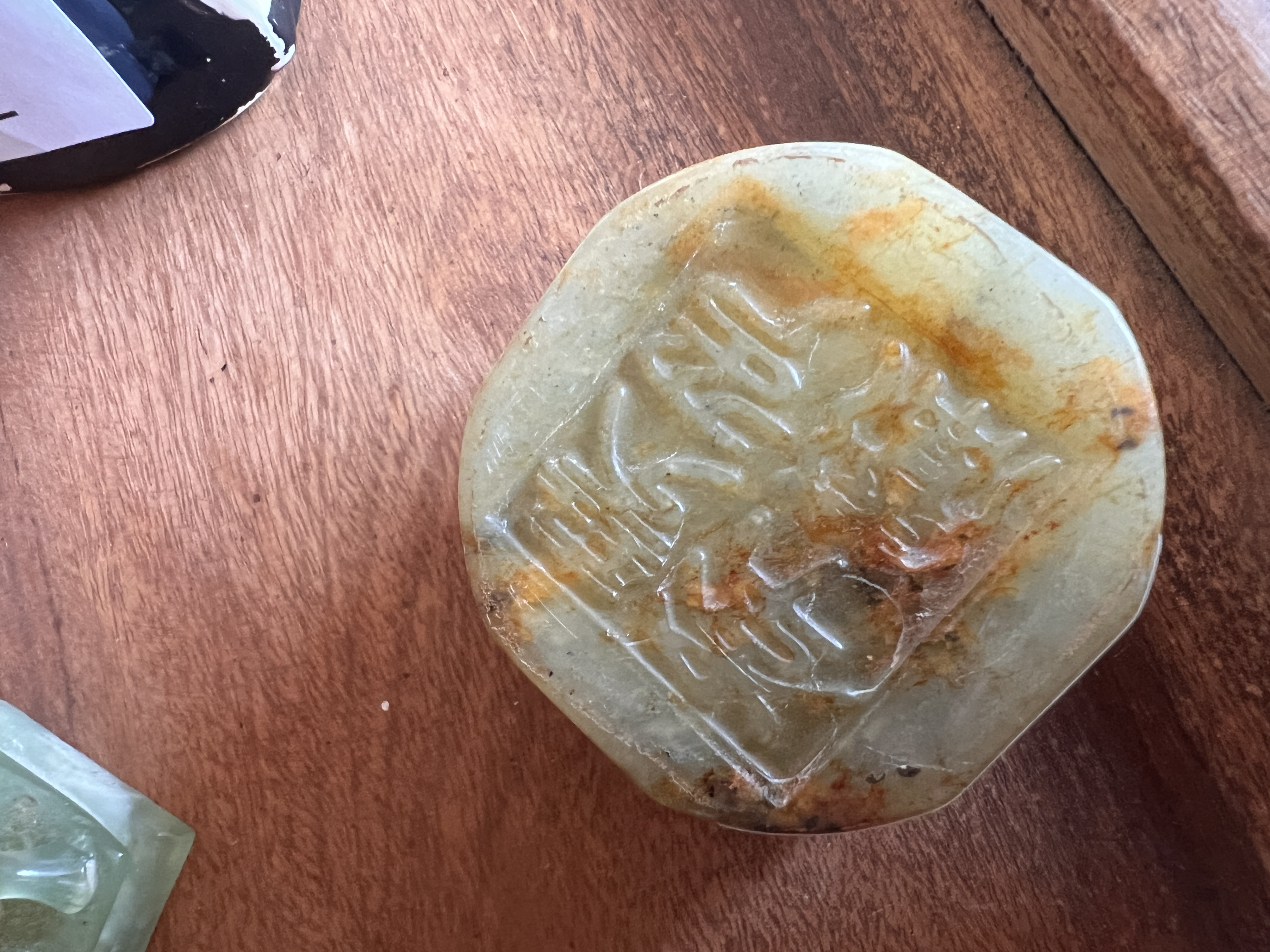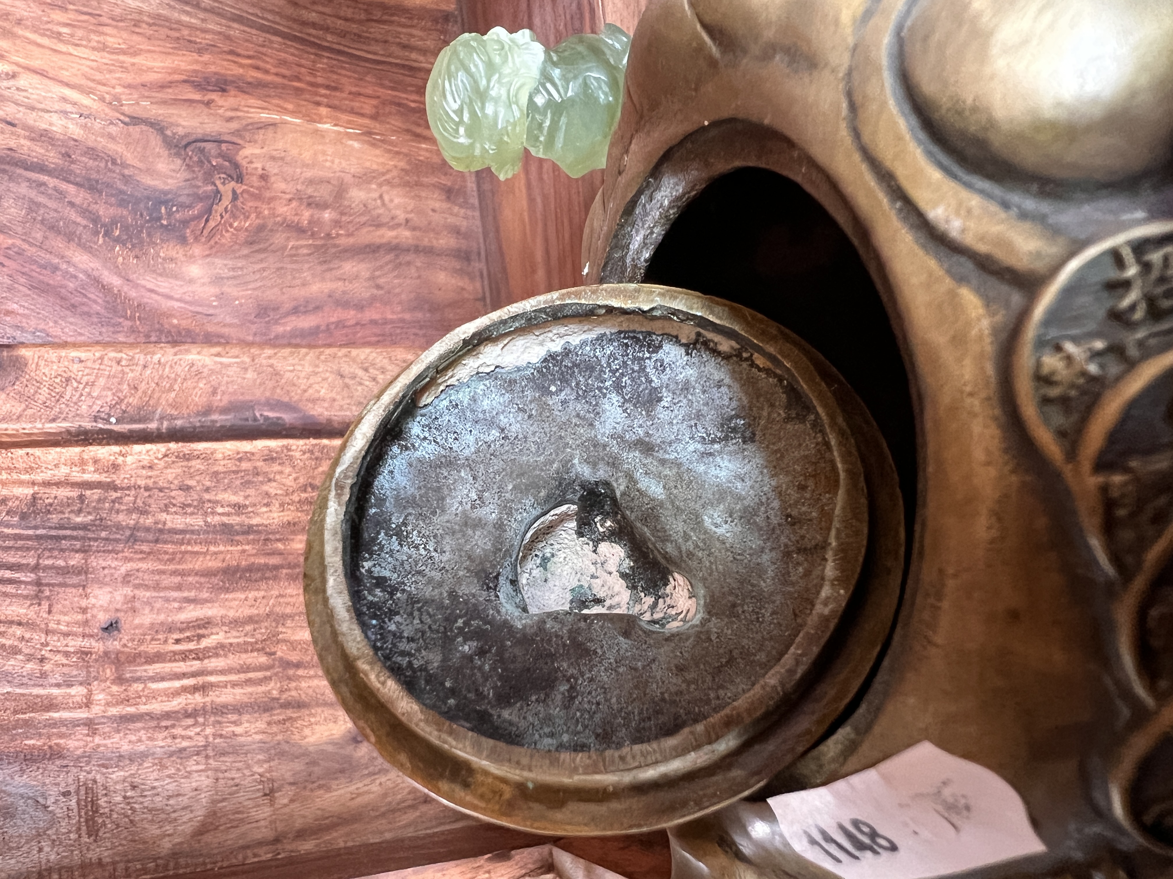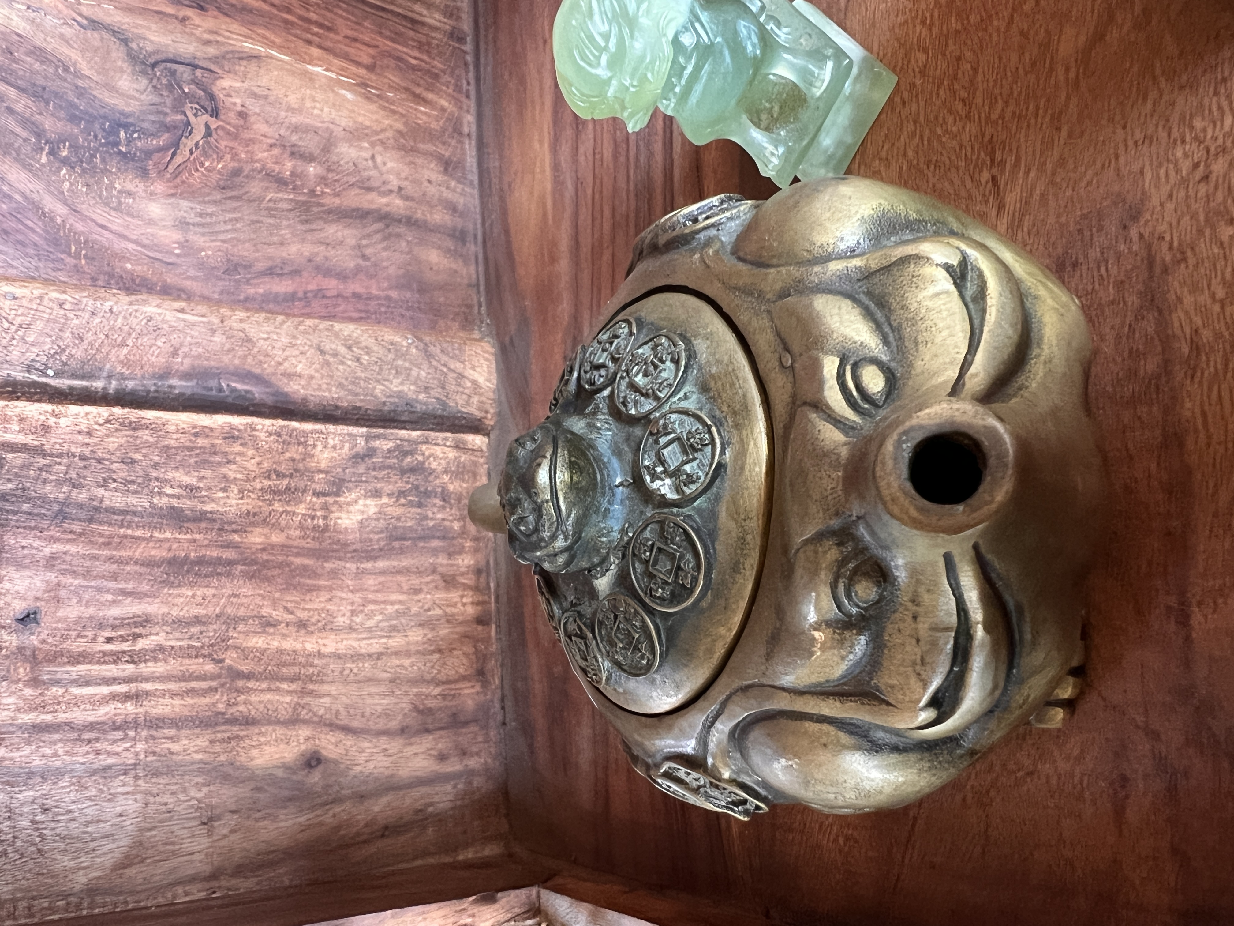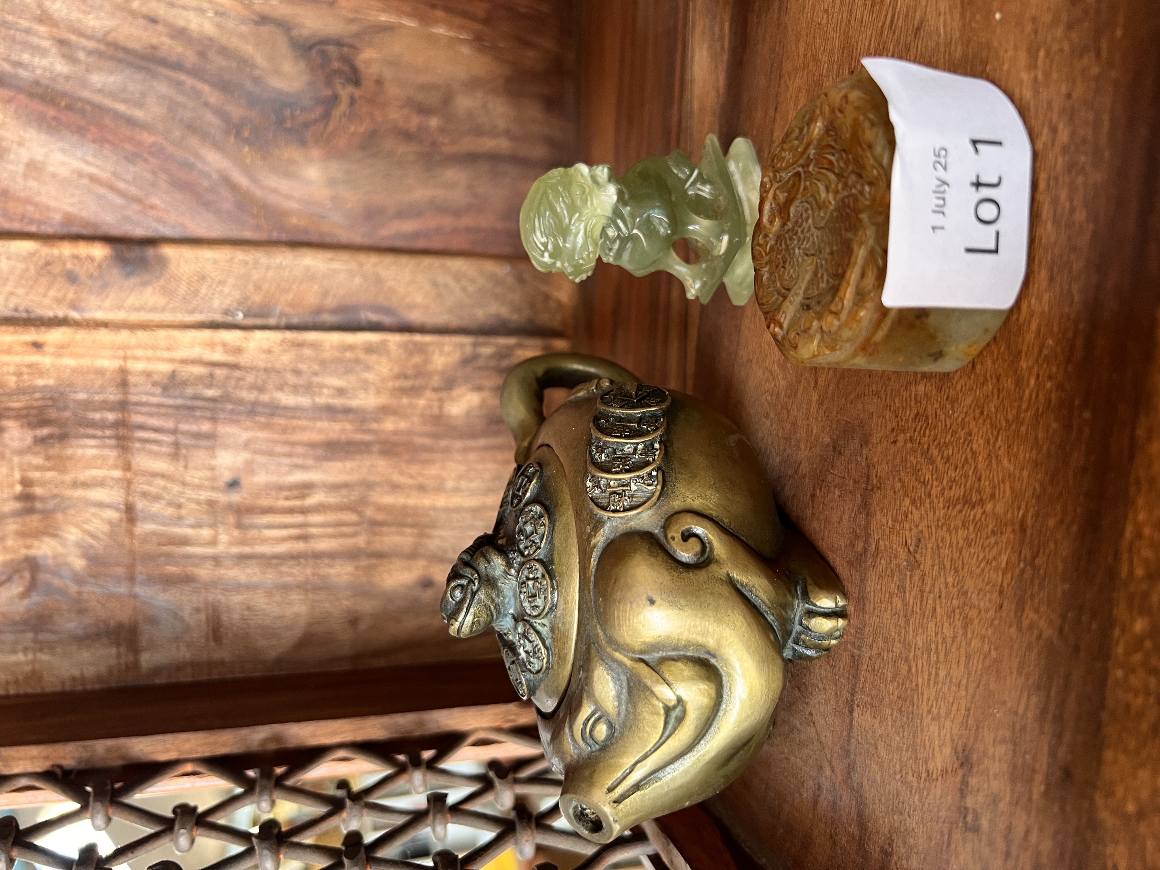 A 19th century Chinese bronze cast tea pot in the form of a toad decorated with lucky coins and bearing seal stamp to base, also with seal stamp and Jade Fu dog.