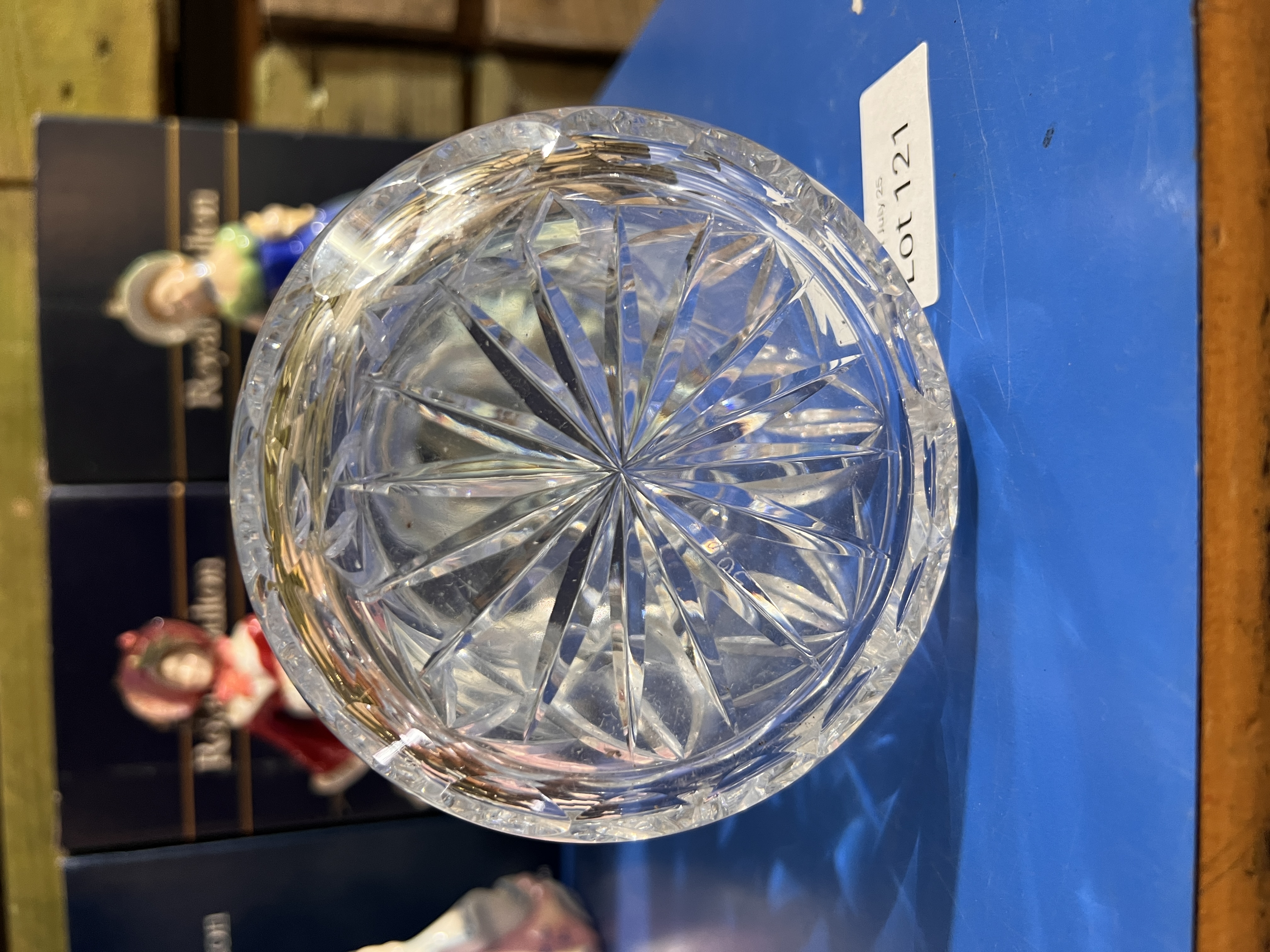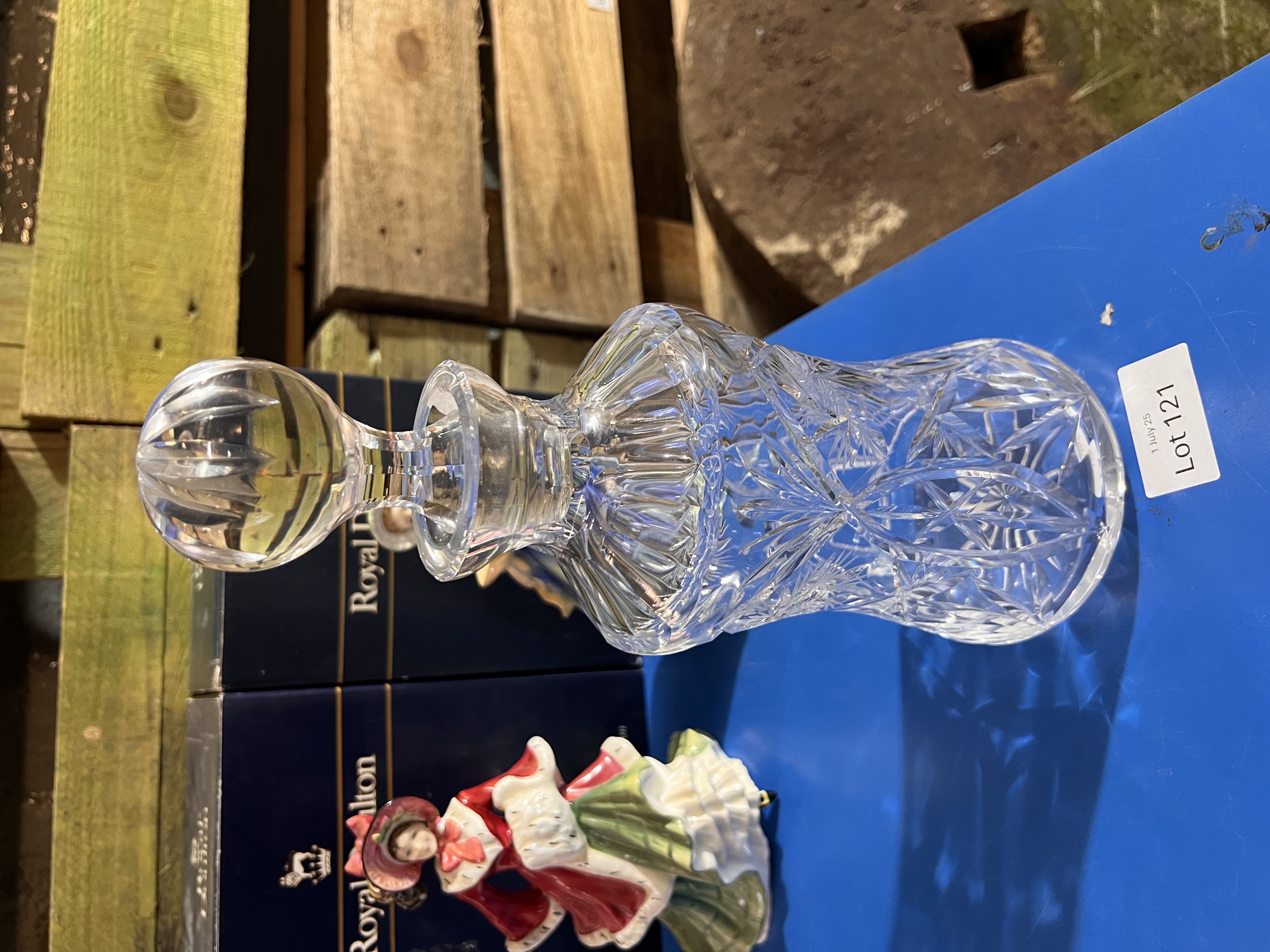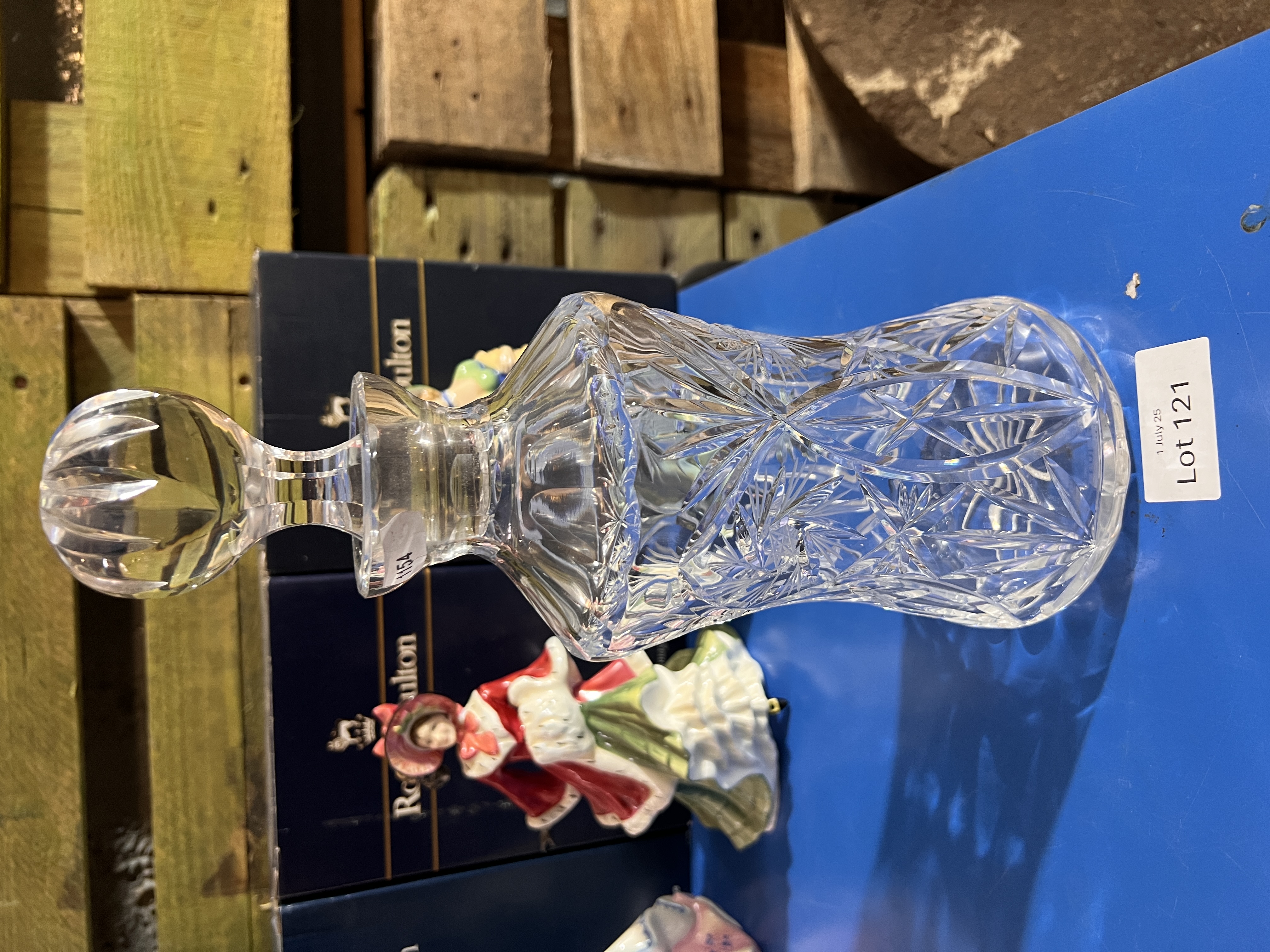 A clear cut crystal glass decanter.