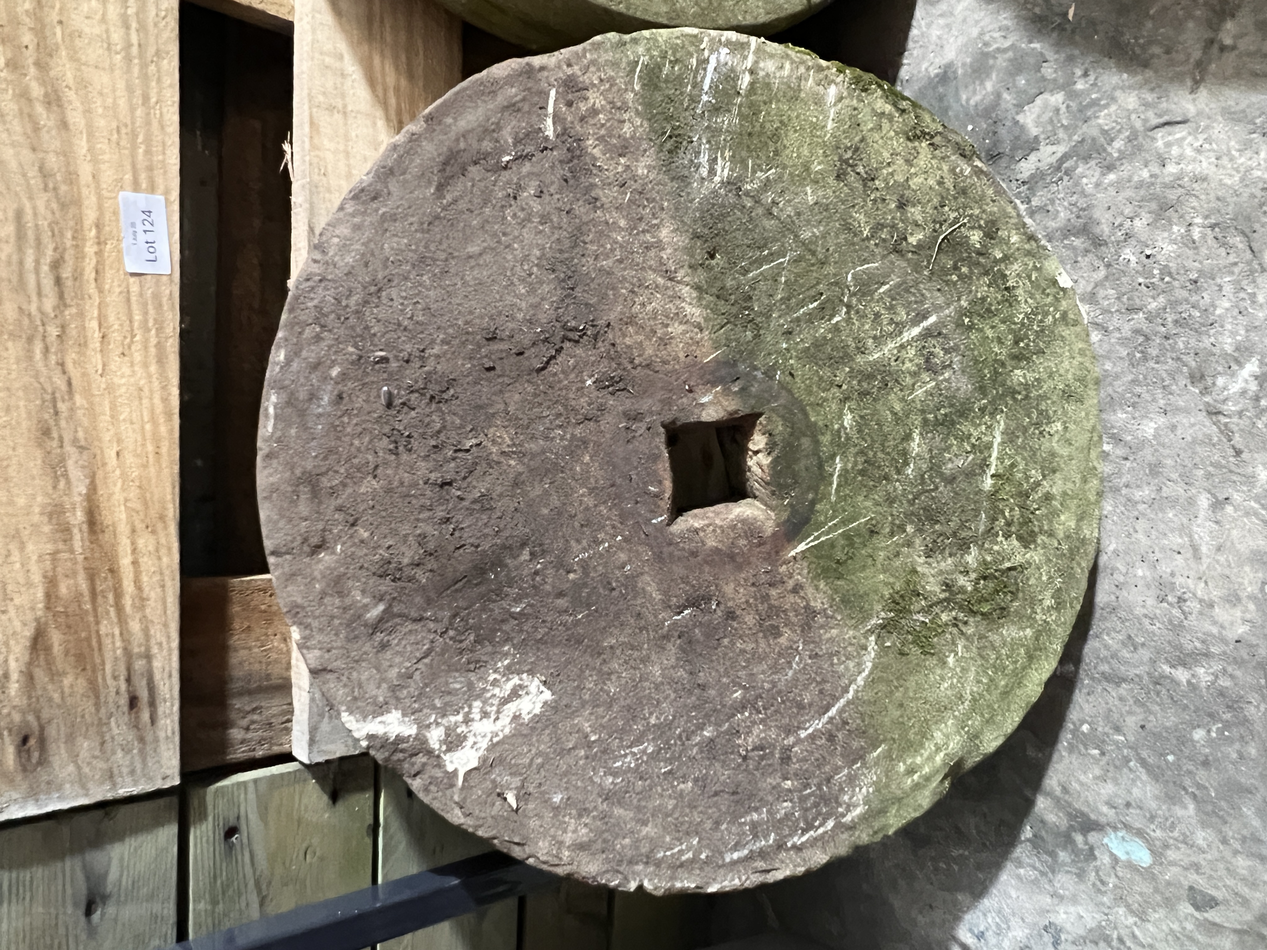 A sand stone milling stone 55cm wide 9cm deep.