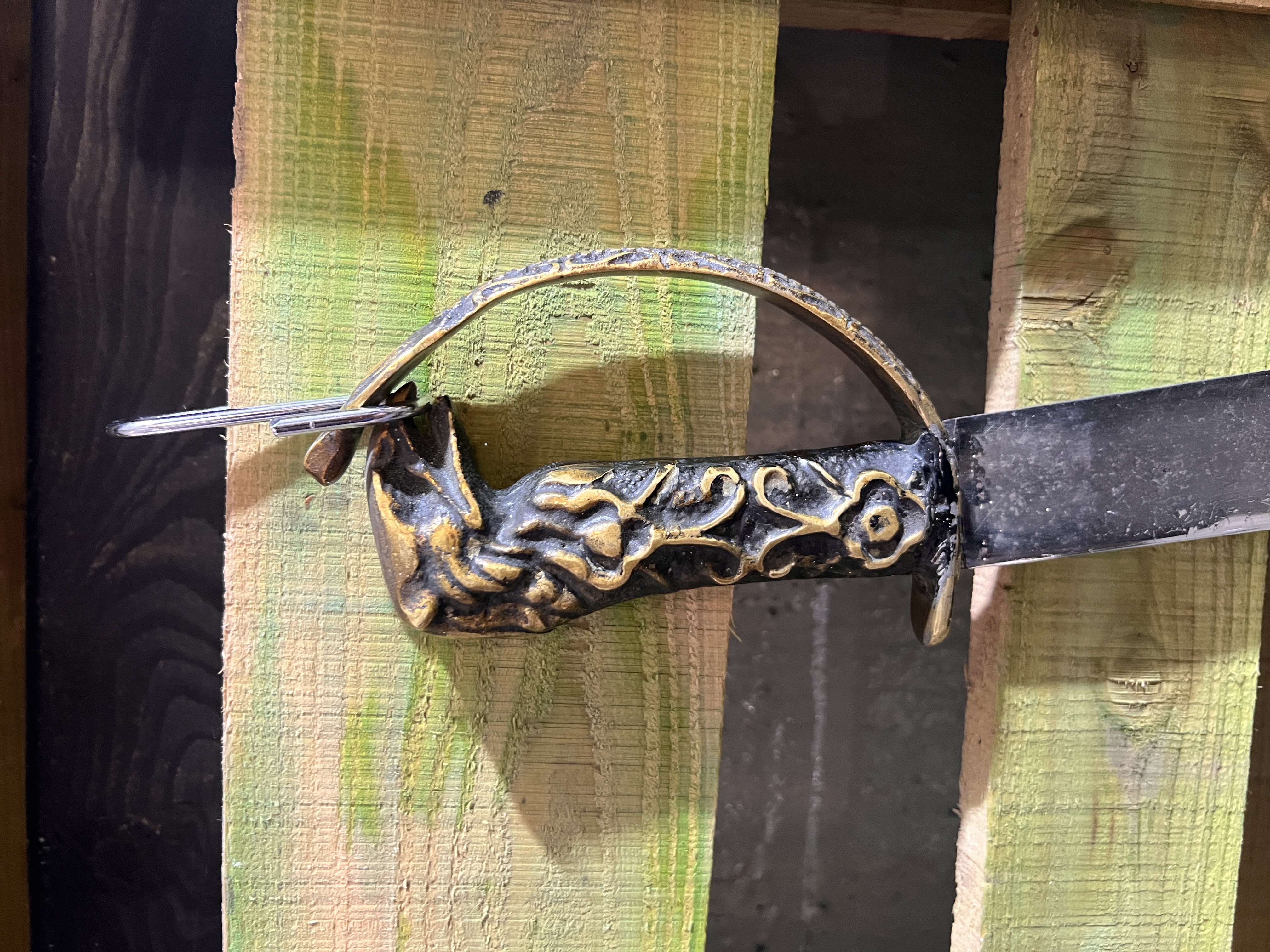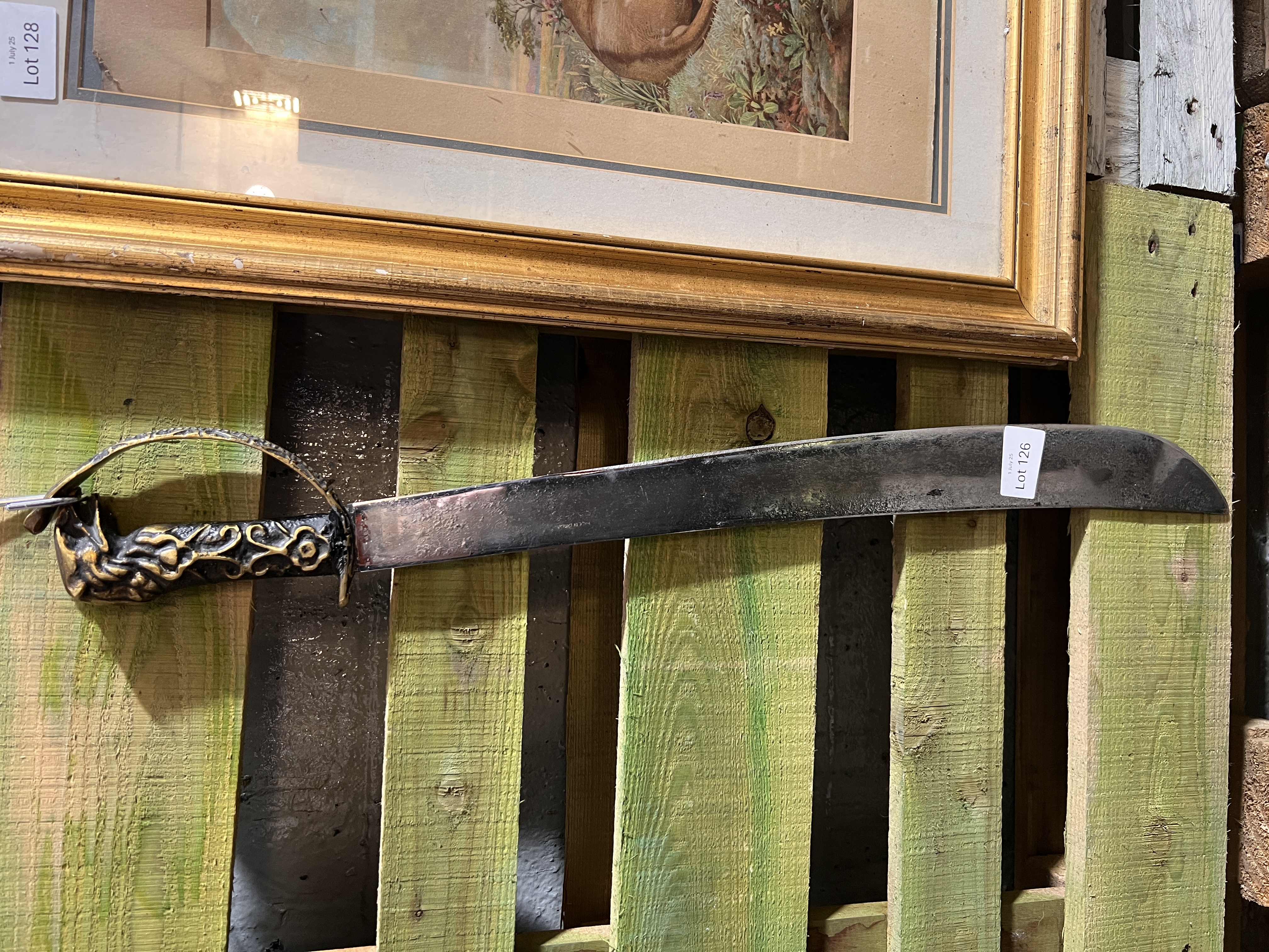 A replica pirate-style sabre sword 73cm long with brass lion’s head handle.