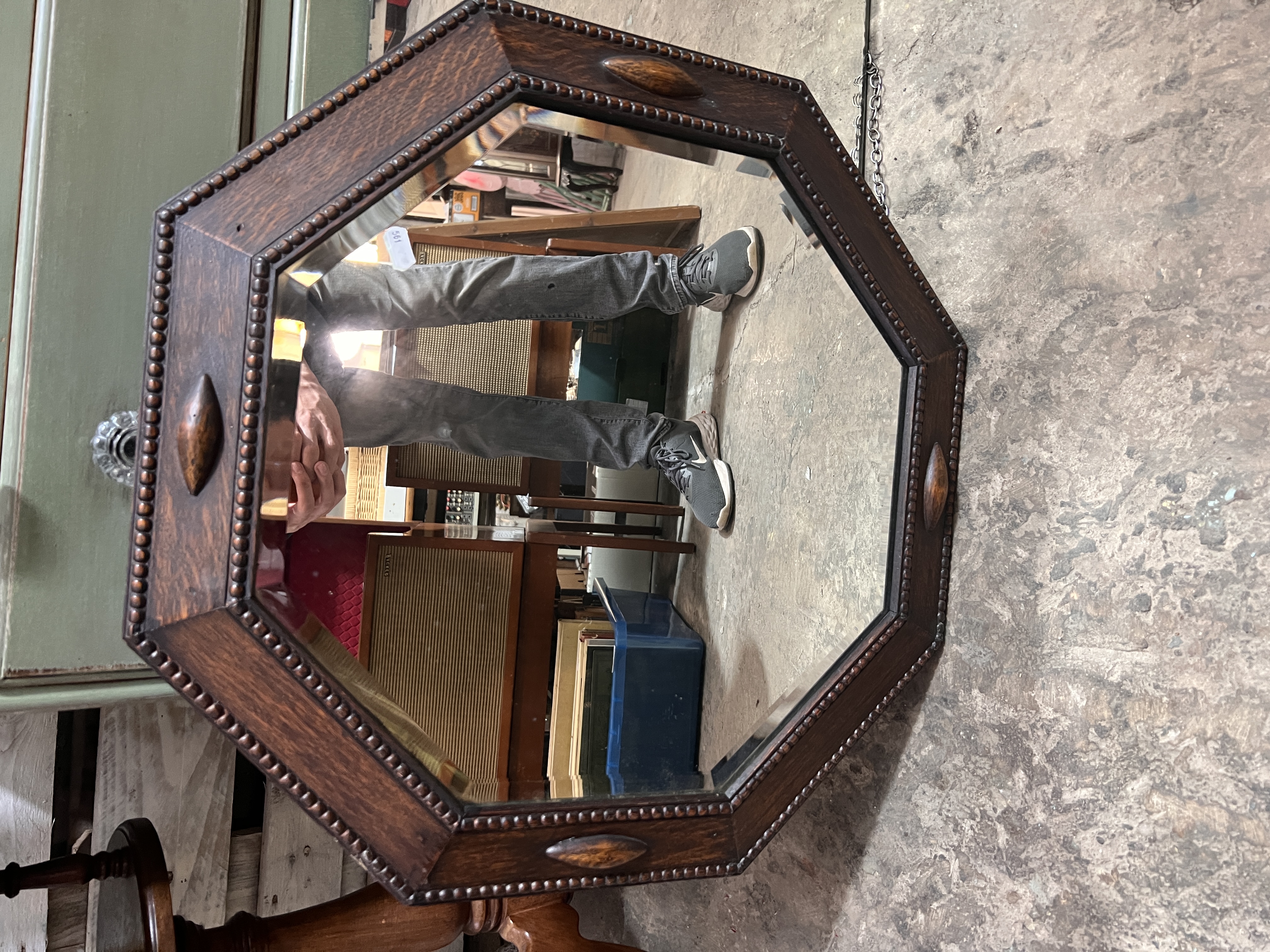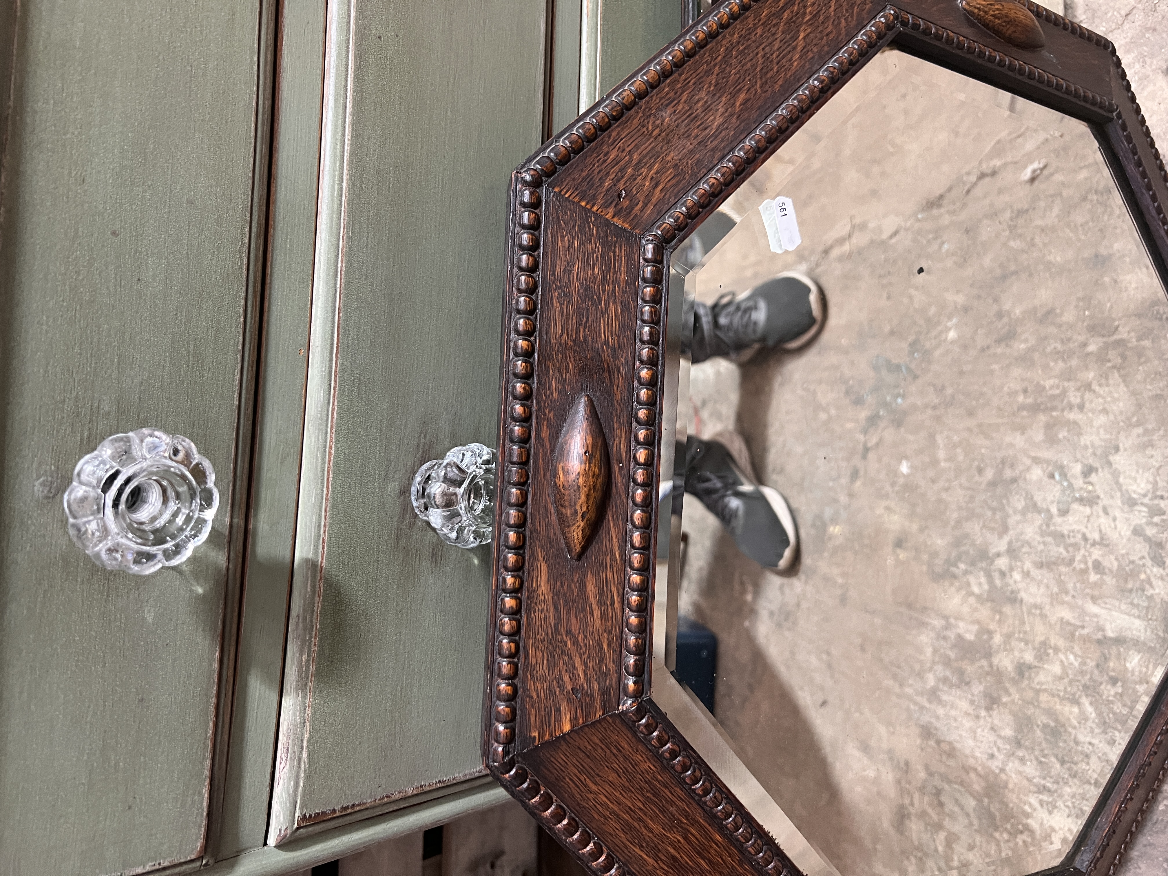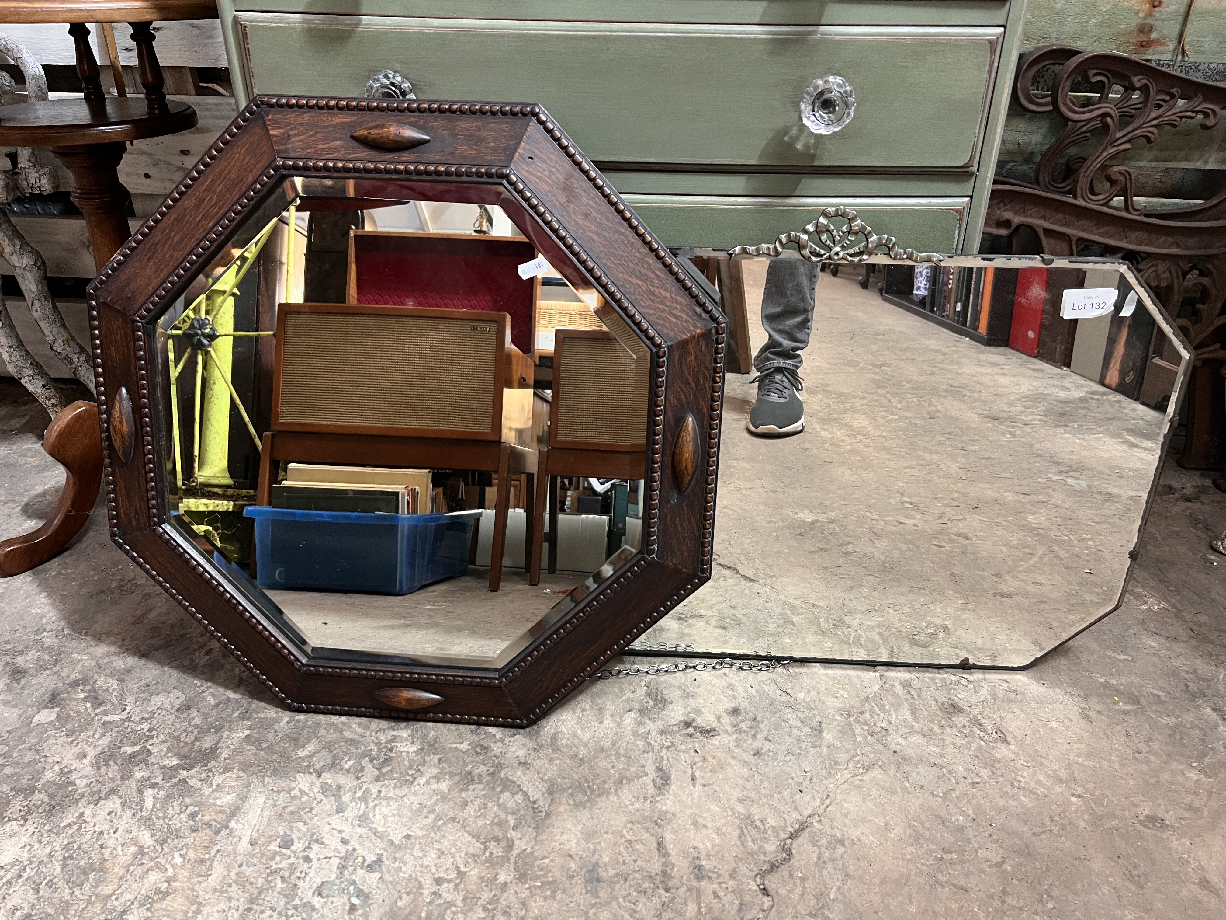 Two Art Deco mirrors one frameless and one oak octagon.