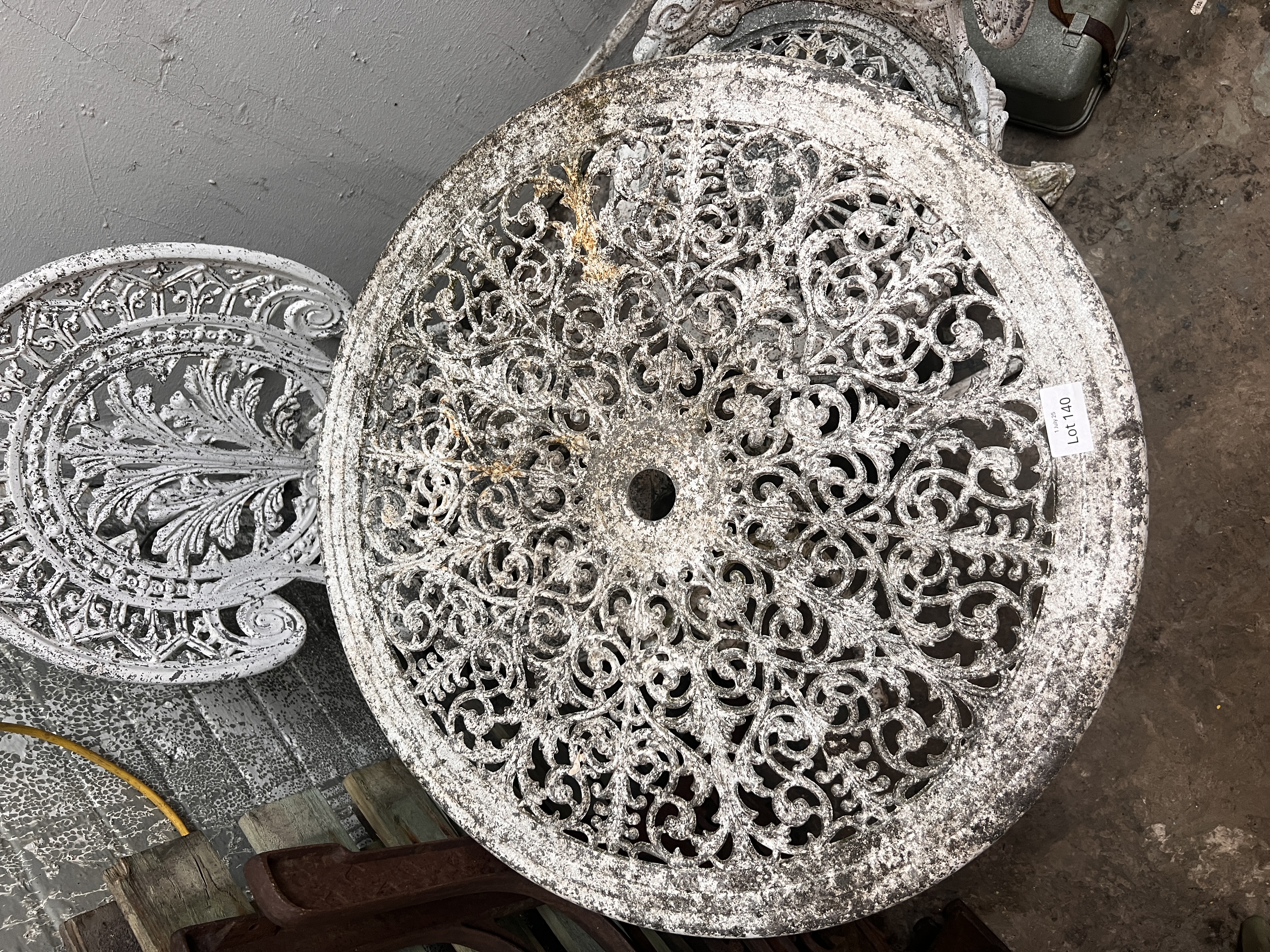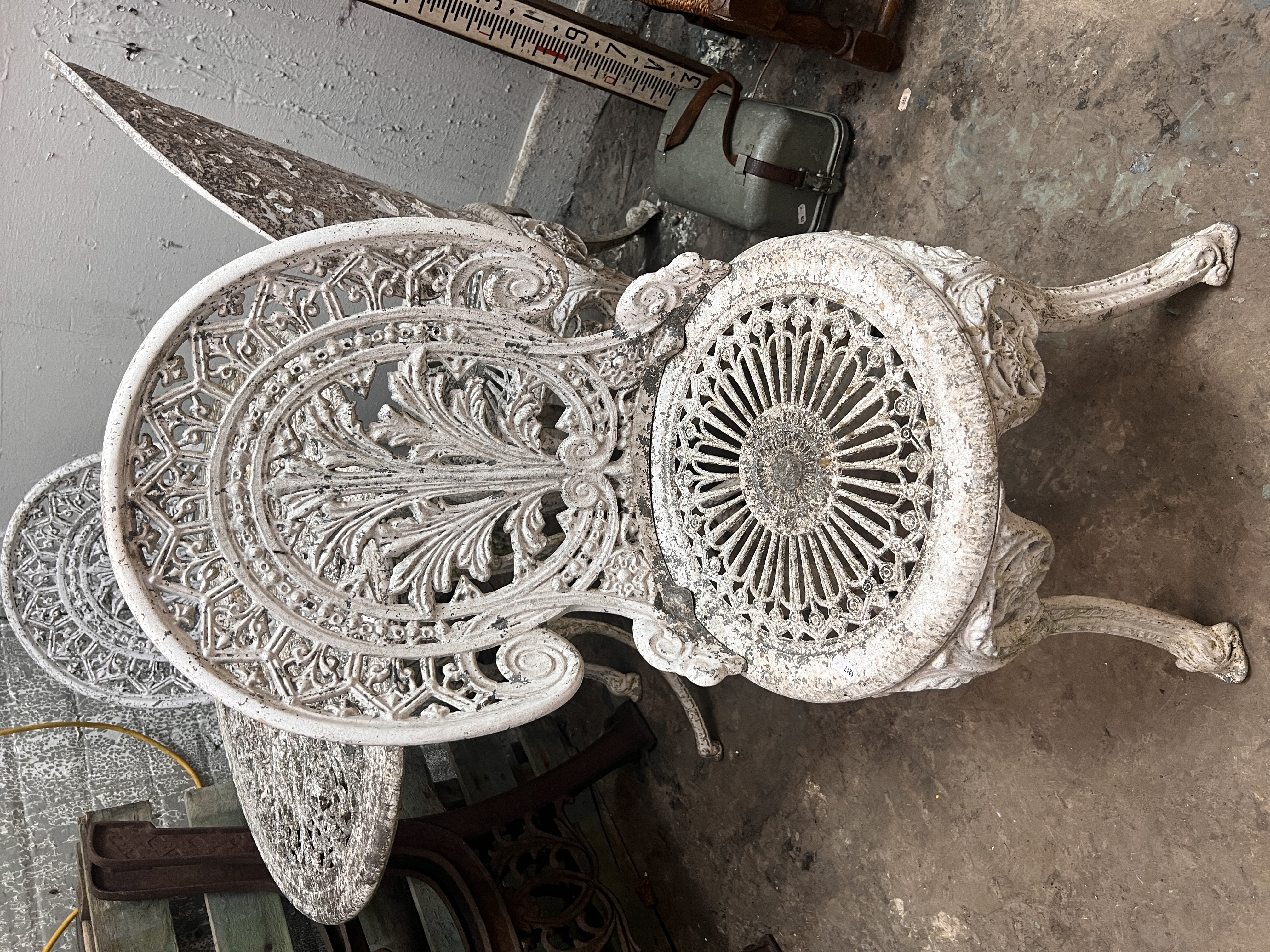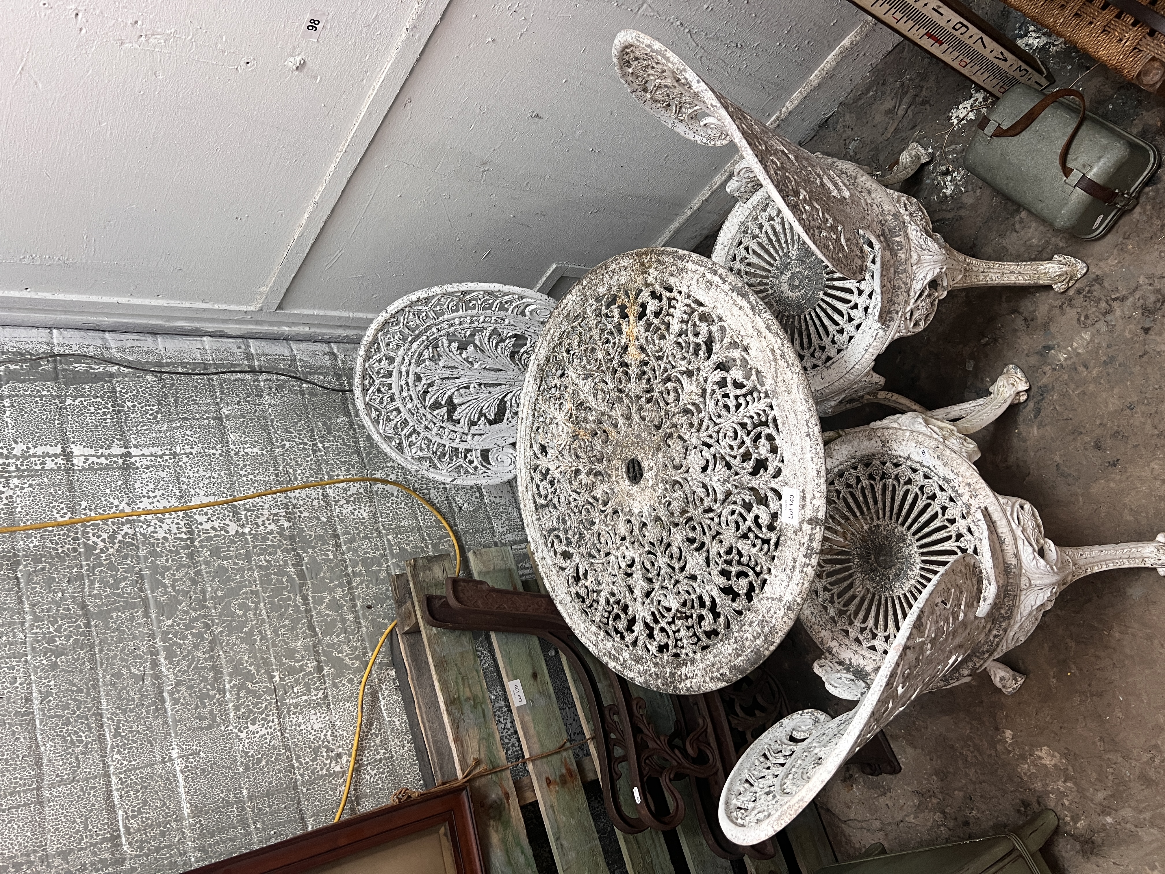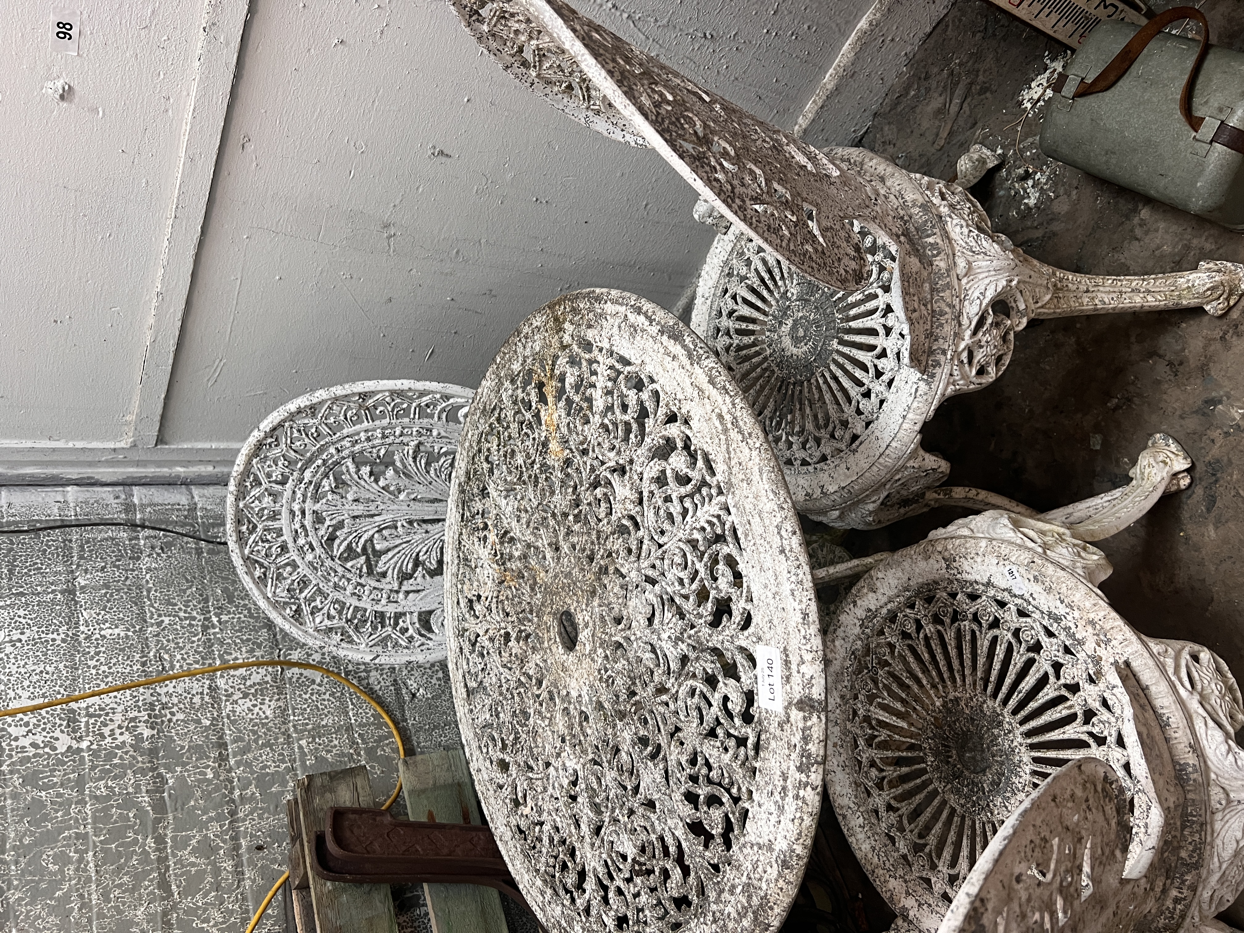 A cast aluminium garden table and three chairs. Good solid frames no damage or cracks.