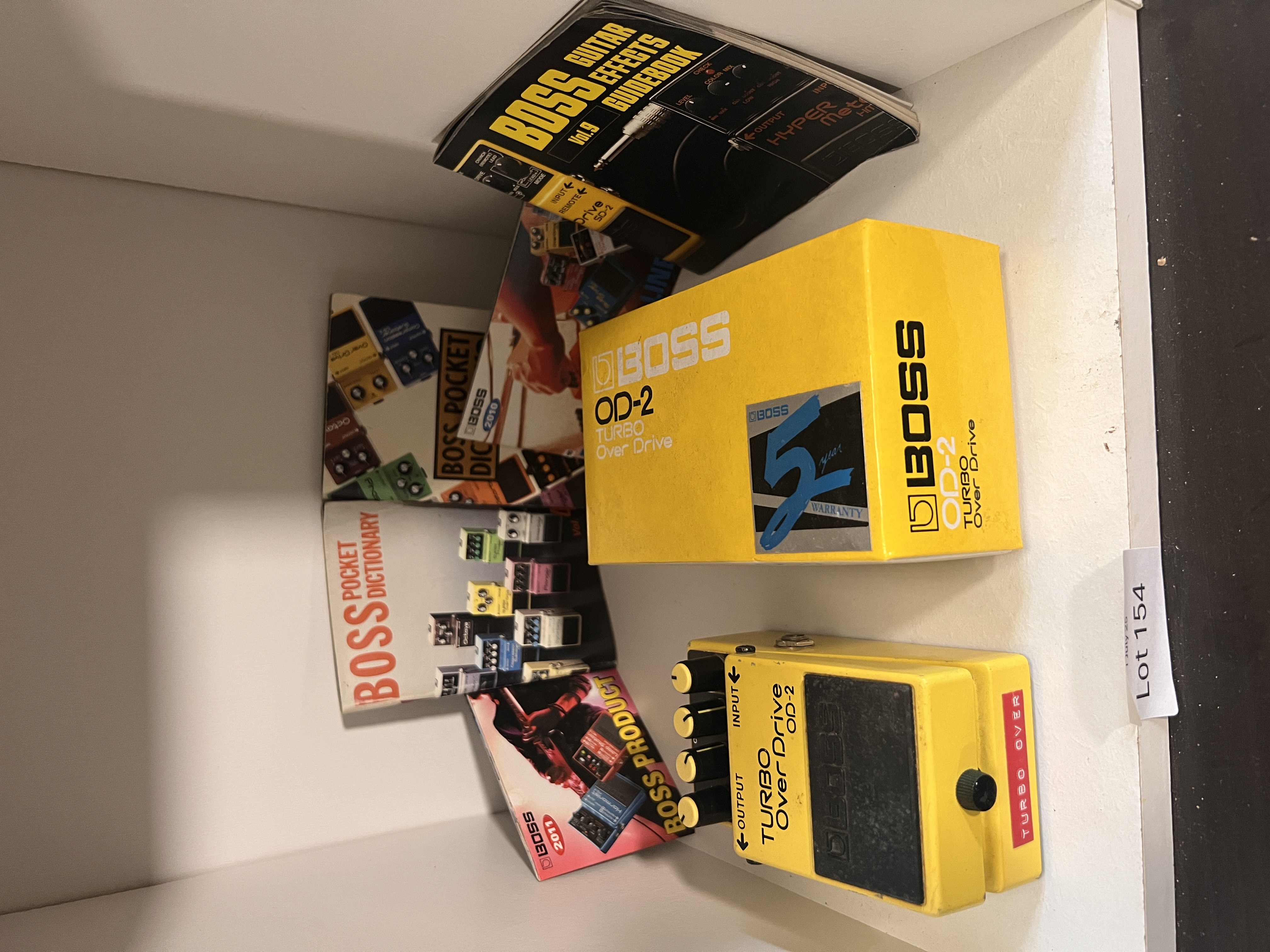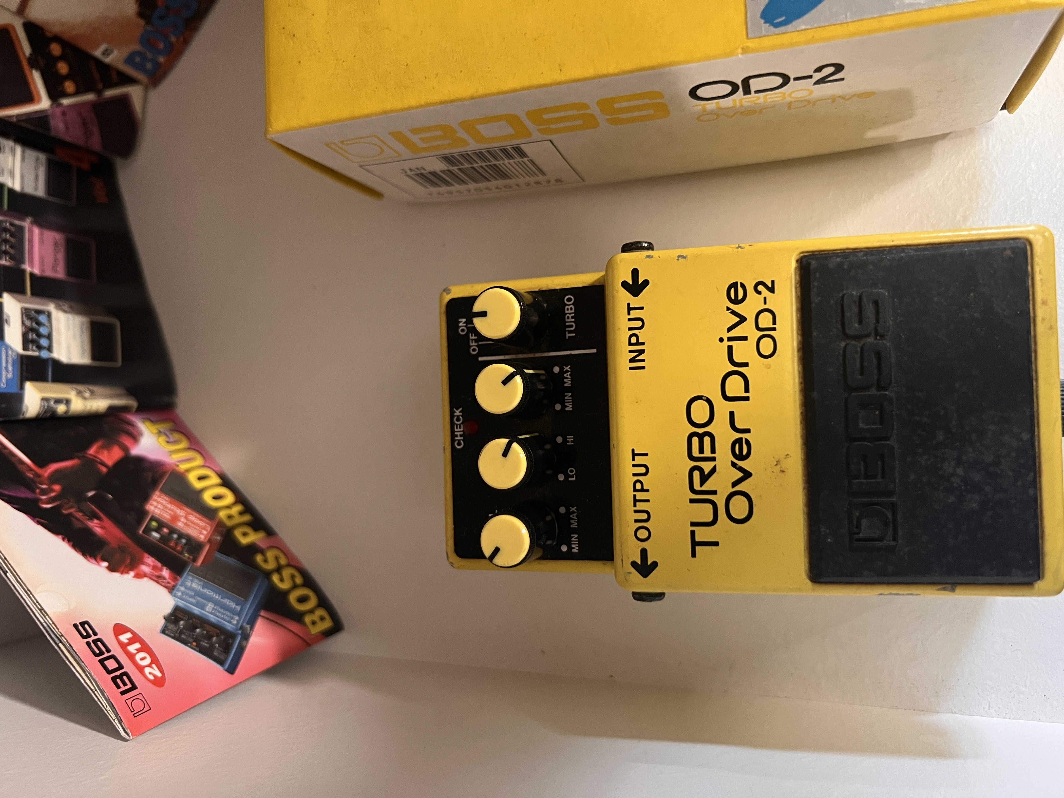 A boxed Boss OD-2 Turbo Over Drive guitar pedal effect.
