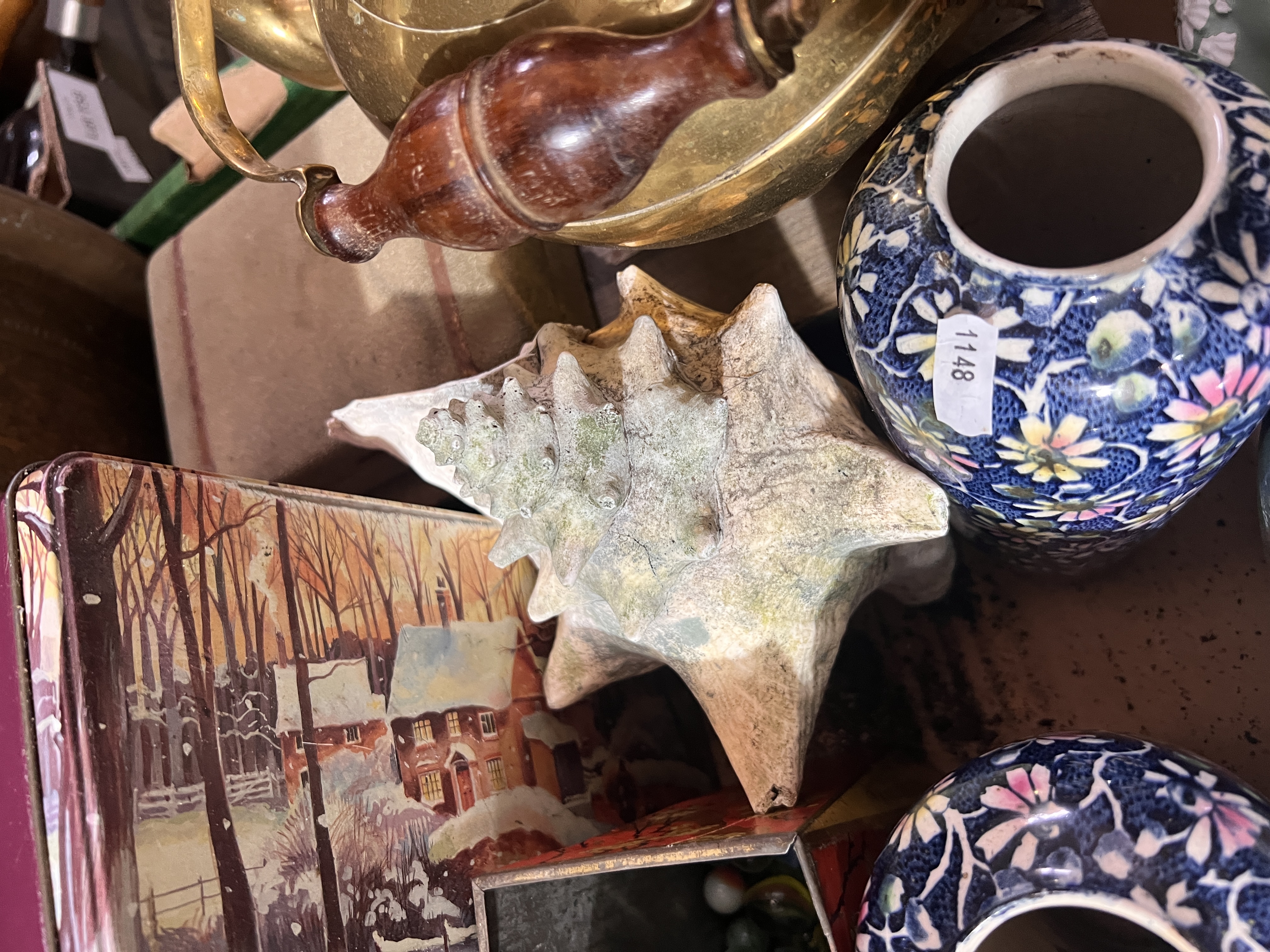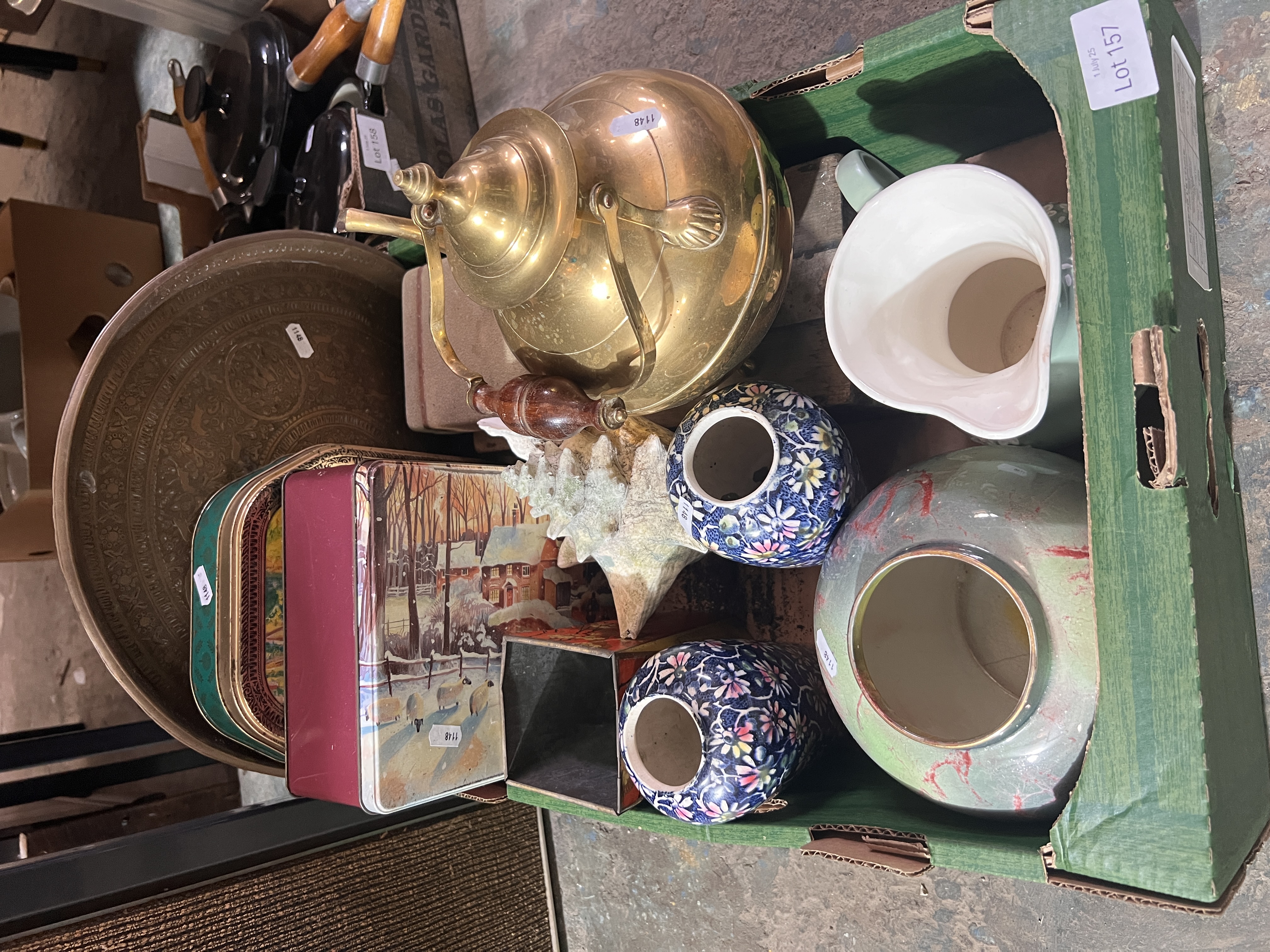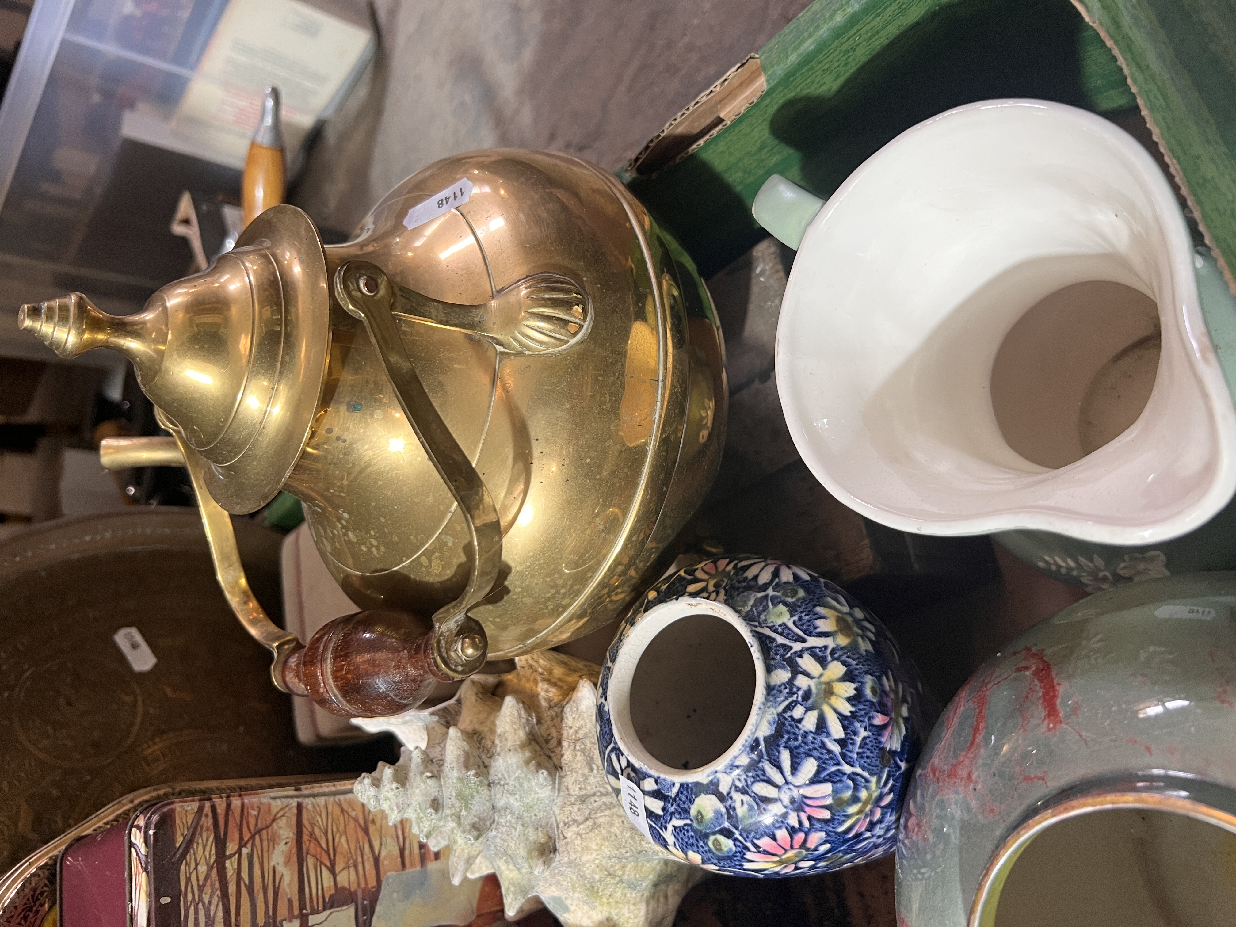 A selection of ceramics and brass wares.
