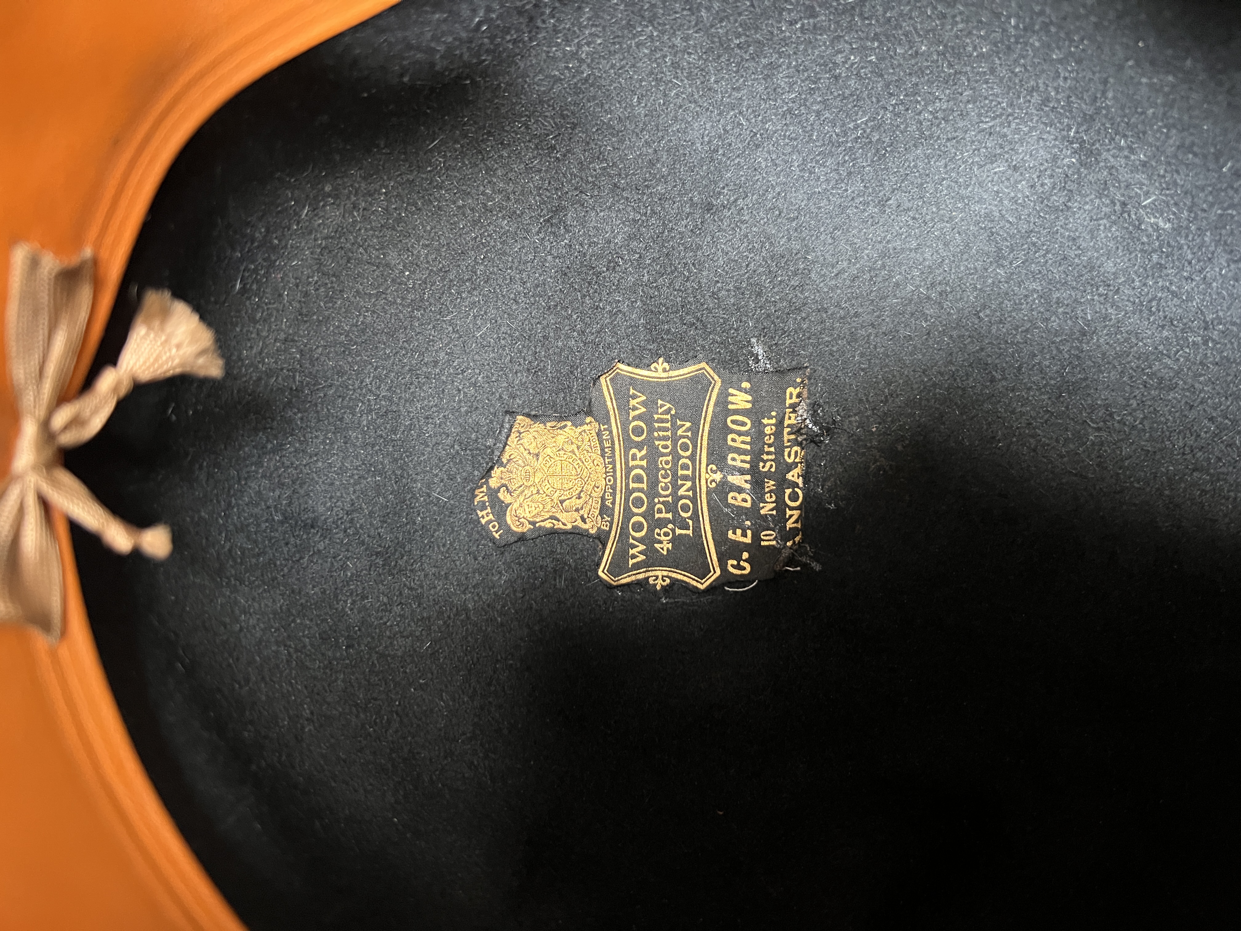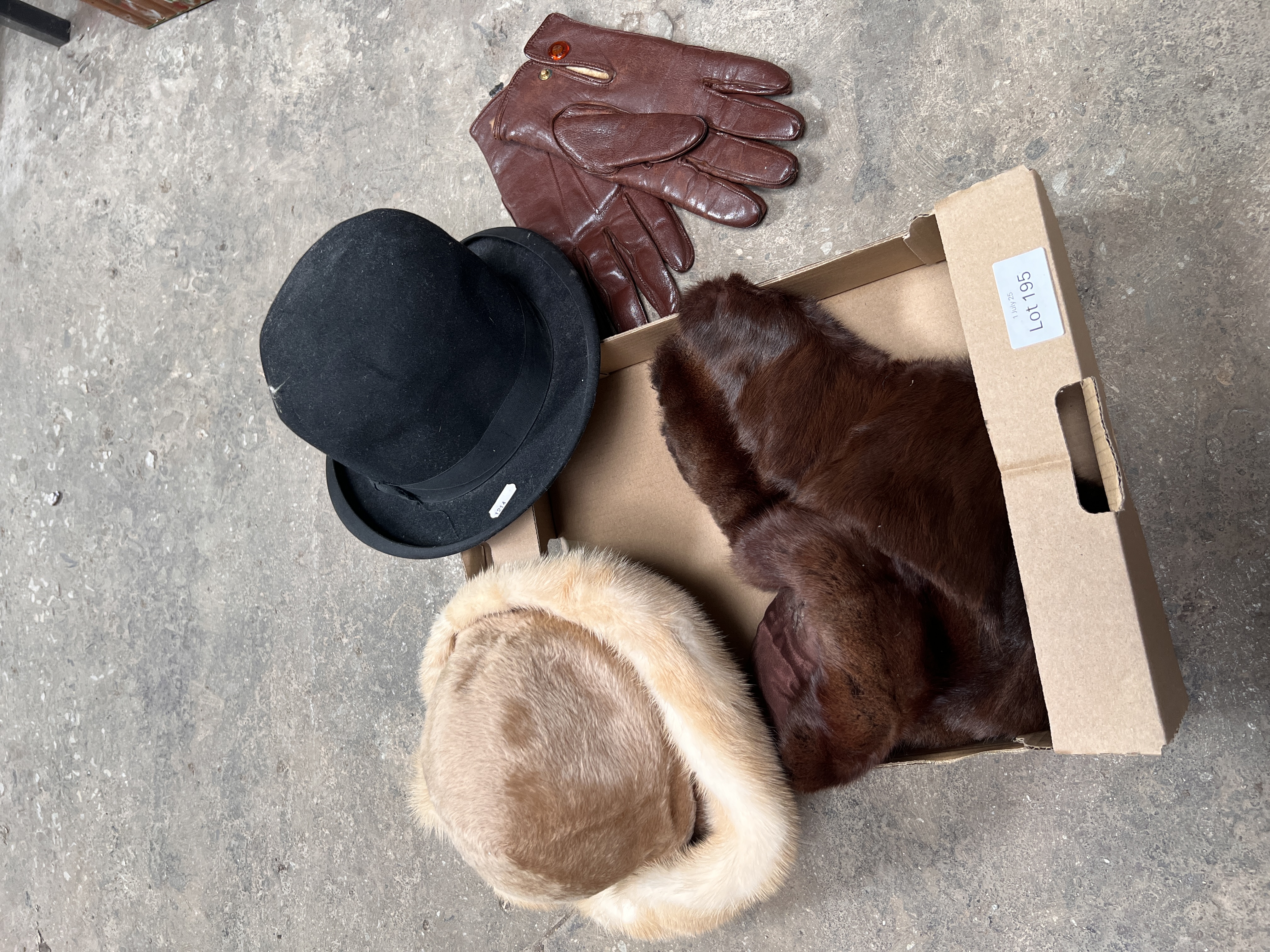 A Gents bowler hat with leather driving gloves and ladies fur hat with stole.