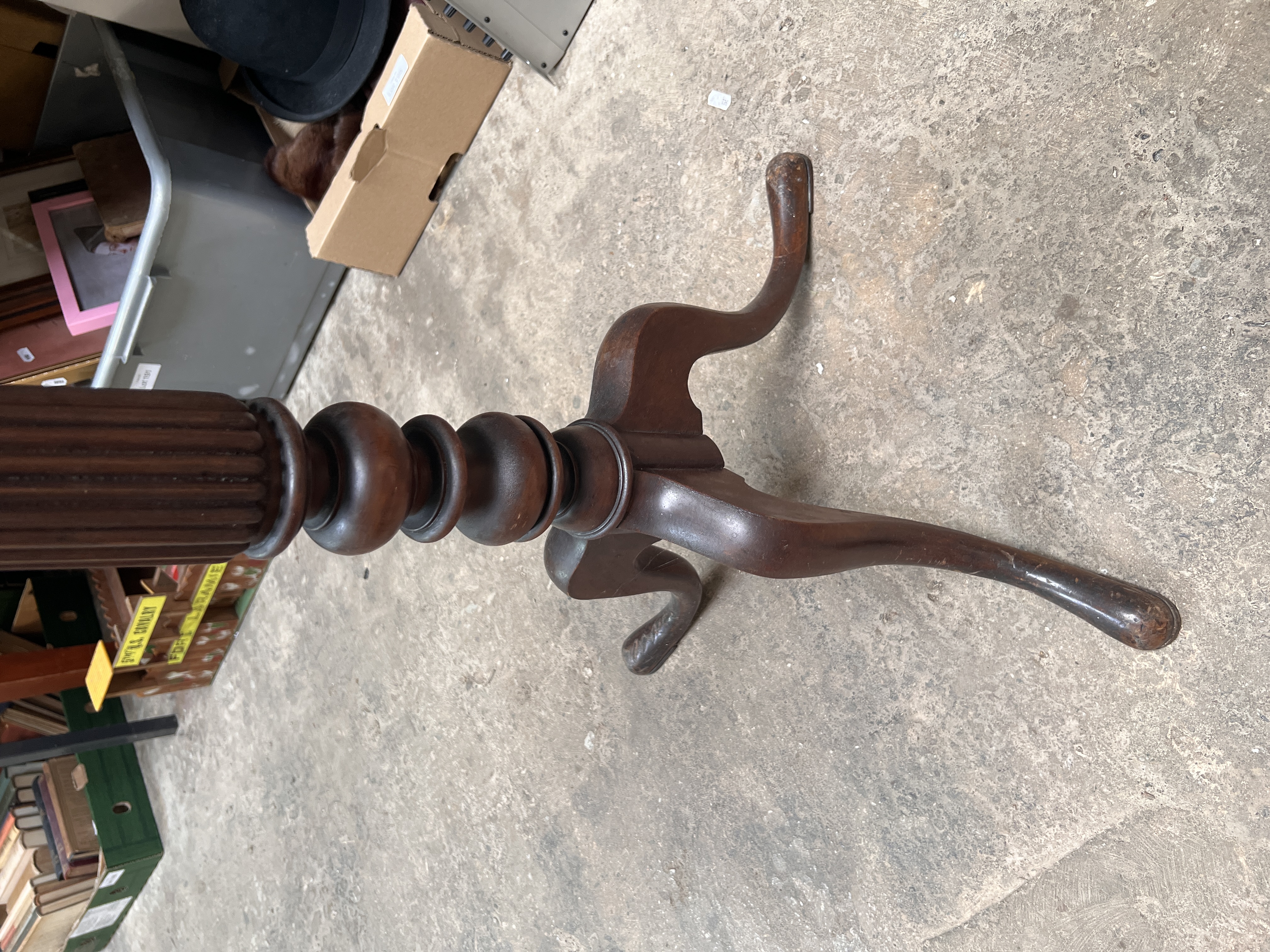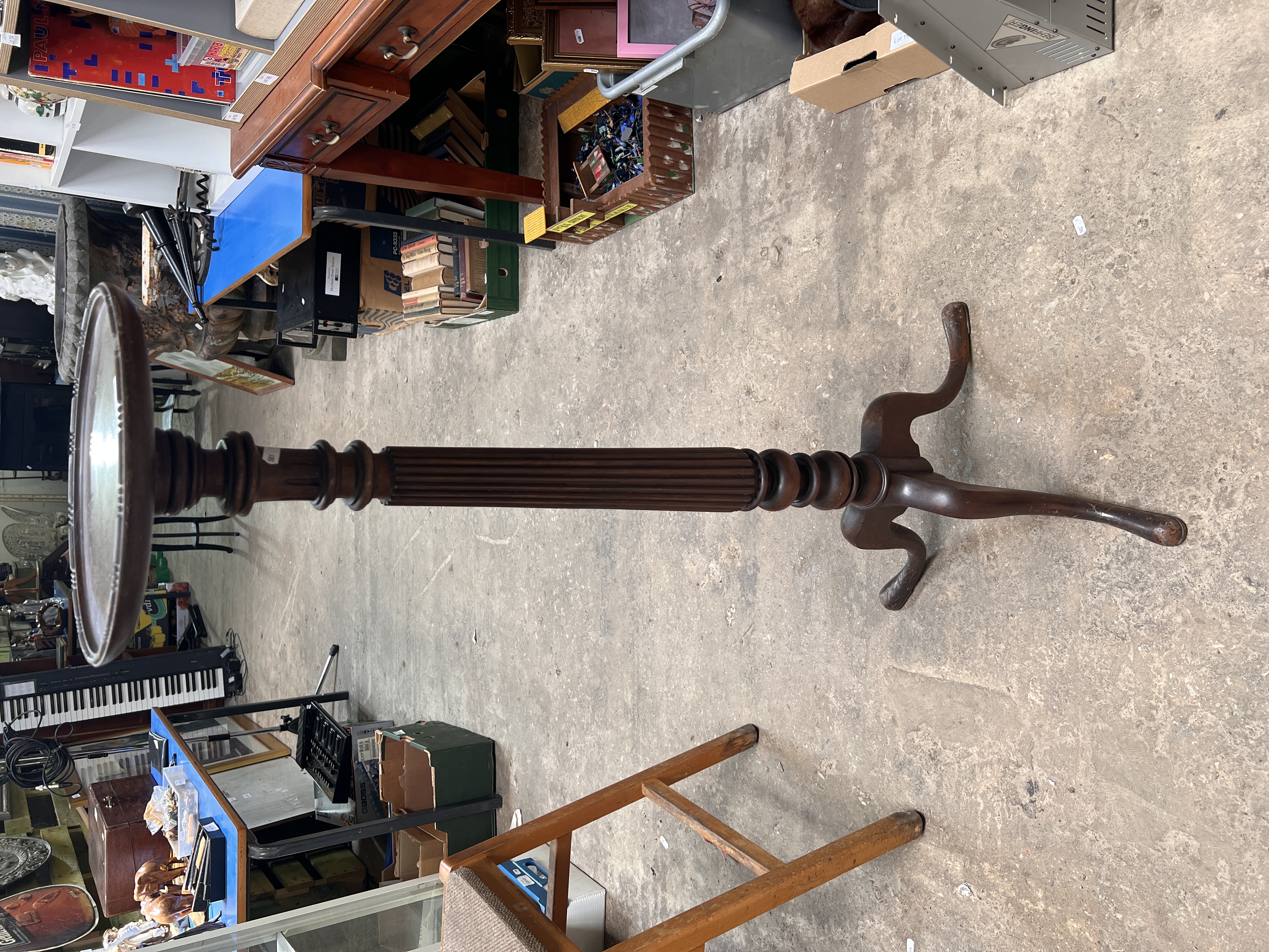 An antique mahogany torchere stand reeded column on tripod base. 109cm tall.