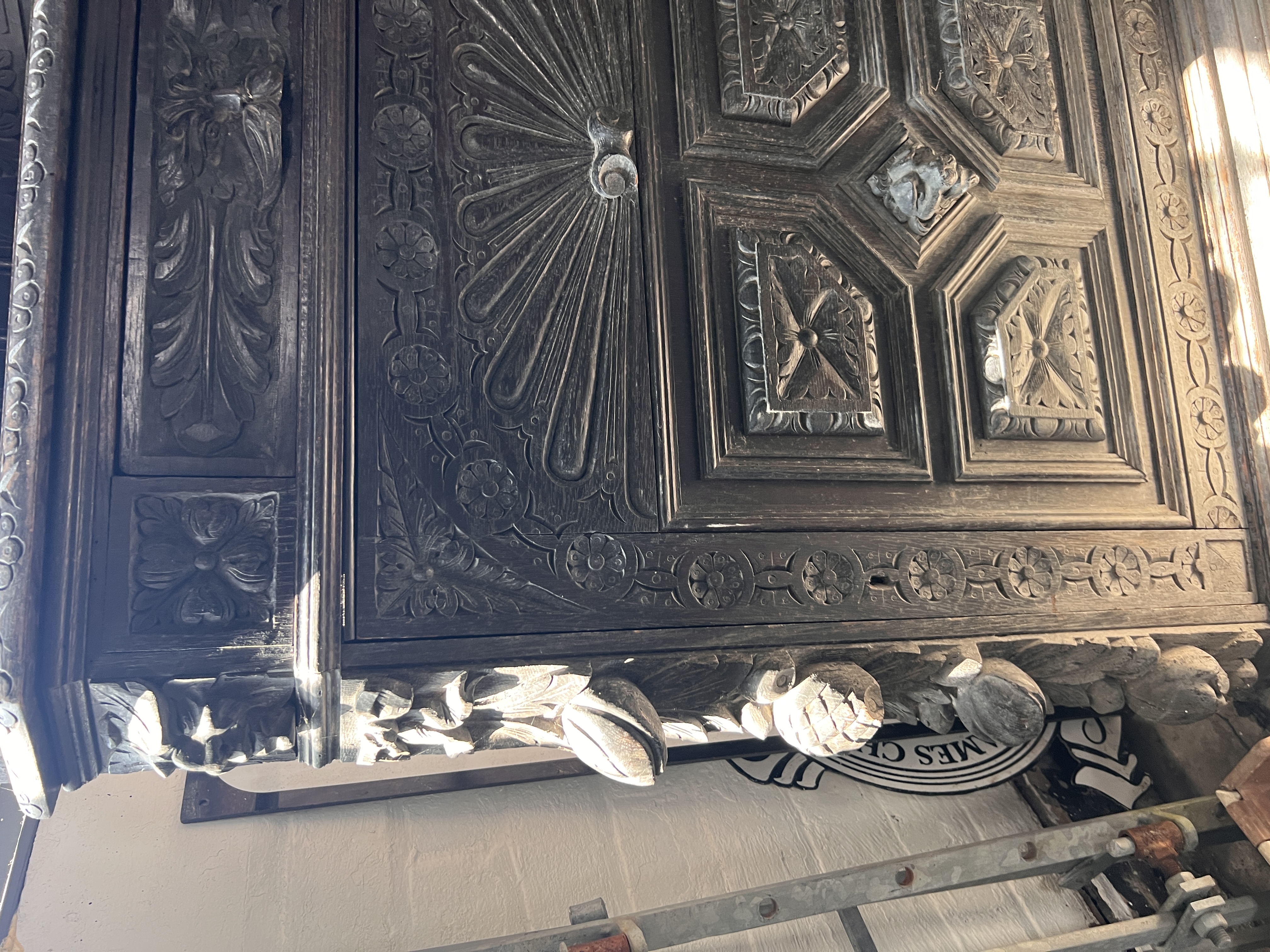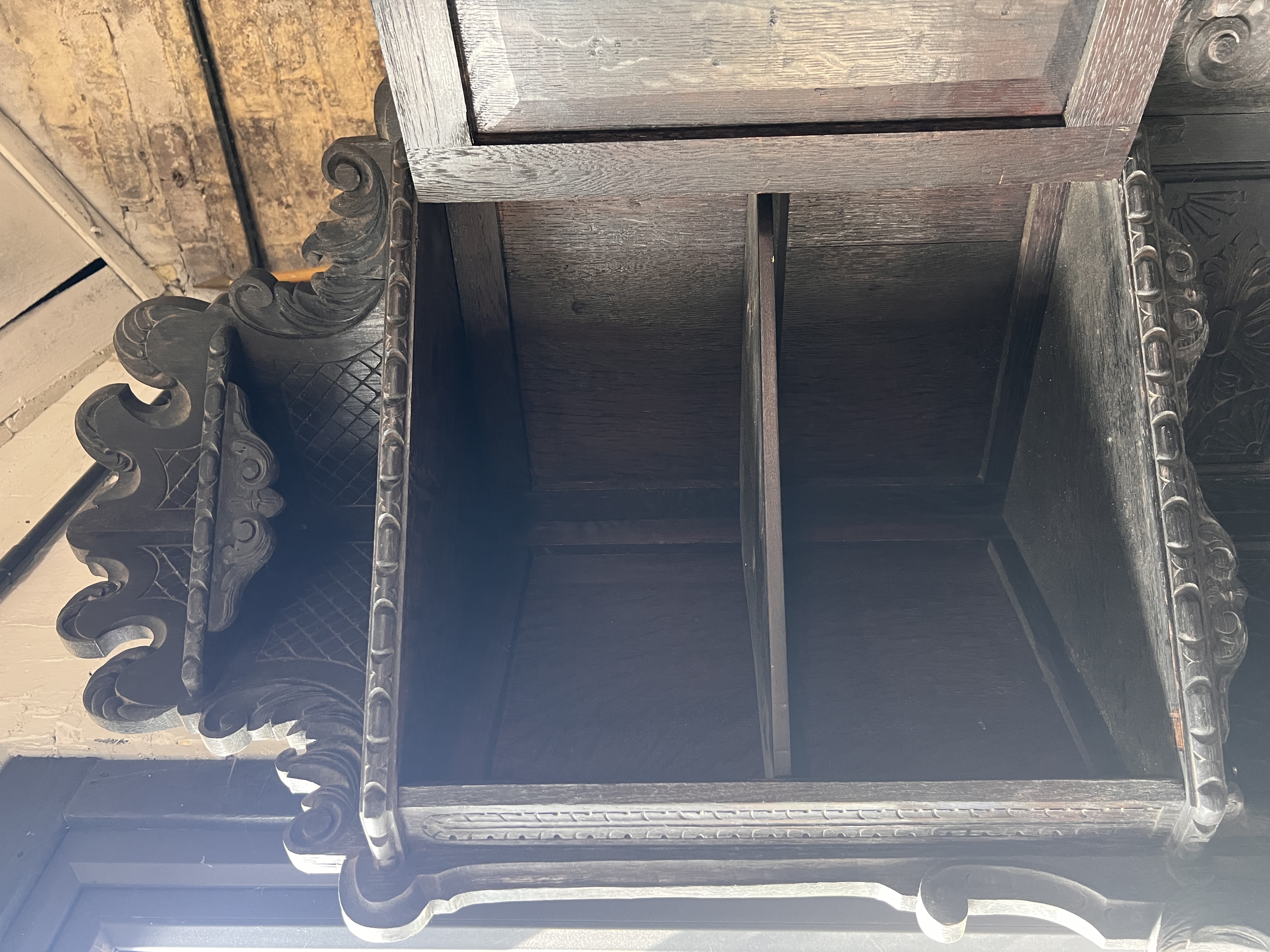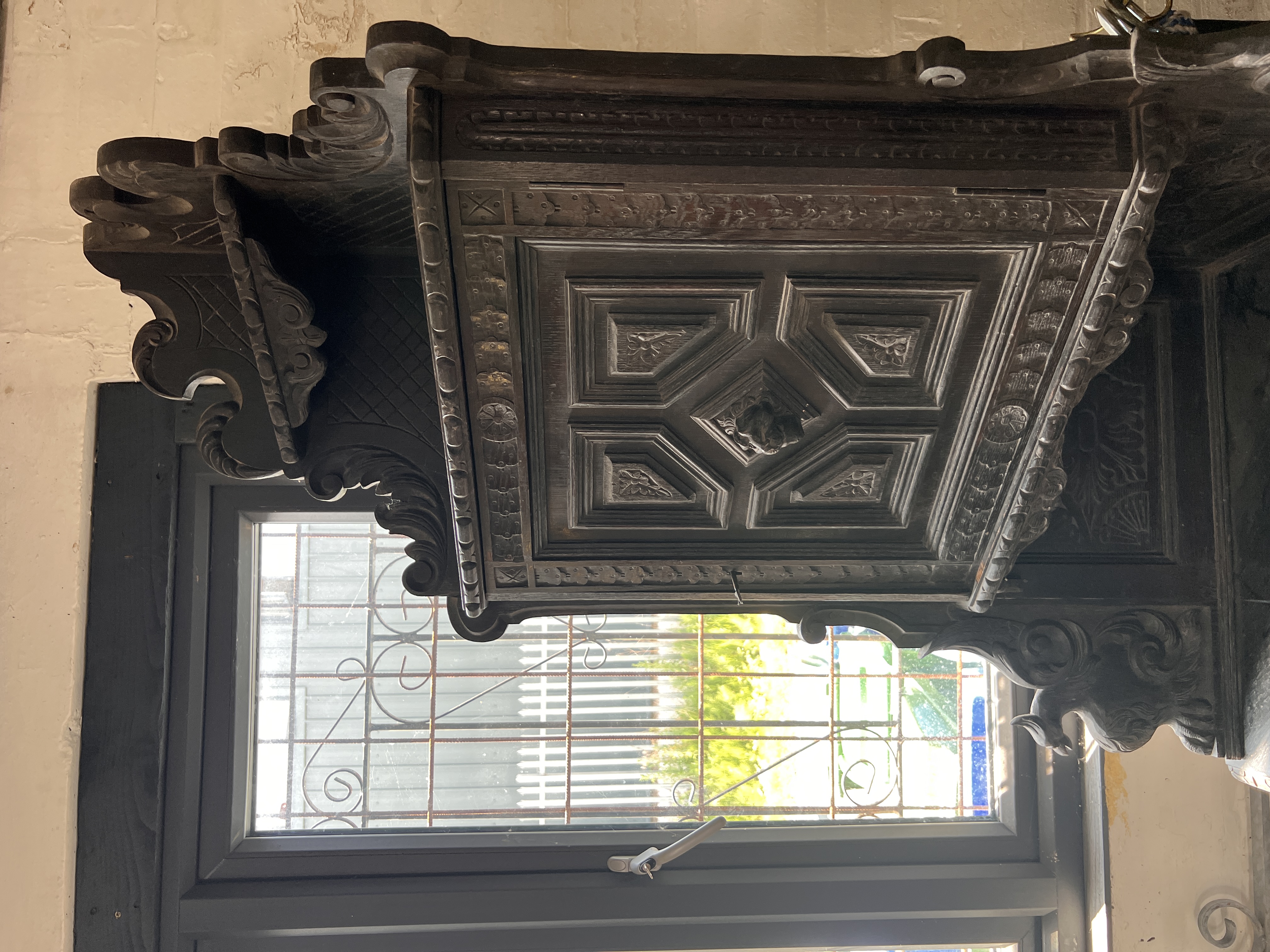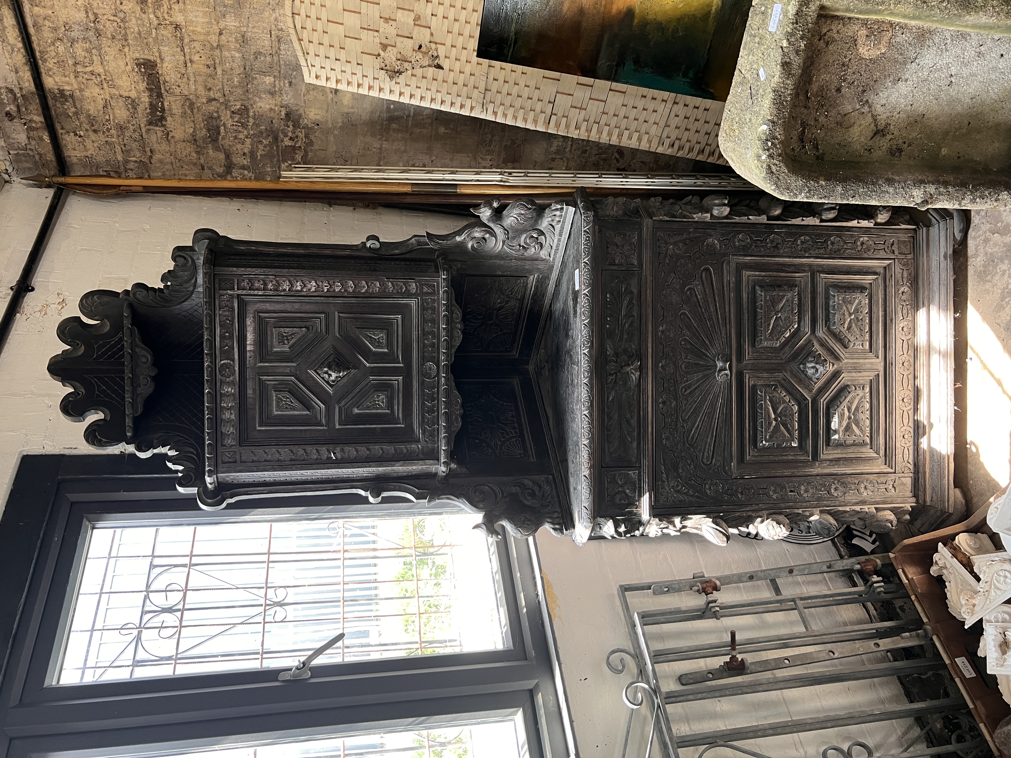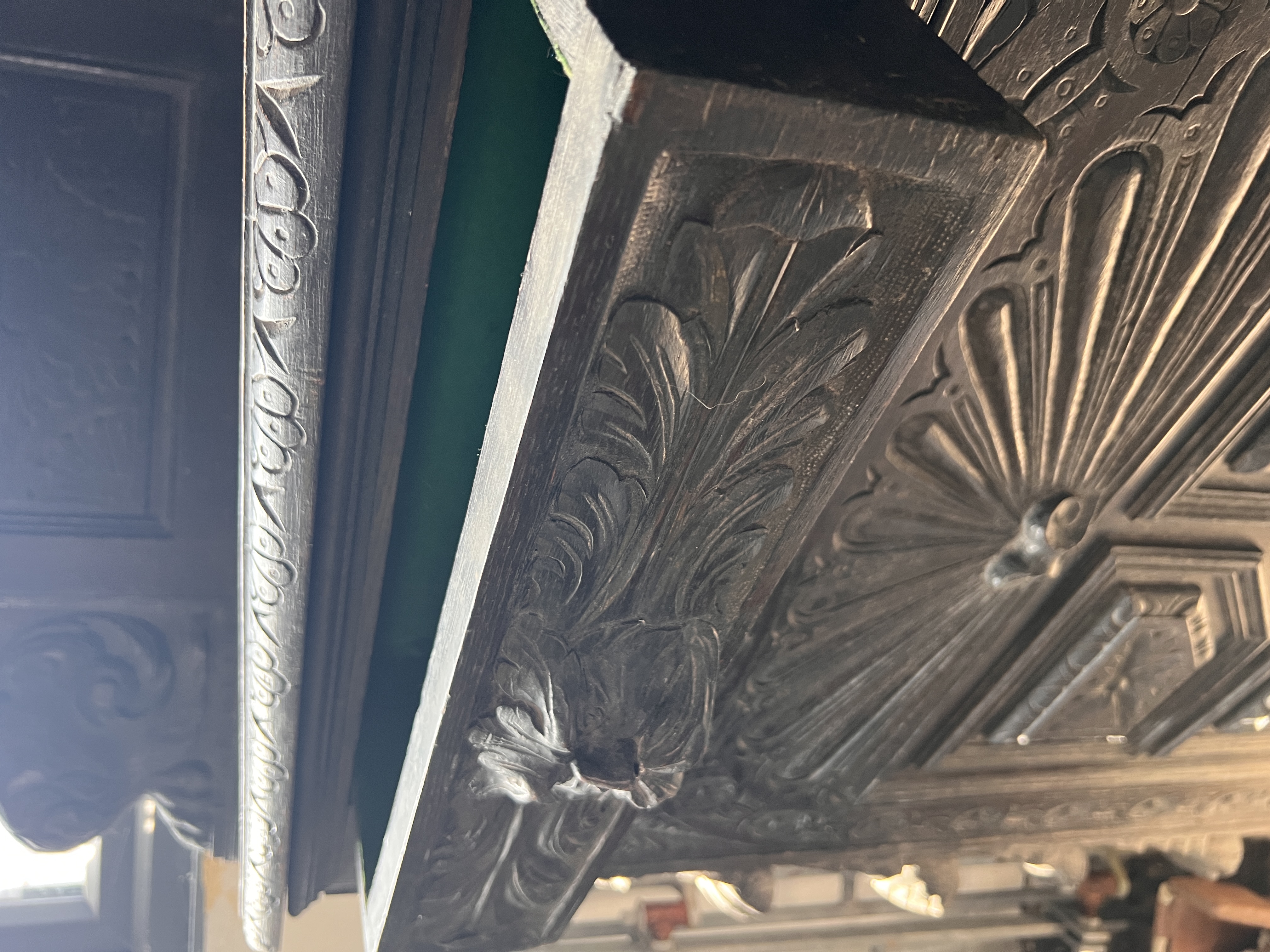 An antique Victorian Gothic corner cupboard, heavily carved oak frame decorated with beasts, green man and foliage.