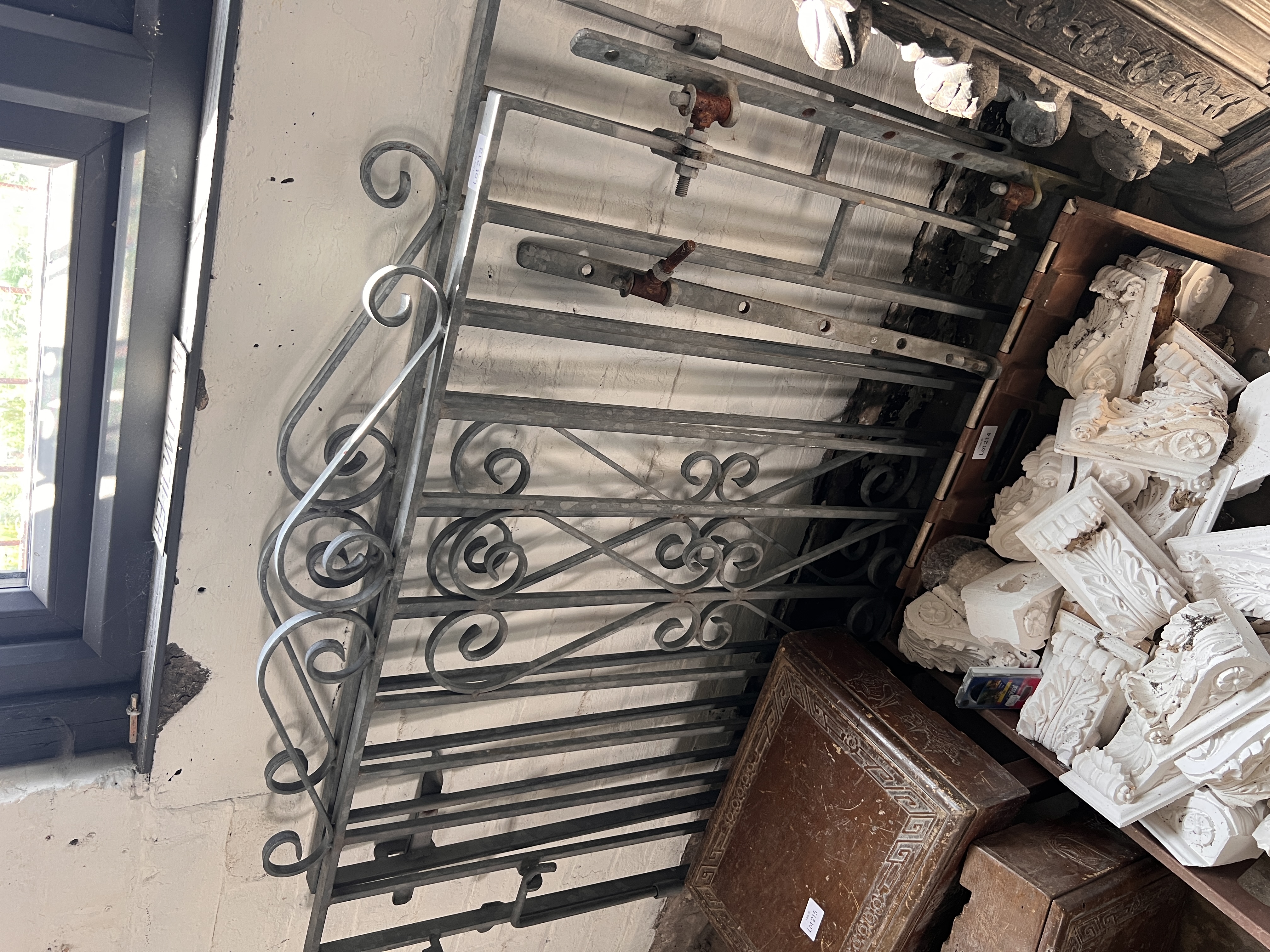 A pair of wrought iron gates each measures 102cm wide. Total width 8ft including hinges