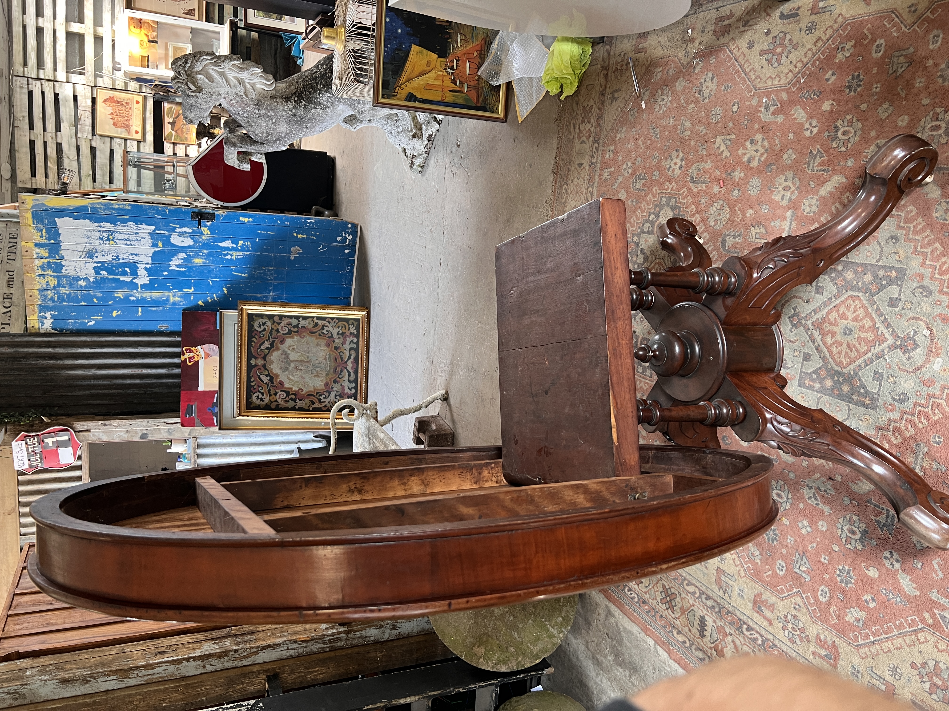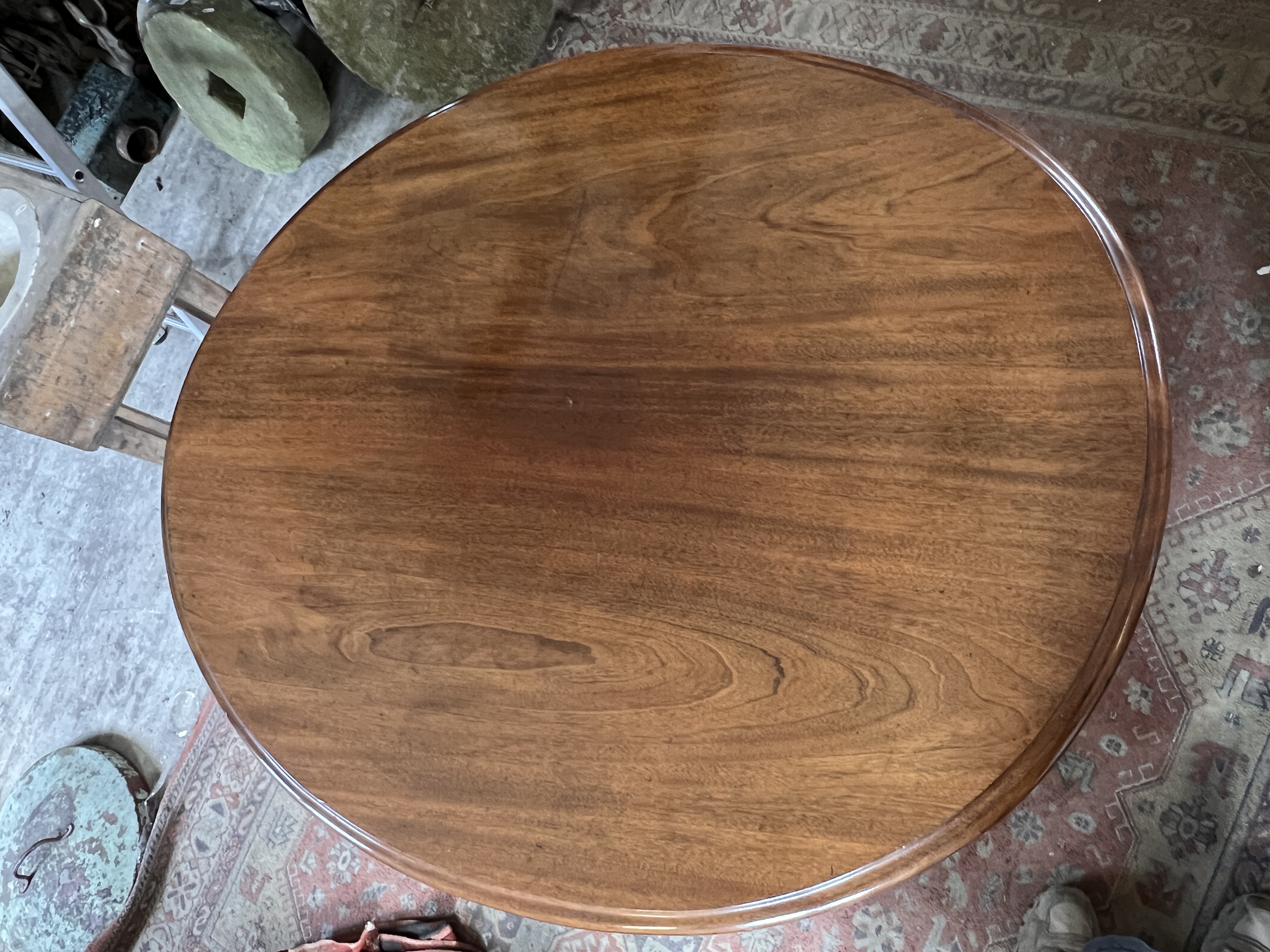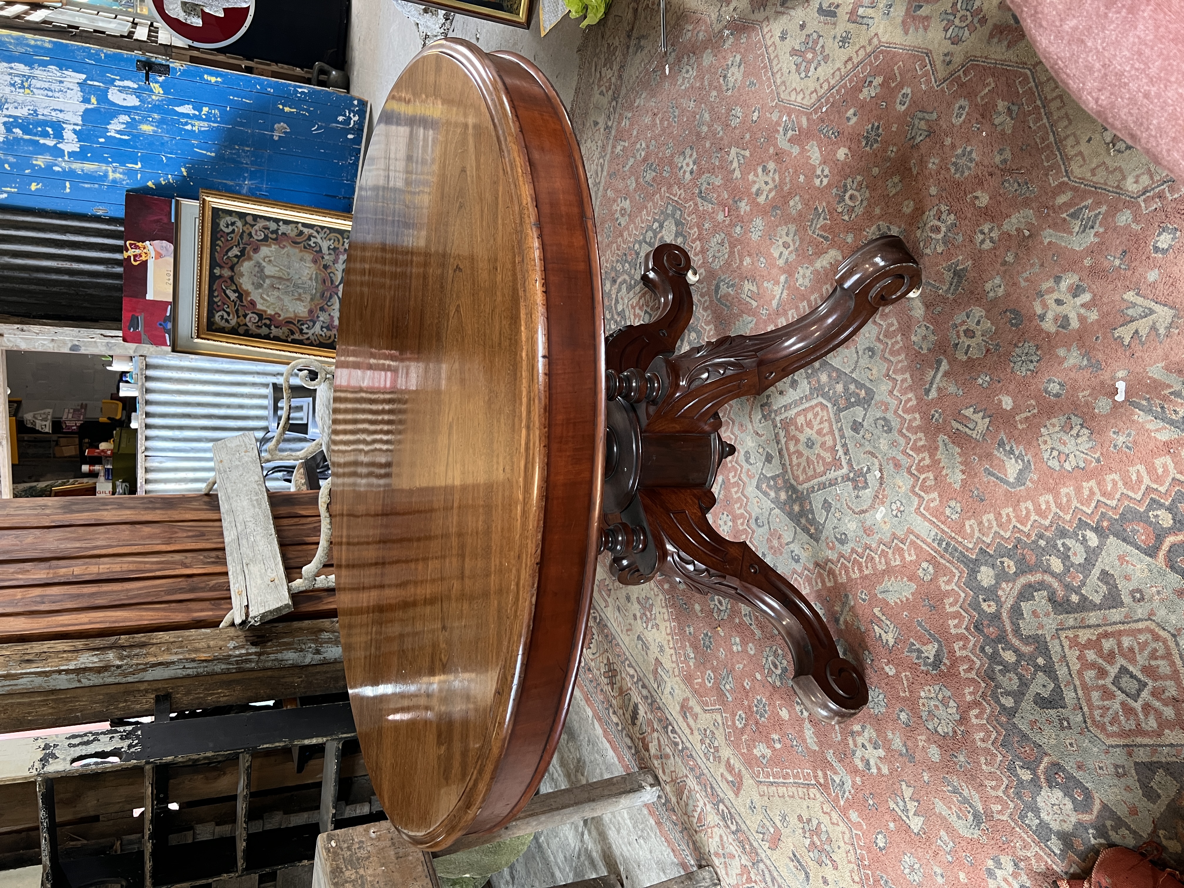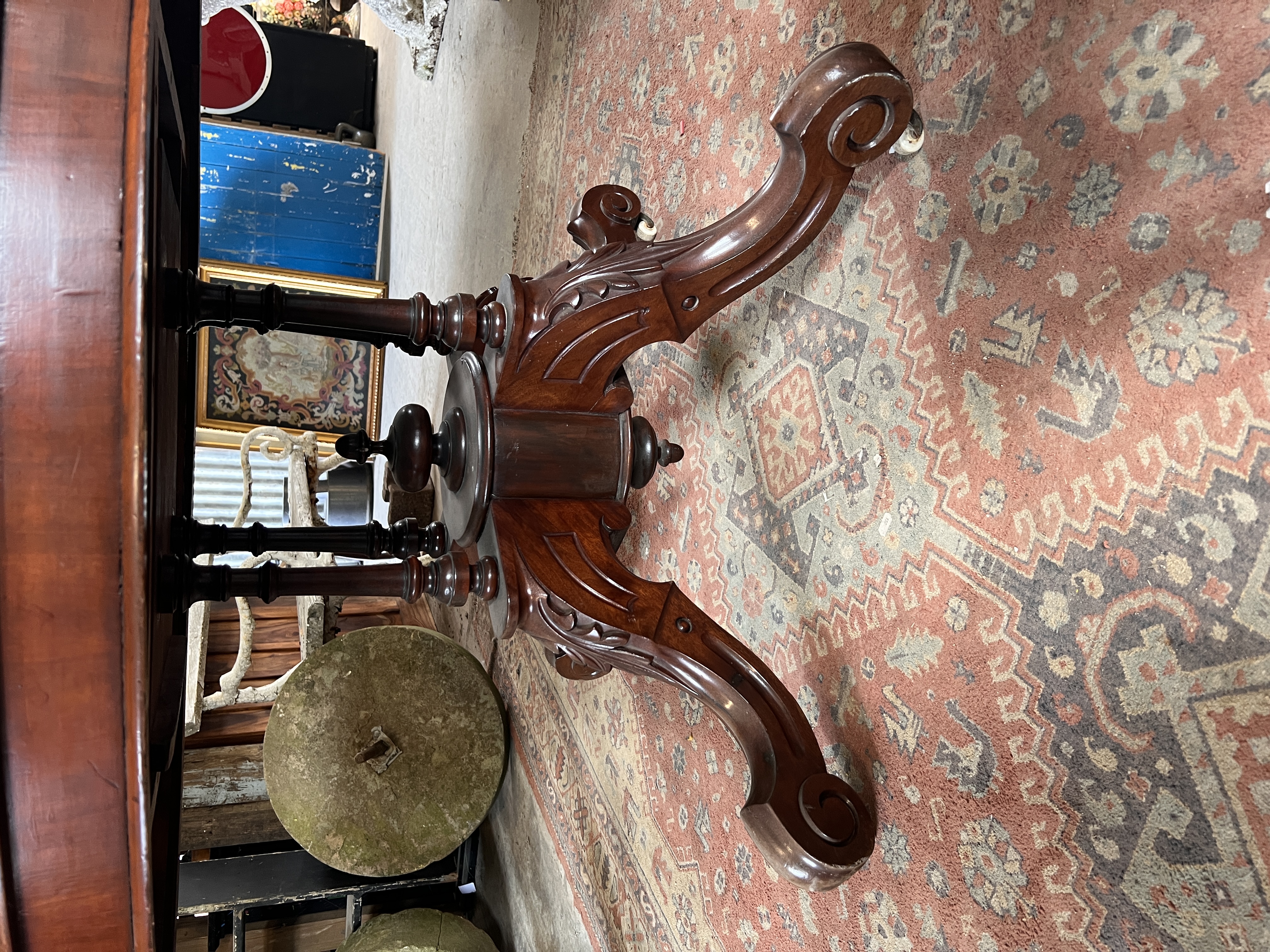 A Victorian tilt top tea table with gallery base on carved legs and ceramic castors.