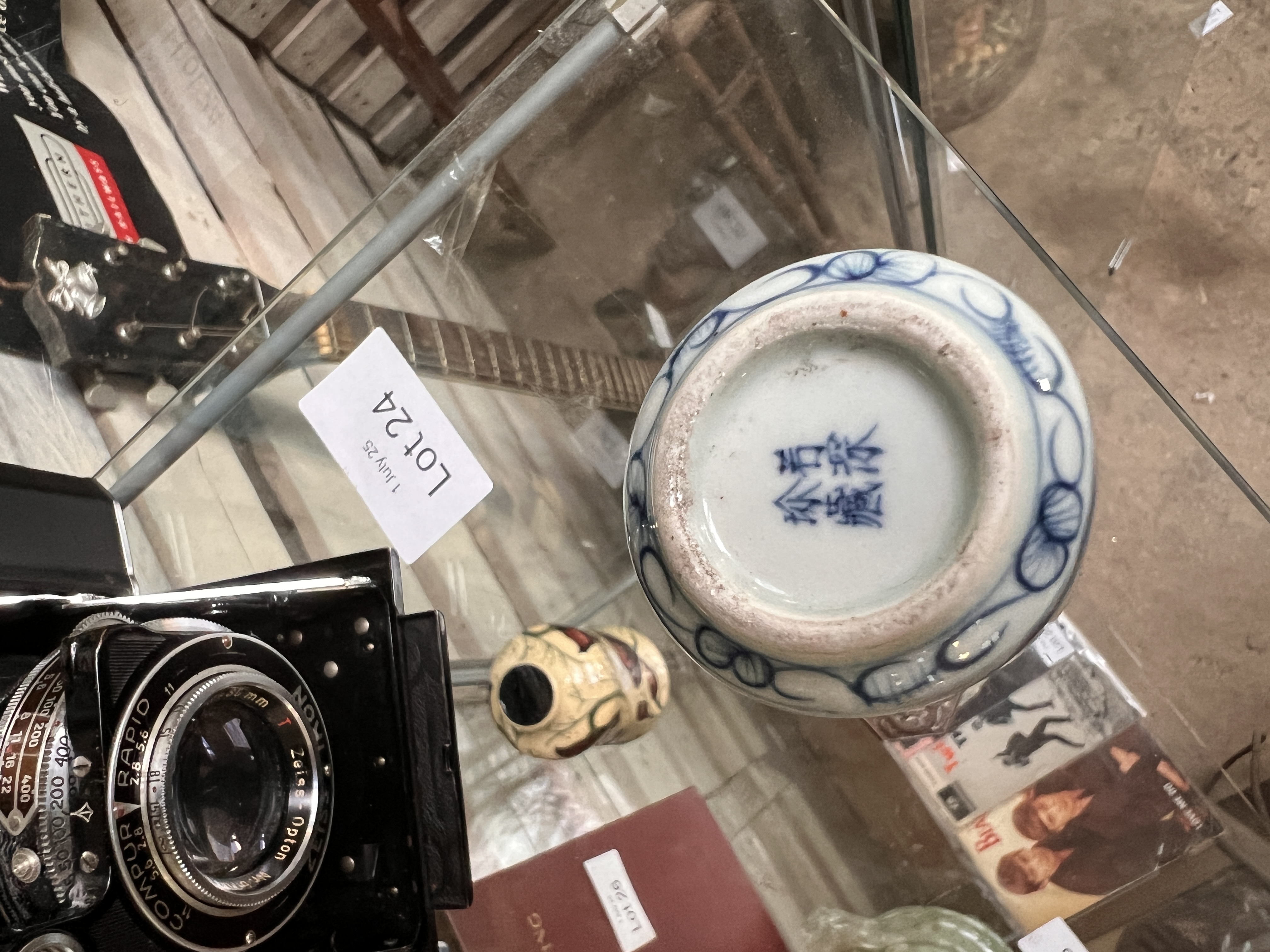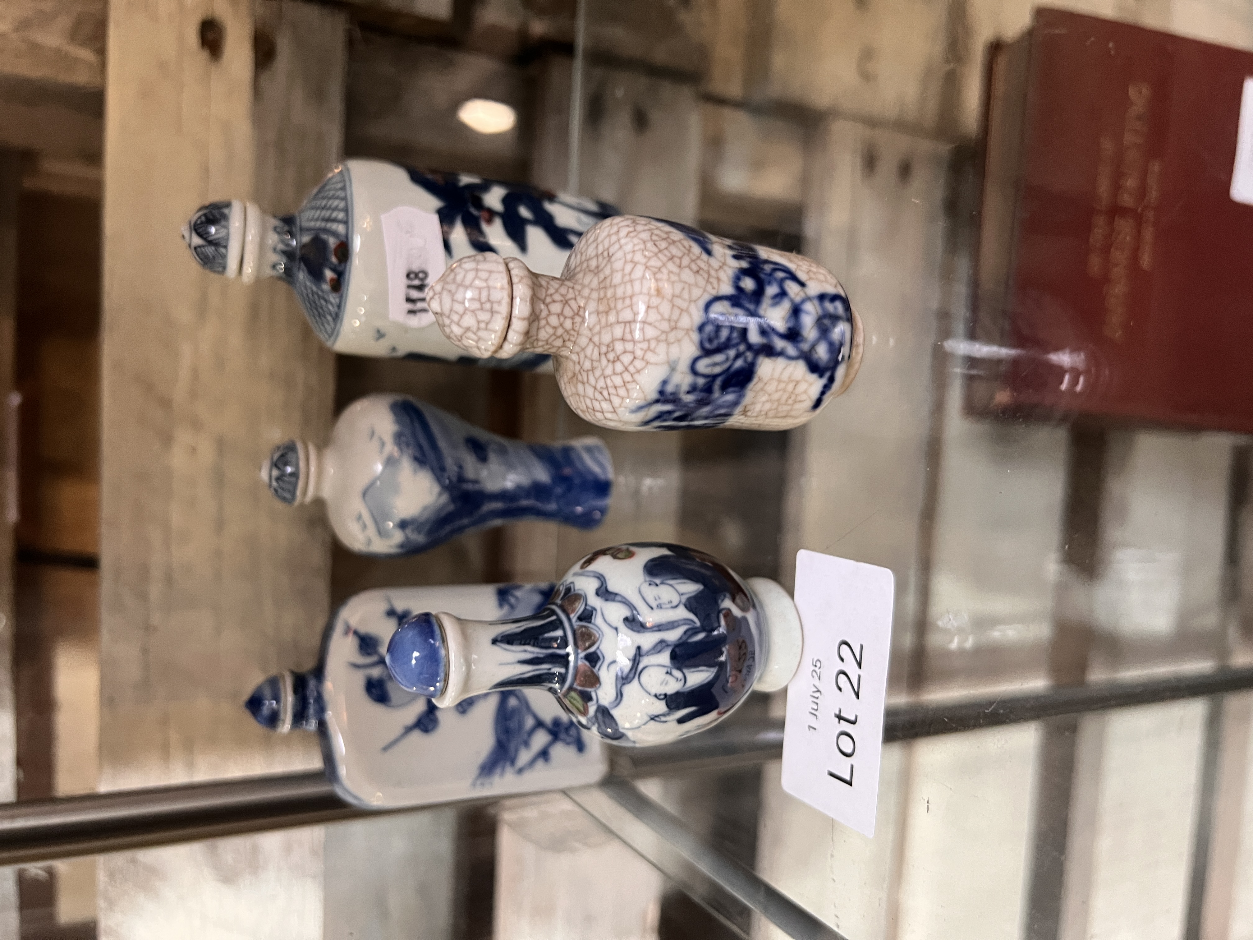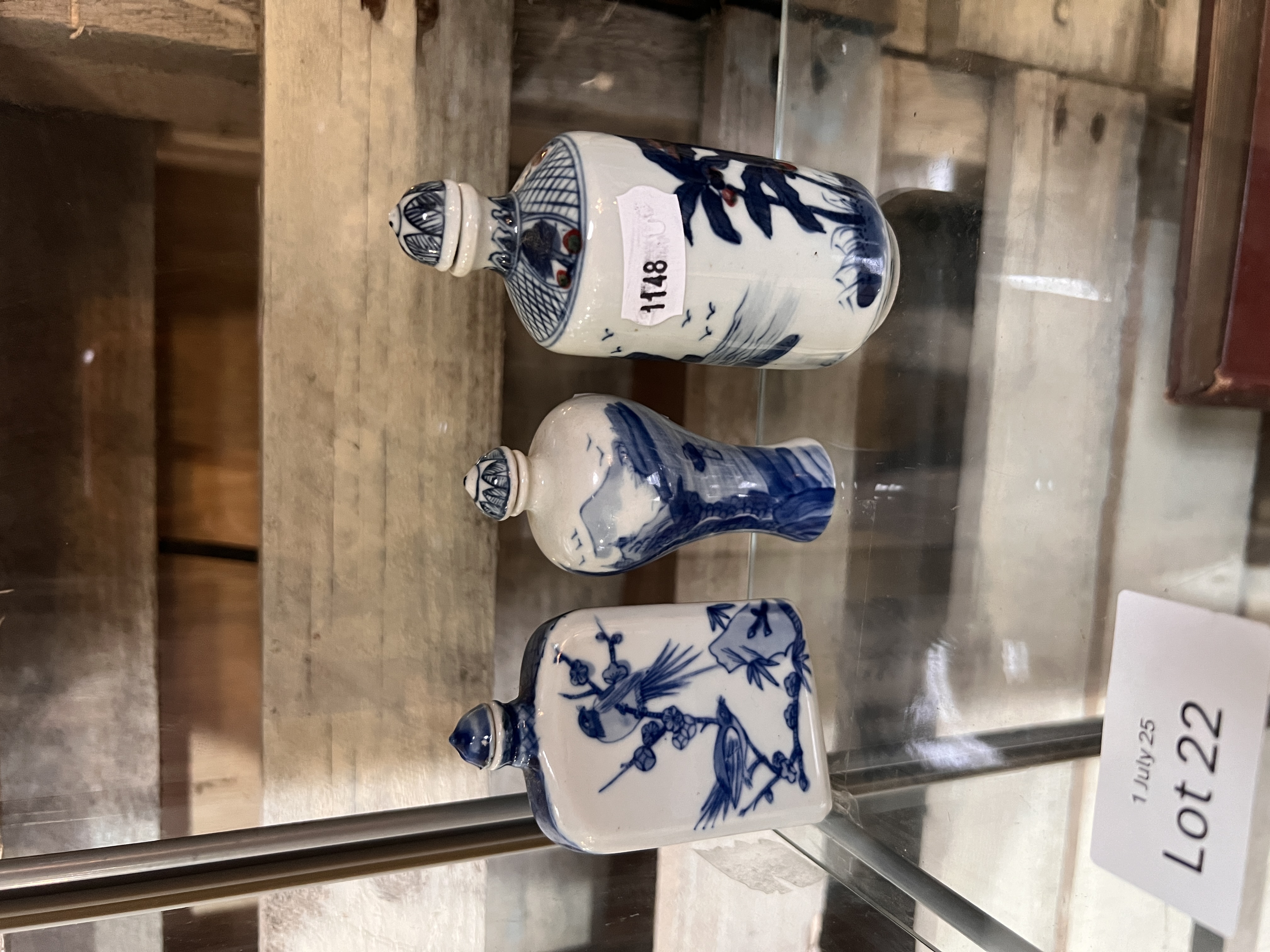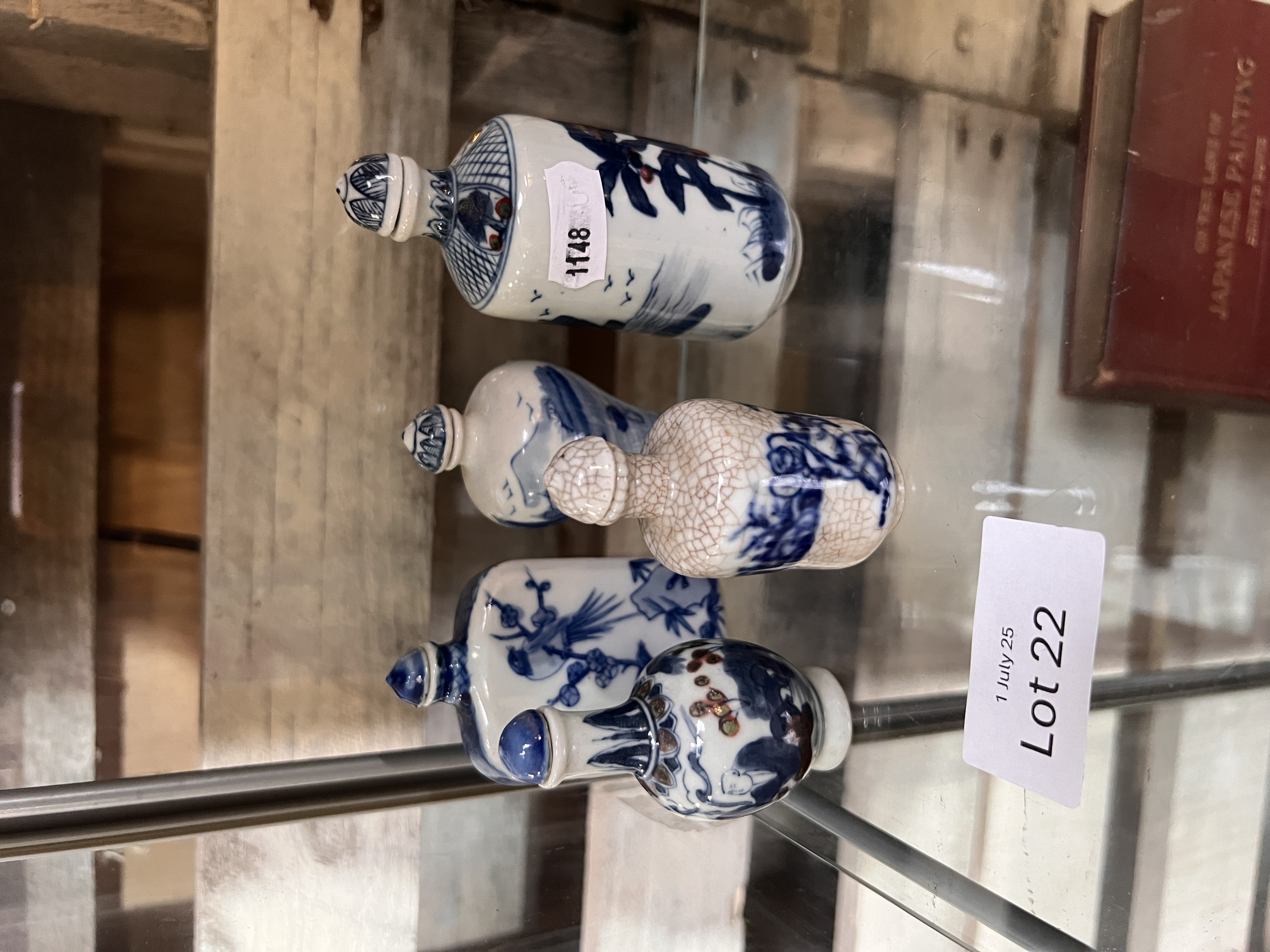 A selection of early 20th century Chinese snuff bottles, hand decorated with blue and white fantasy landscapes etc.