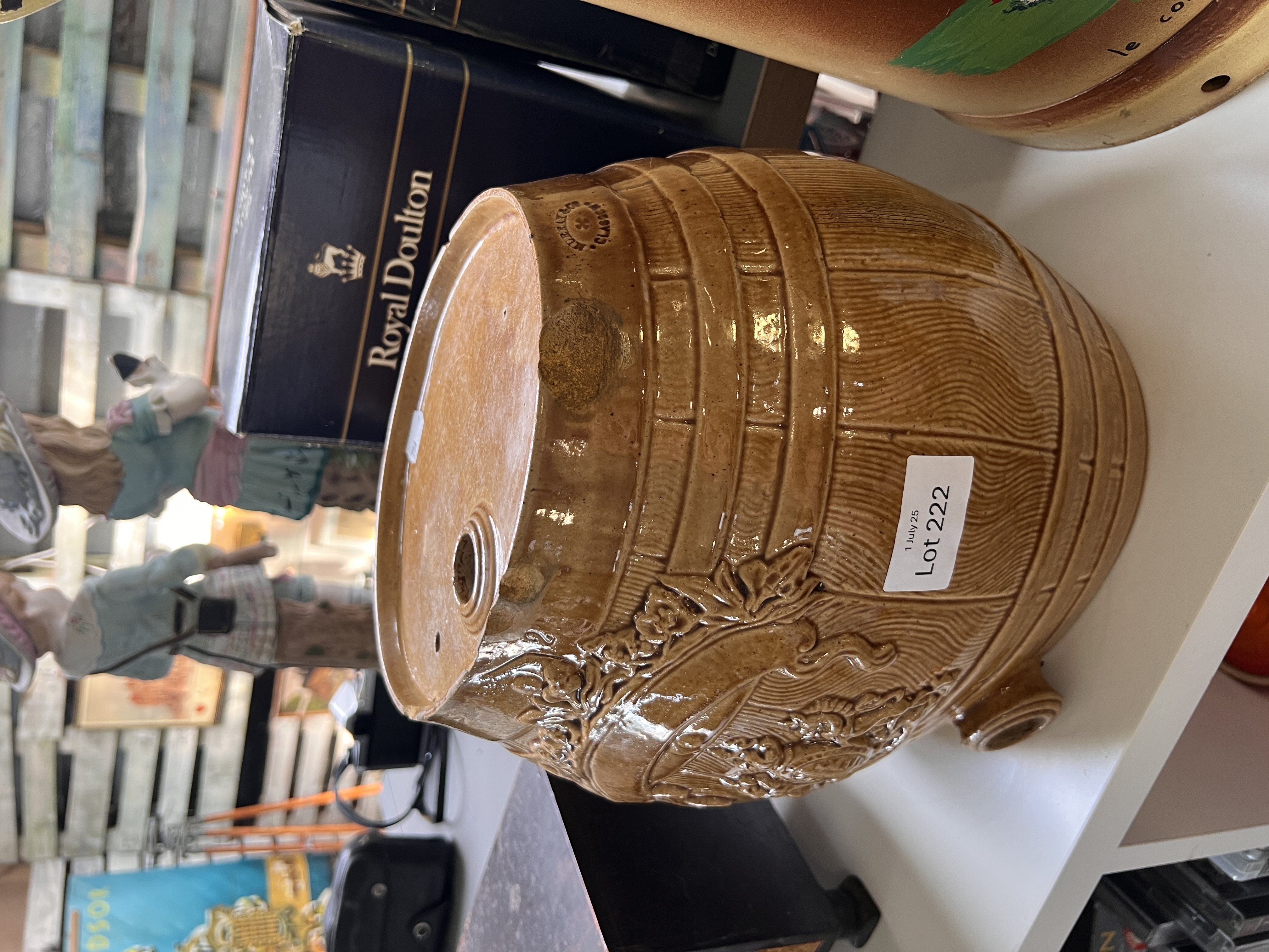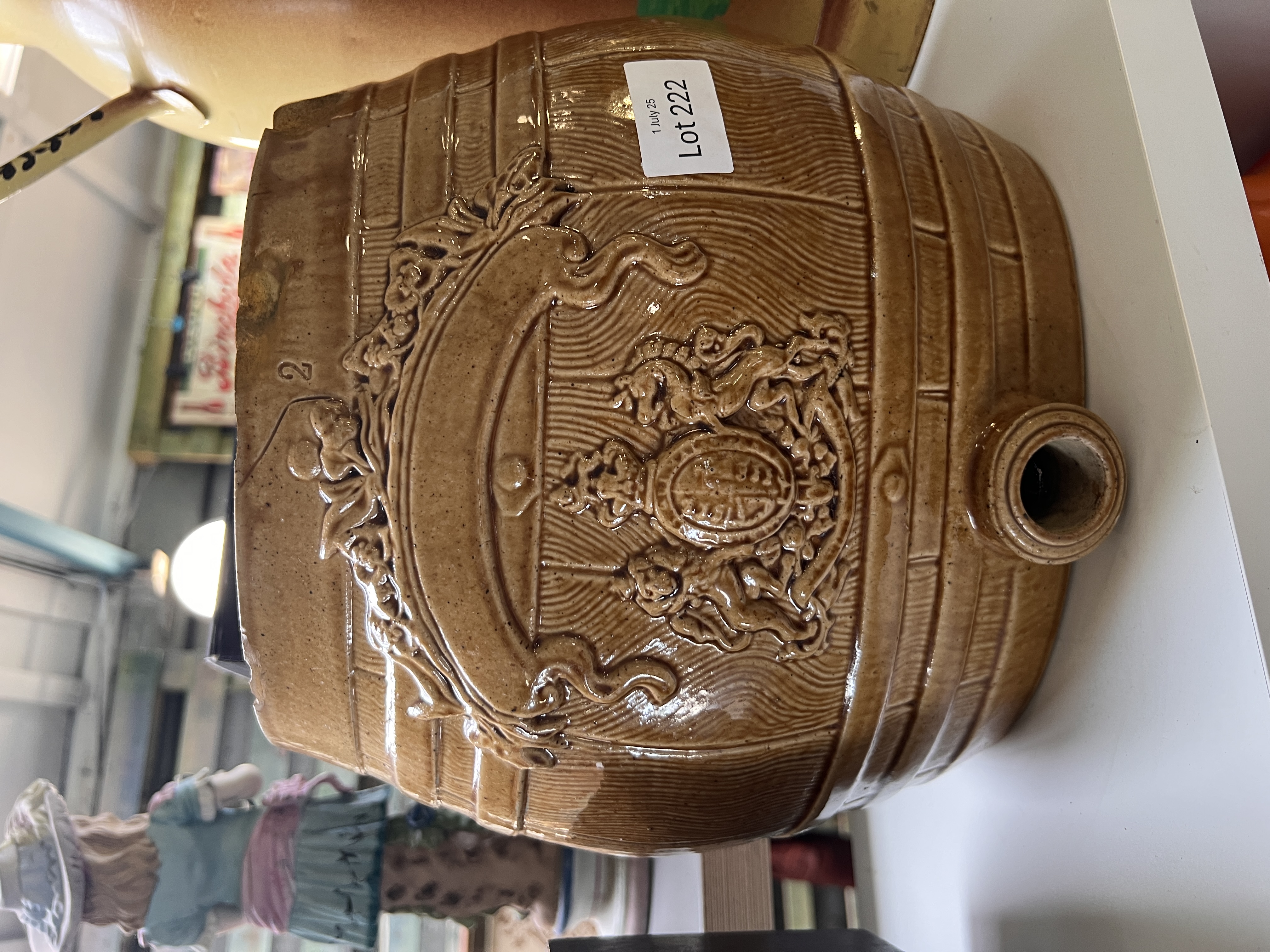 A Victorian salt glazed ceramic barrel with crest.