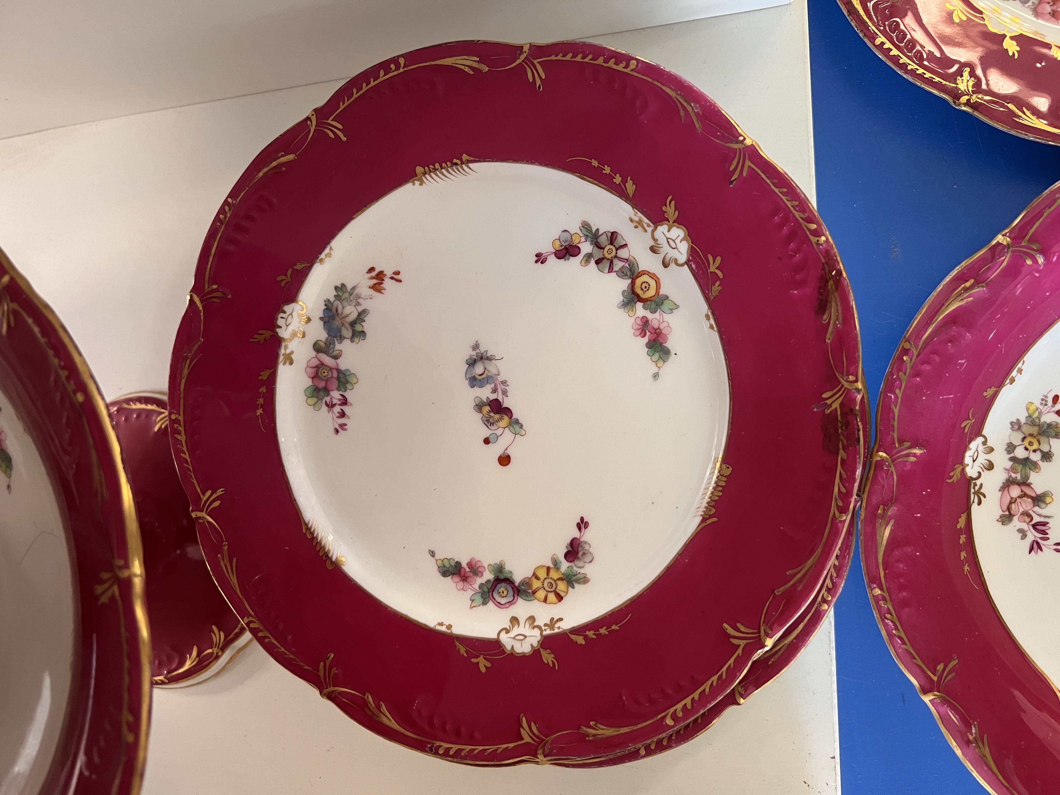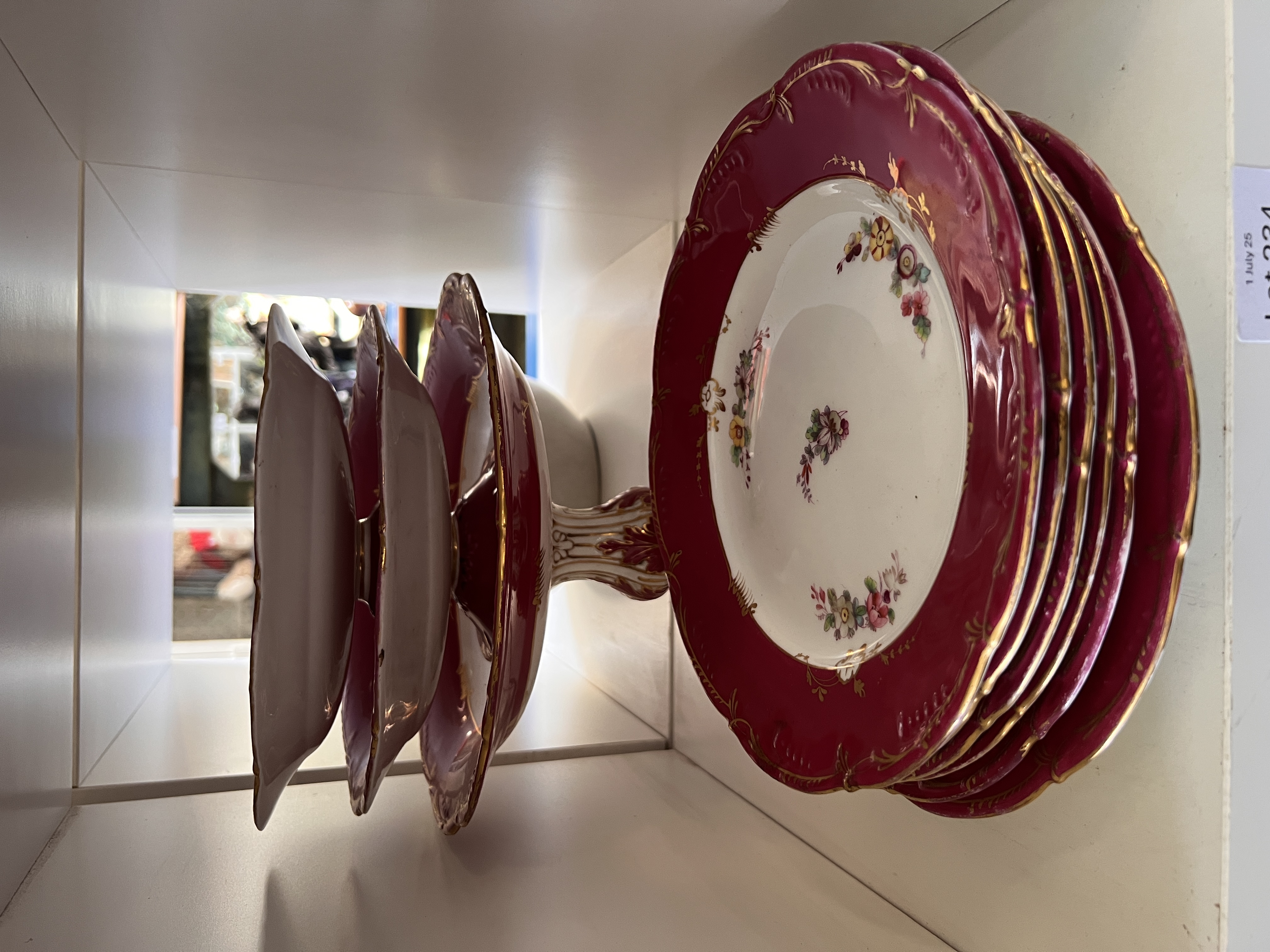 A selection of Victorian German porcelain hand decorated plates and cake stands.