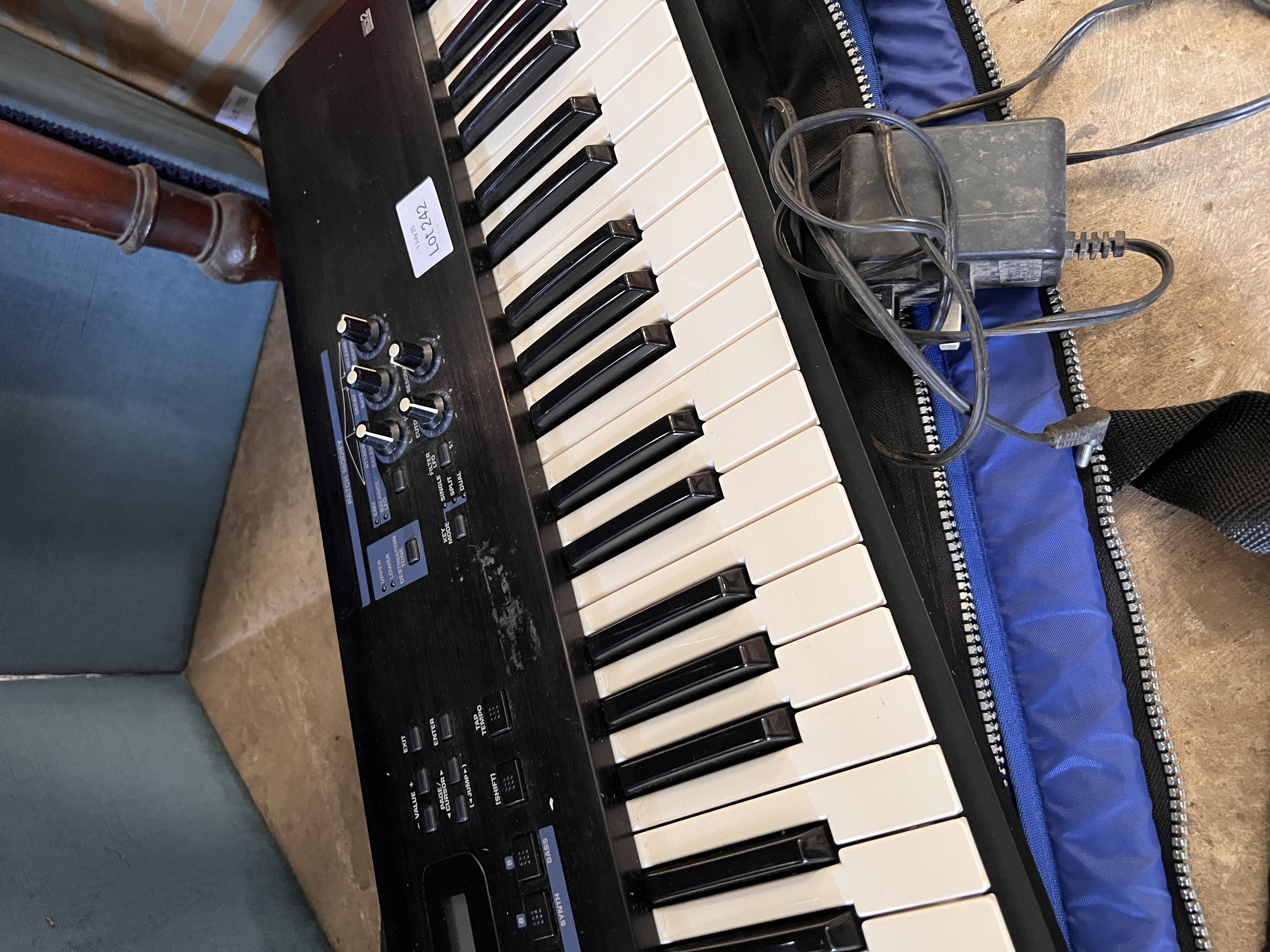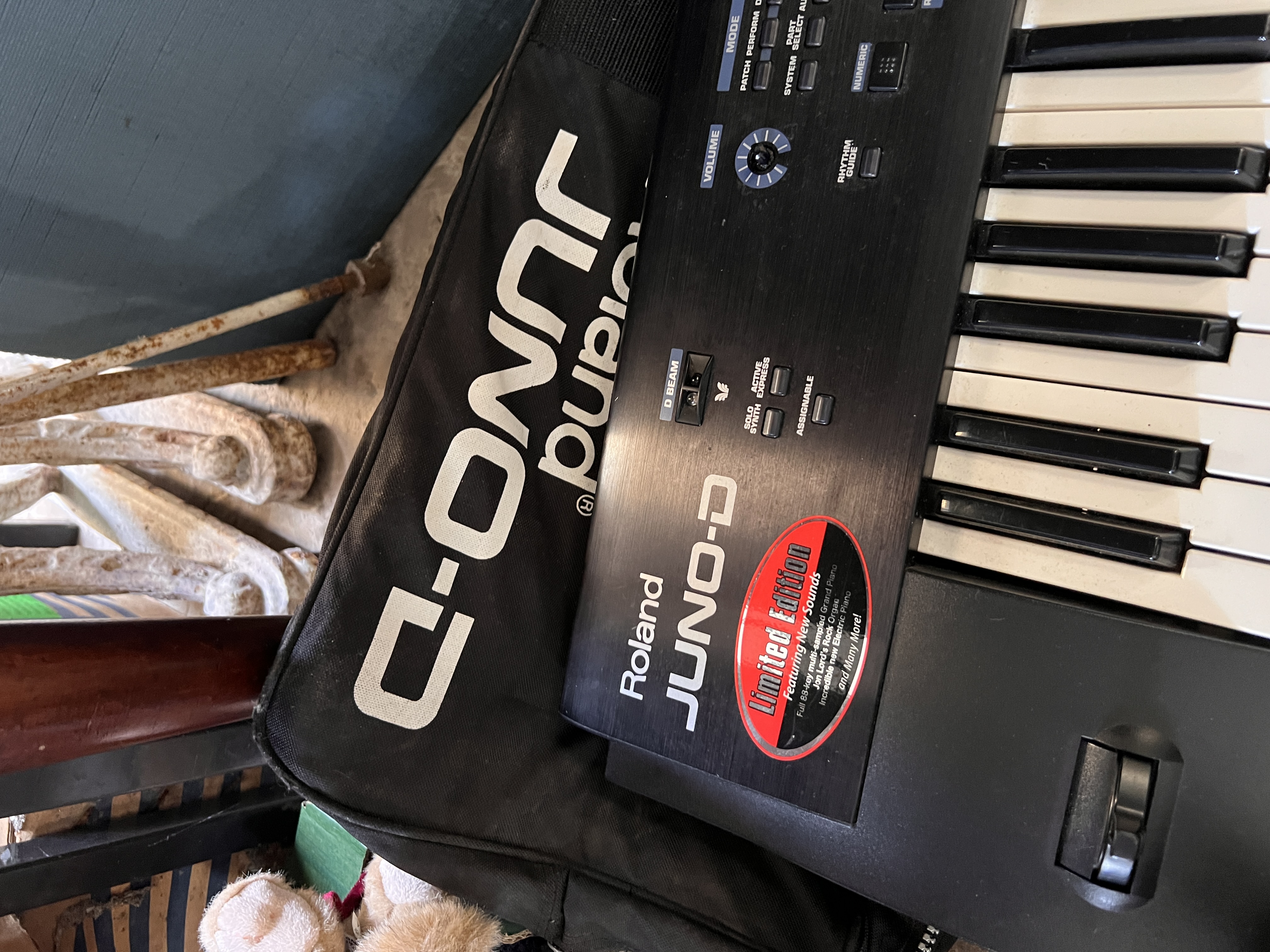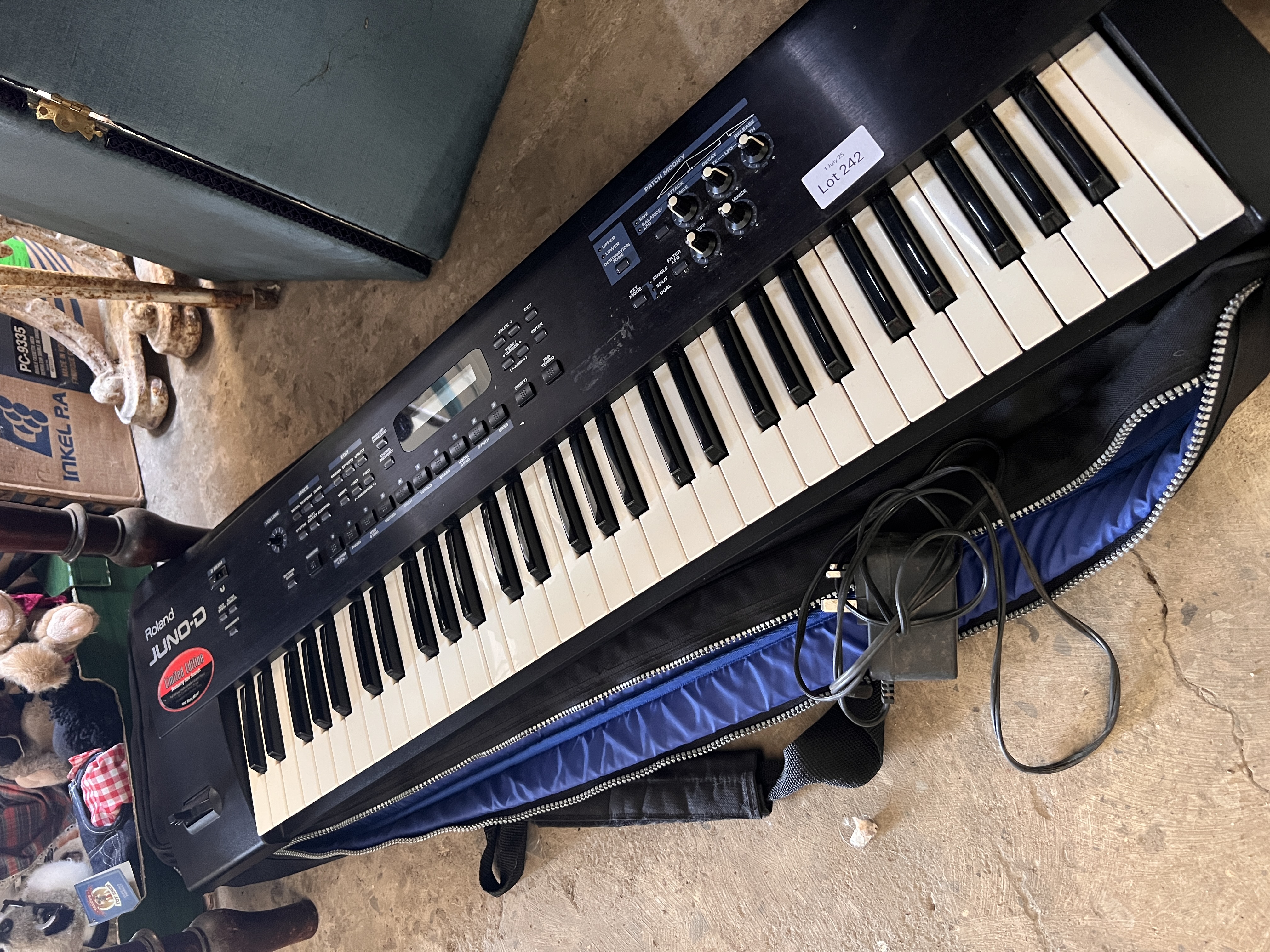 A Roland Juno – D synthesiser keyboard, with case and power.