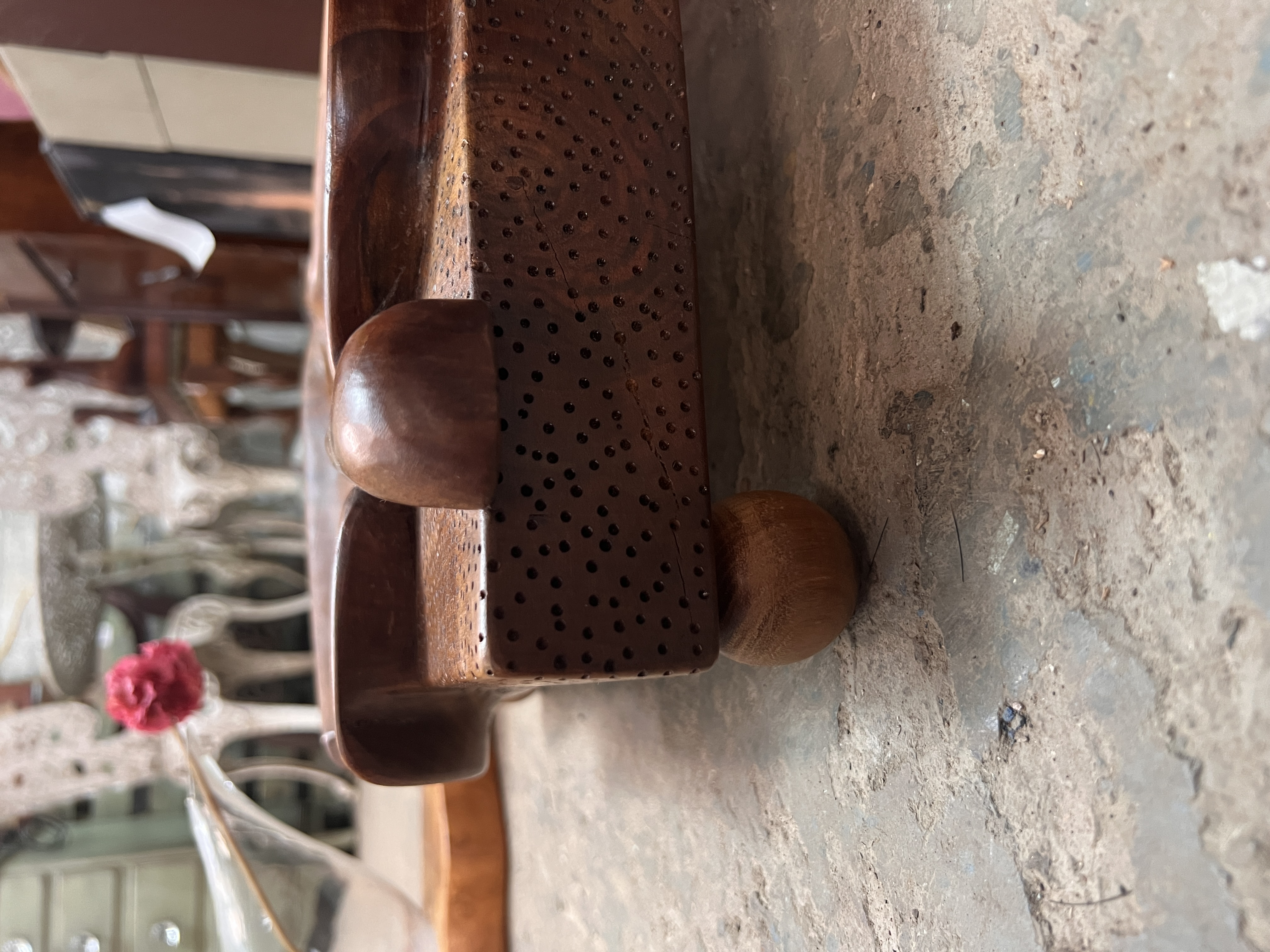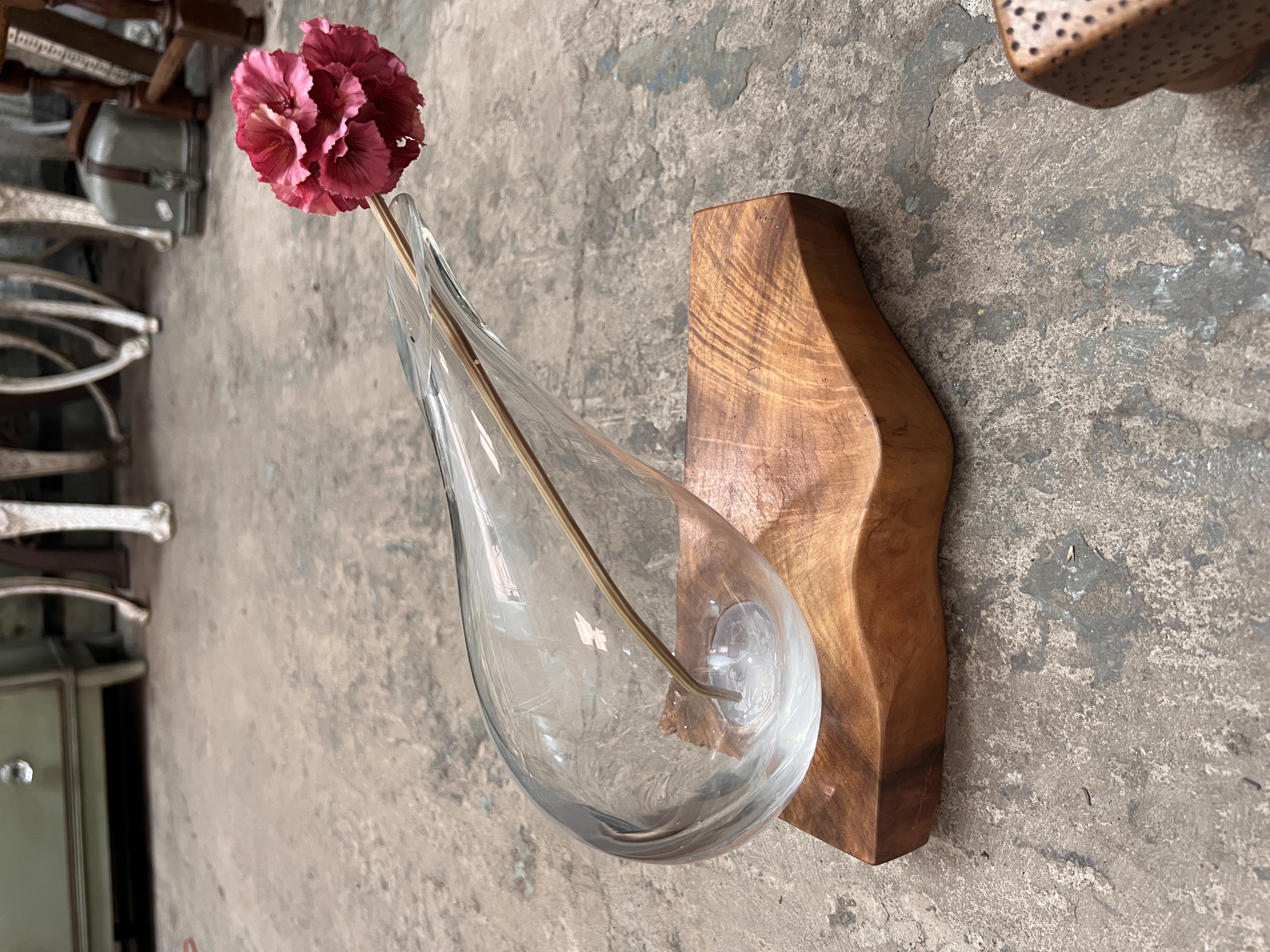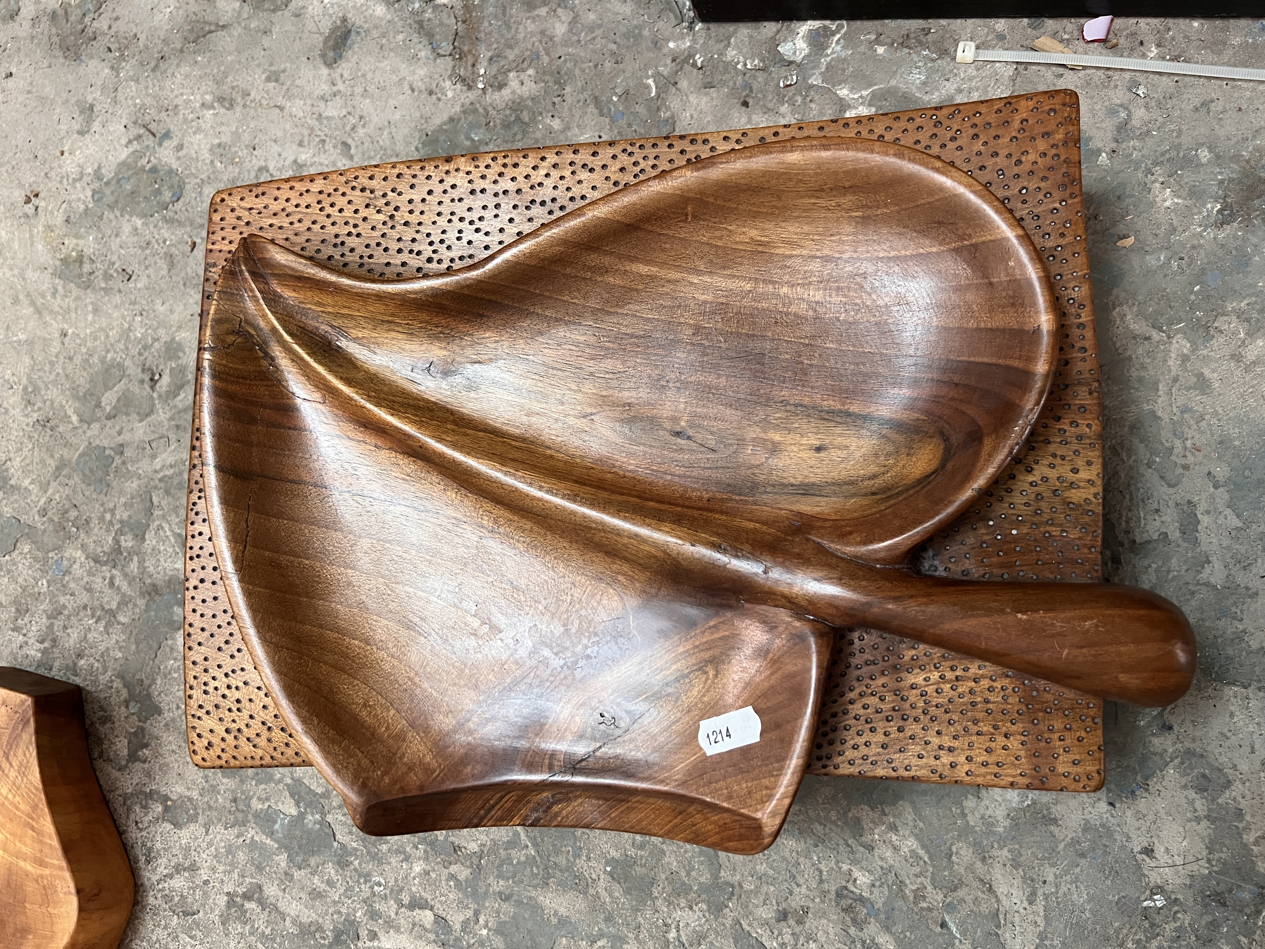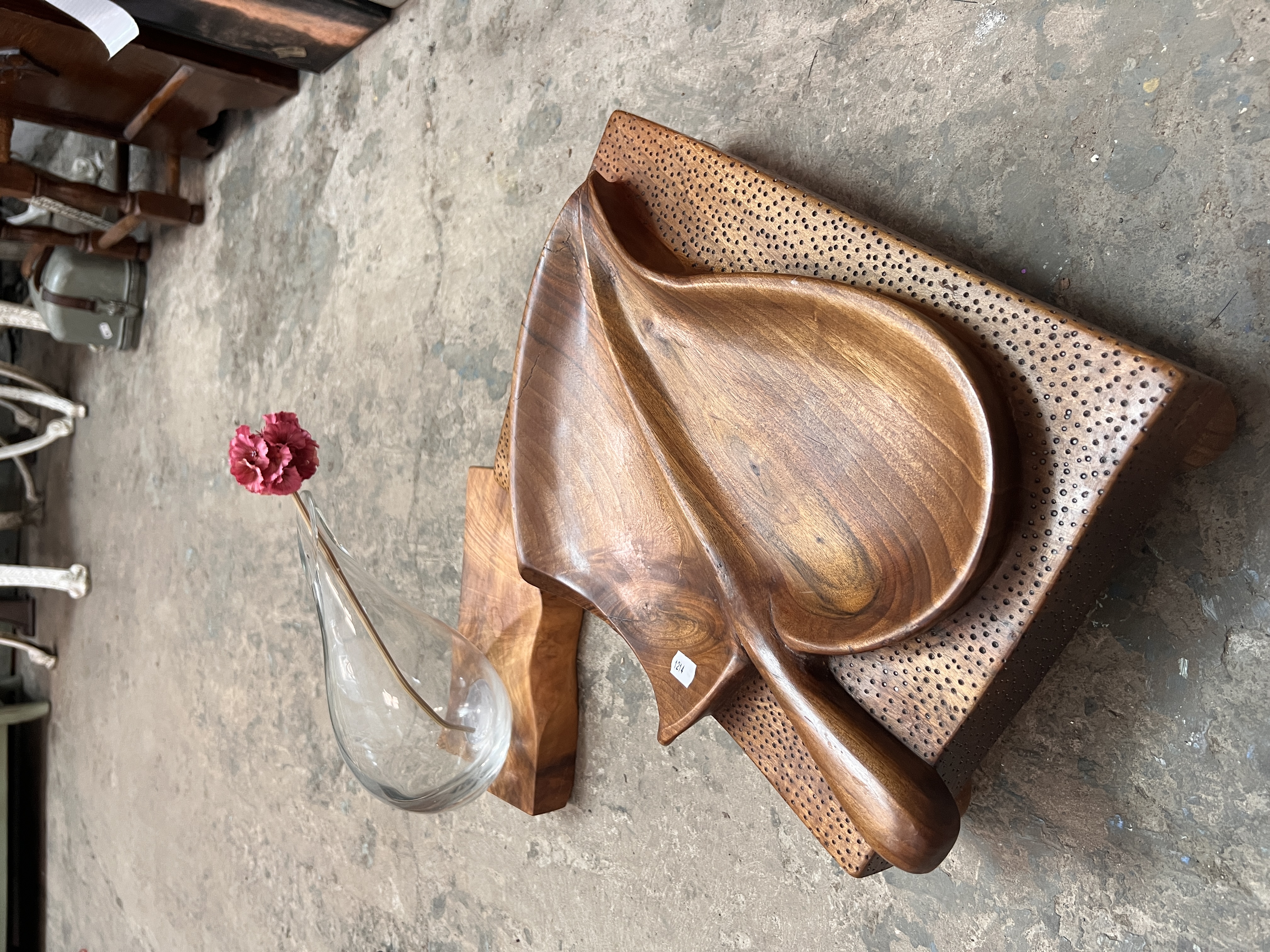 A contemporary hand carved teak wood leaf form dish with similar bottle vase.