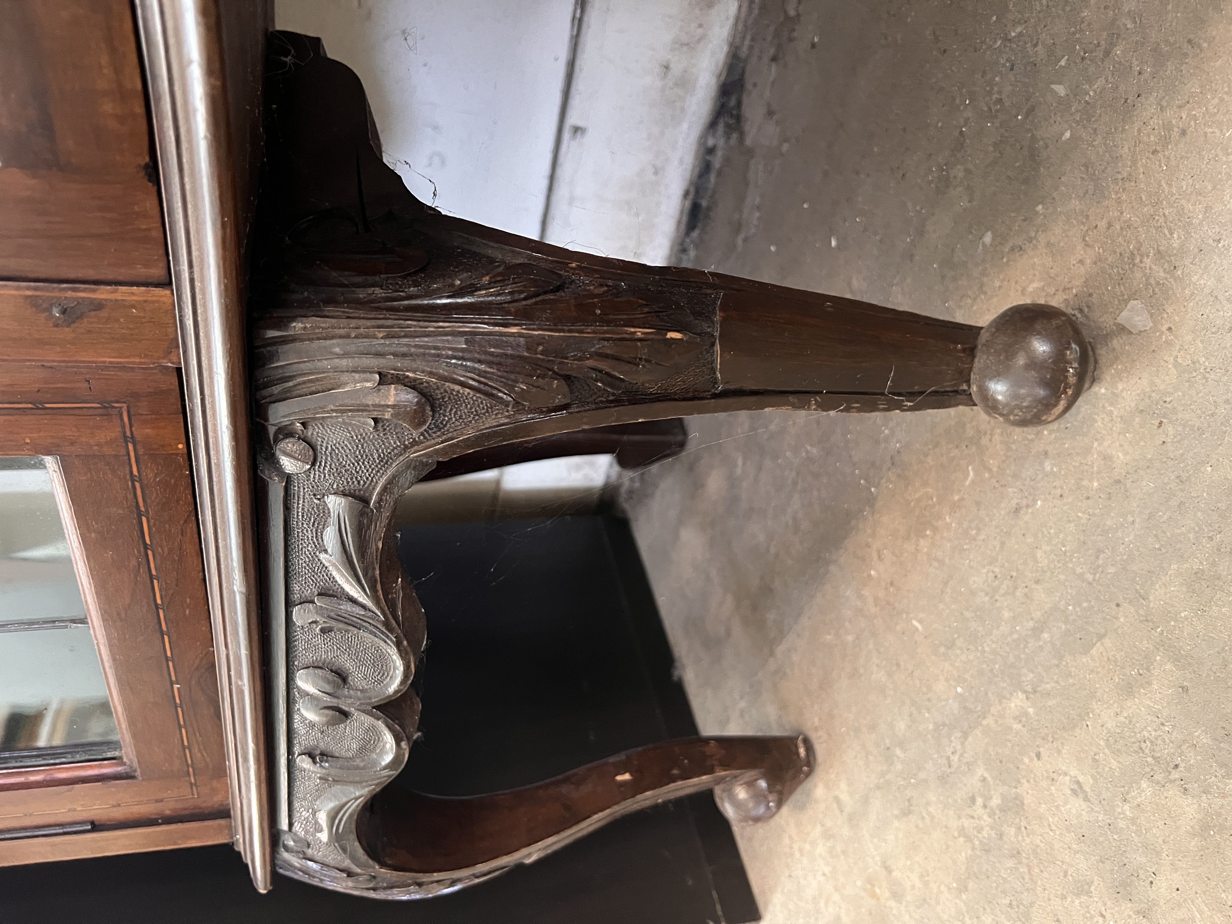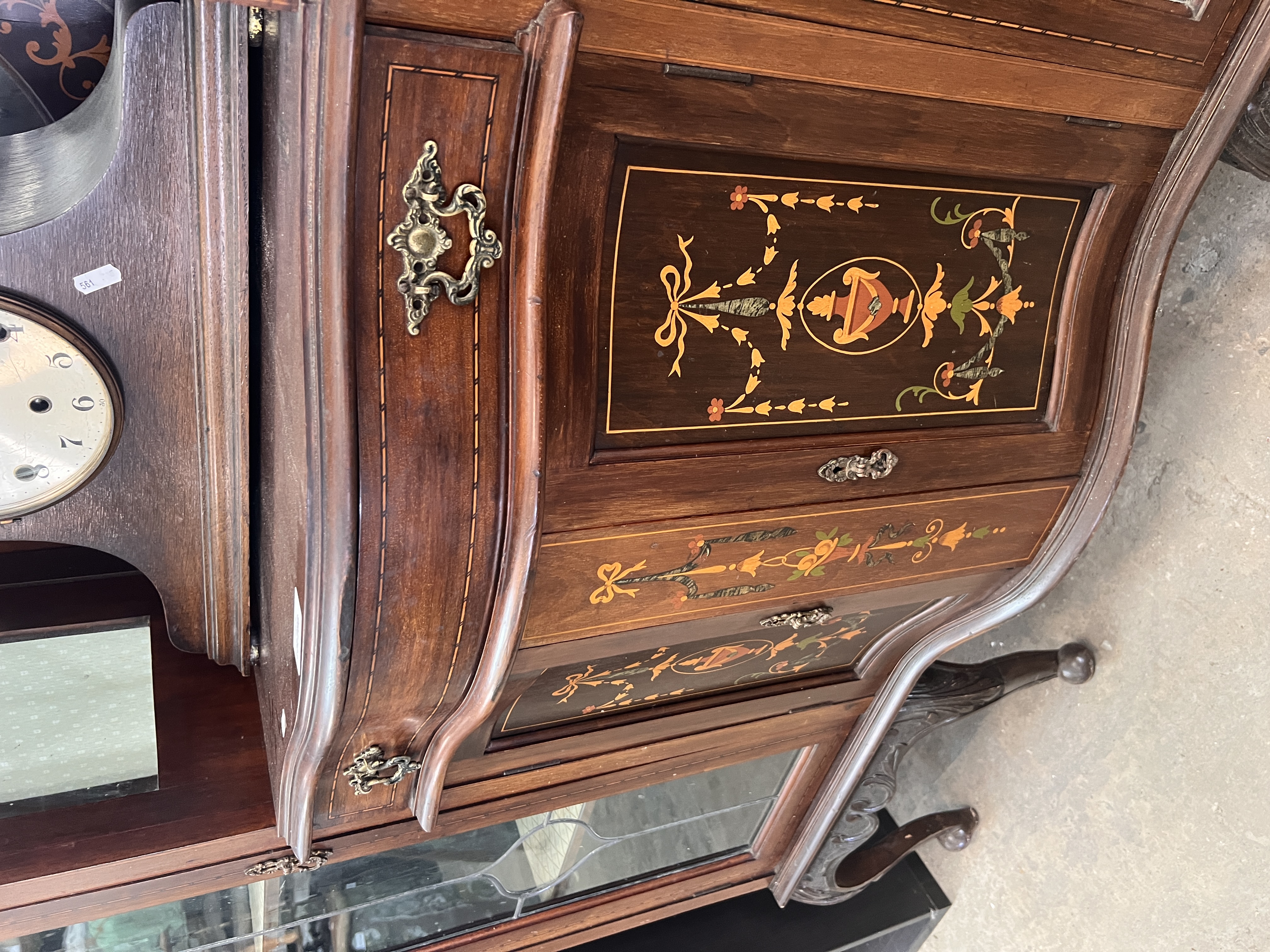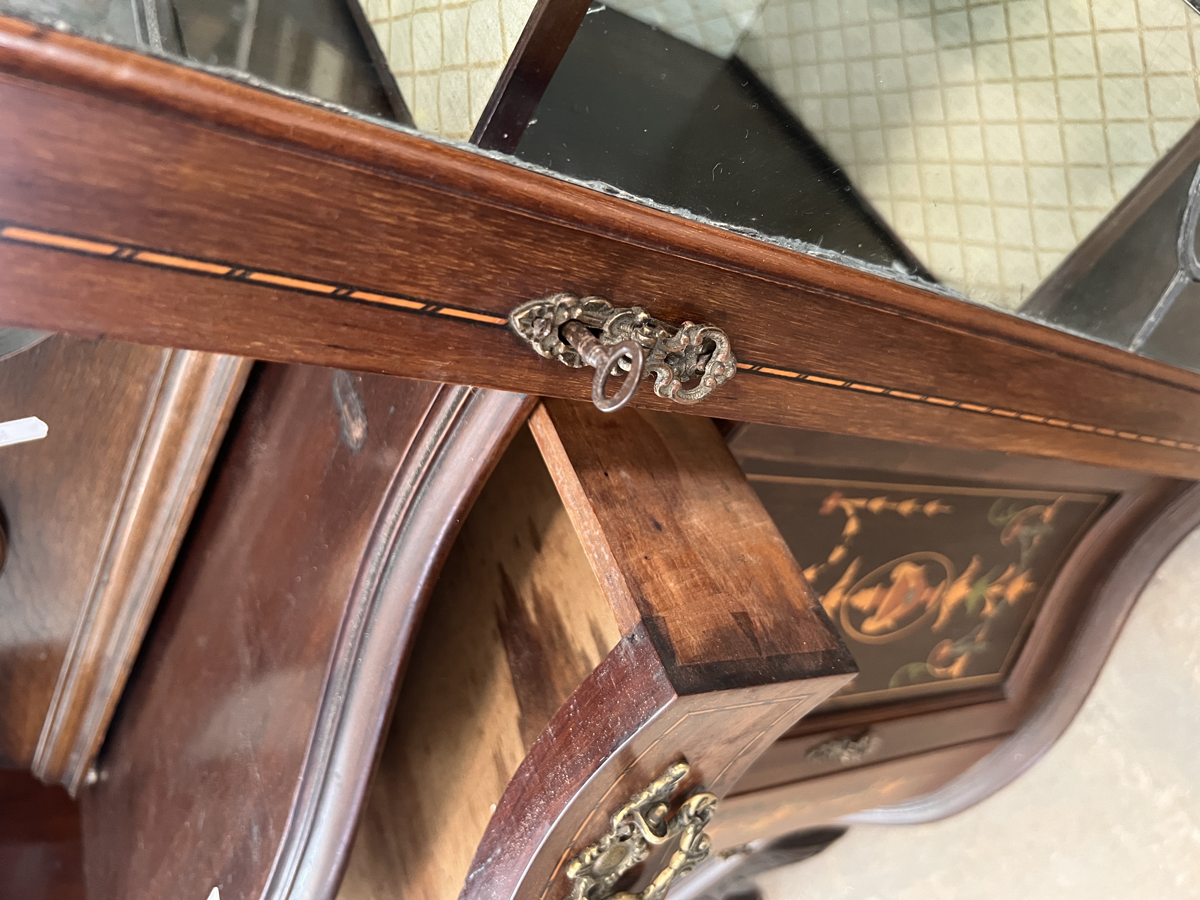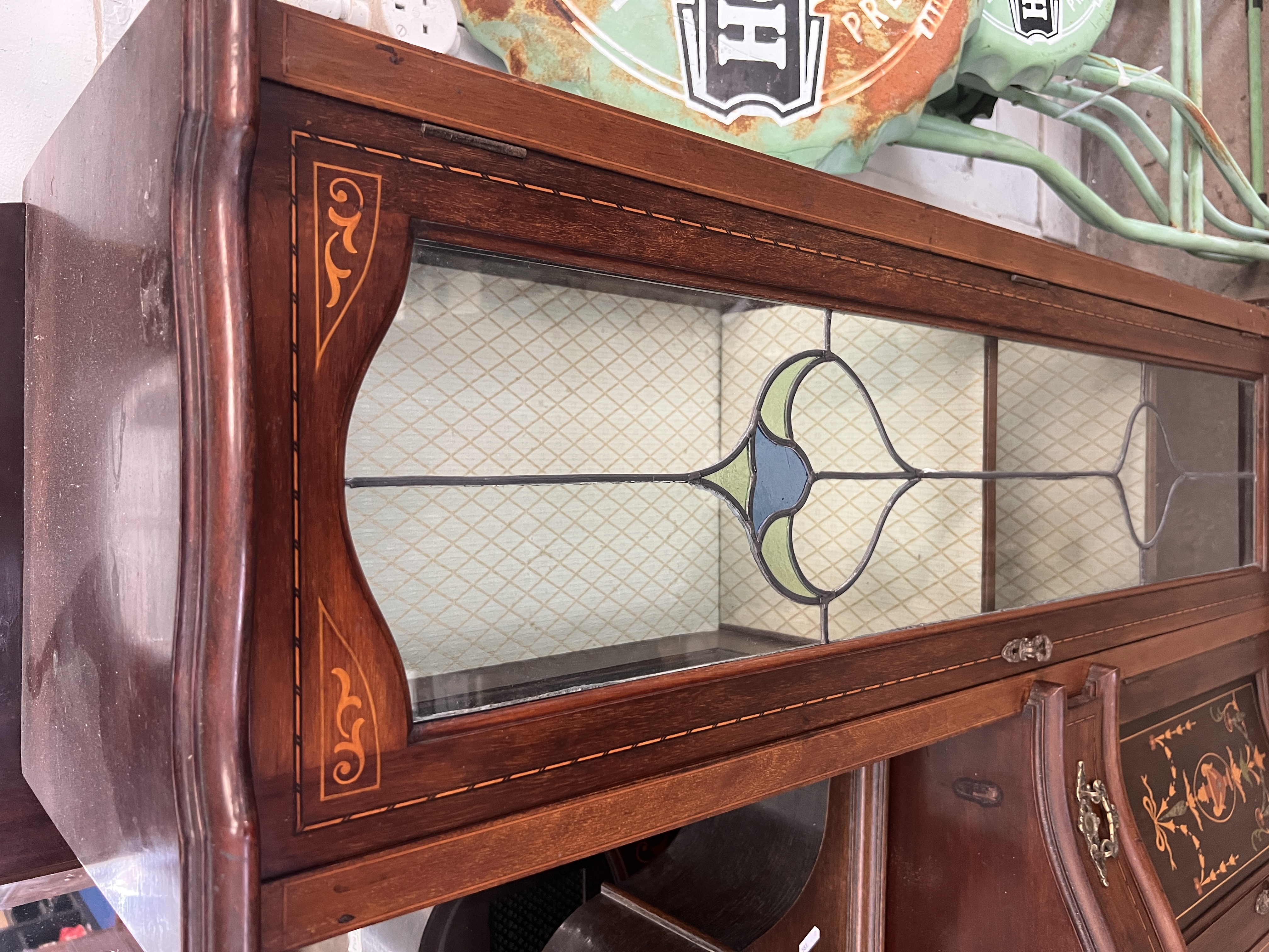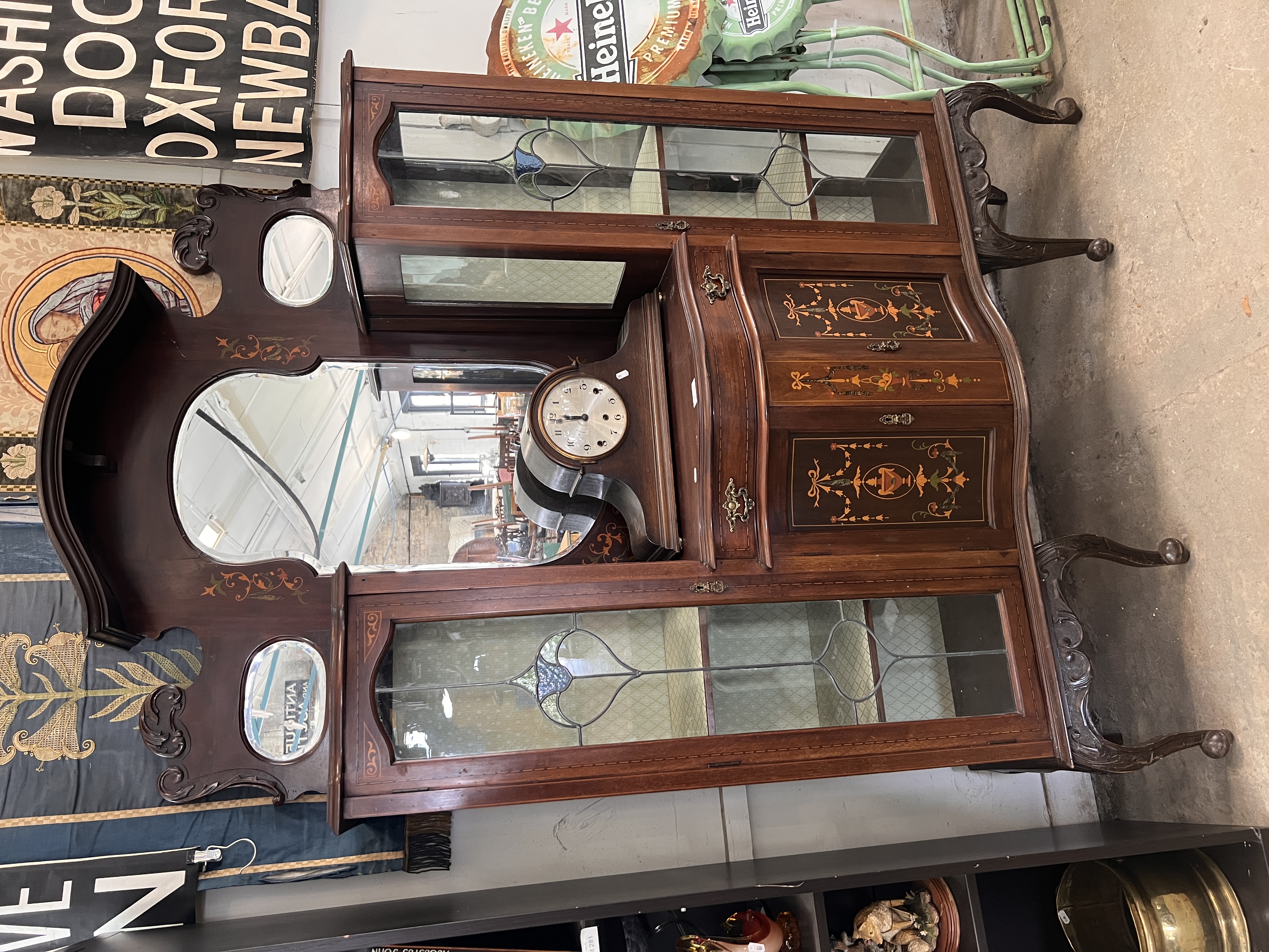 An Art Nouveau display case with mirror back sideboard, fine inlayed details, leaded light and satin lined cupboards. 135cm wide 208cm tall, mirror back detaches.