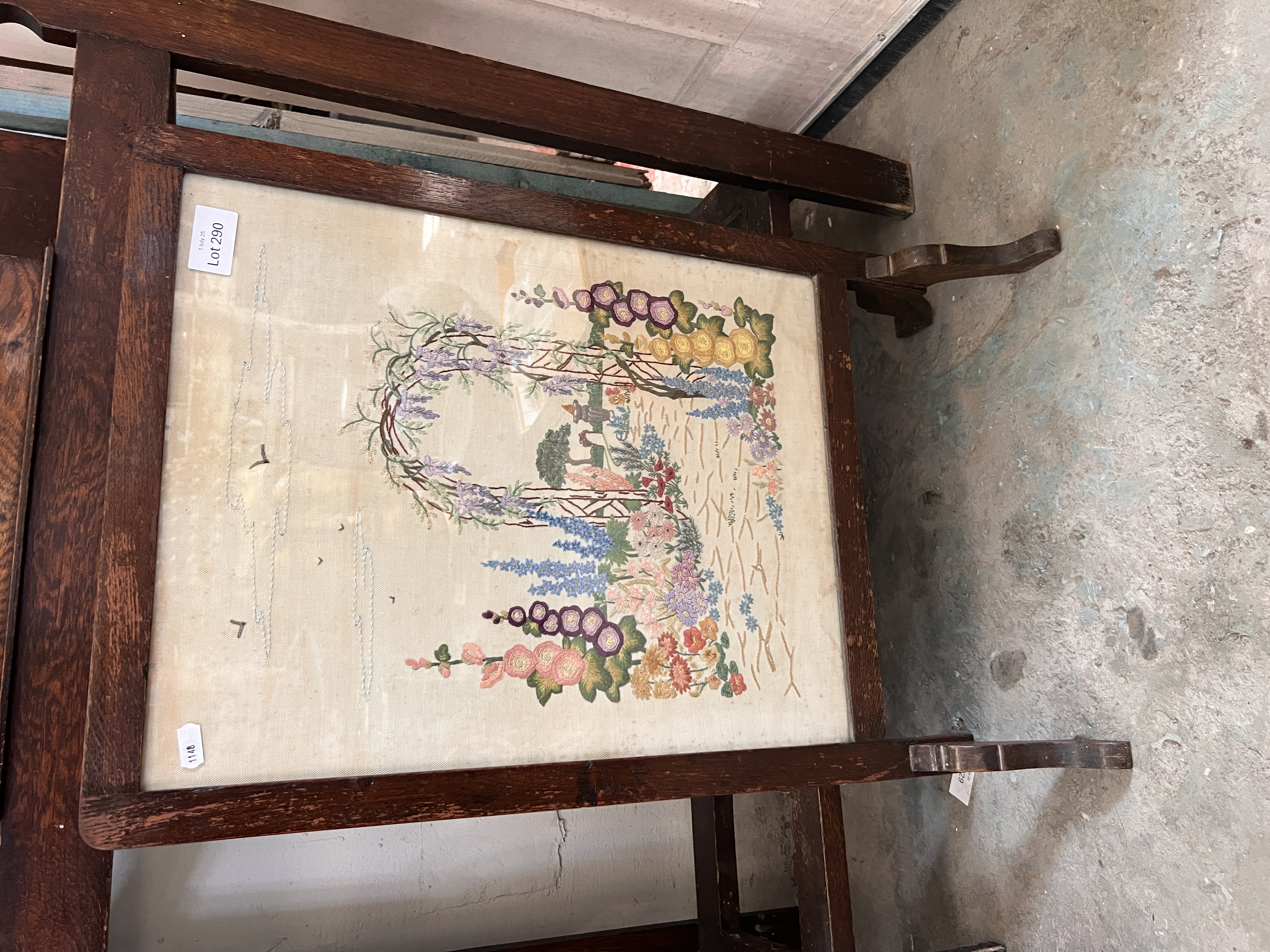 An Edwardian fire screen with embroidered image.