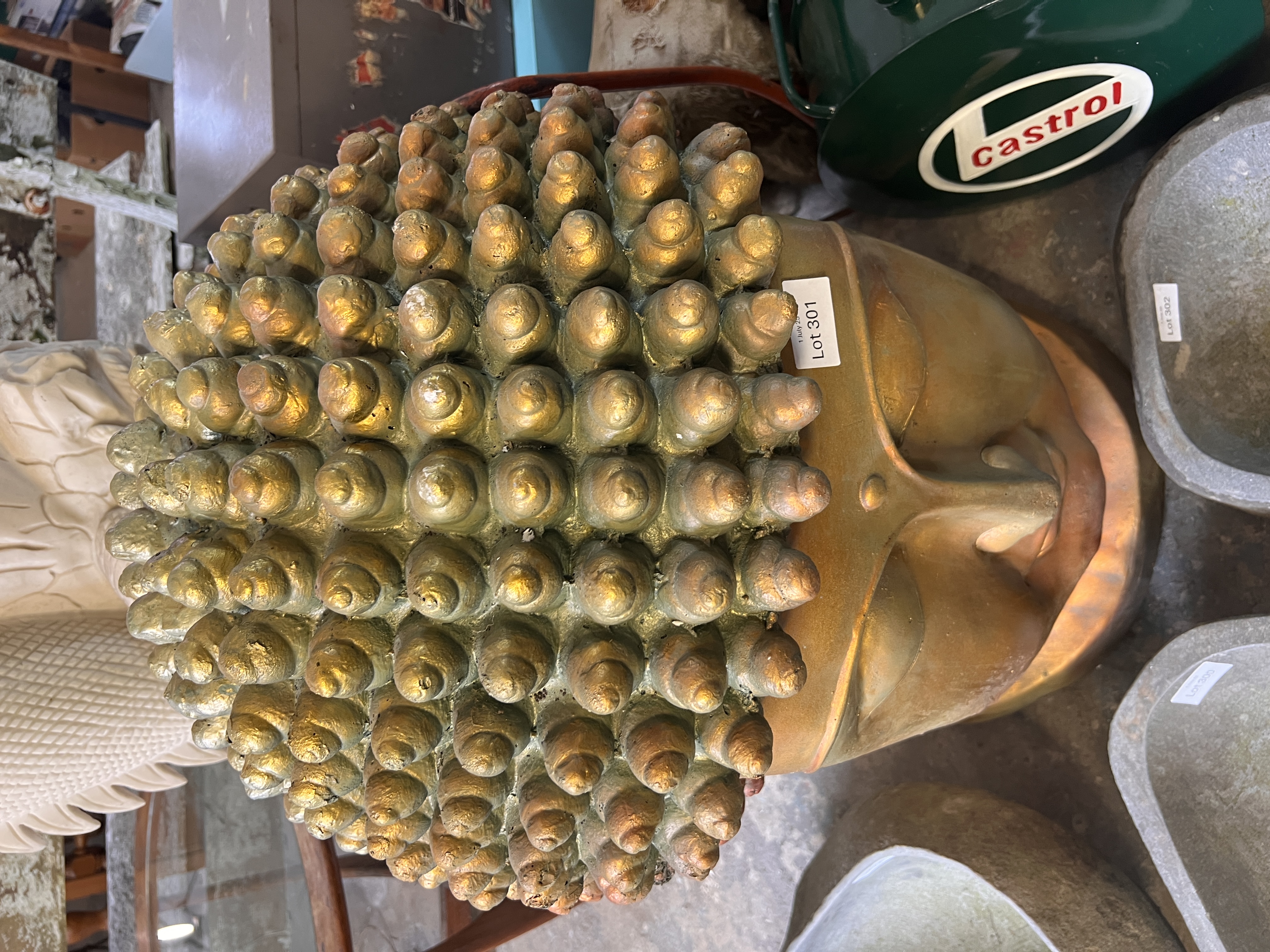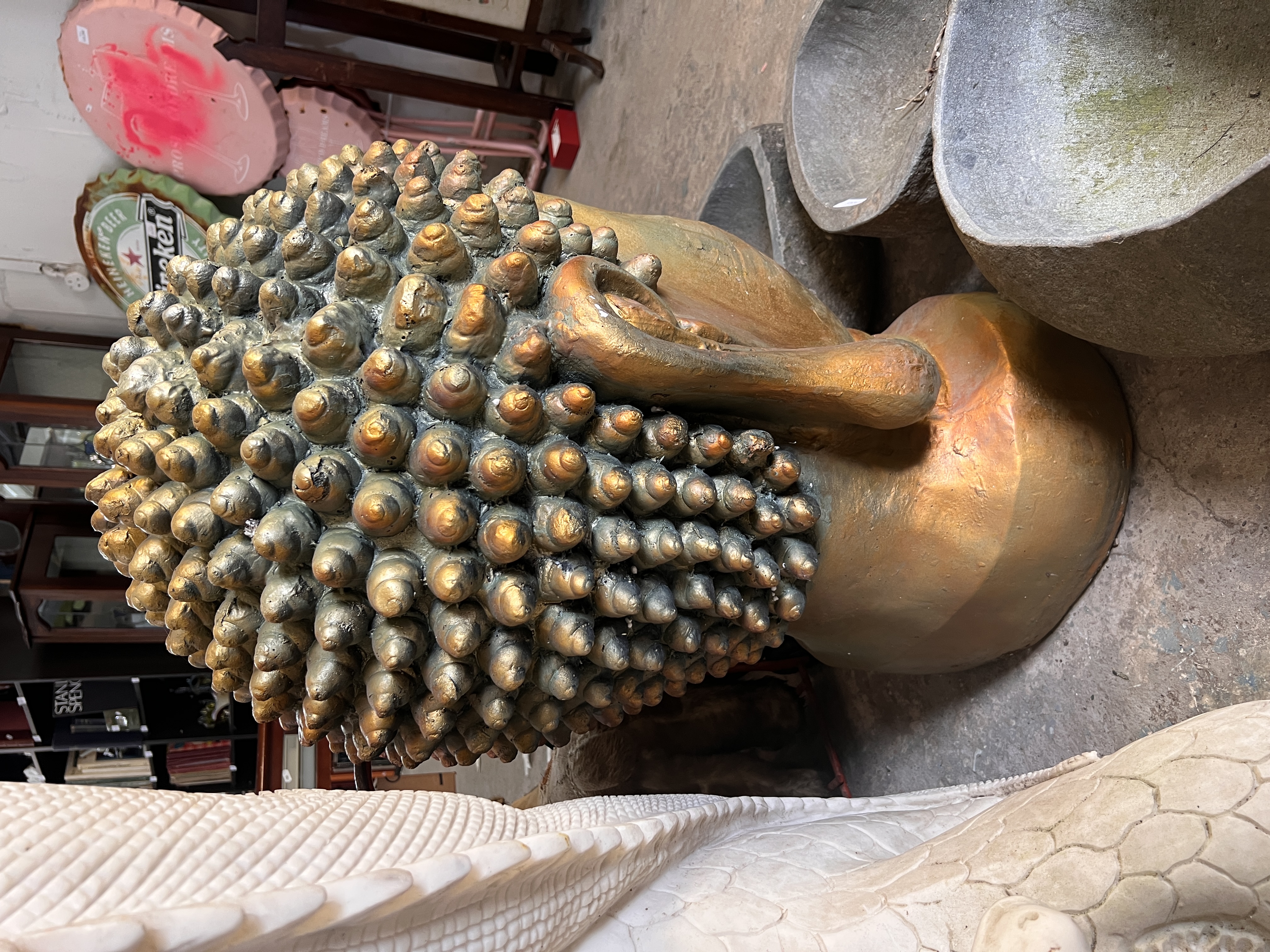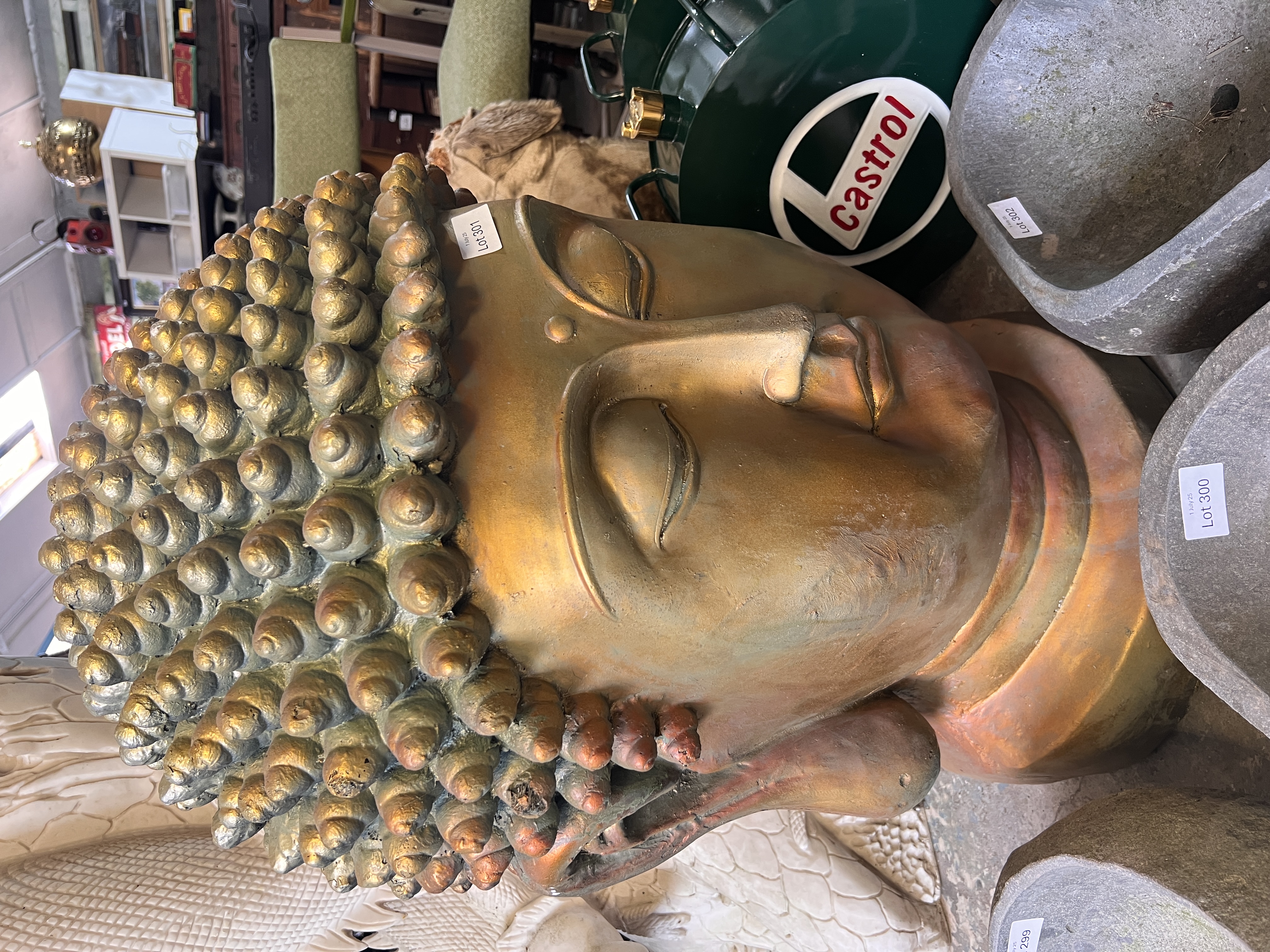 A large Tibetan style golden Buddha head garden statue. 85cm tall.