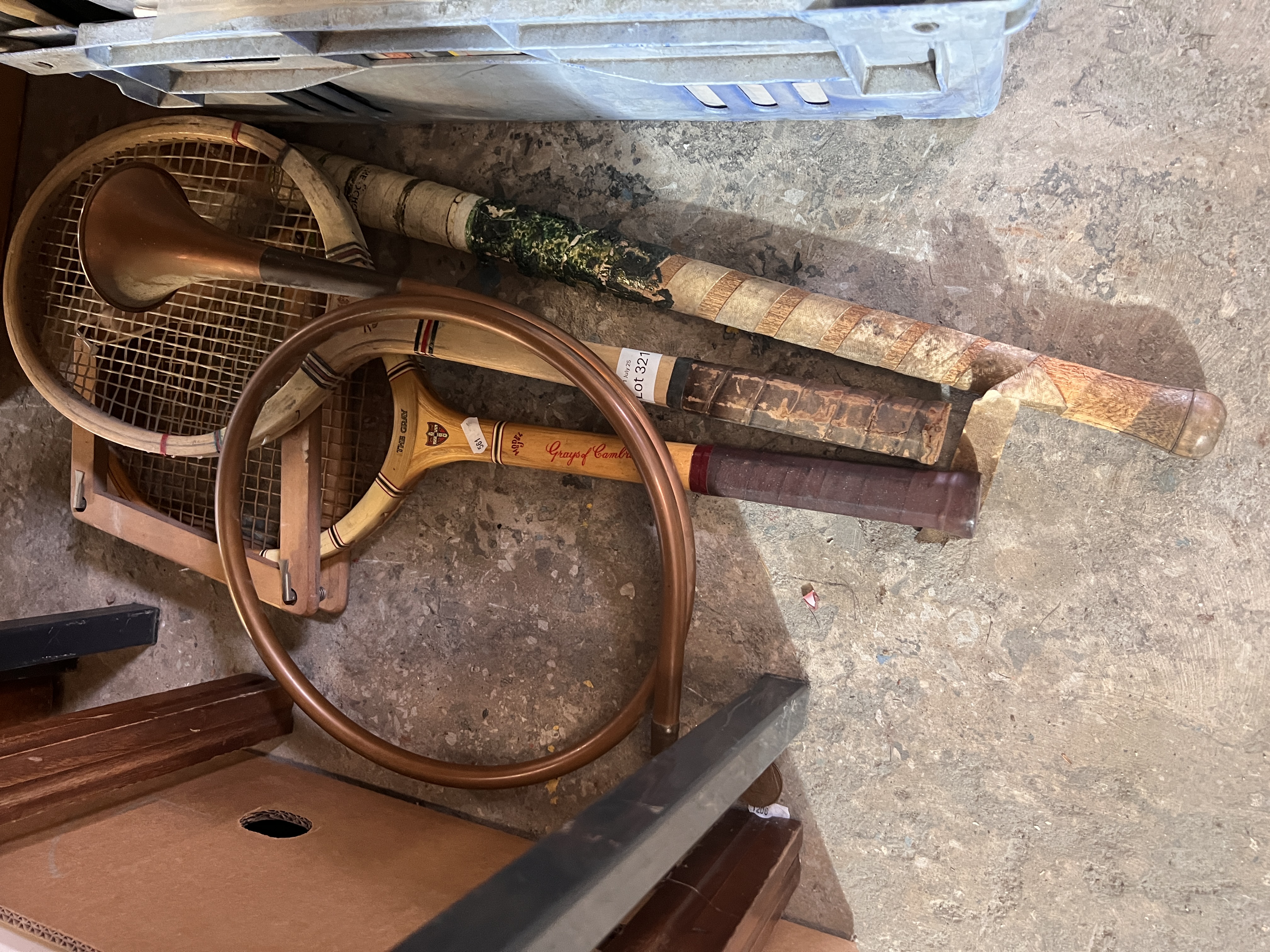 Two vintage tennis rackets a hocky stick and copper hunting horn.