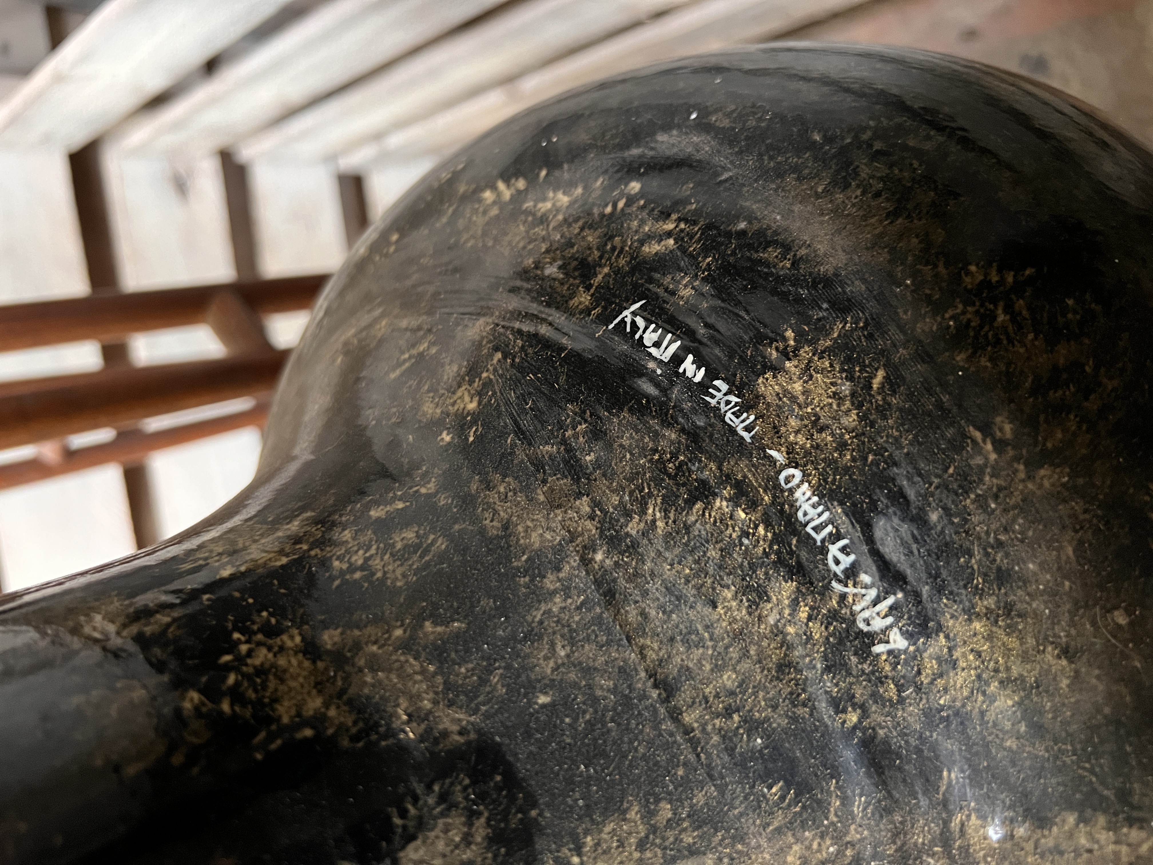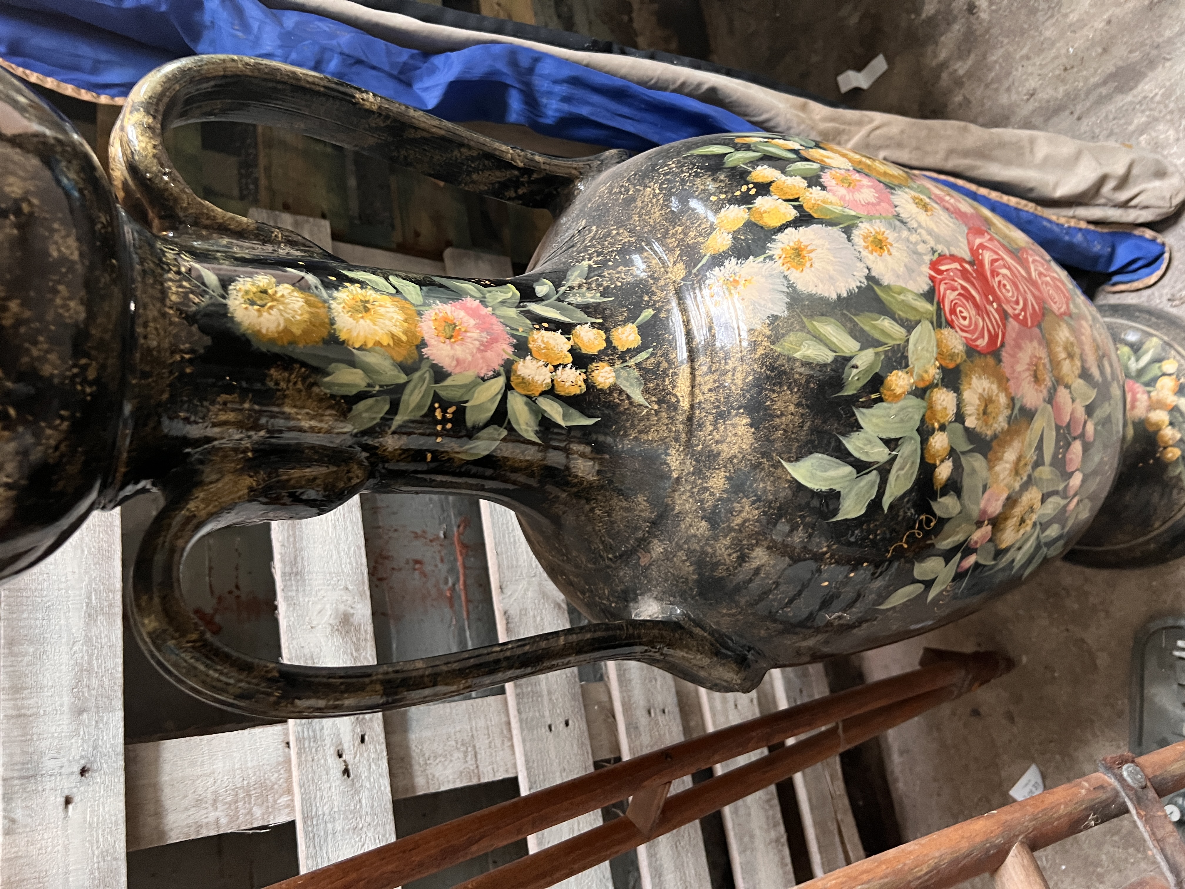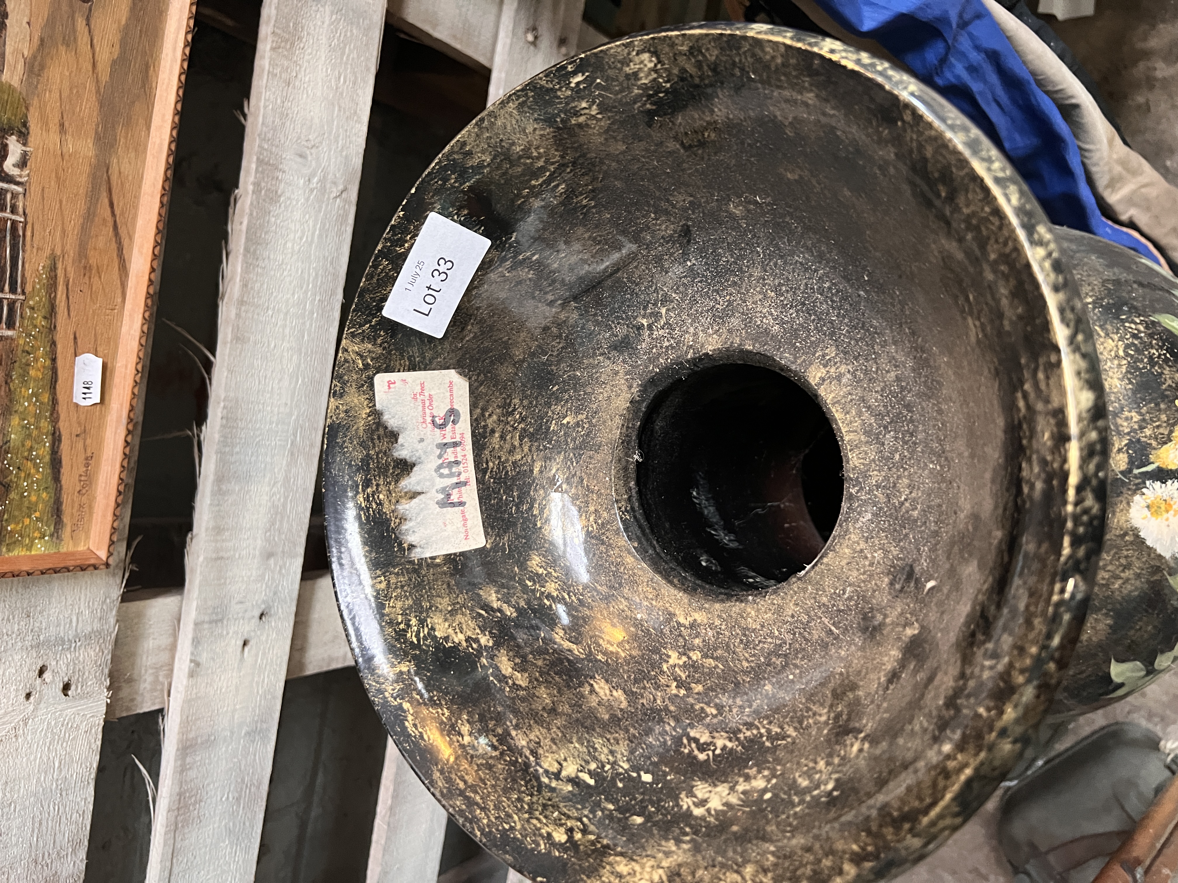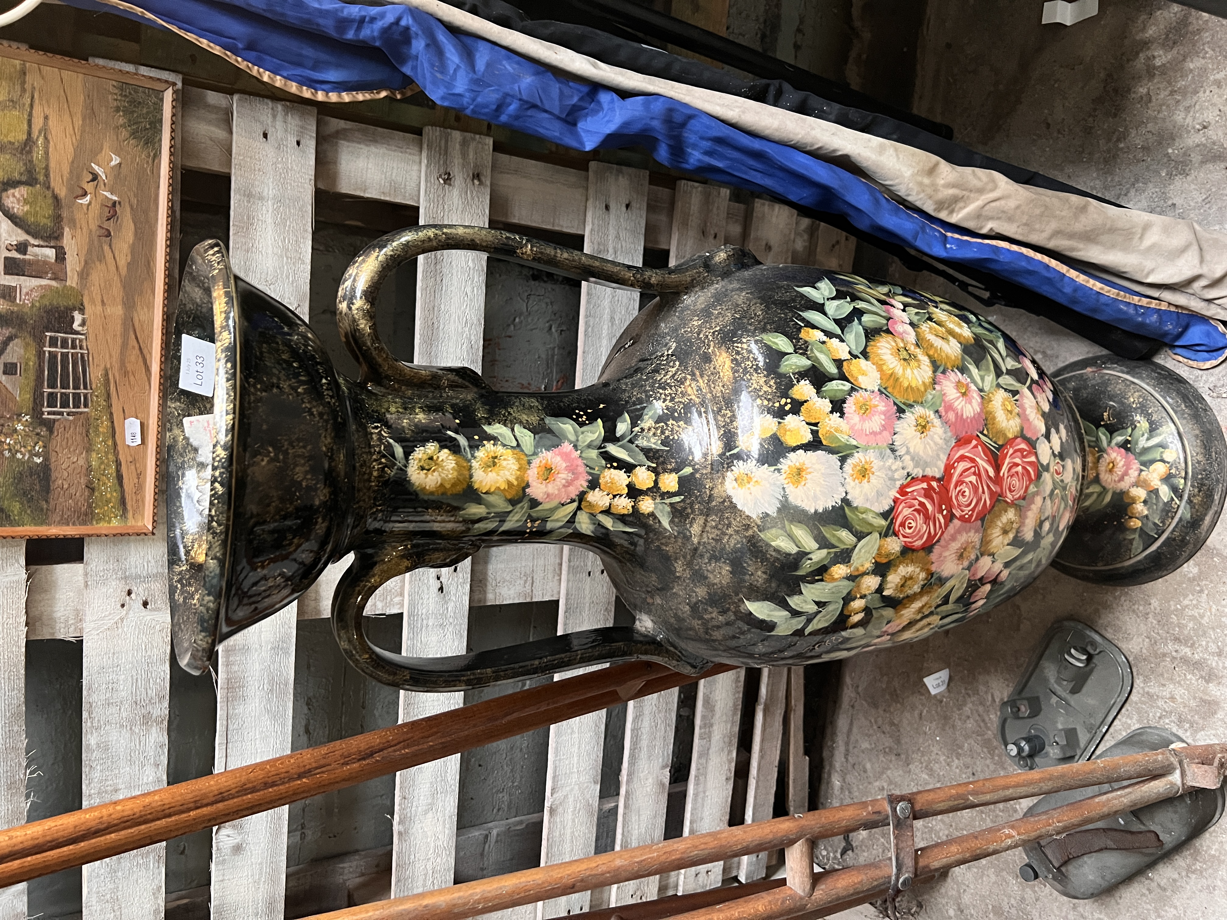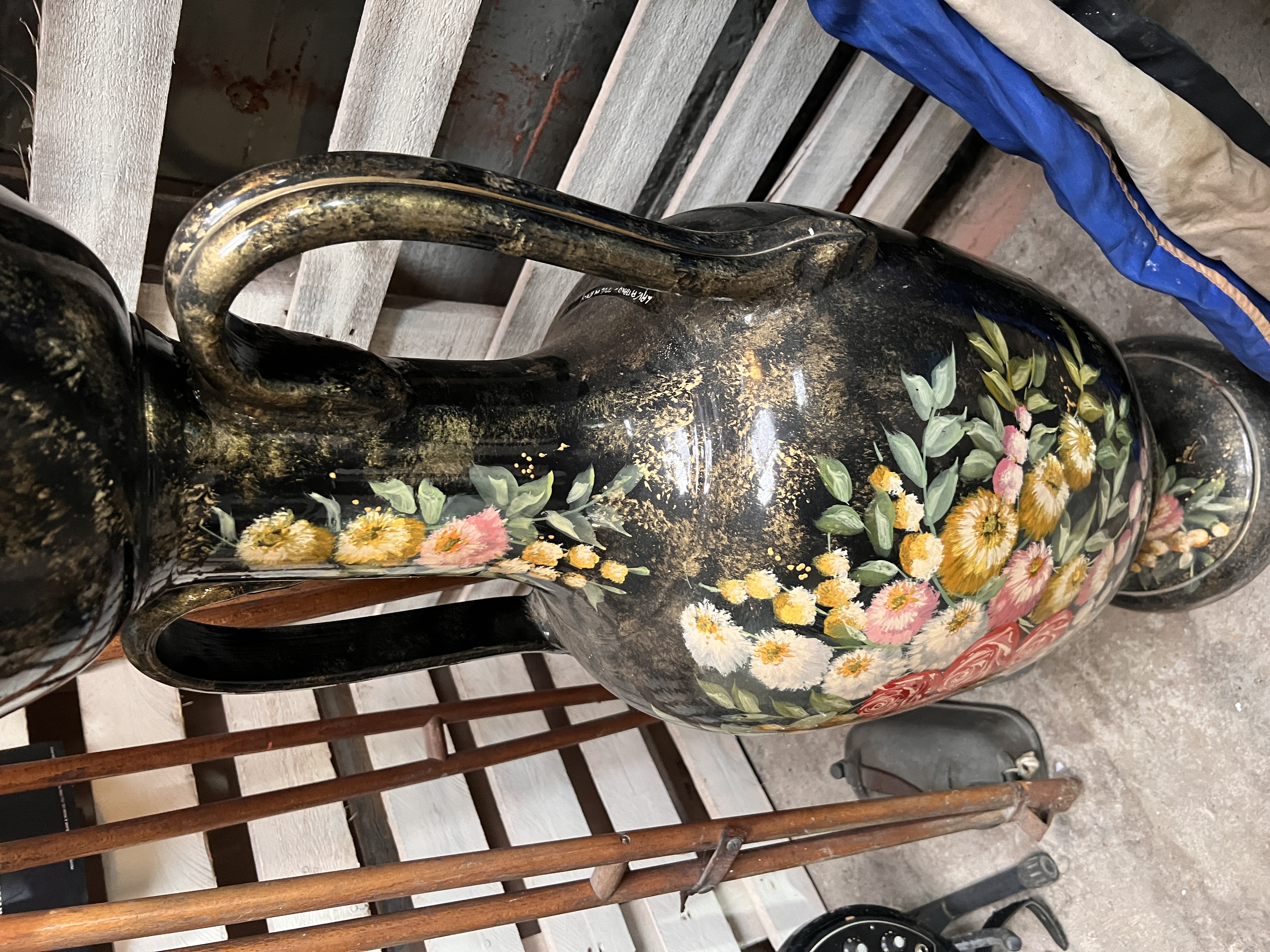 A mid century large floor standing twin handle vase, hand decorated signed Lav Anamo. 102cm tall, no damage.