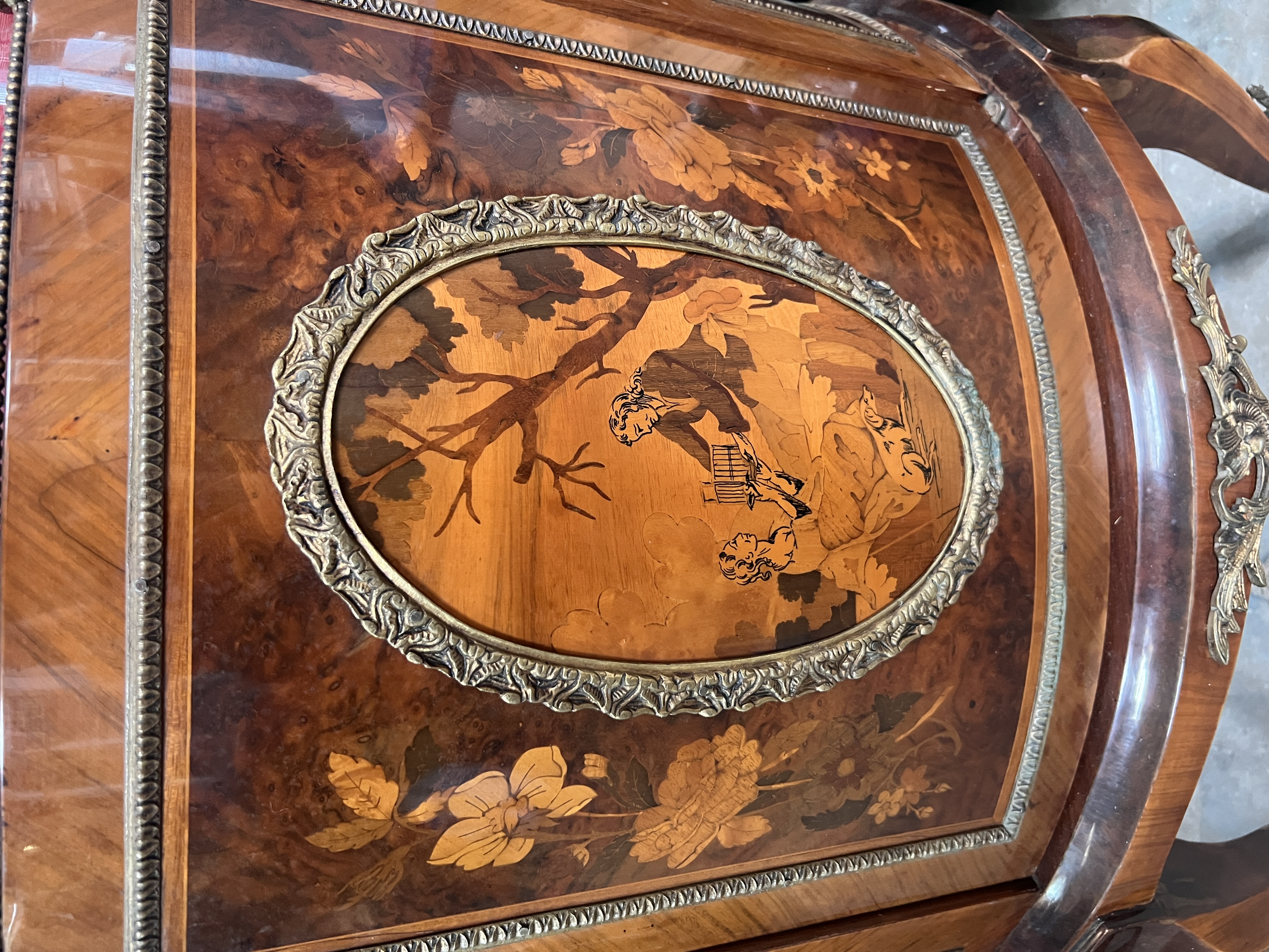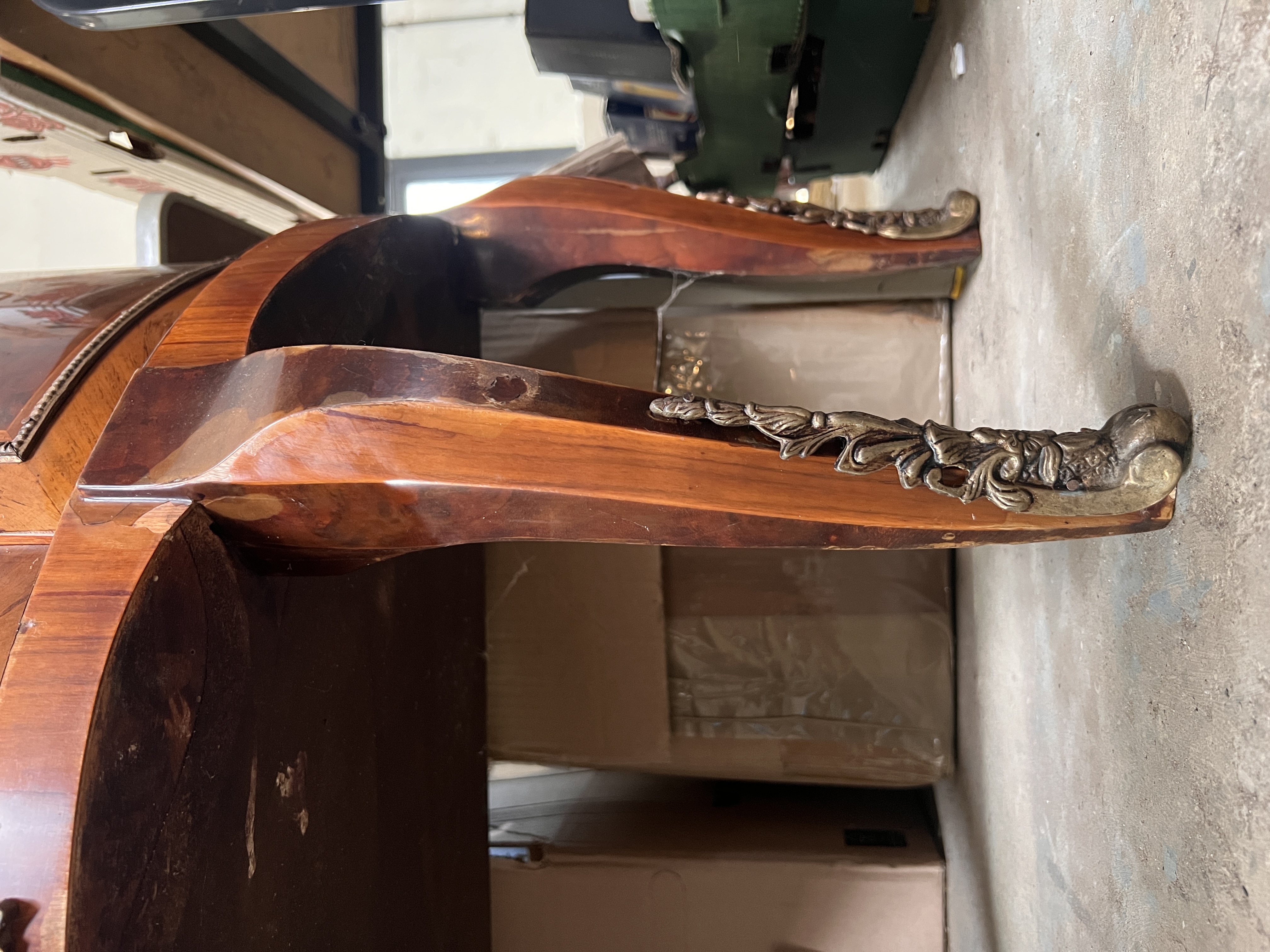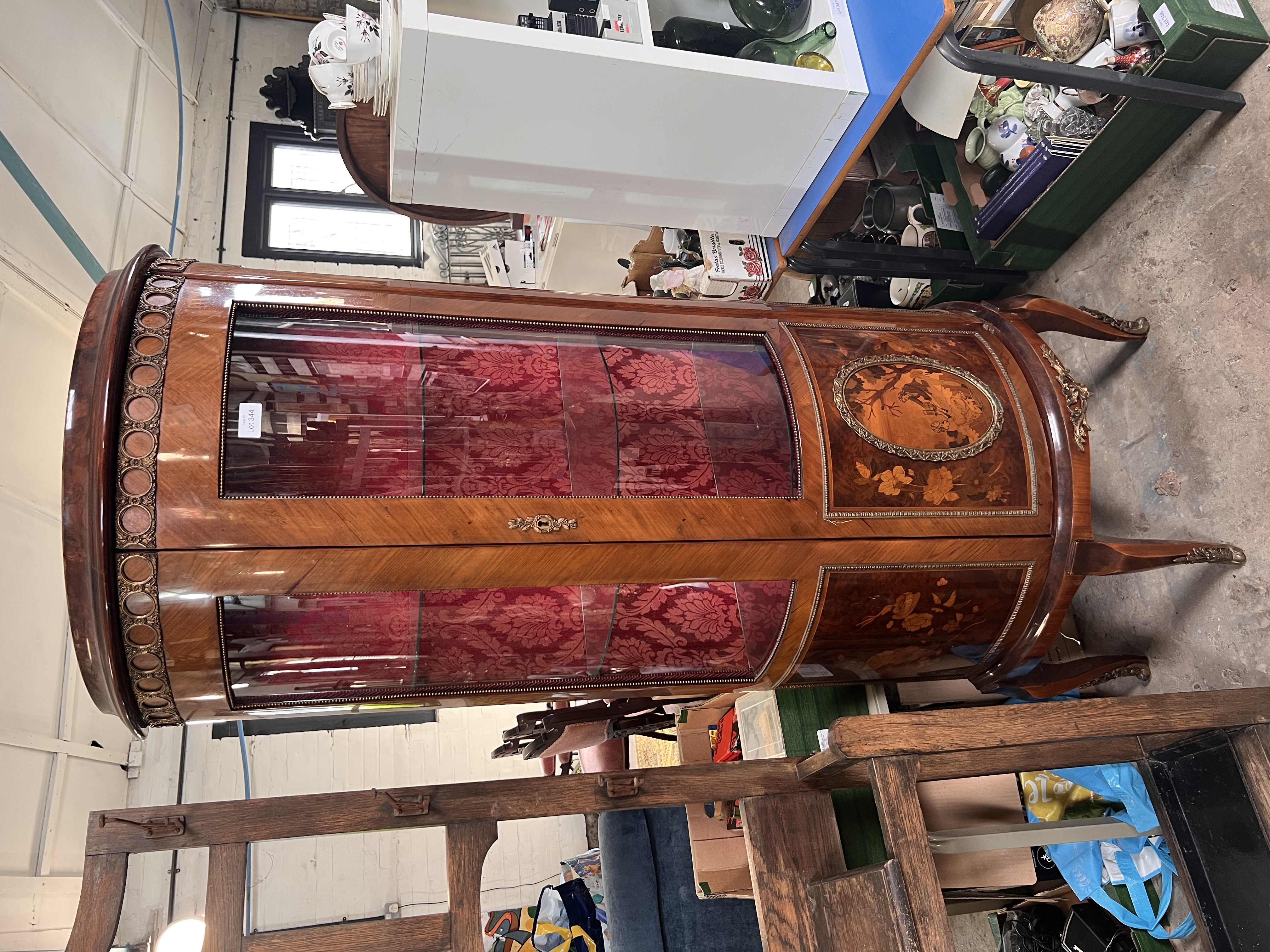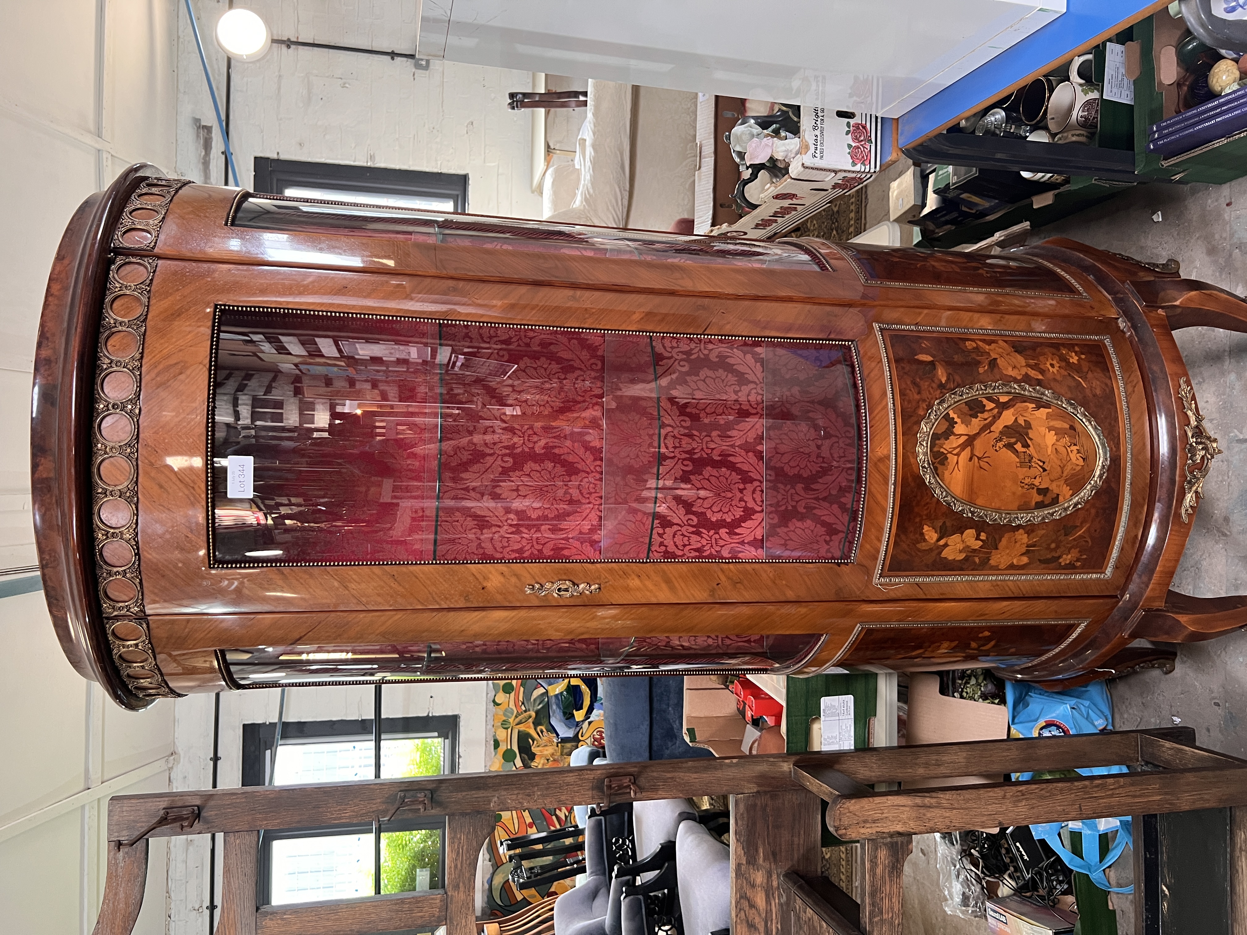 A vintage reproduction demi lune display case with ormolu and marquetry case on cabriole legs. 70cm wide.
