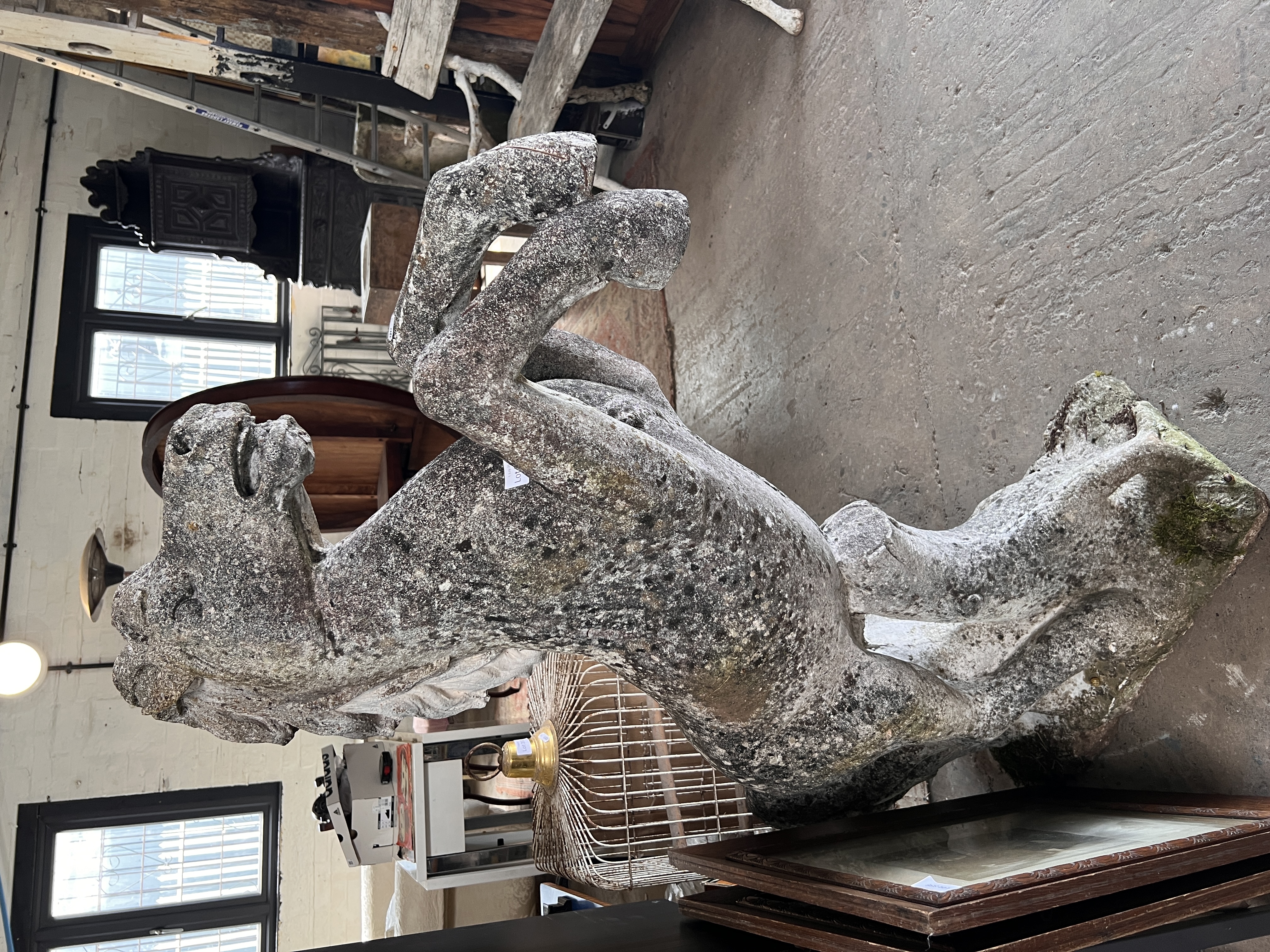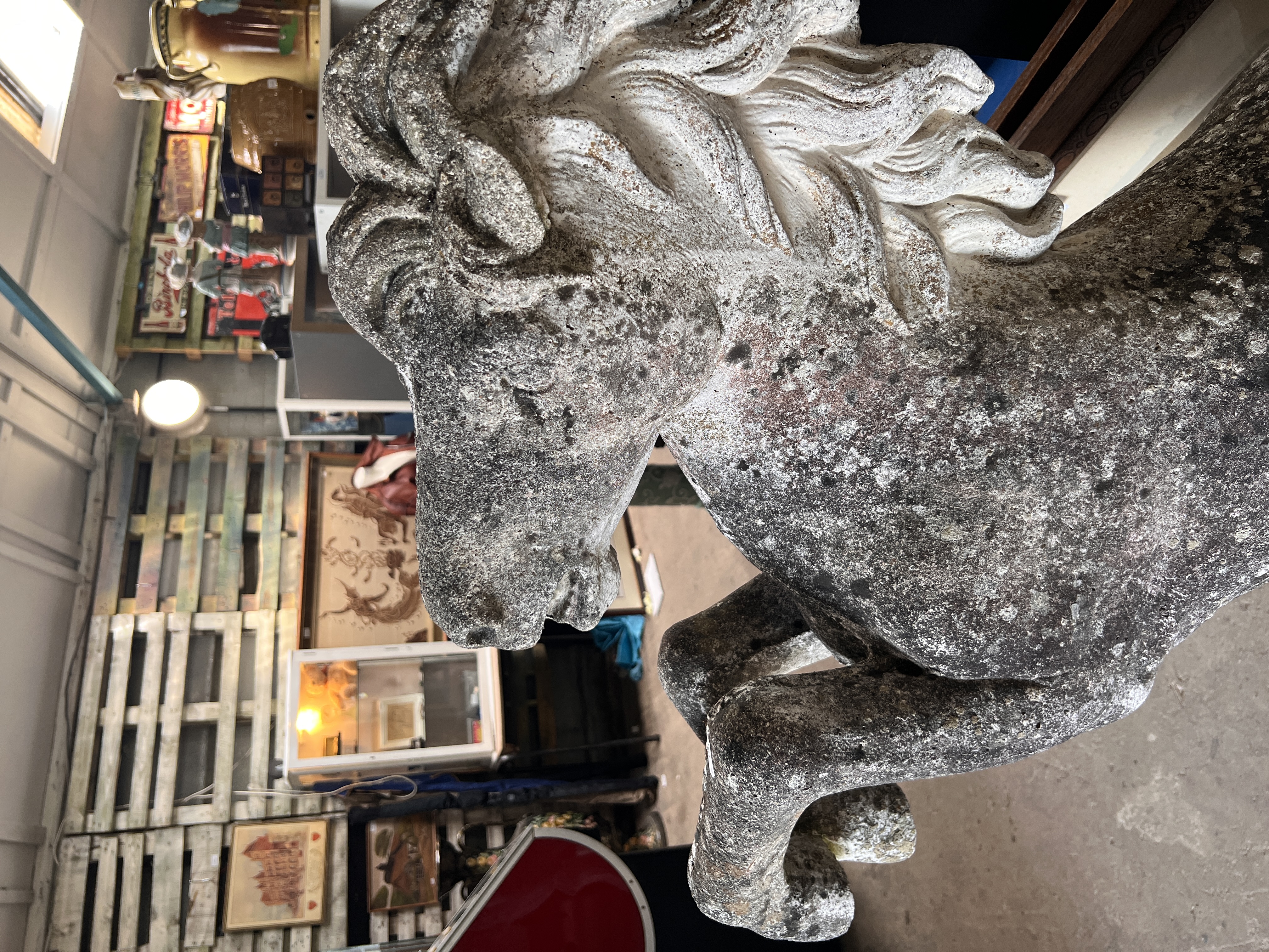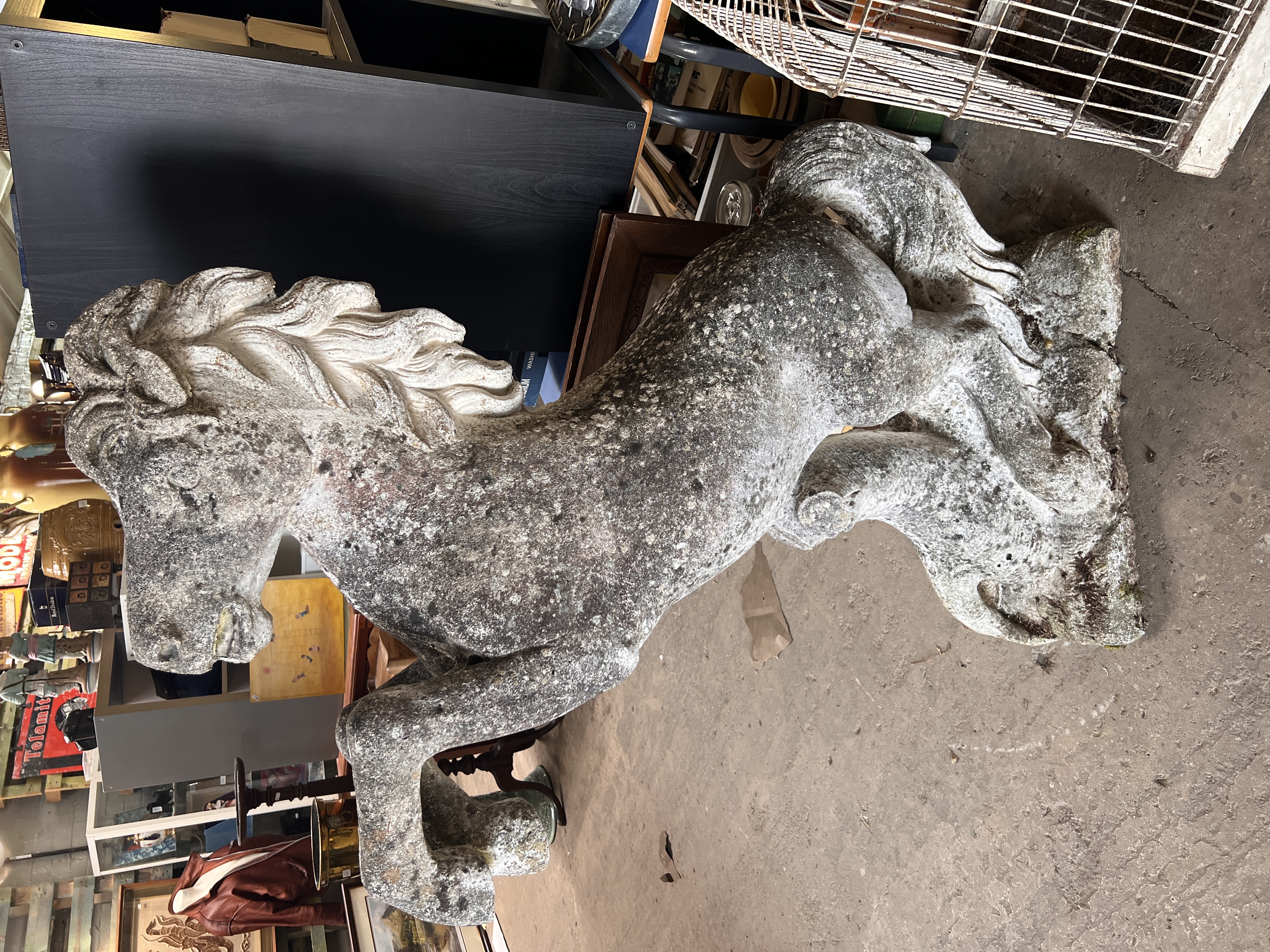 A large composite garden statue of a Marley horse rearing up. 130cm tall.
