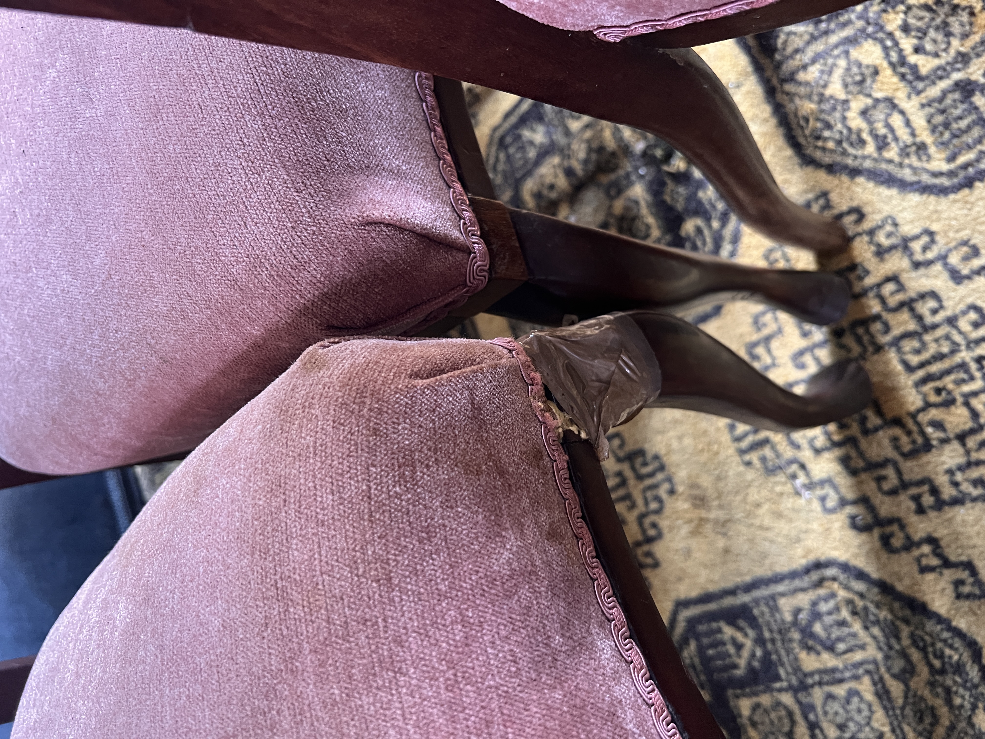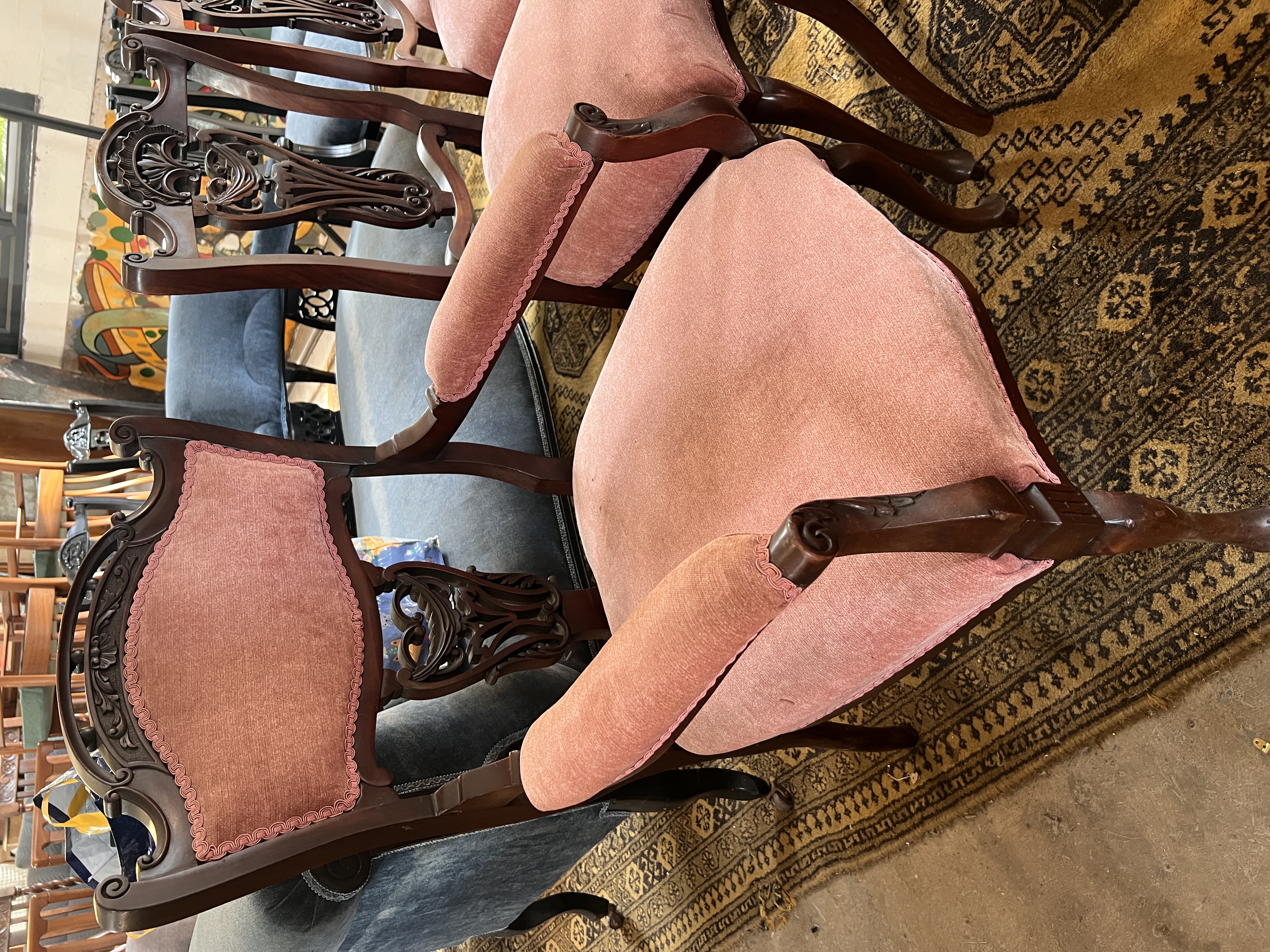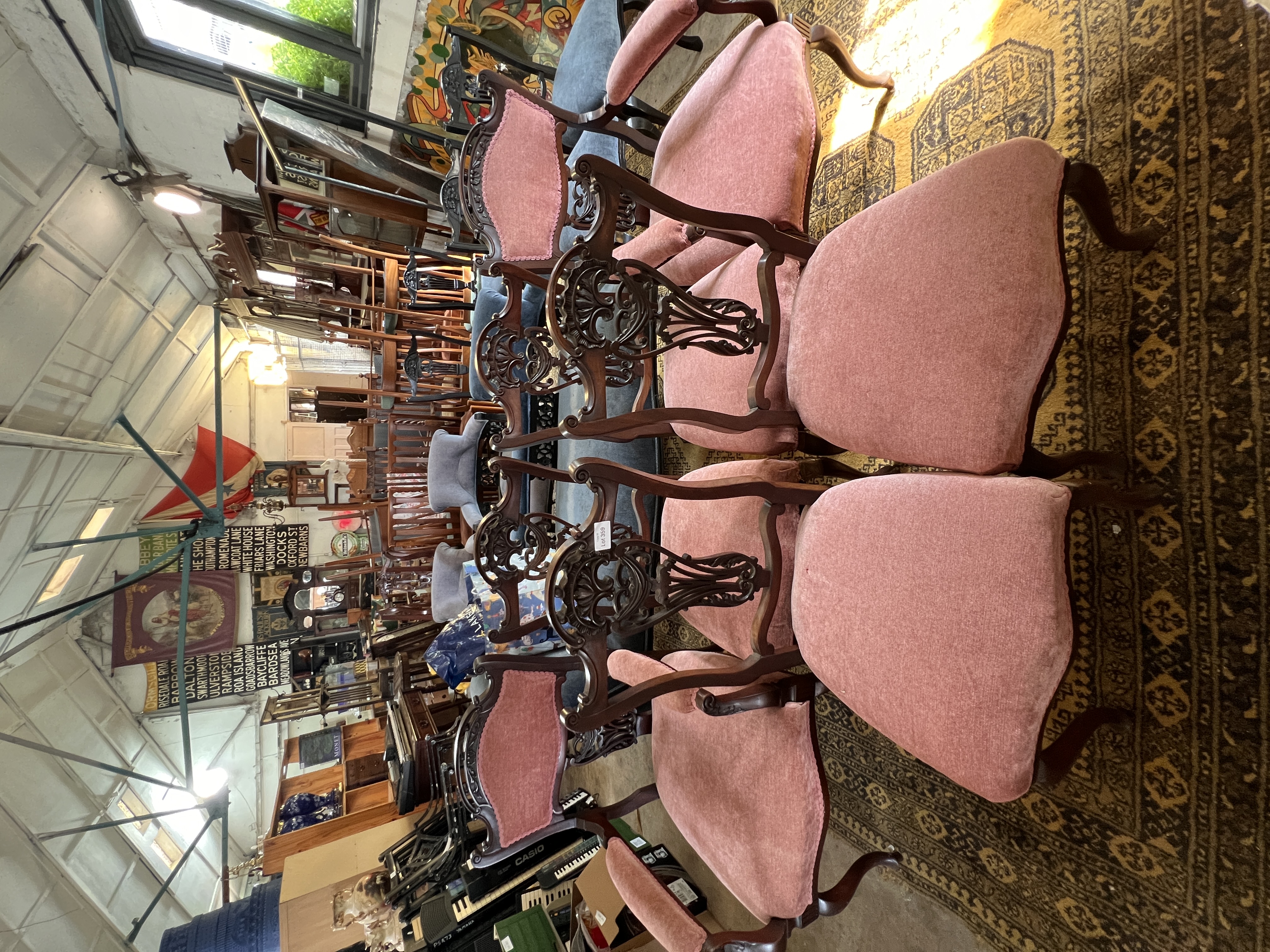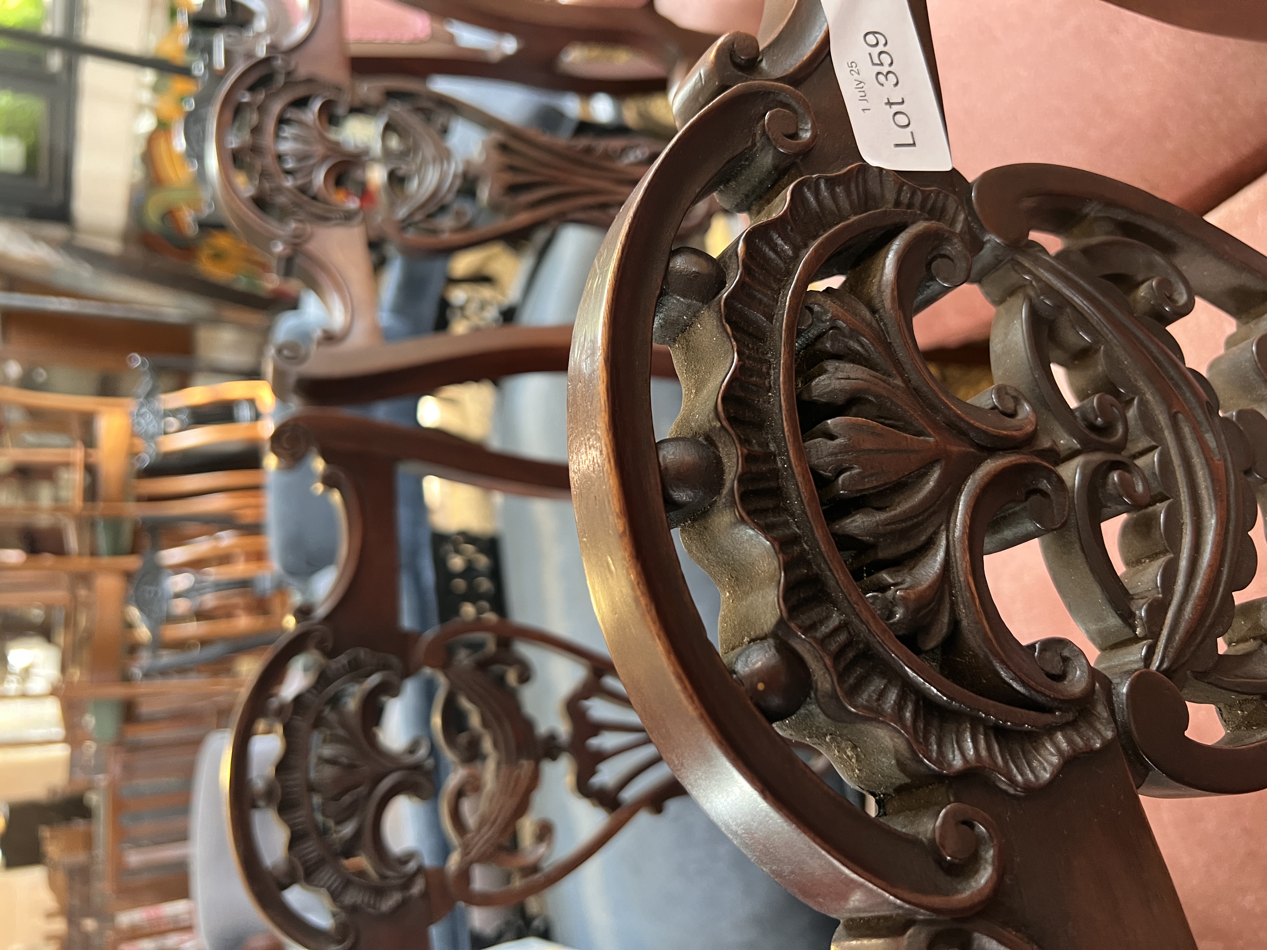 A set of Victorian dining chair having carved vase backs and cabriole legs, four plus two carvers.