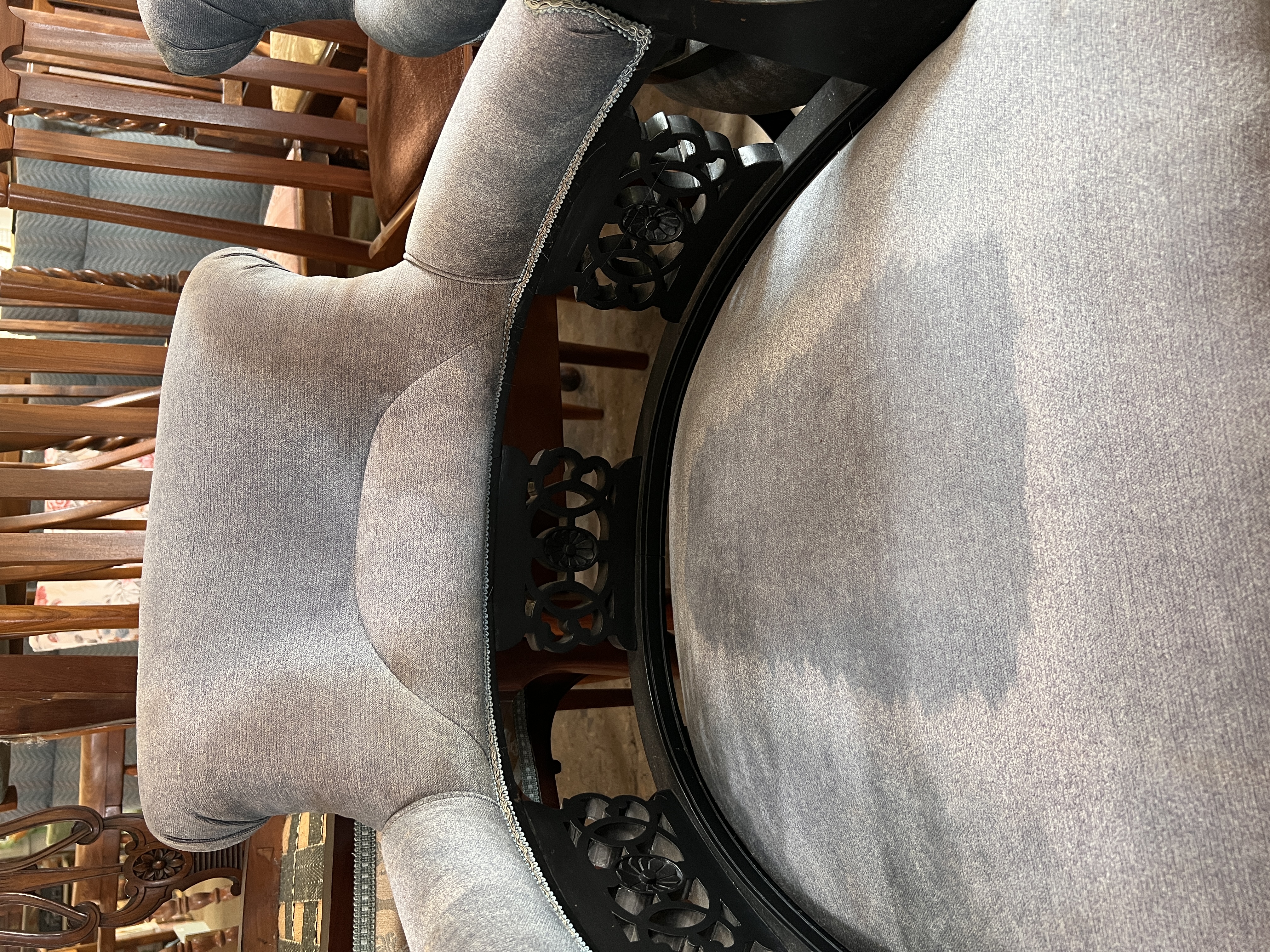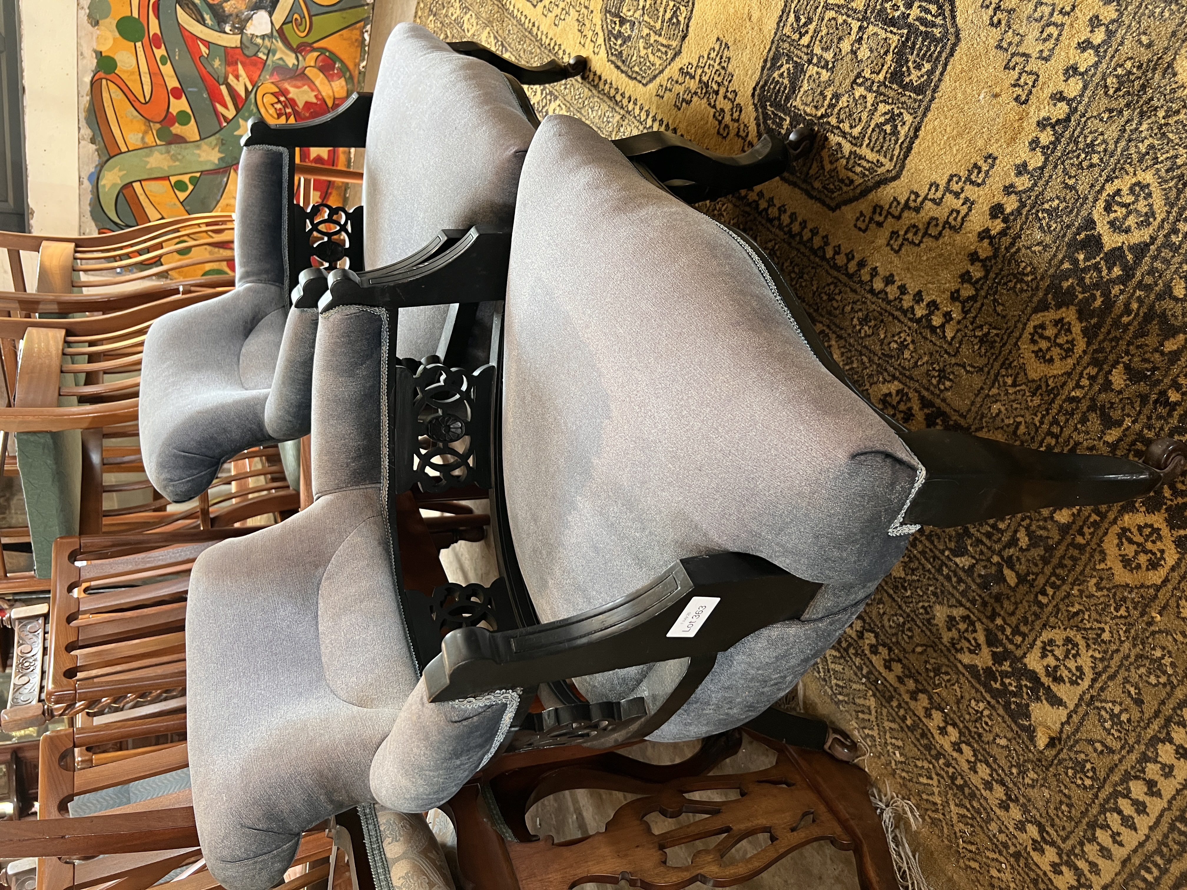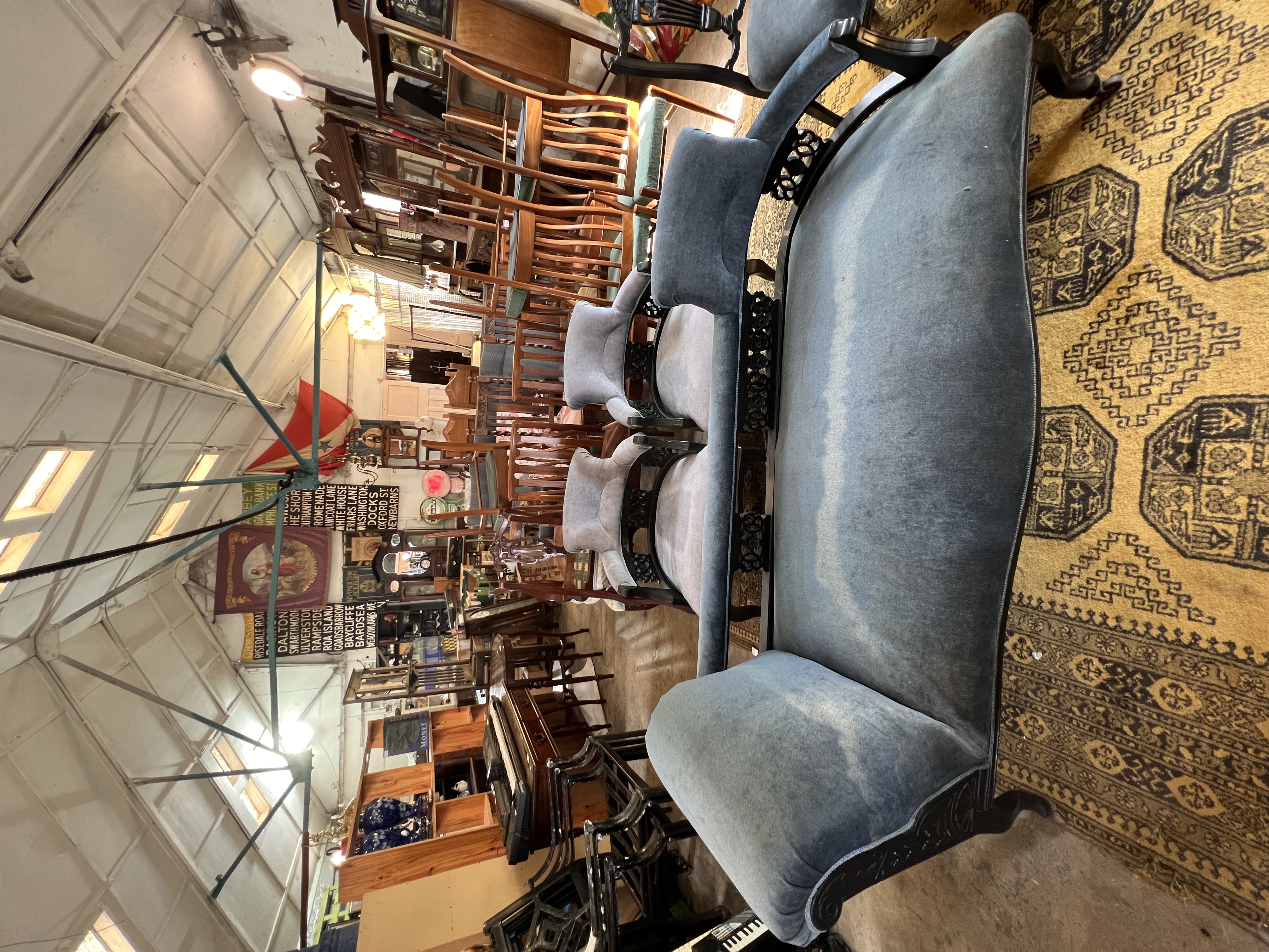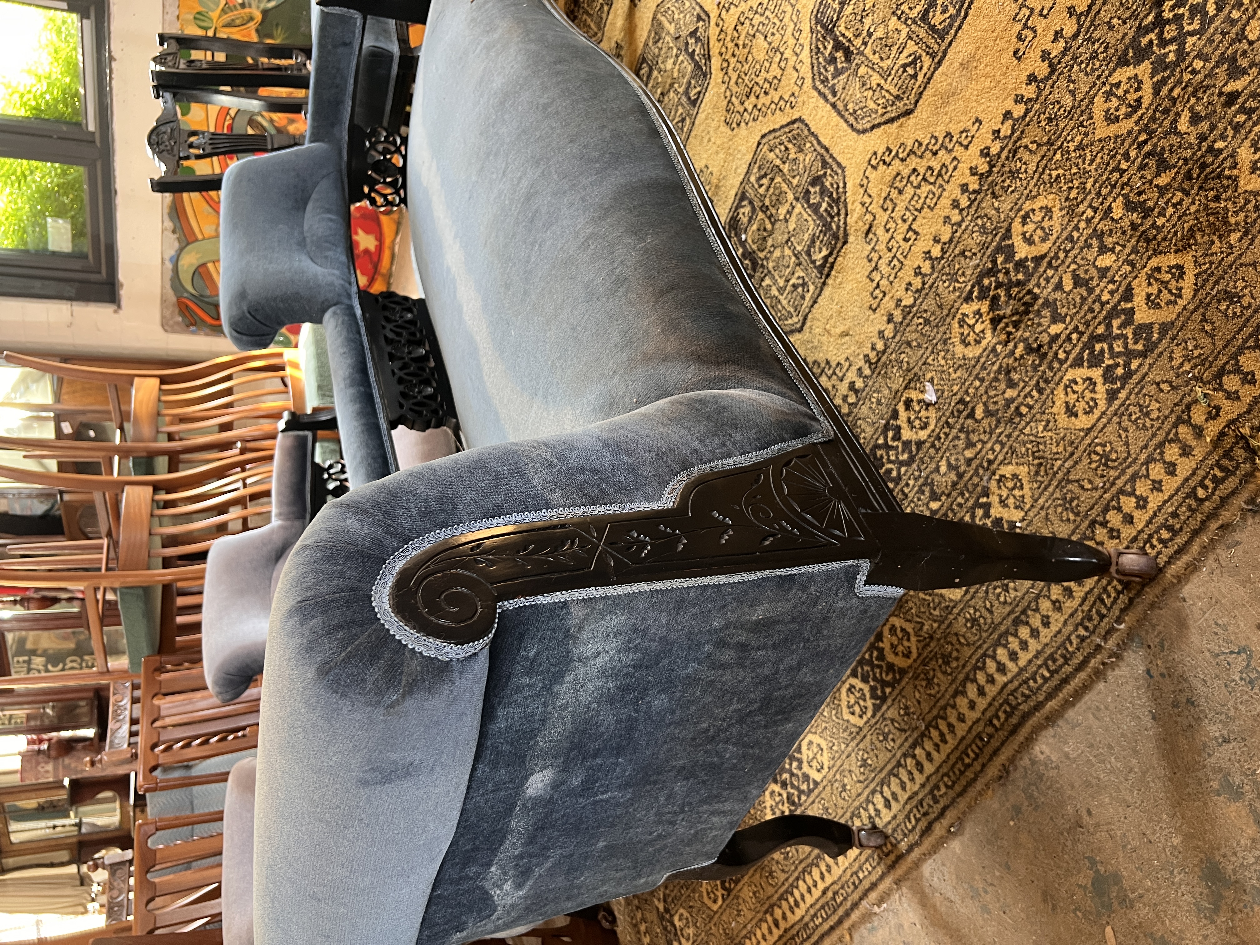 A Victorian aesthetic lounge suite, day bed and two chairs having carved and ebonised frames.