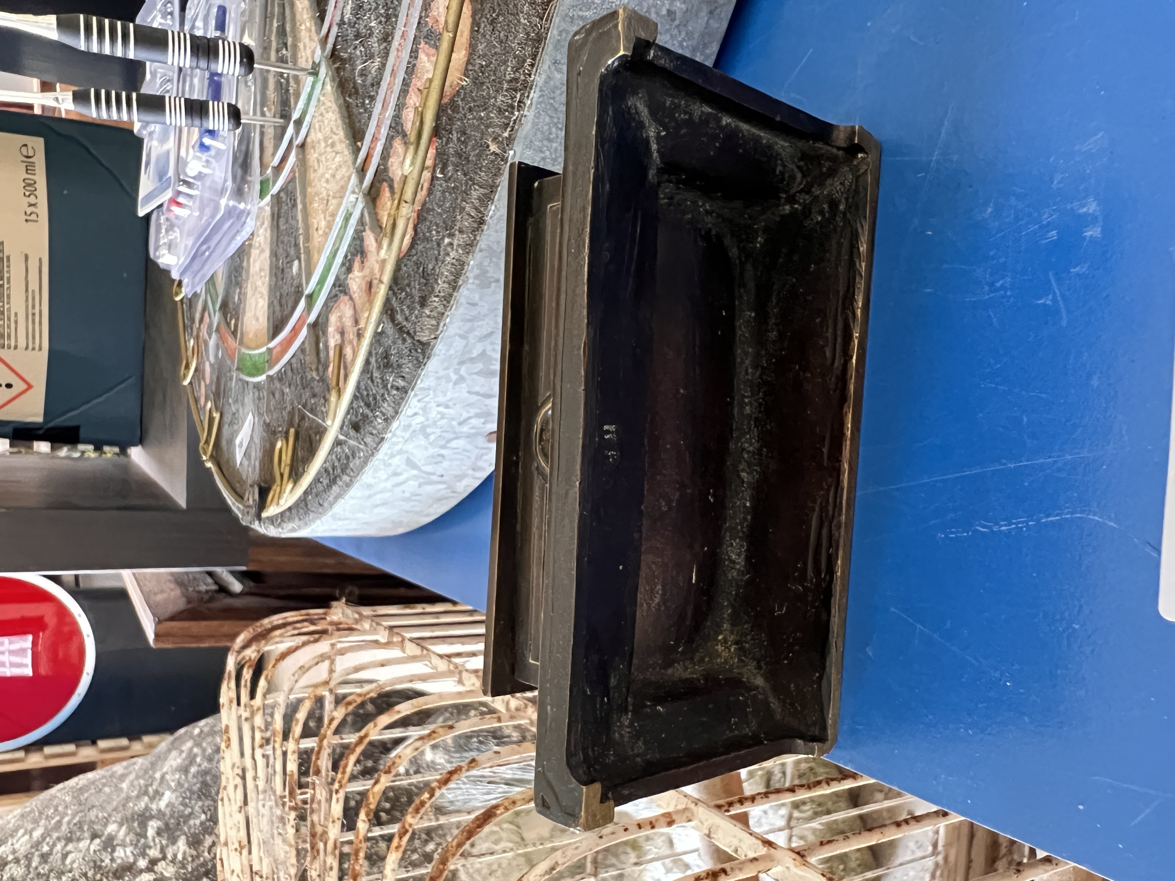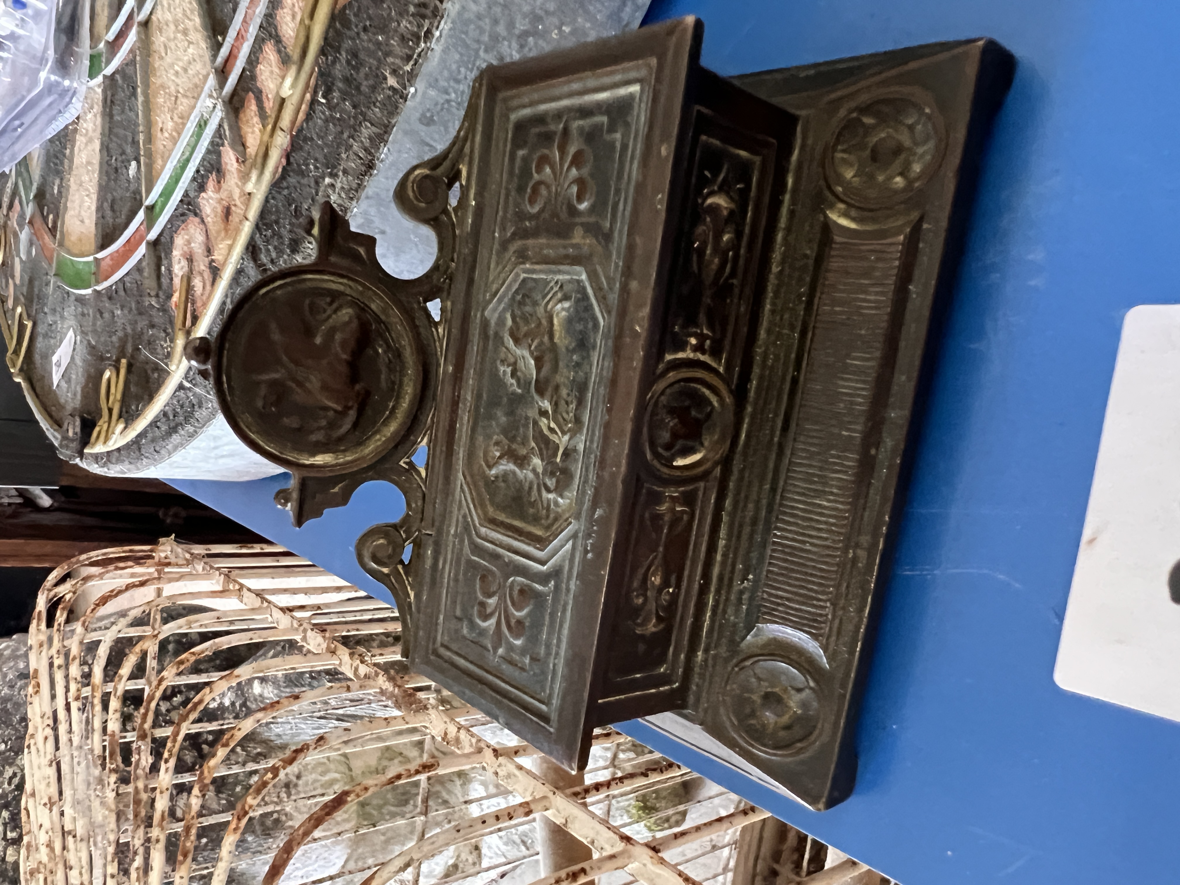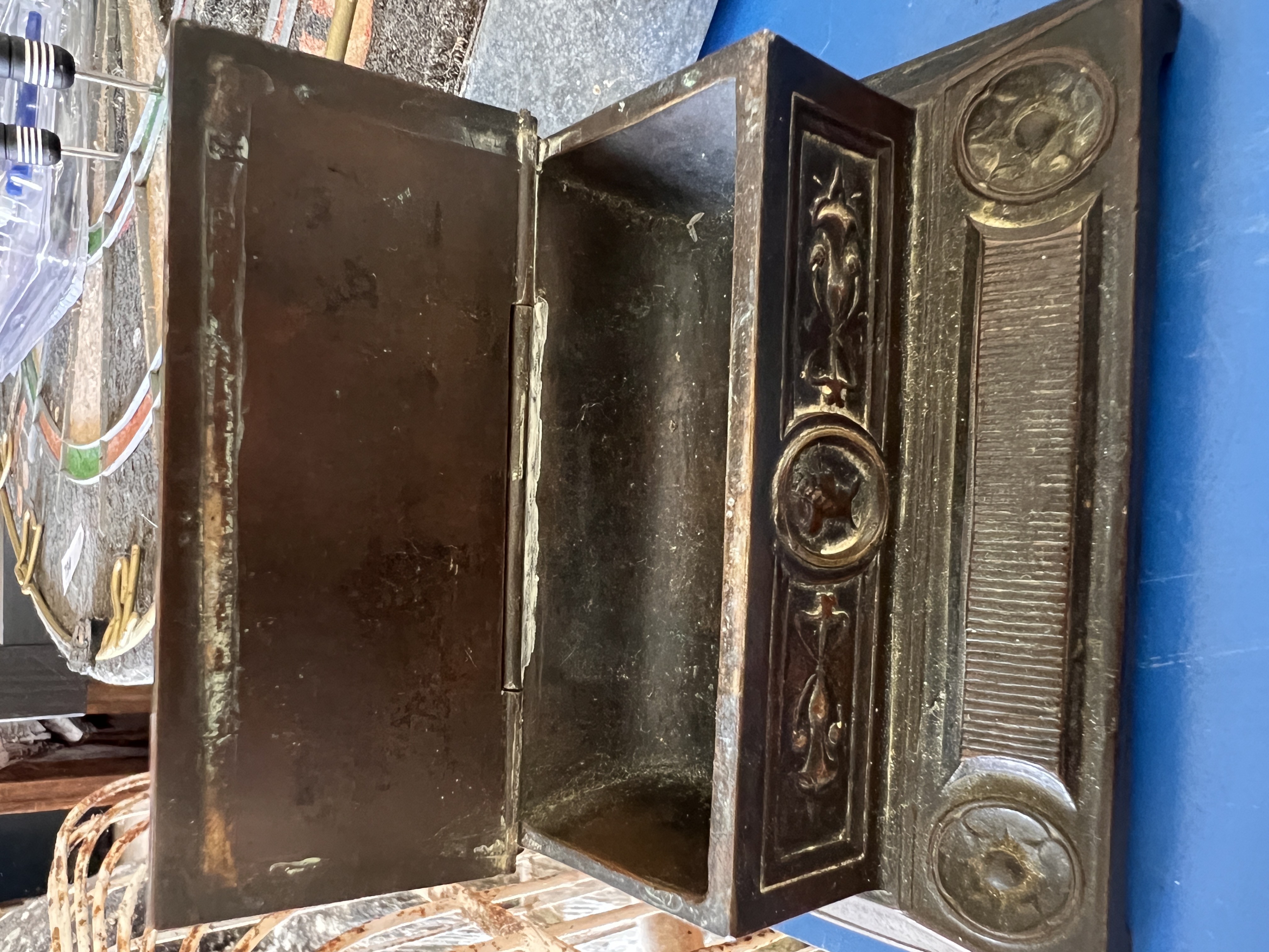 A Victorian bronze desk top stamp box having Roman crest and chariot decoration.