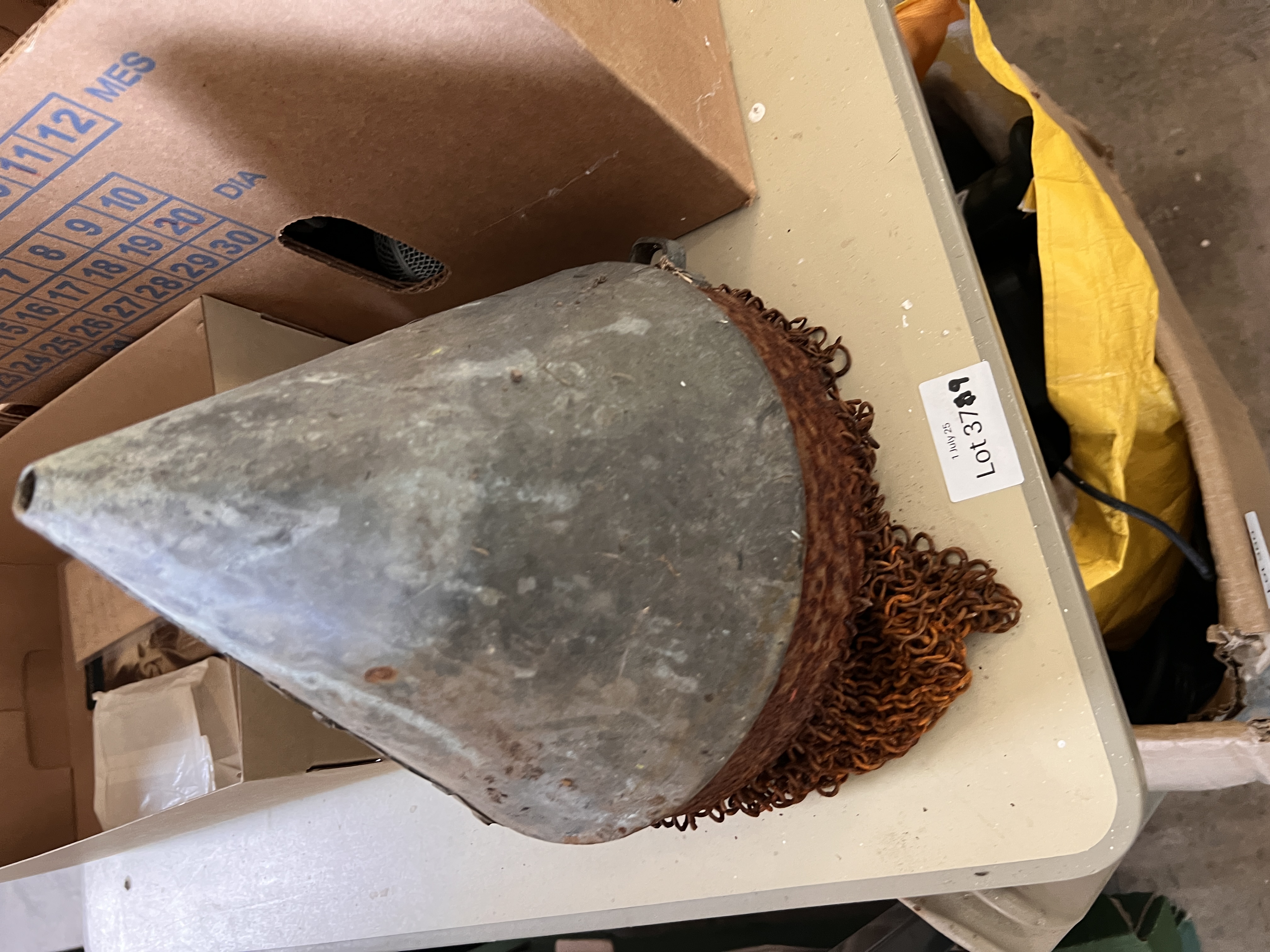 A vintage hand made chainmail helmet.