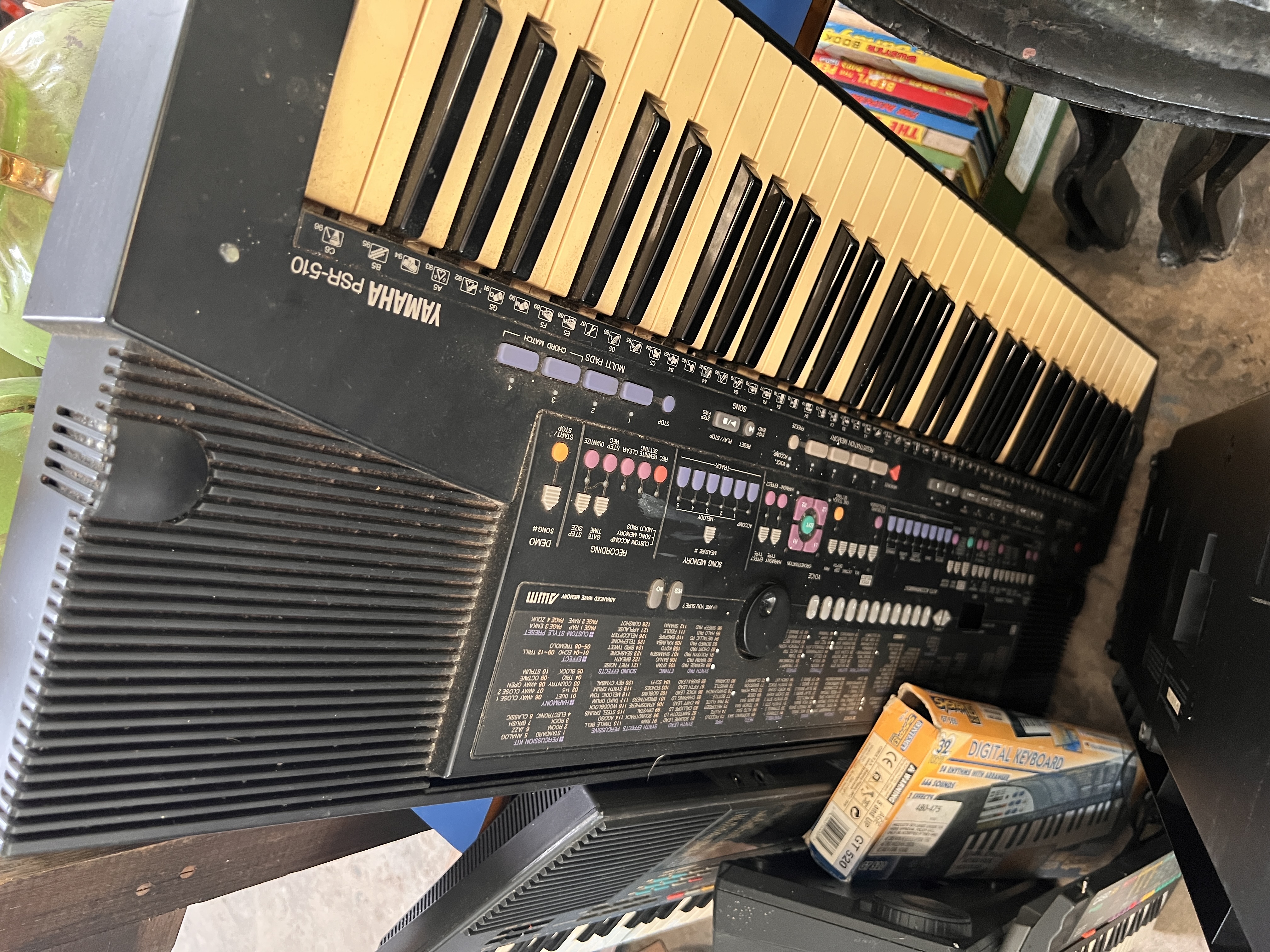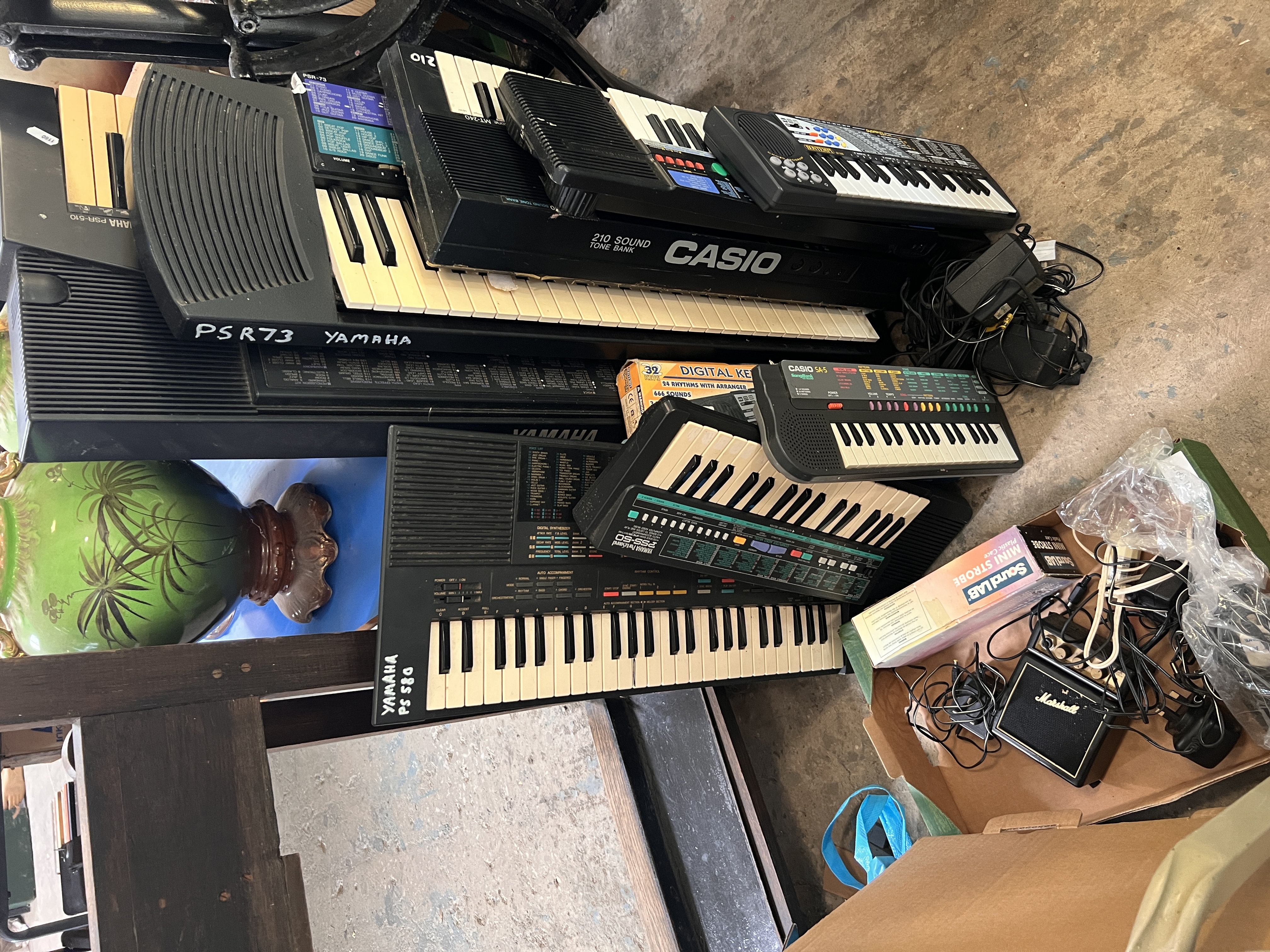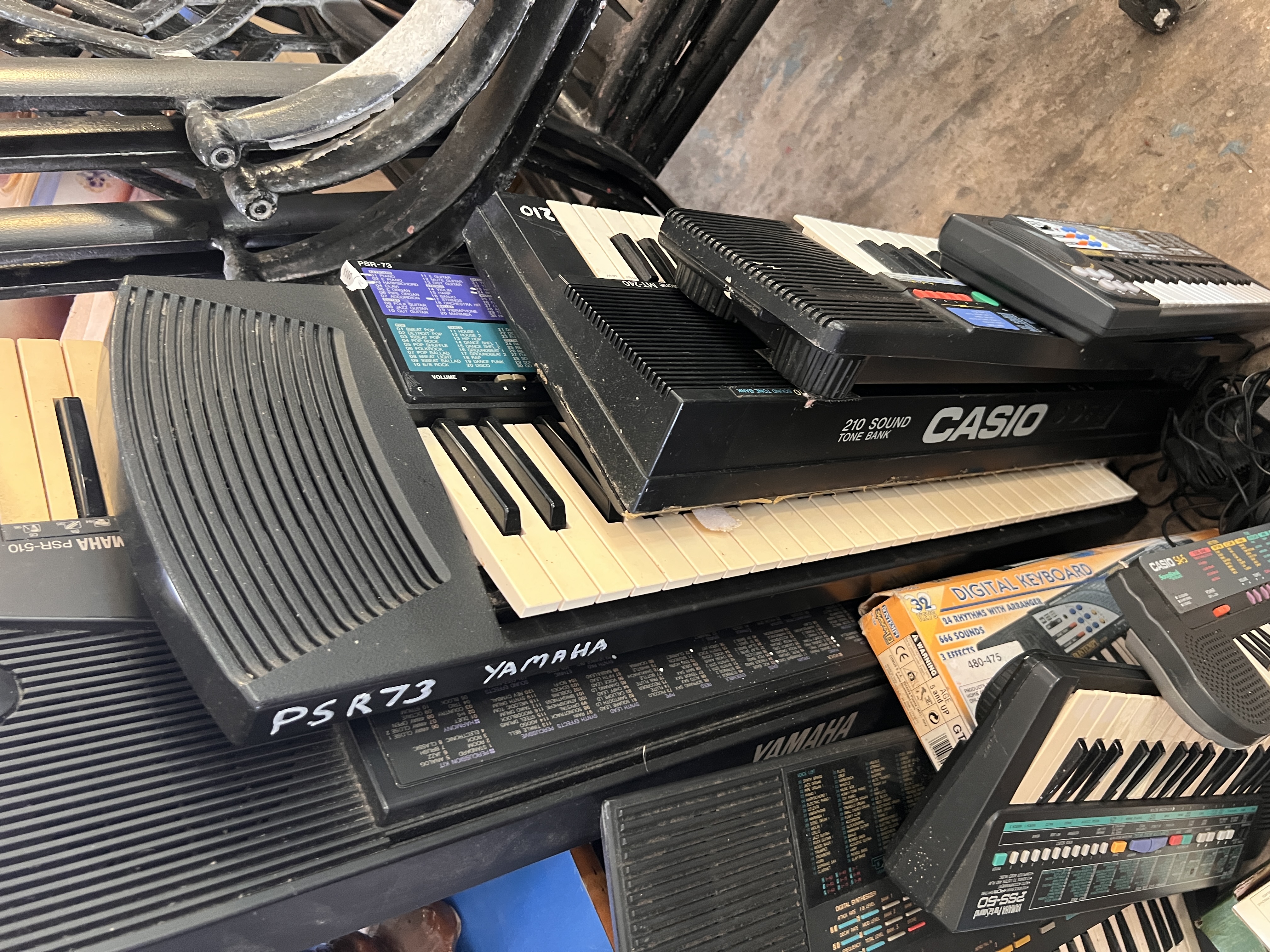 A selection of Casio and Yamaha keyboards. Pss-50, PS-580, PSR-510.