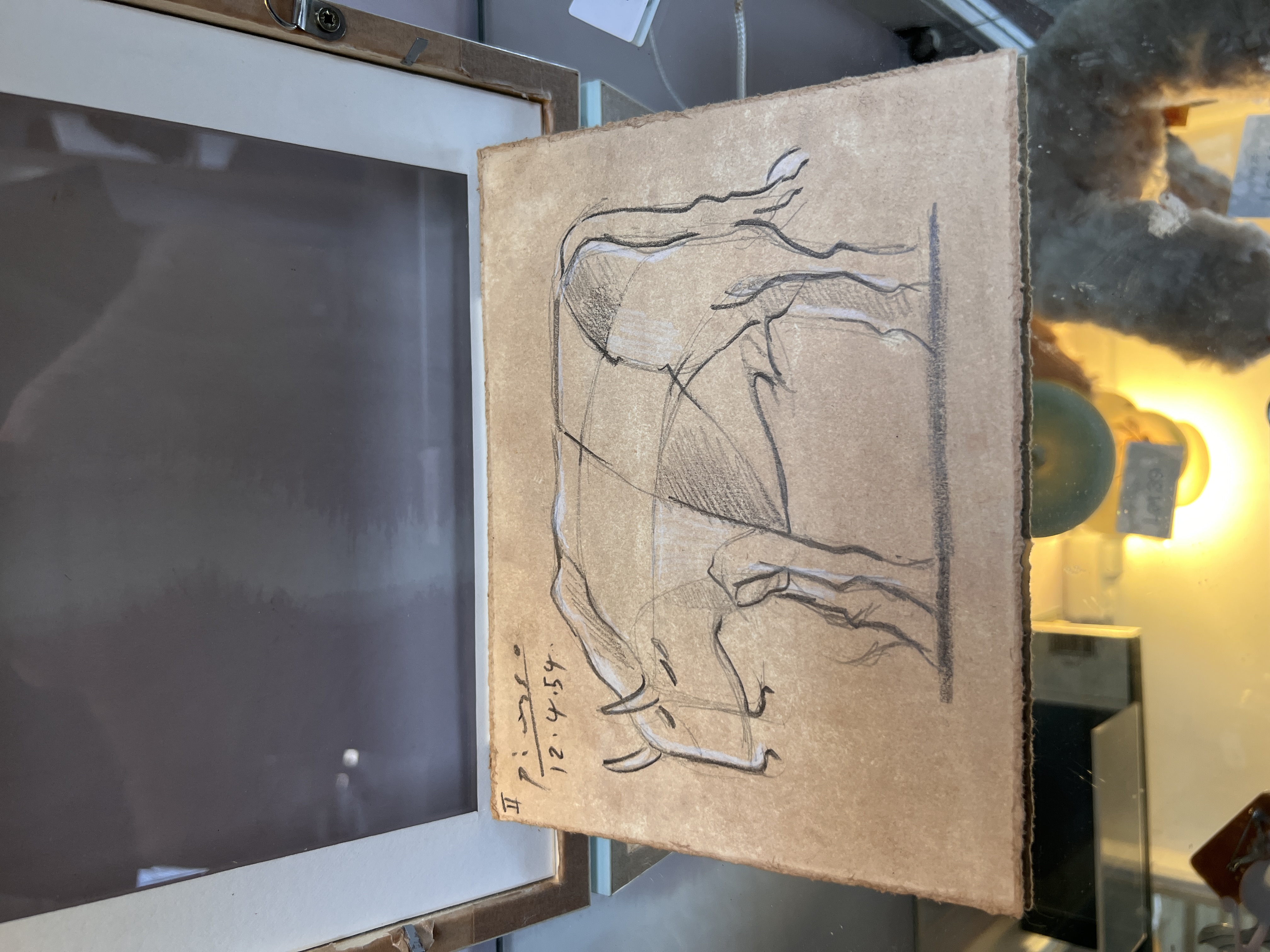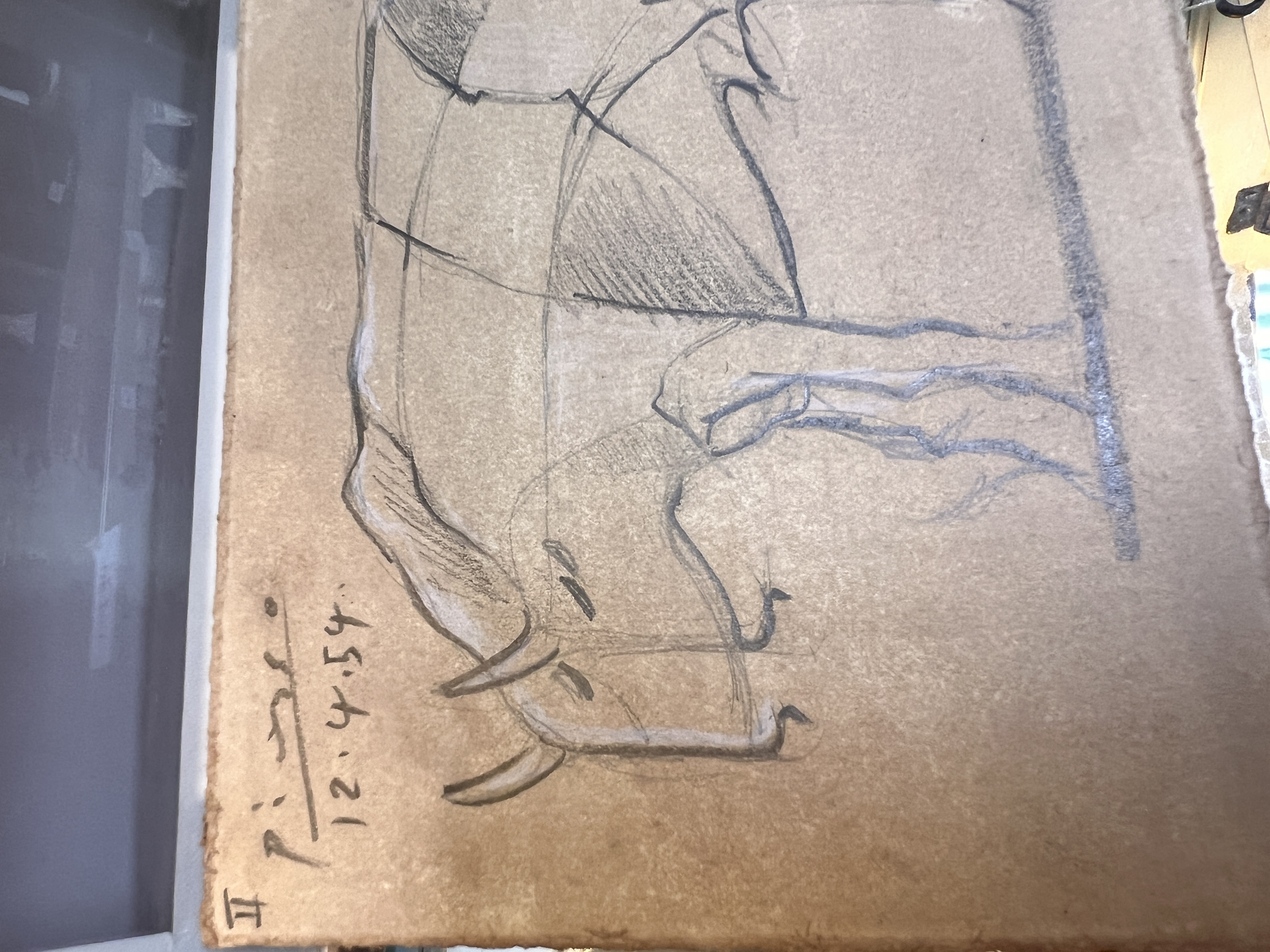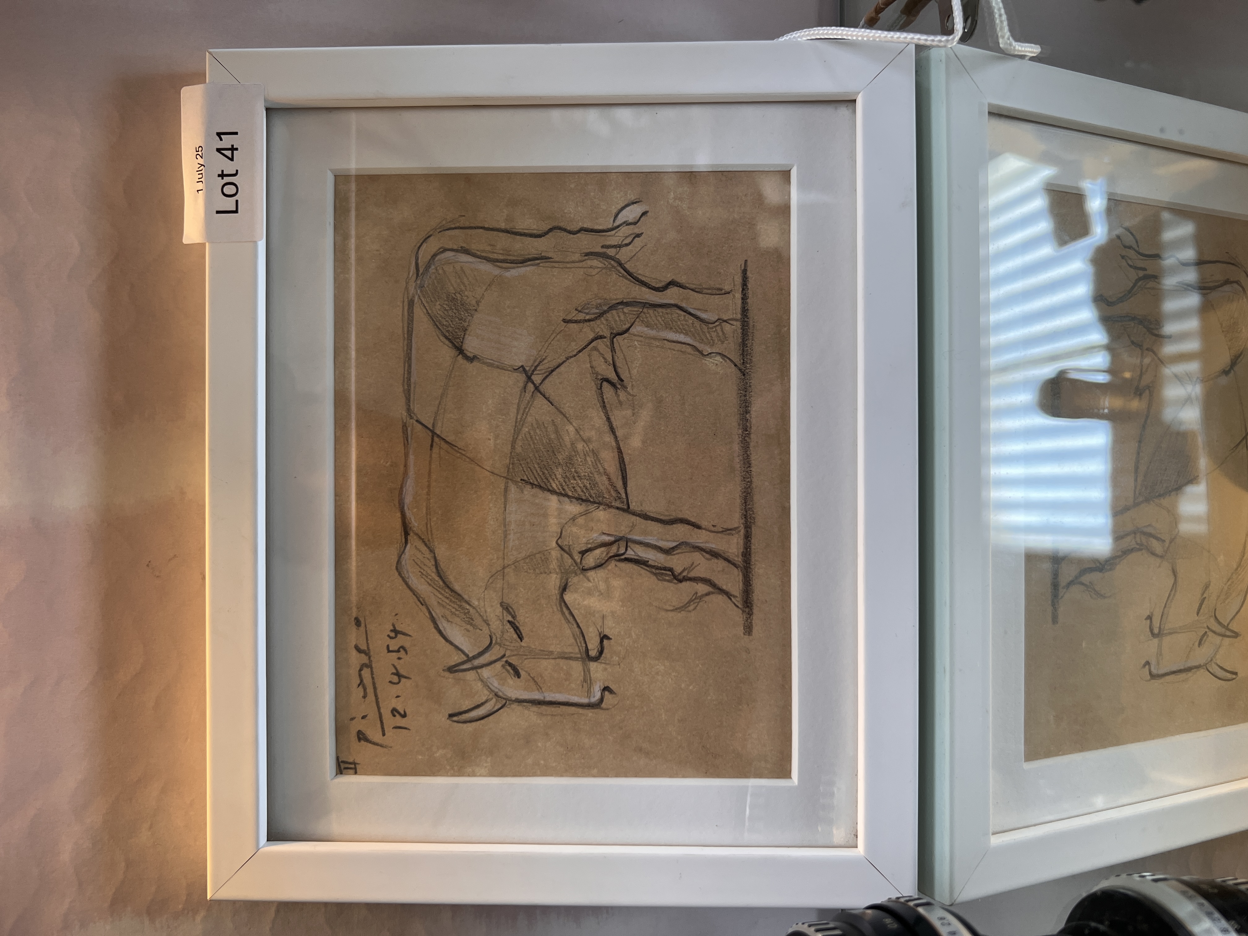 An unverified Pablo Picasso mixed media of a bull on heavy set paper. Dated 12.4.54 signed Picasso. 18.5cm x 14cm. Bearing watermark on verso Estudio Pablo Picasso coll. Marina Picasso.