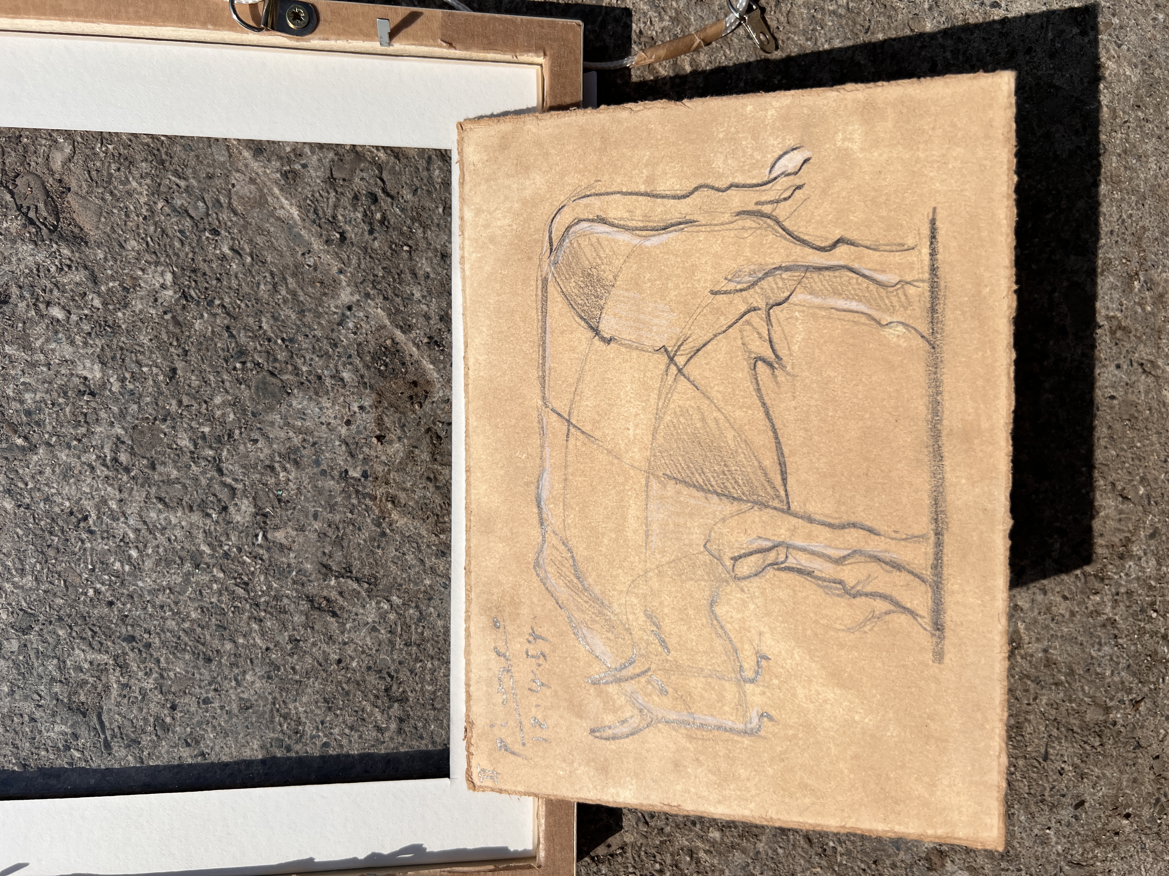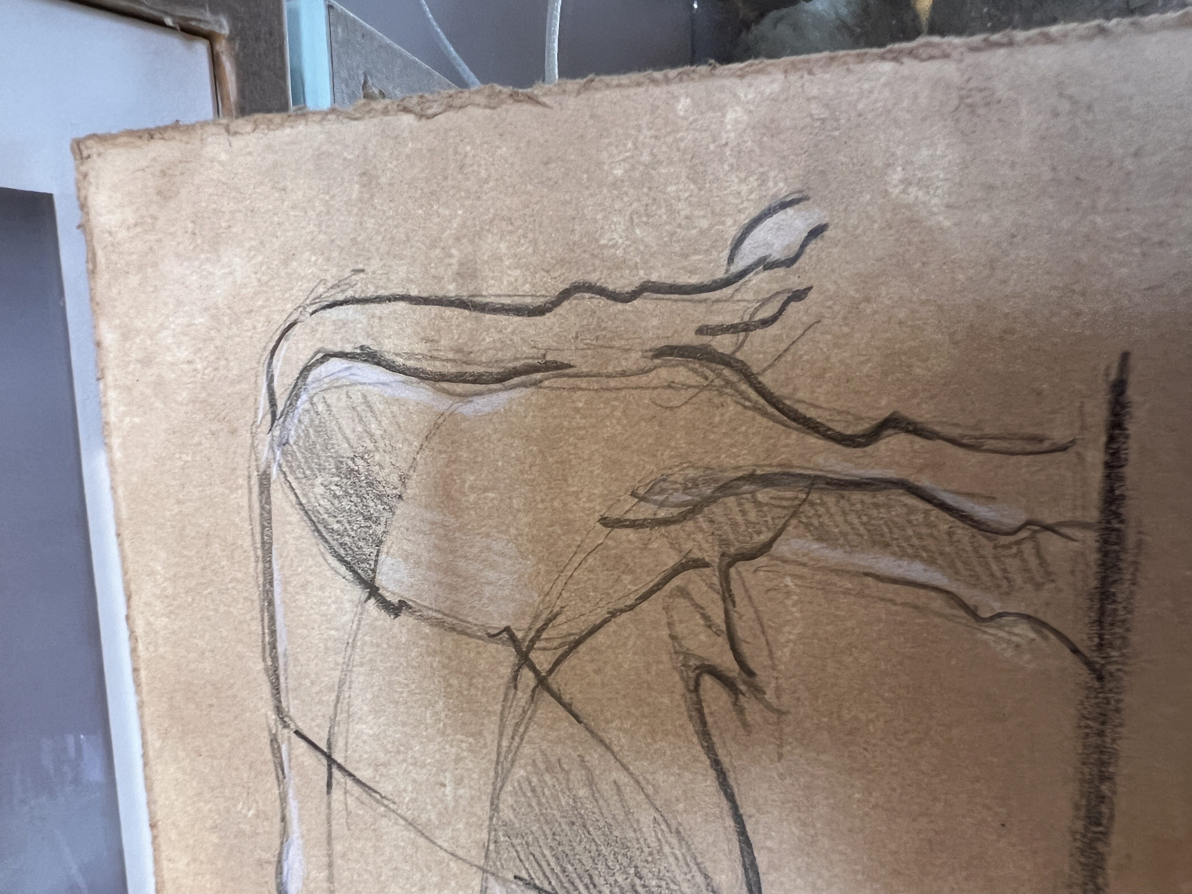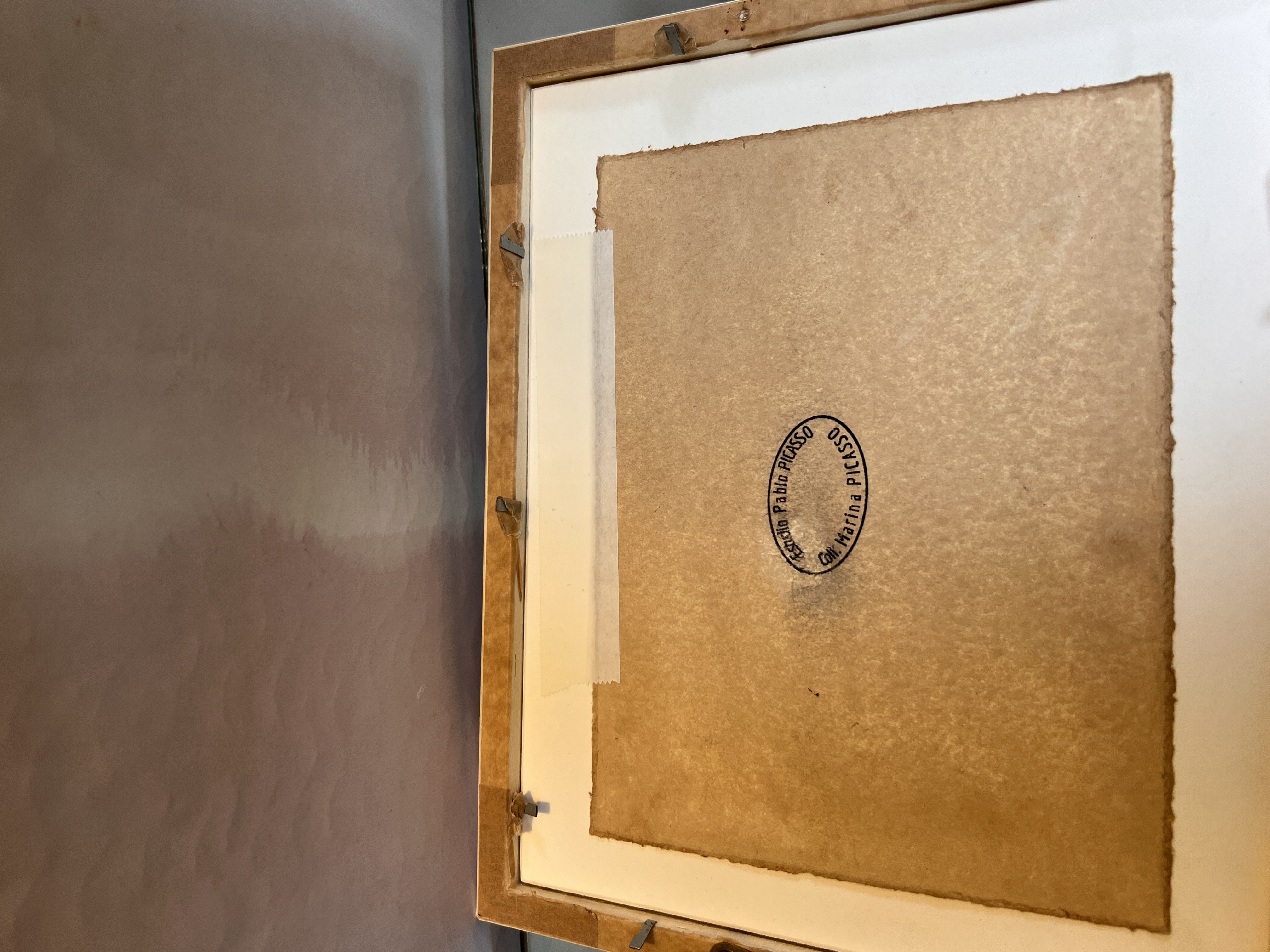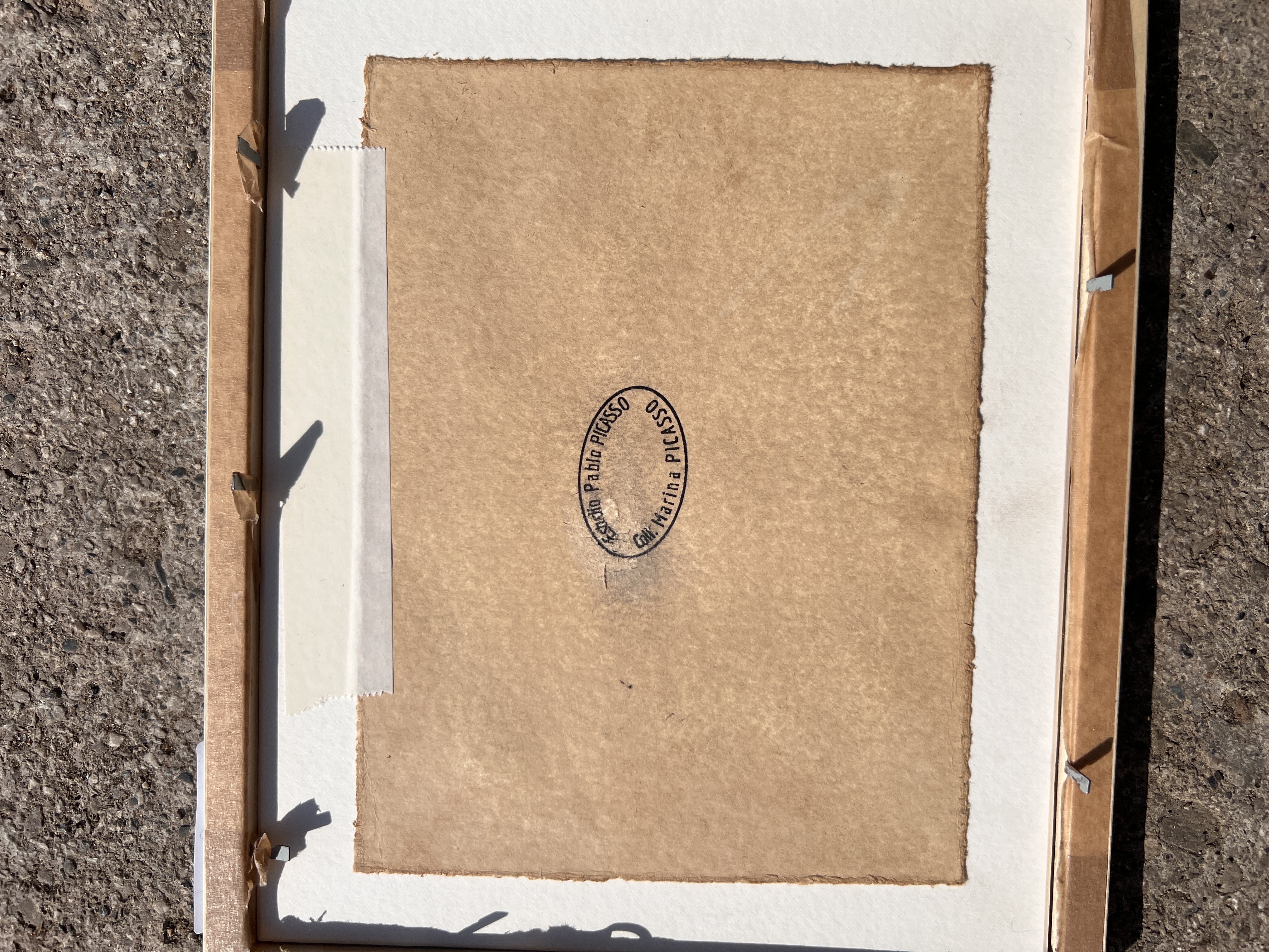 An unverified Pablo Picasso mixed media of a bull on heavy set paper. Dated 12.4.54 signed Picasso. 18.5cm x 14cm. Bearing watermark on verso Estudio Pablo Picasso coll. Marina Picasso.
