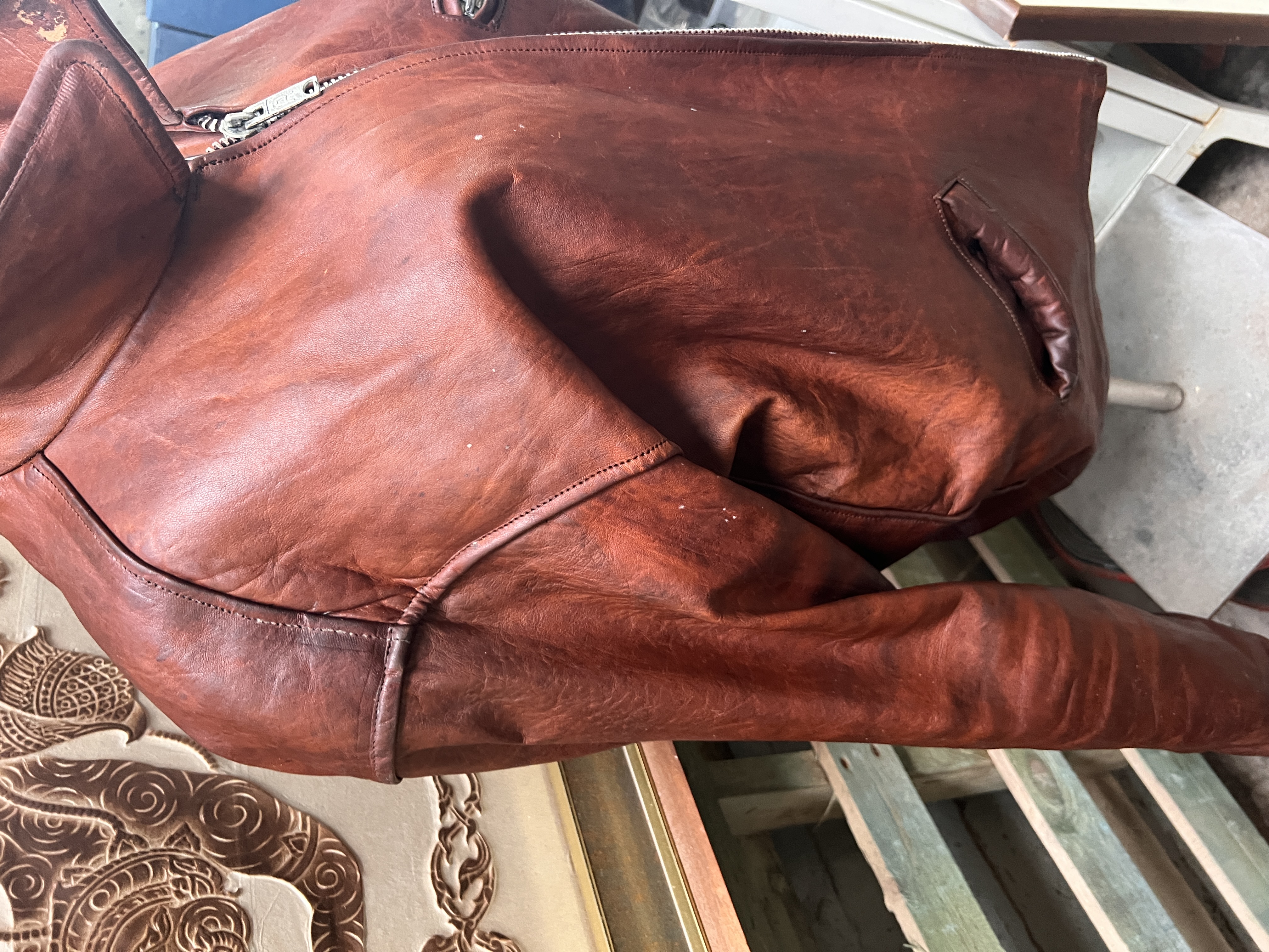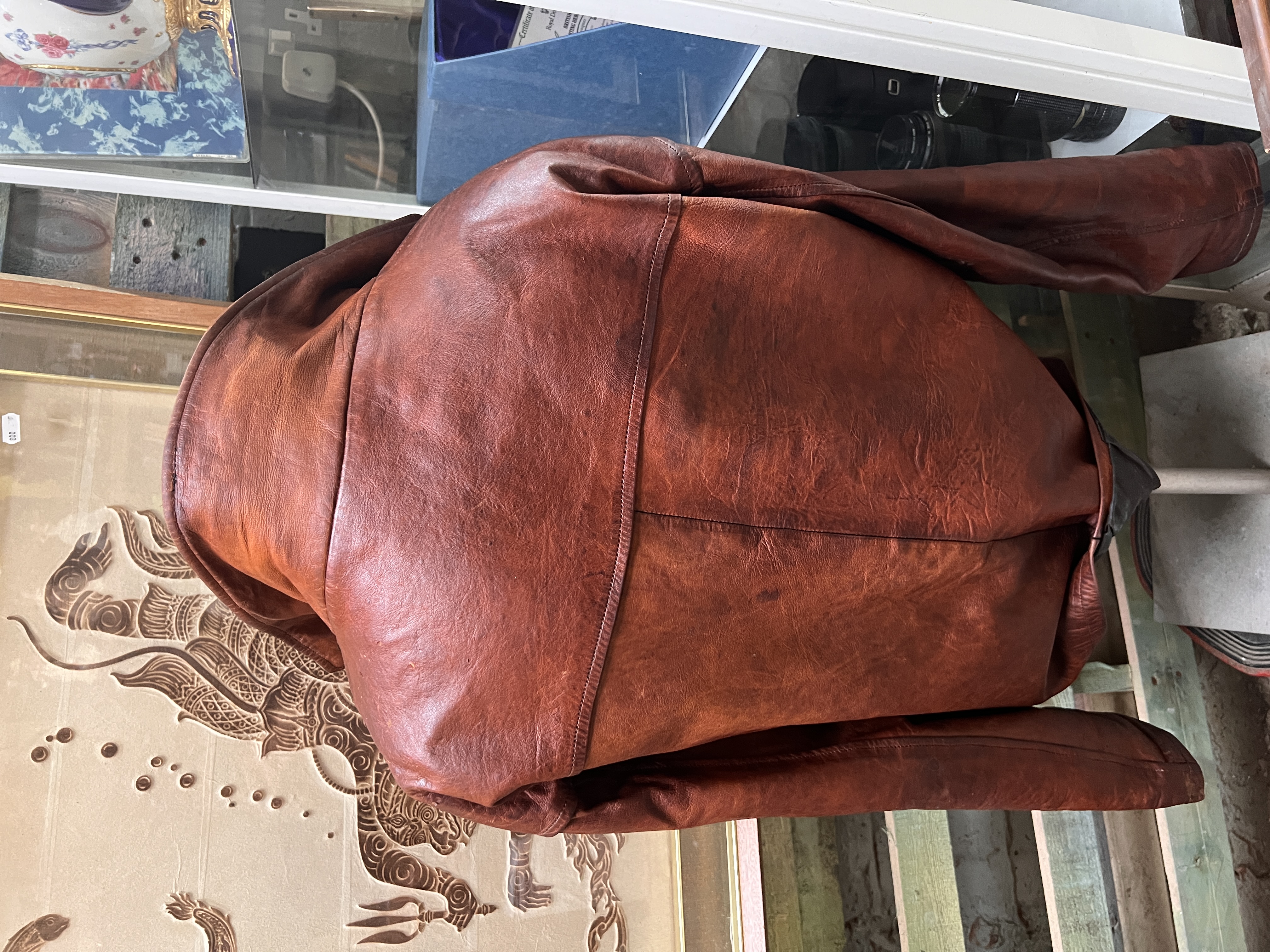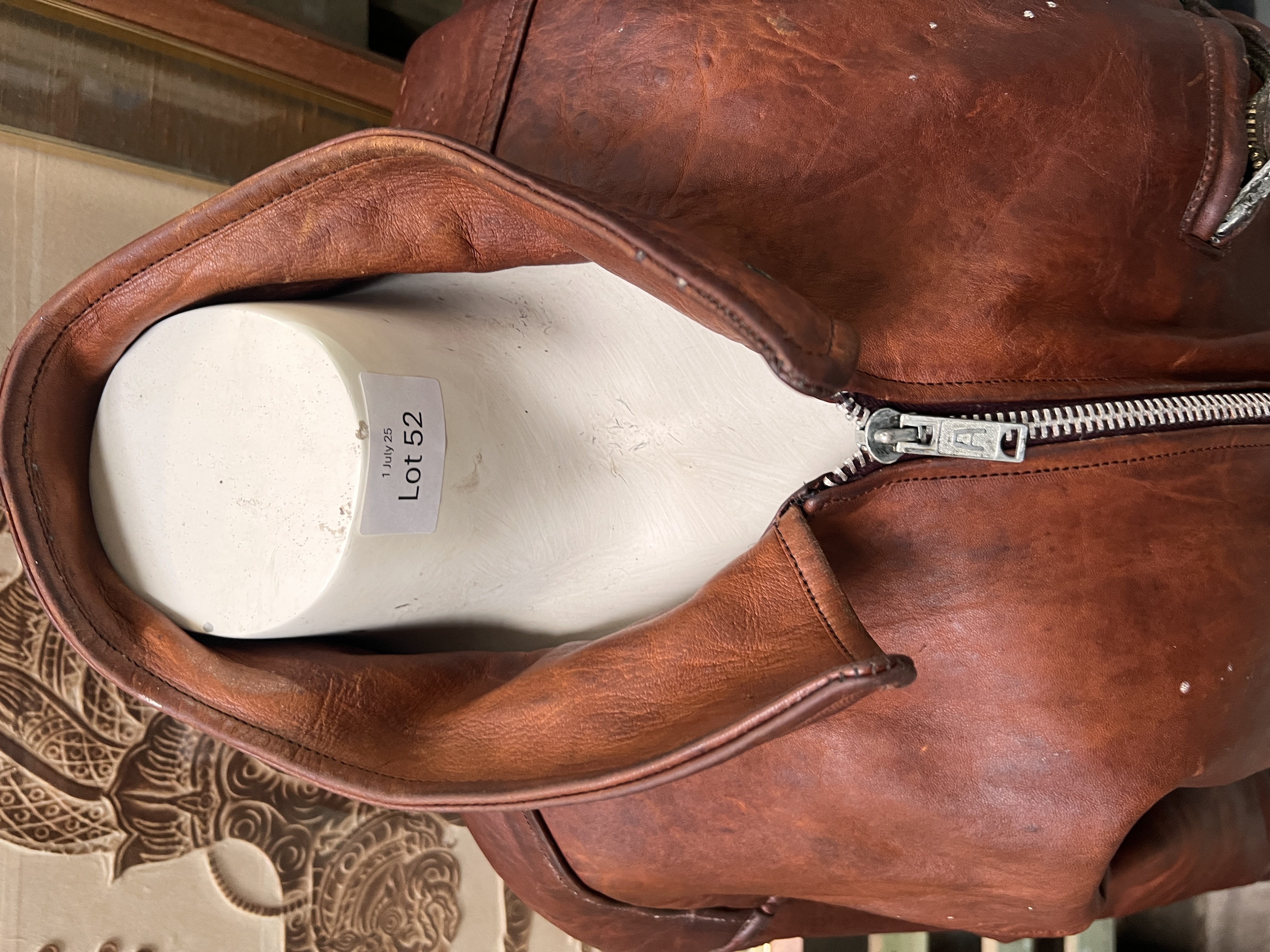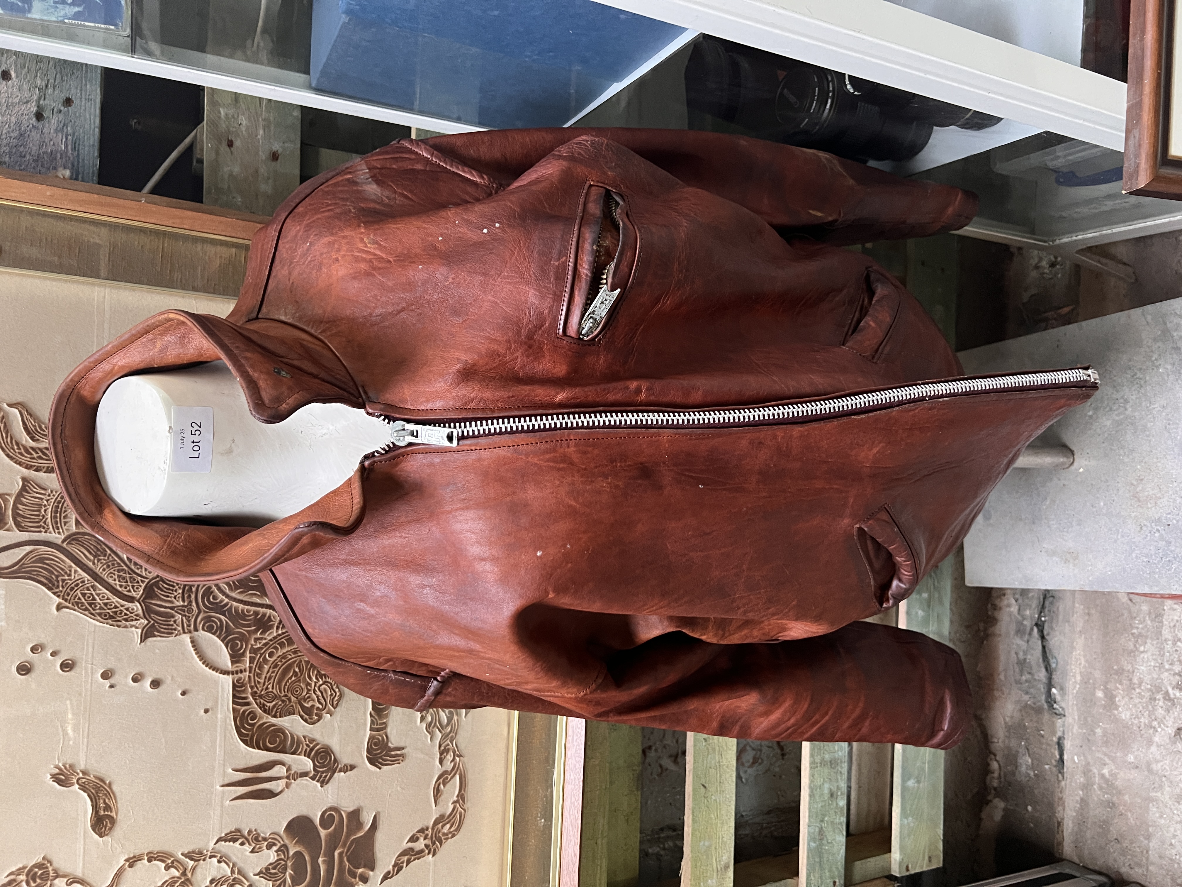 A mid century tan leather aviation style jacket, size large.