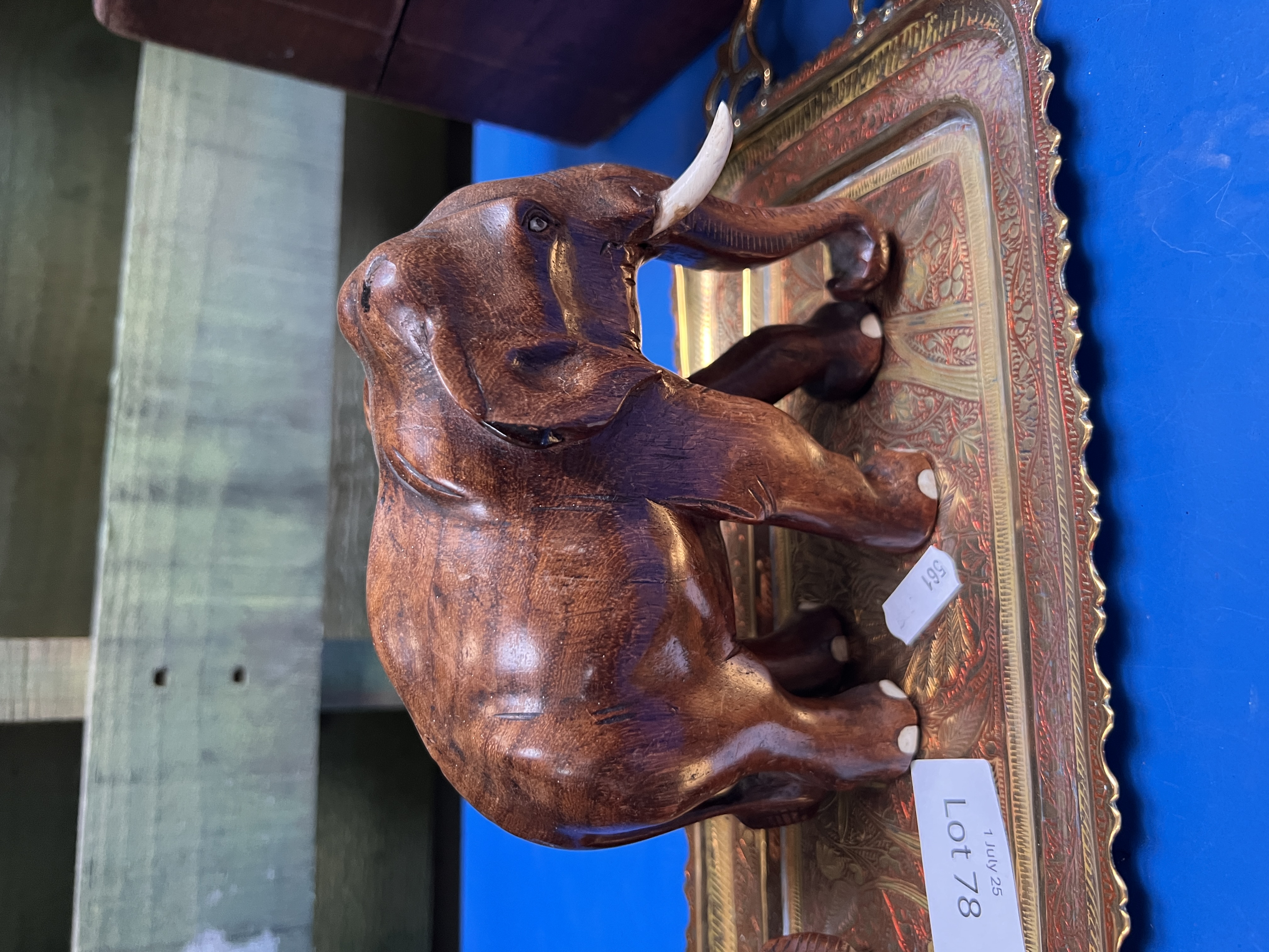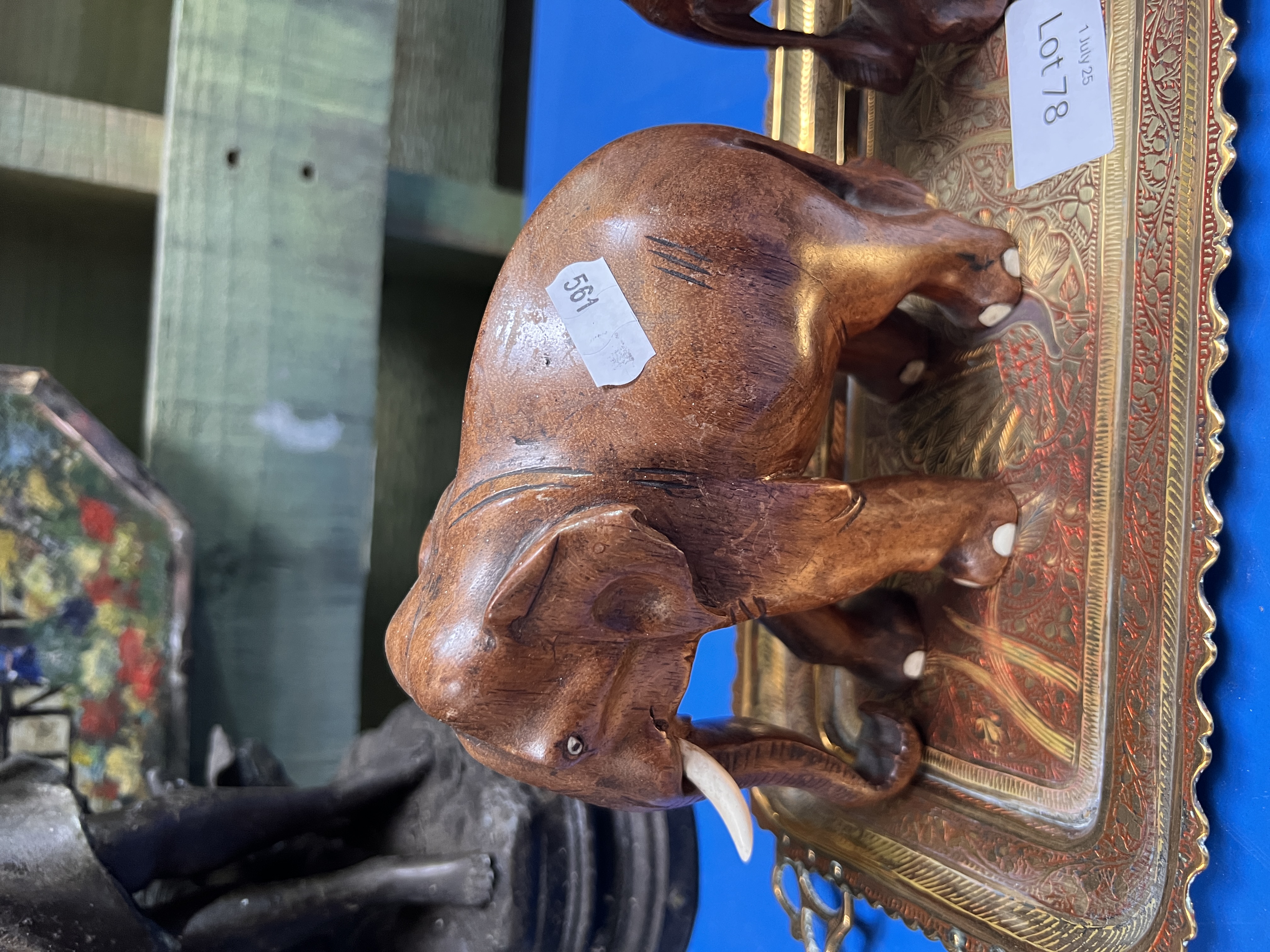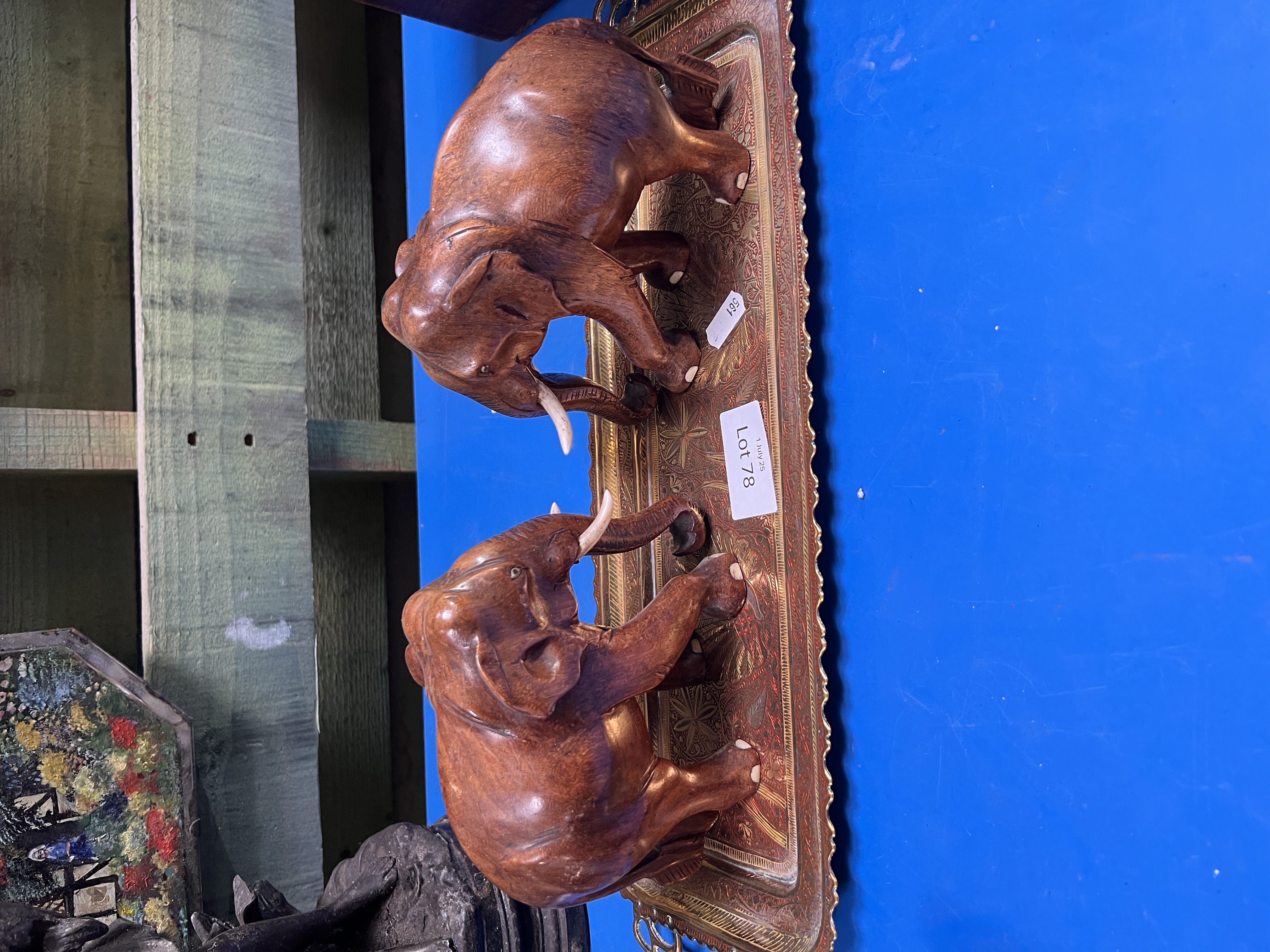 Two hand carved African elephants with an Indian brass tray.