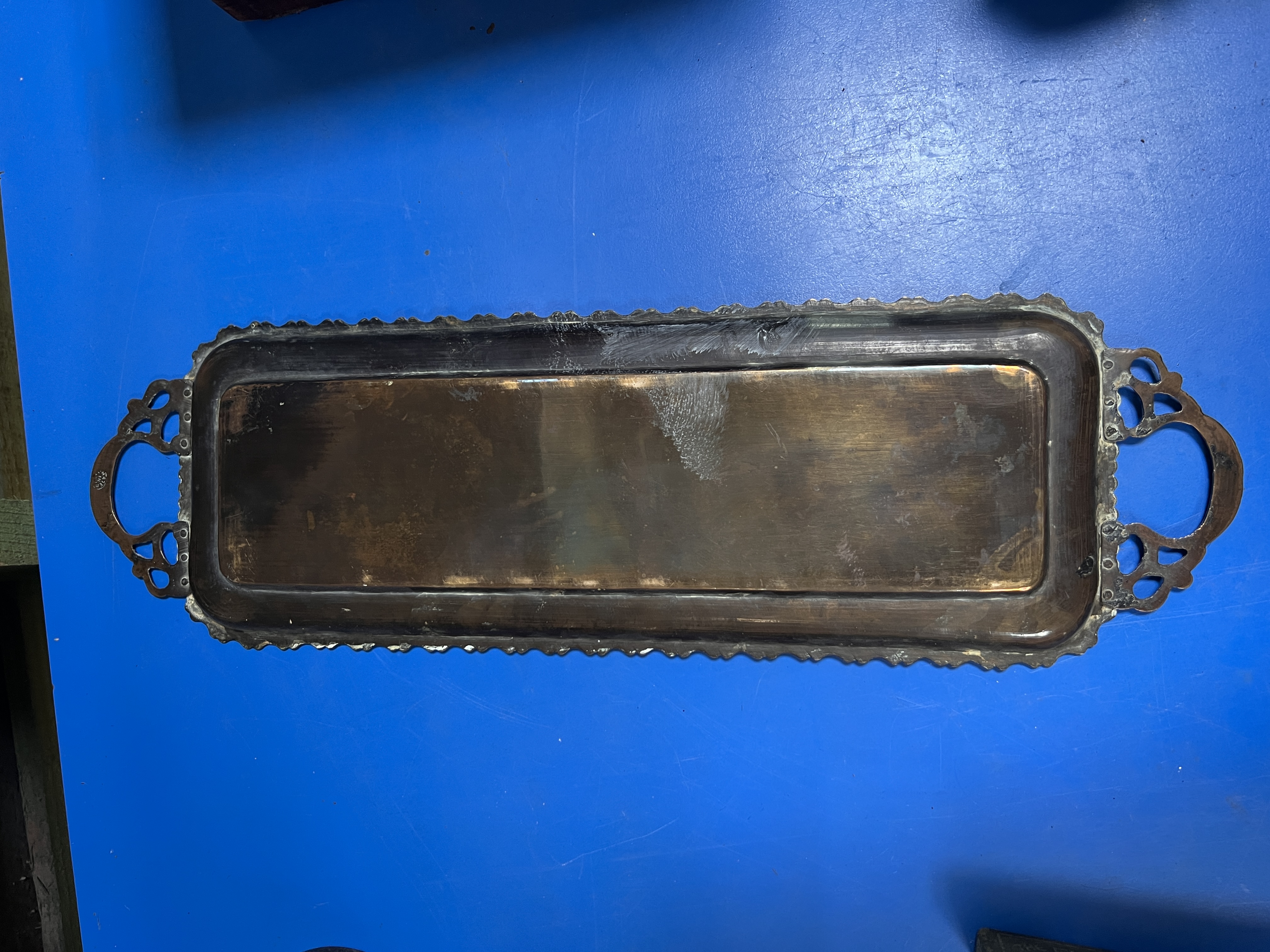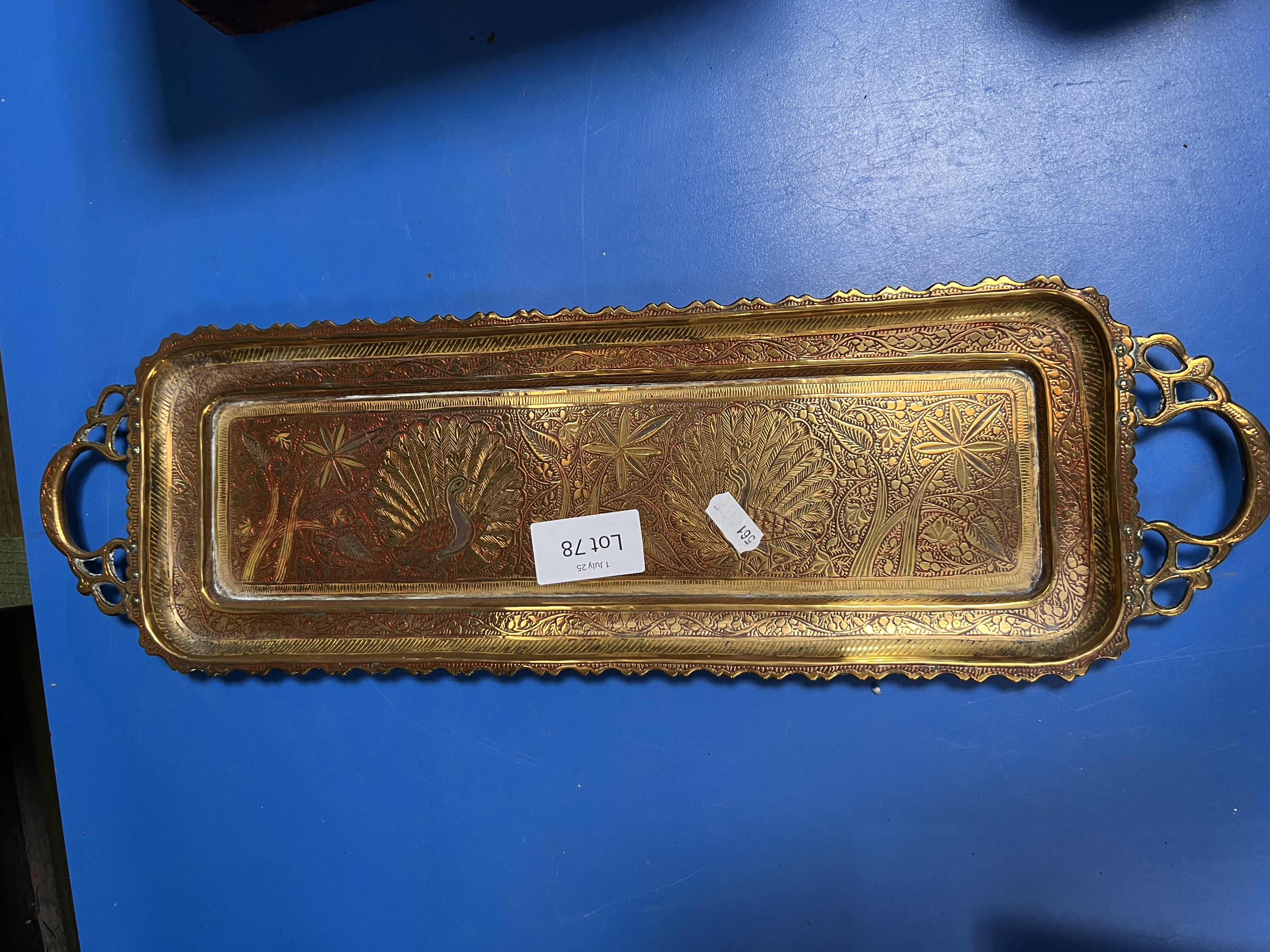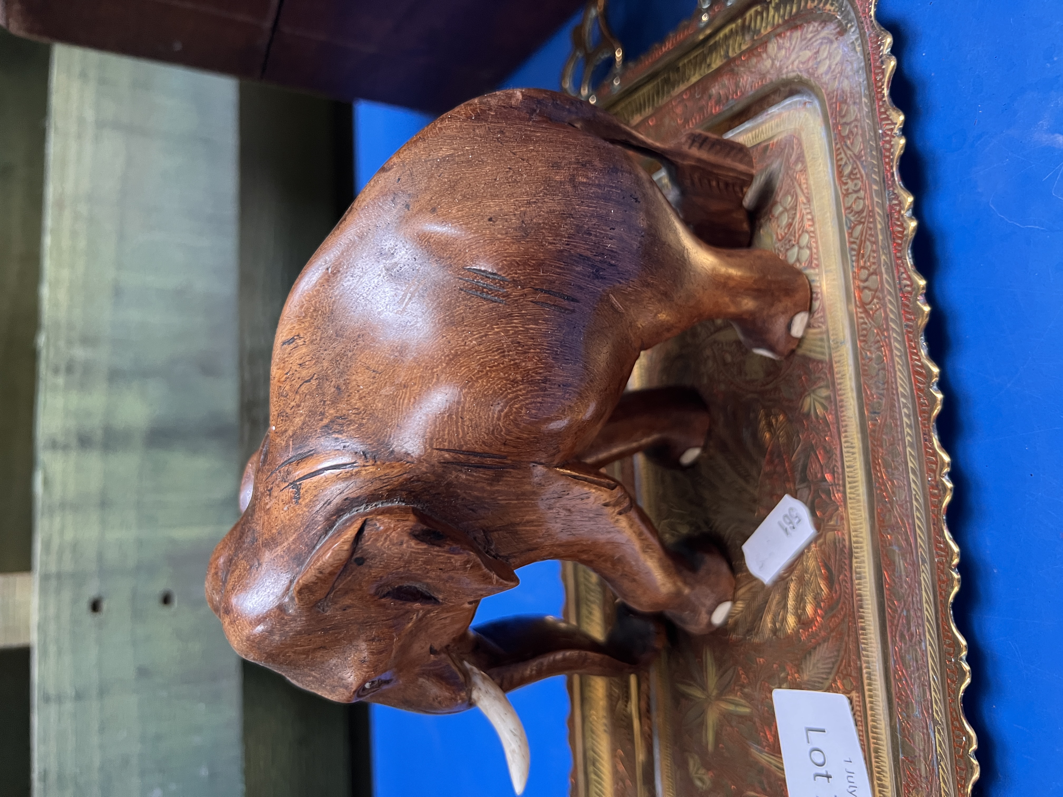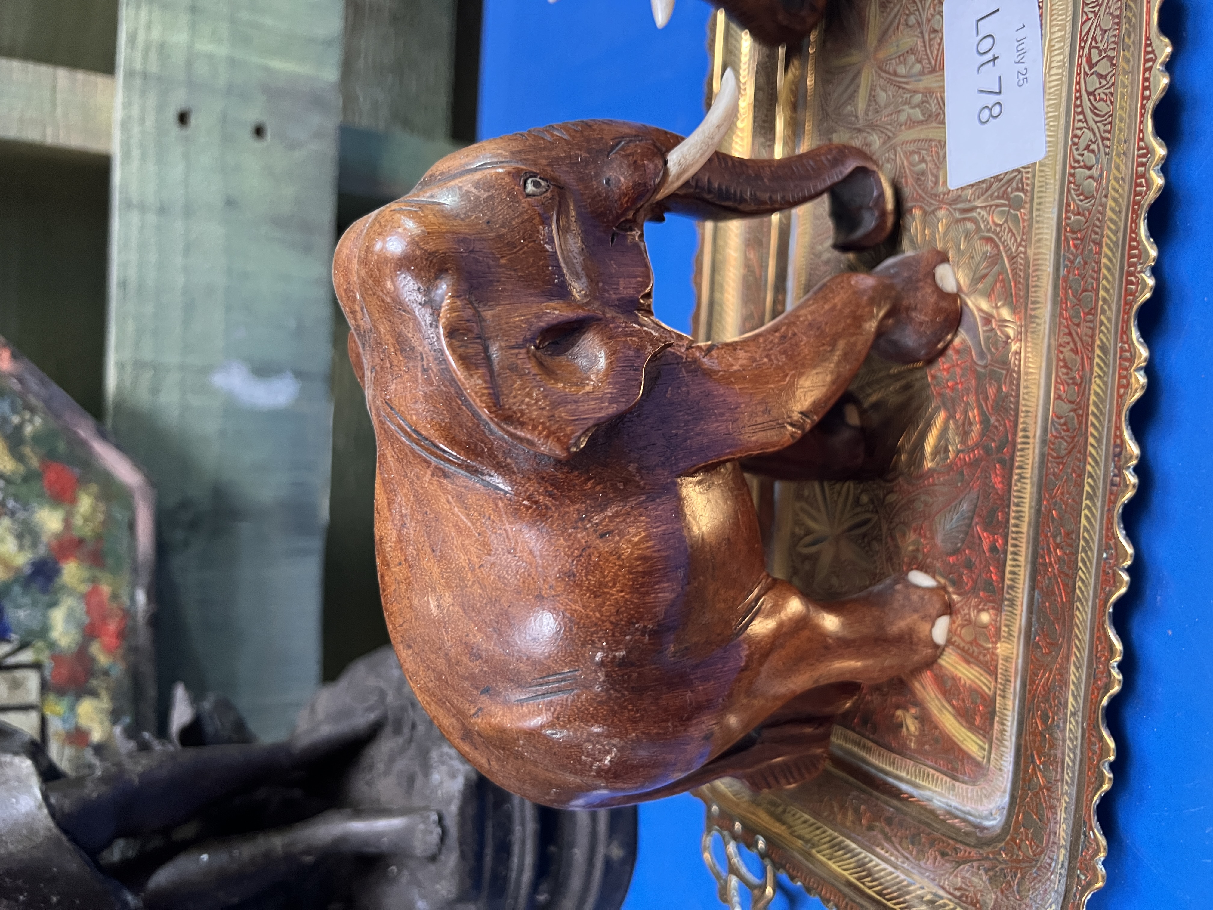 Two hand carved African elephants with an Indian brass tray.