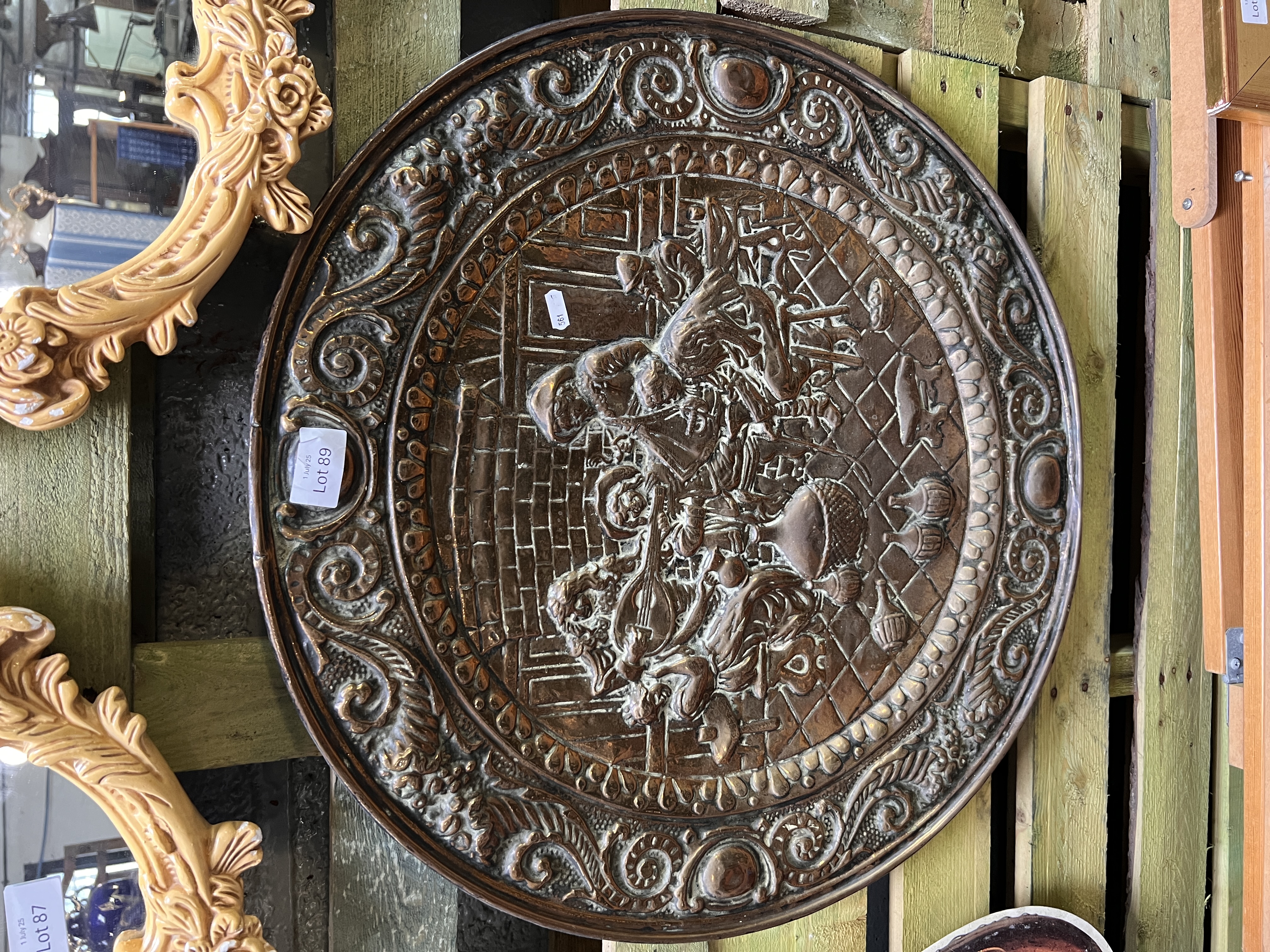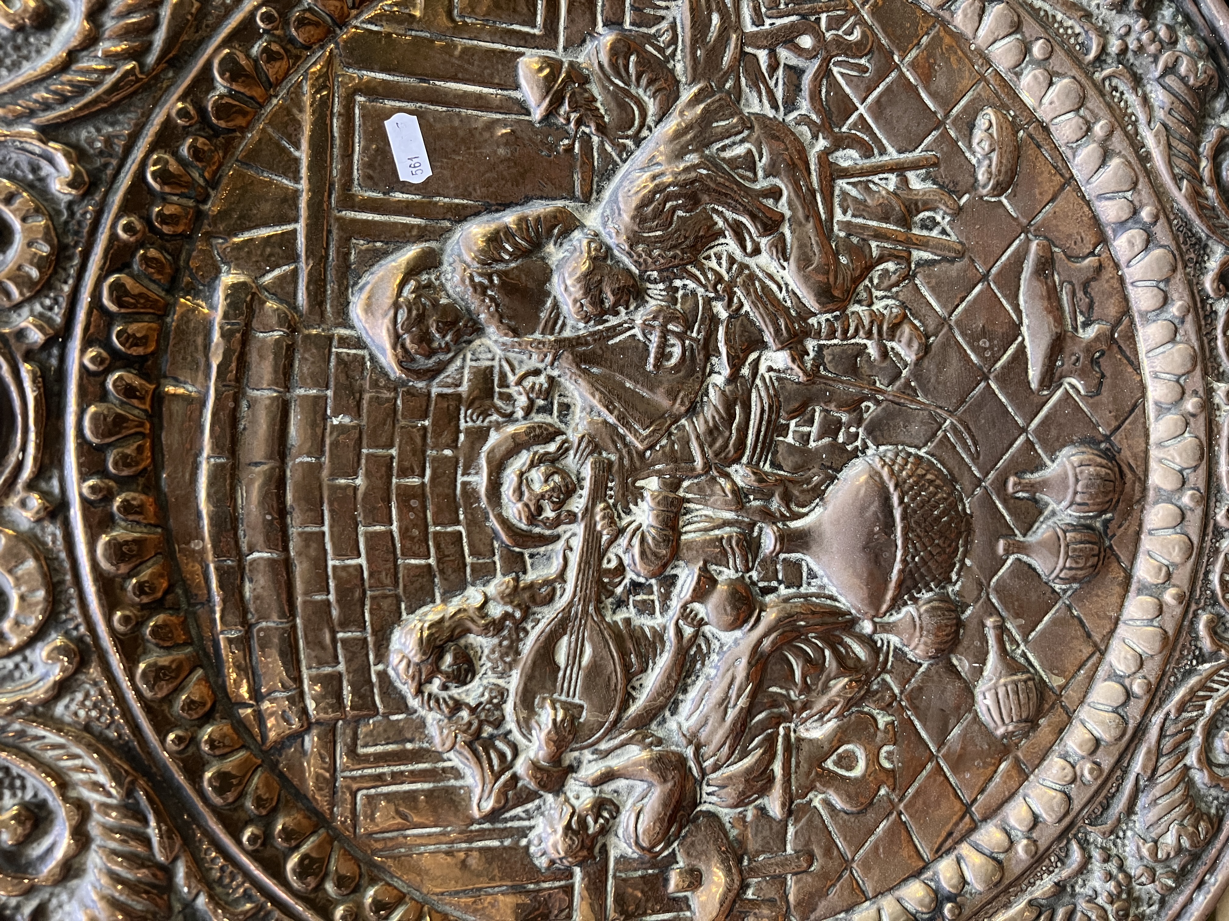 A large brass wall plaque of a tavern scene. 63cm wide.