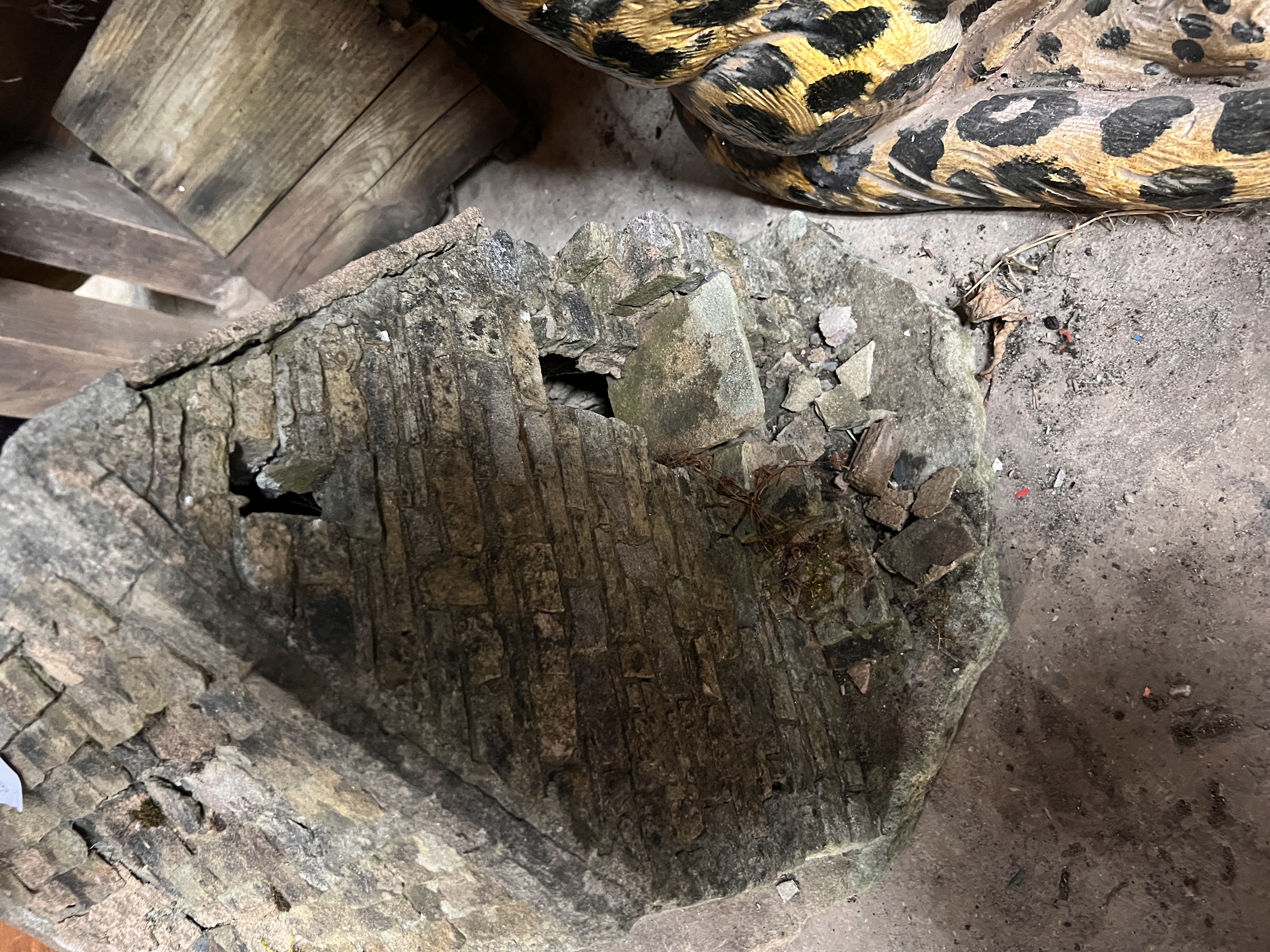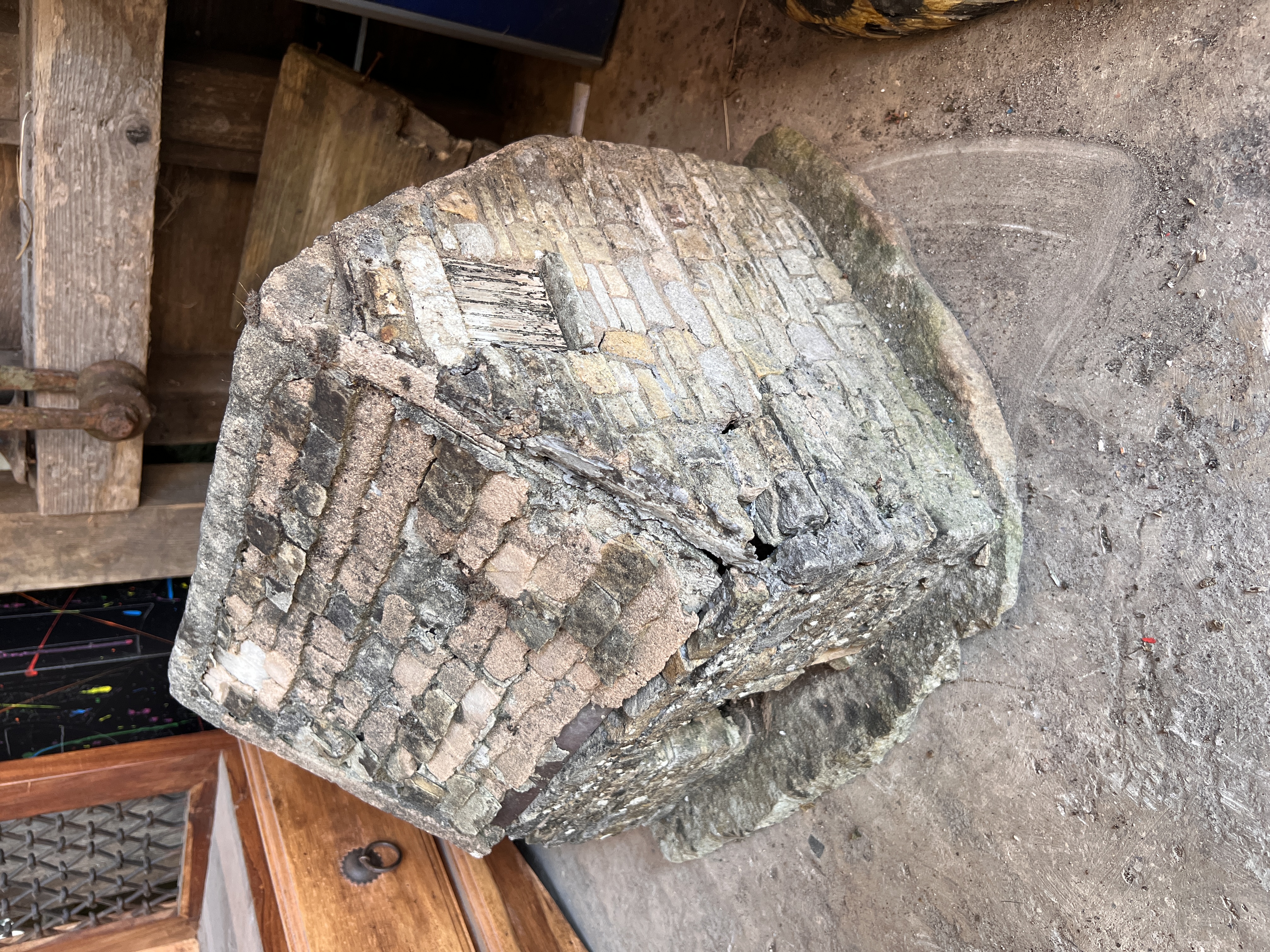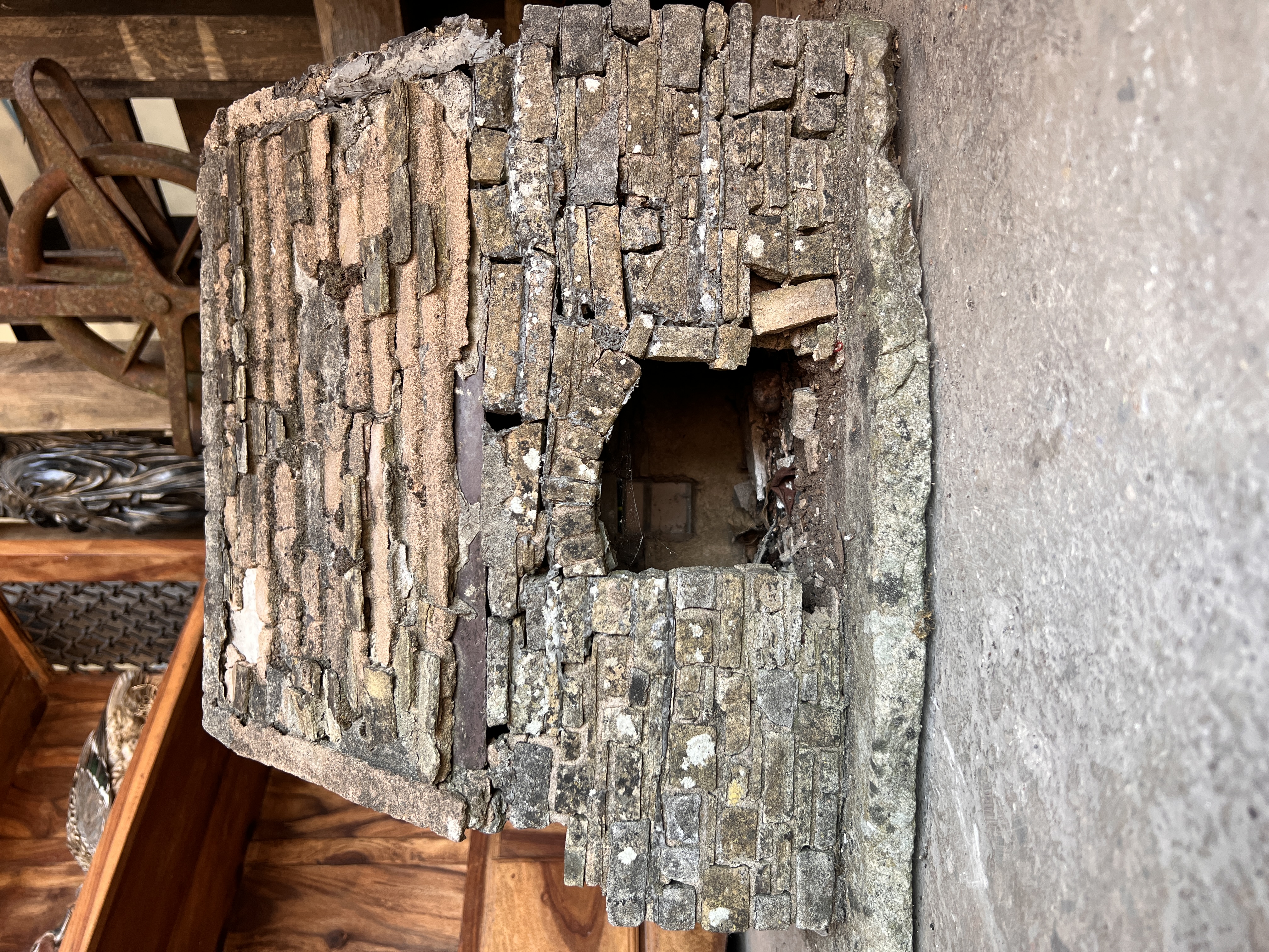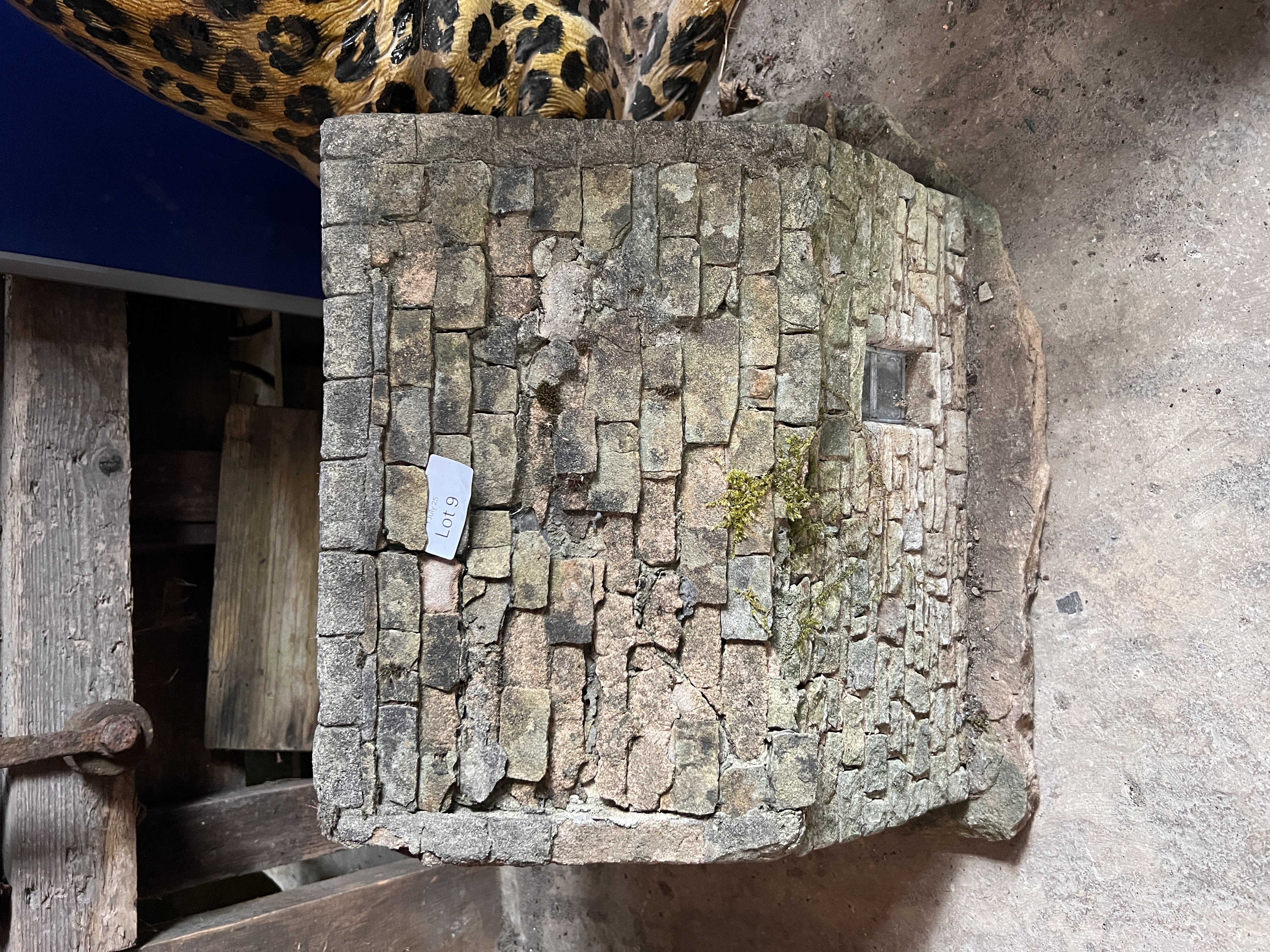 A miniature folk art garden model of a replica stone house. 42cm tall