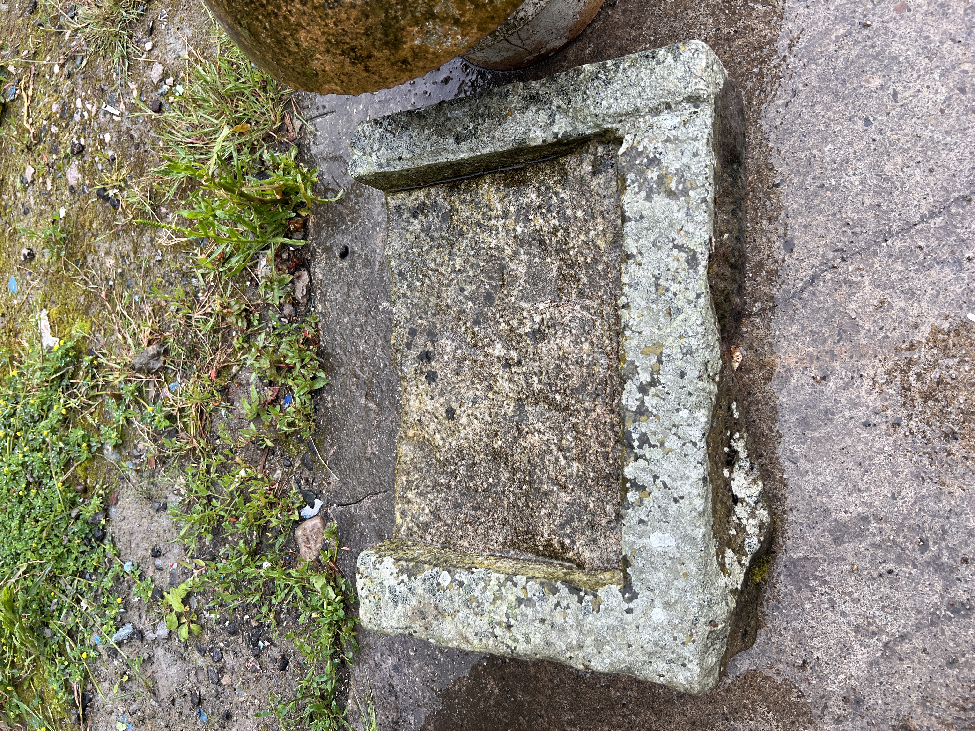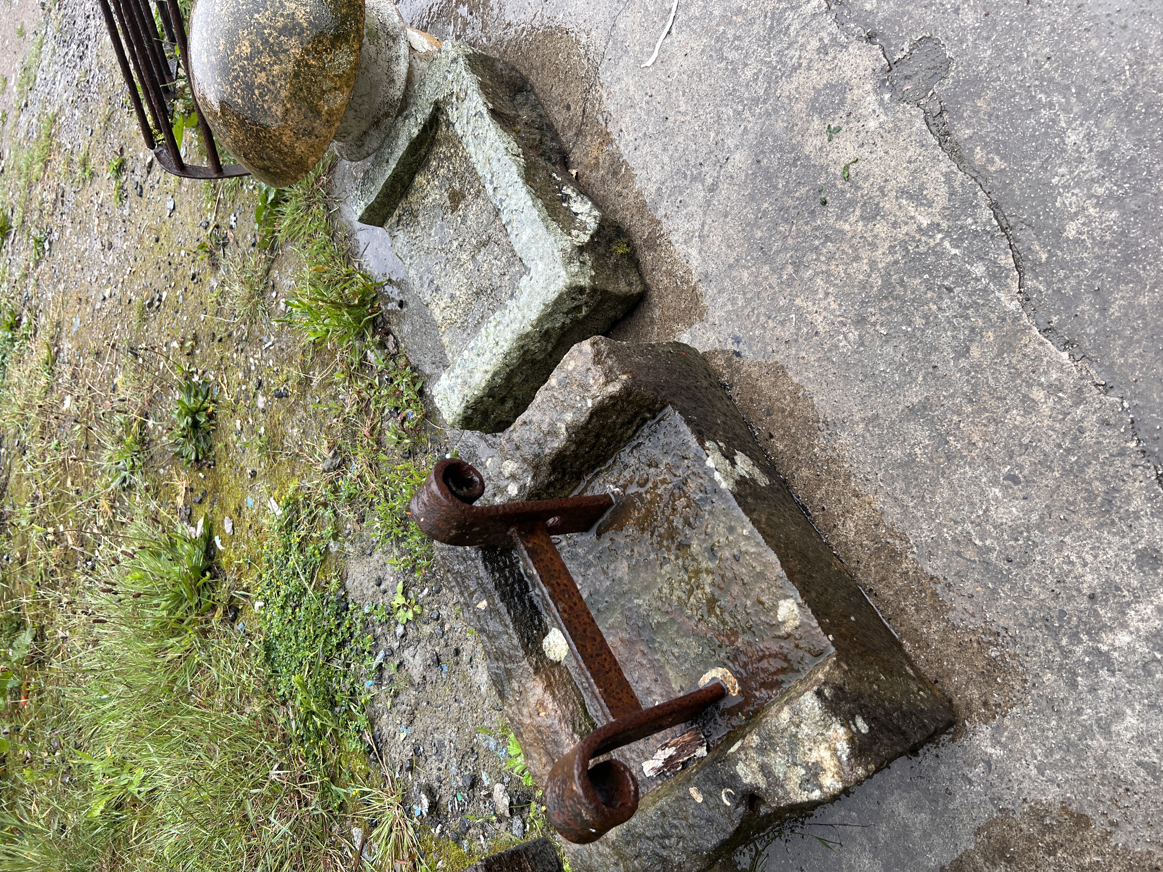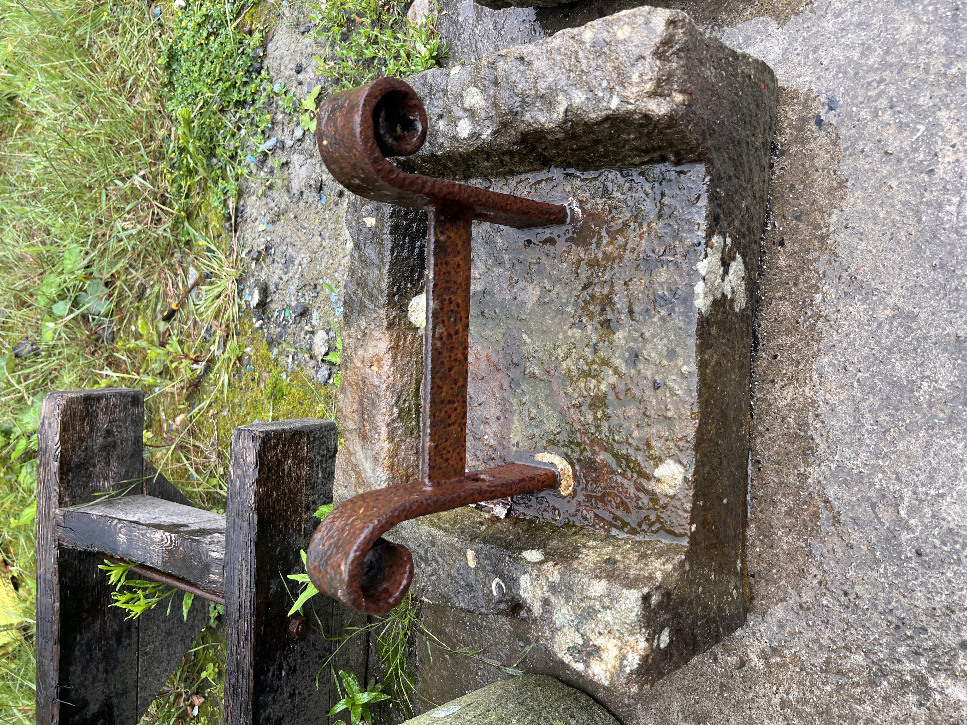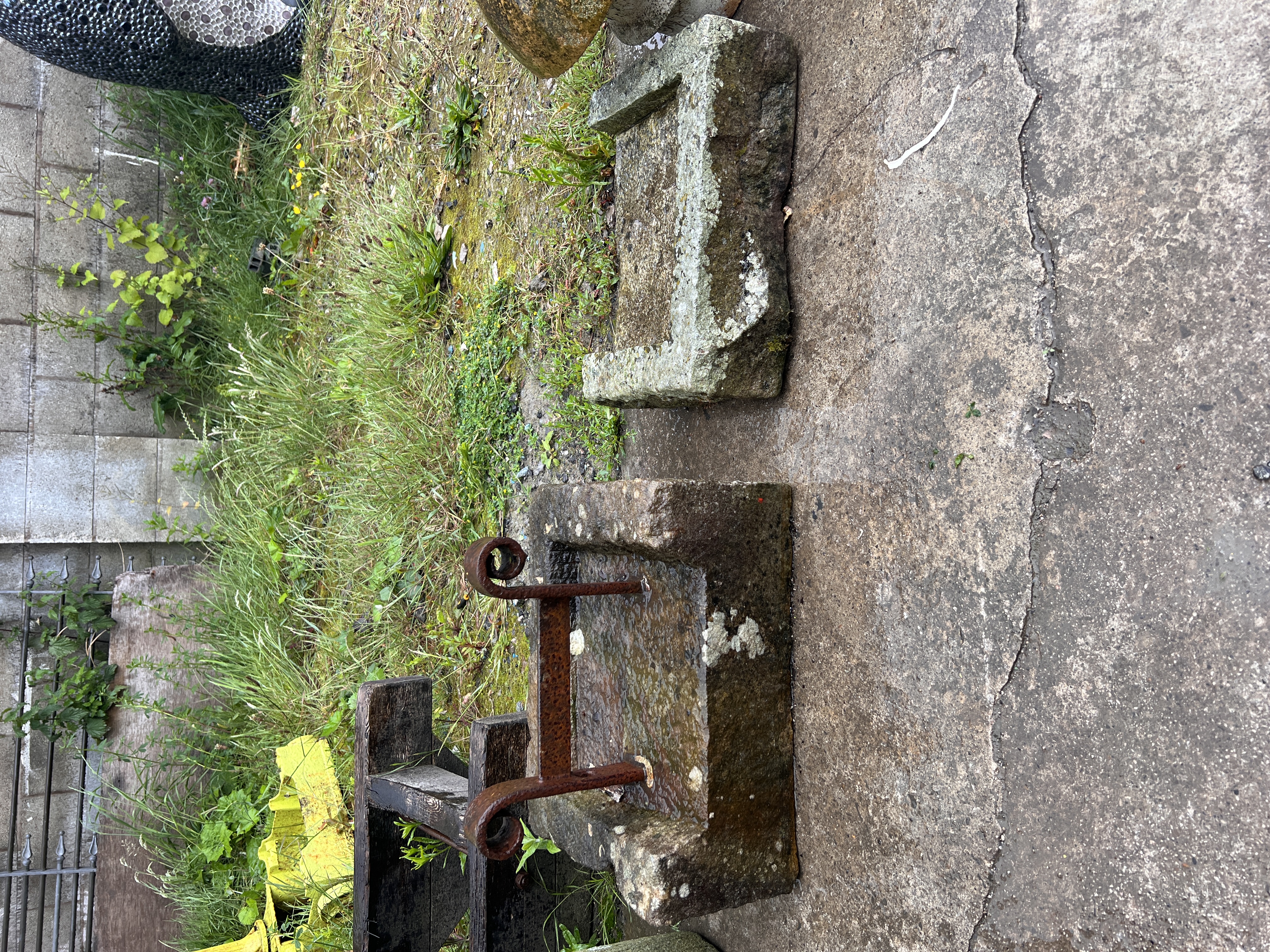 A Wrought iron boot scrape in sand stone base with similar sand stone piece.
