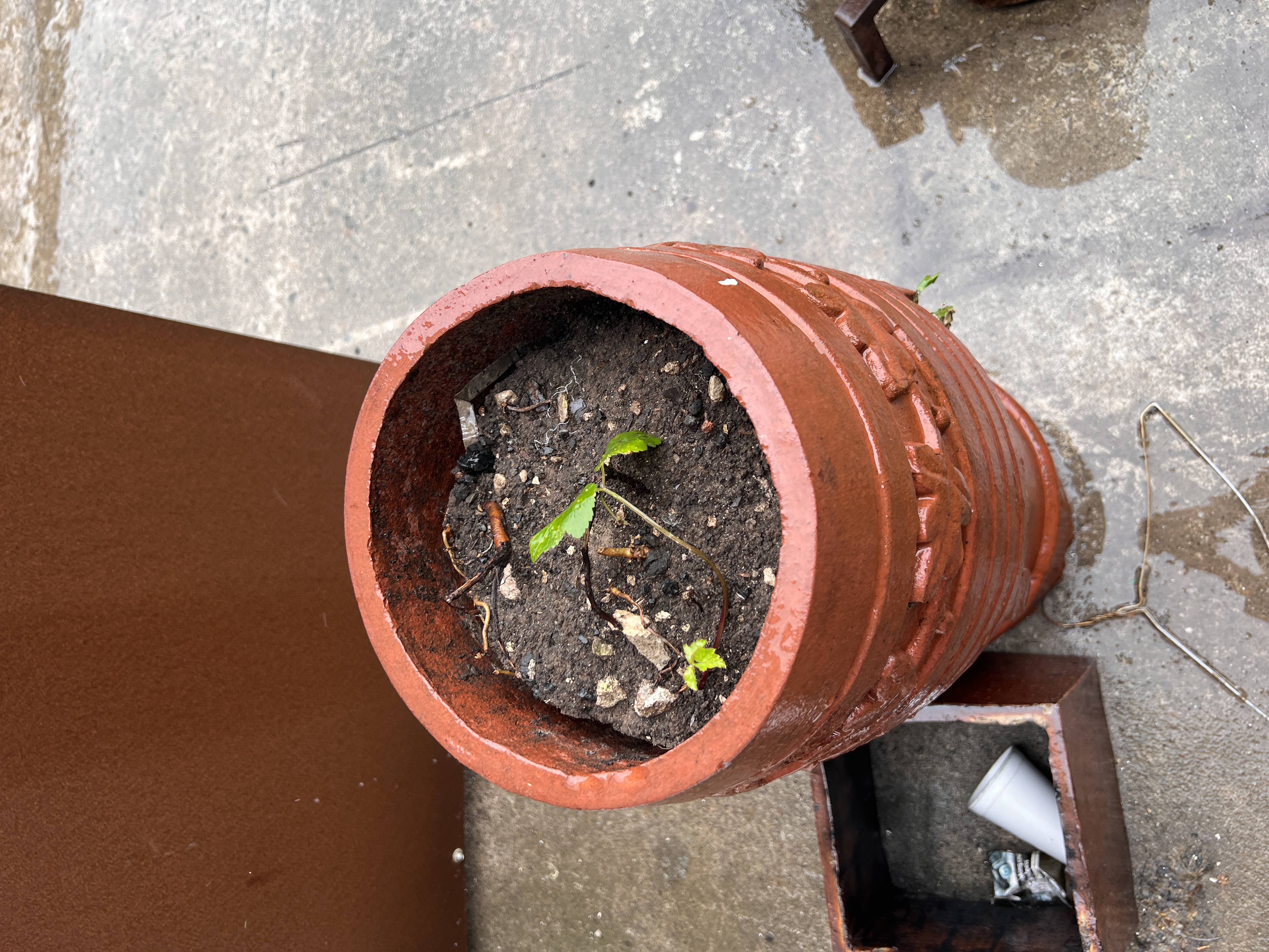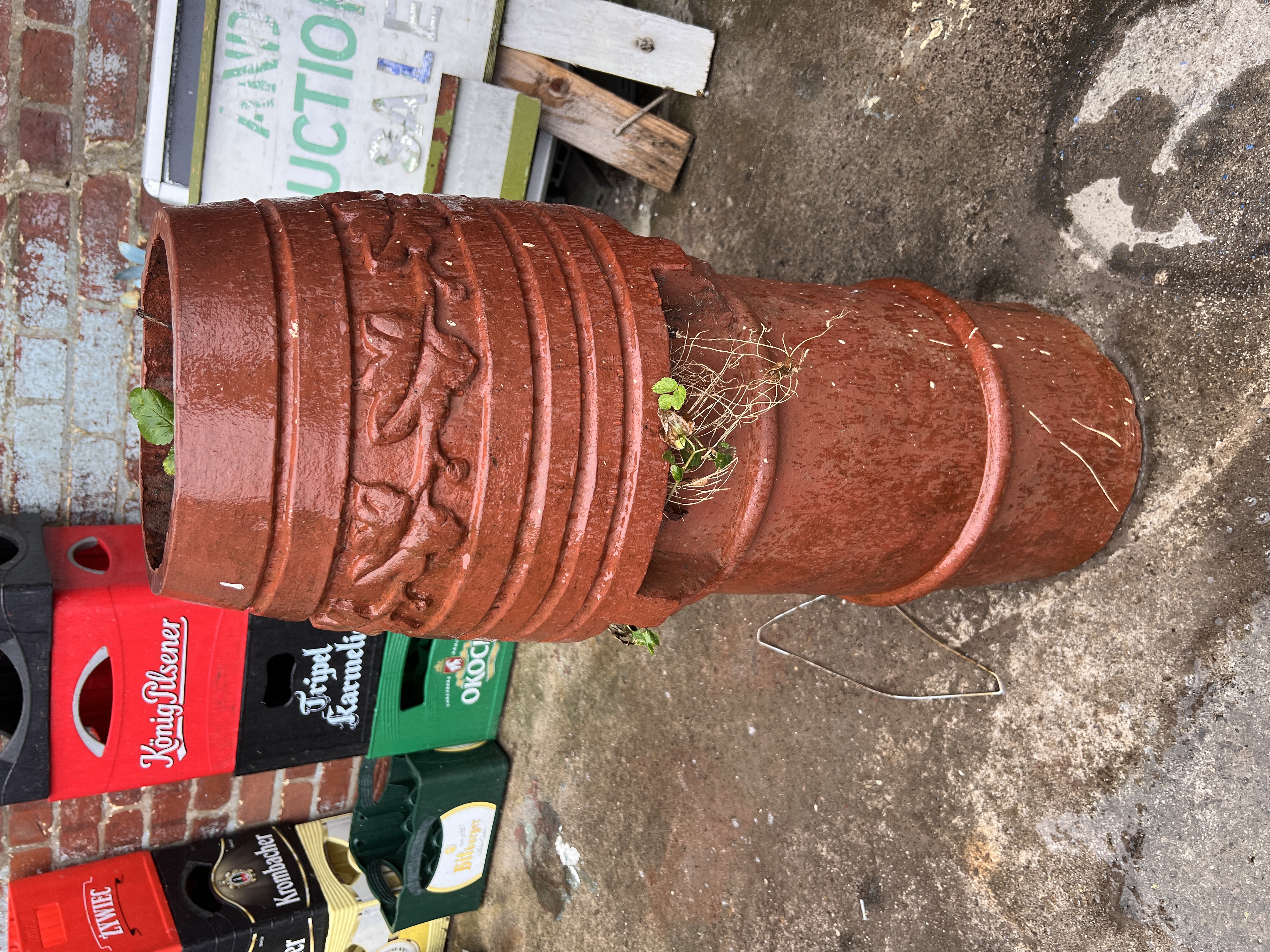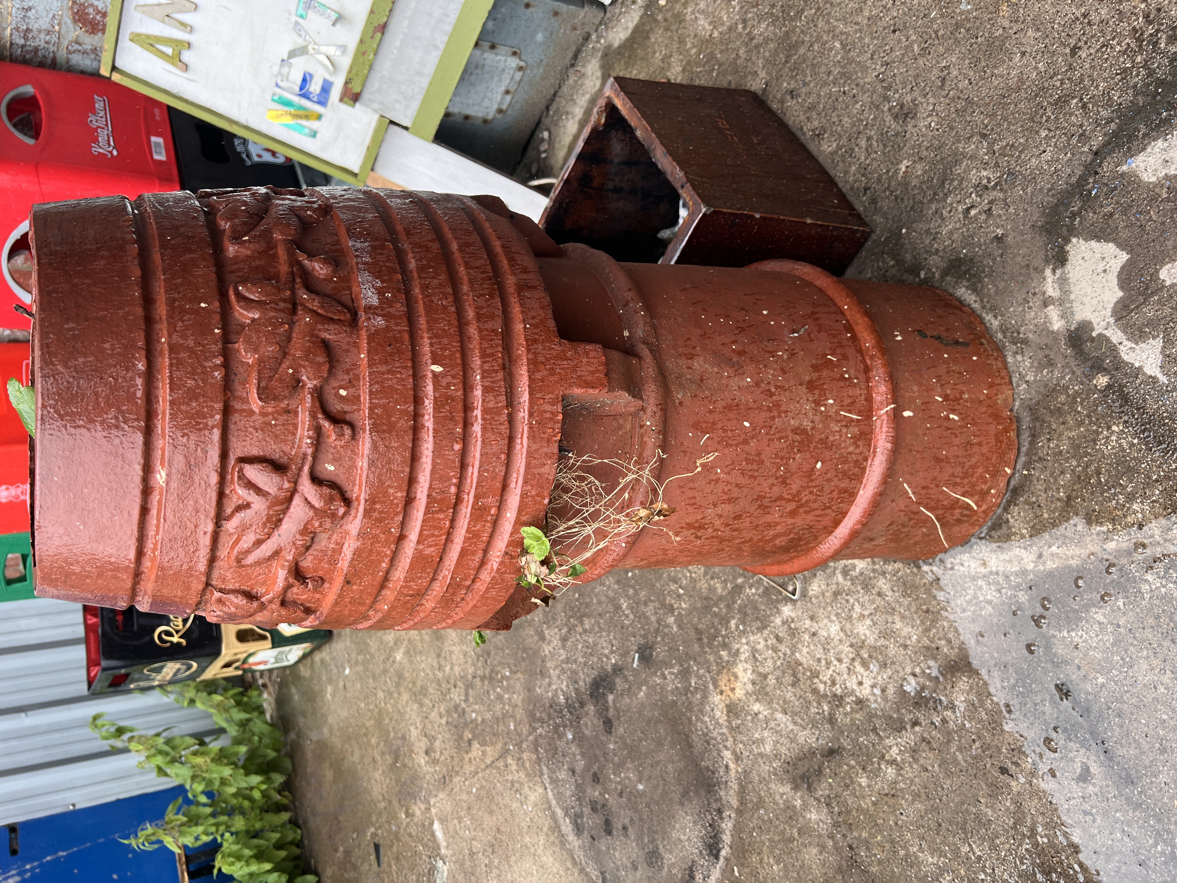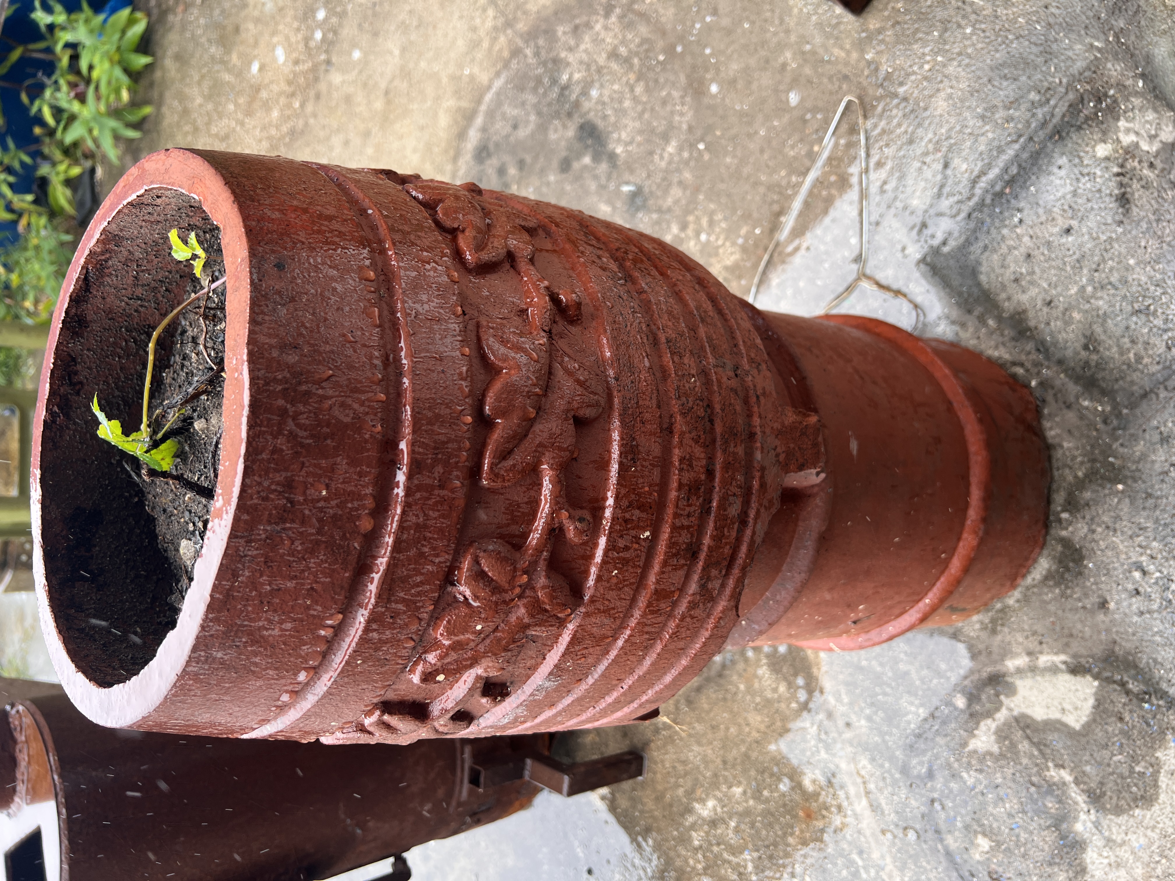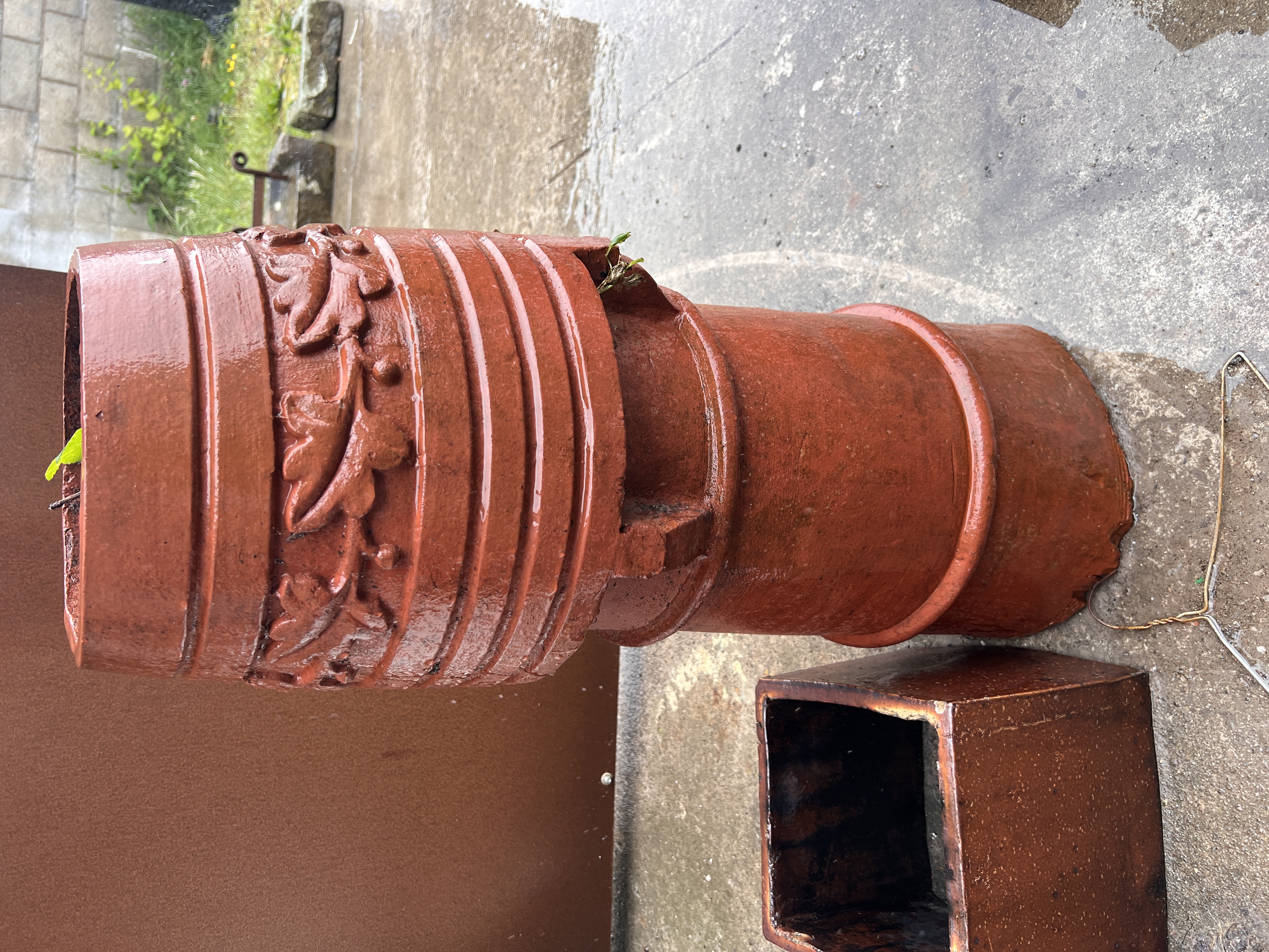 A terracotta chimney pot with floral decoration, 86cm tall.