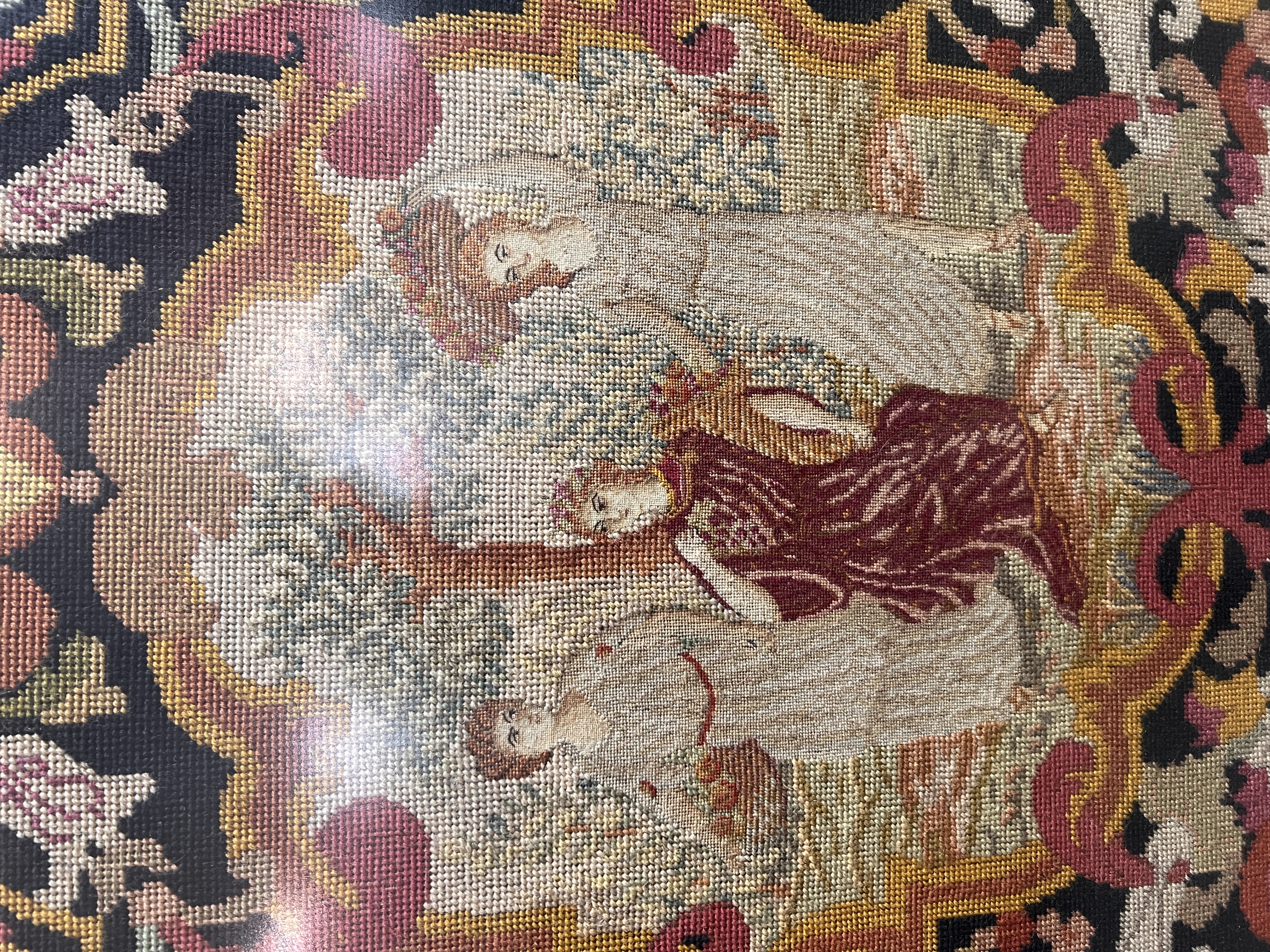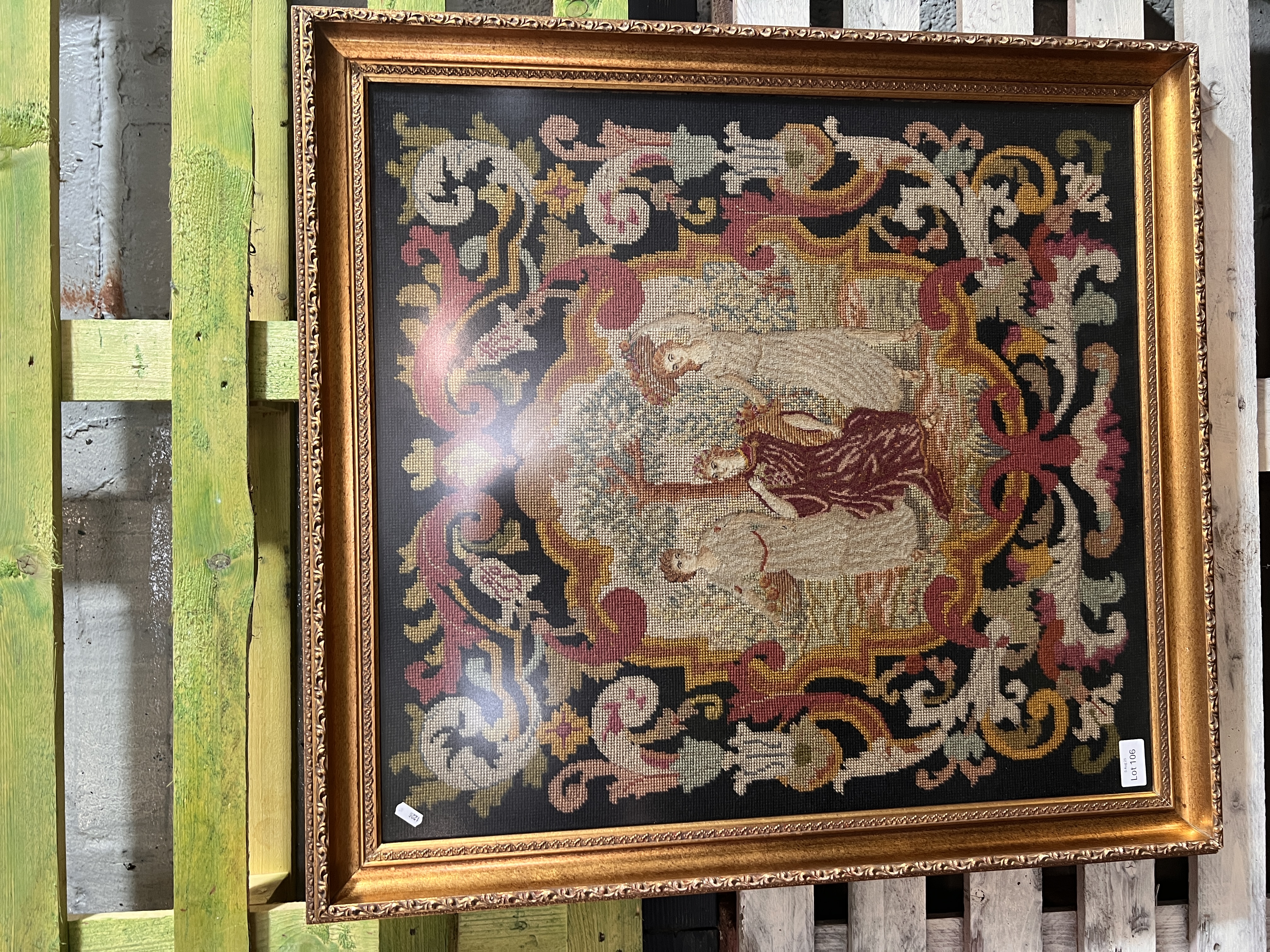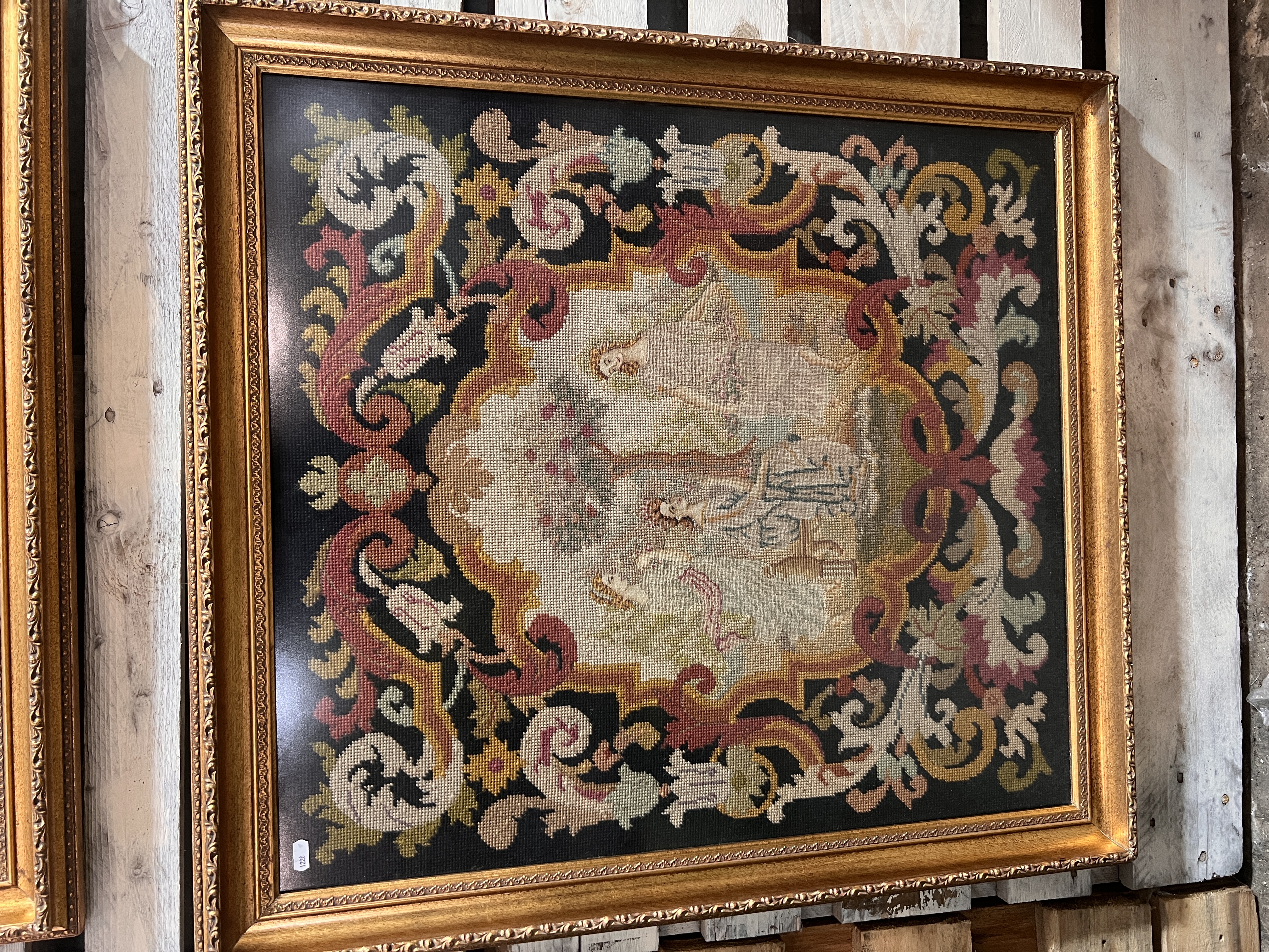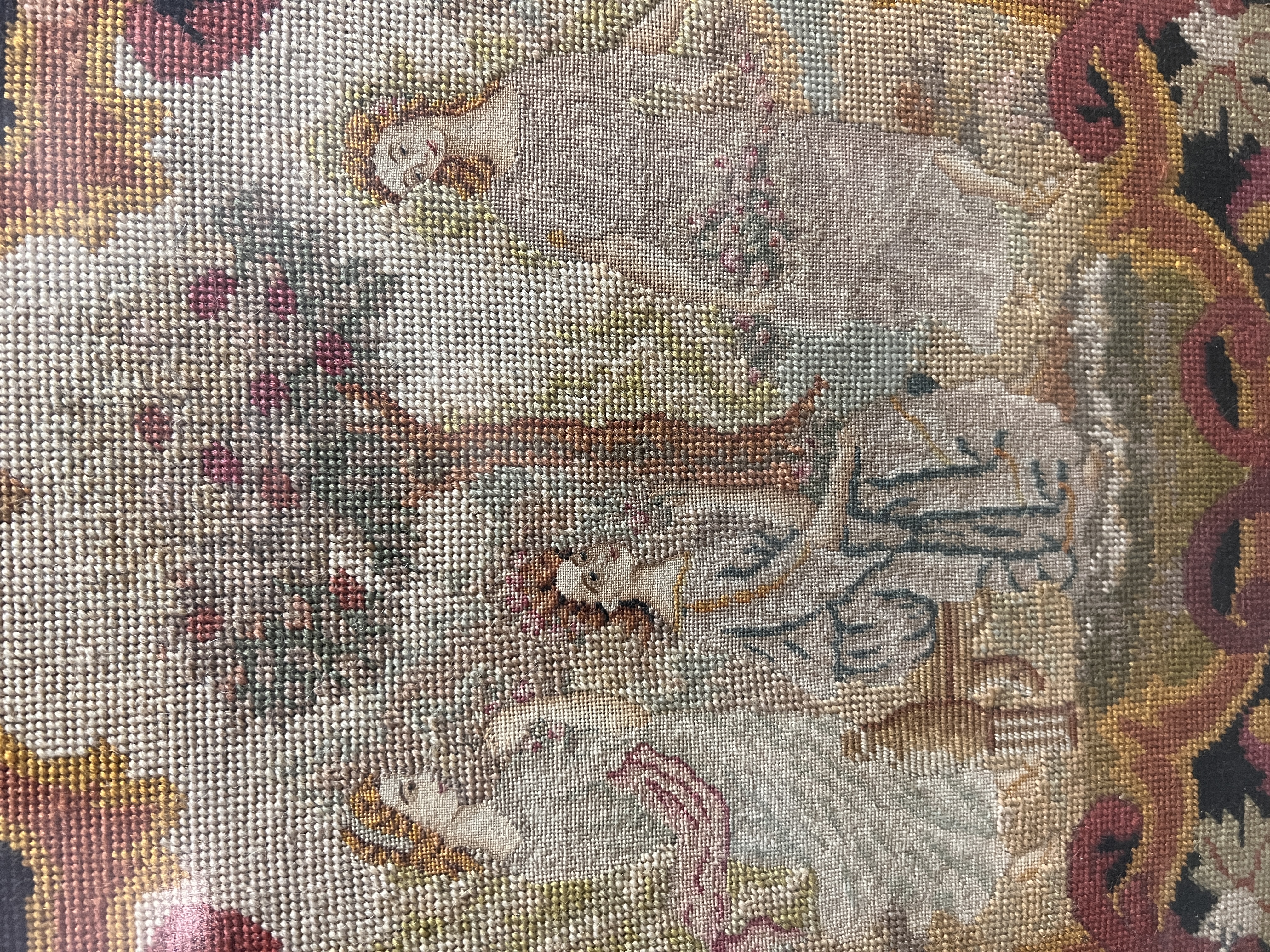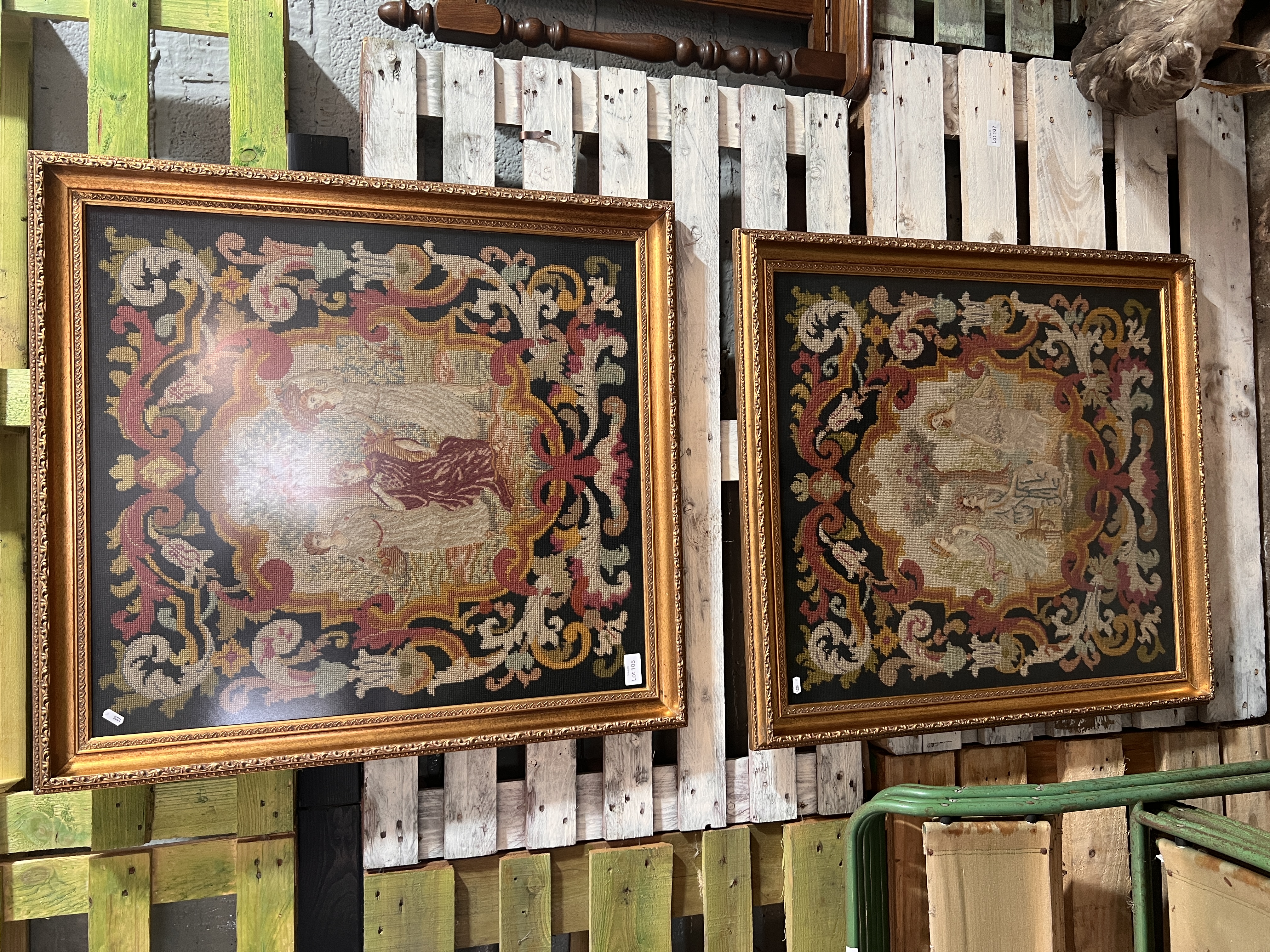 A pair of late Victorian embroidered panels depicting maidens in Eden. 81cm x 81cm each. Later framed.