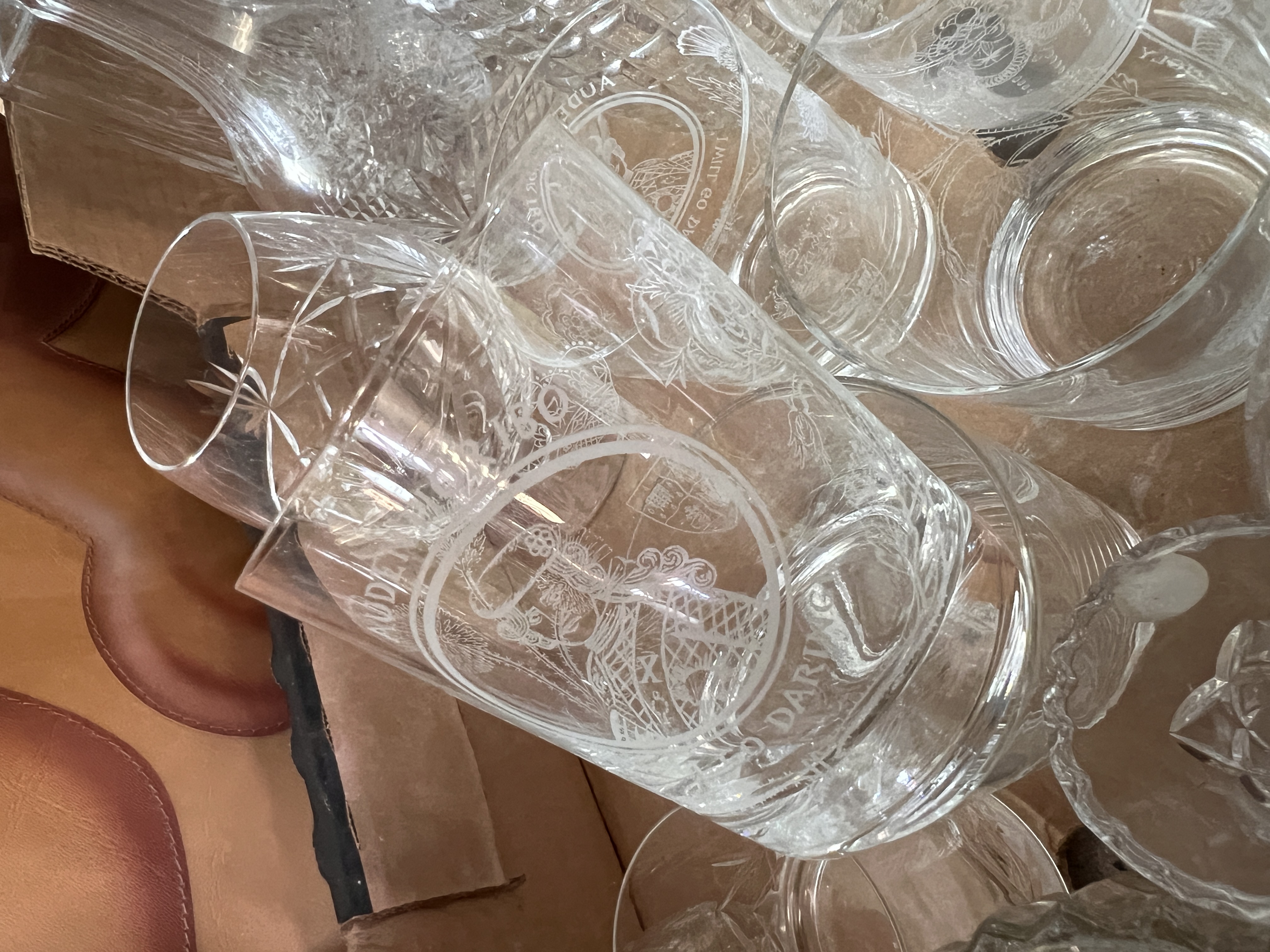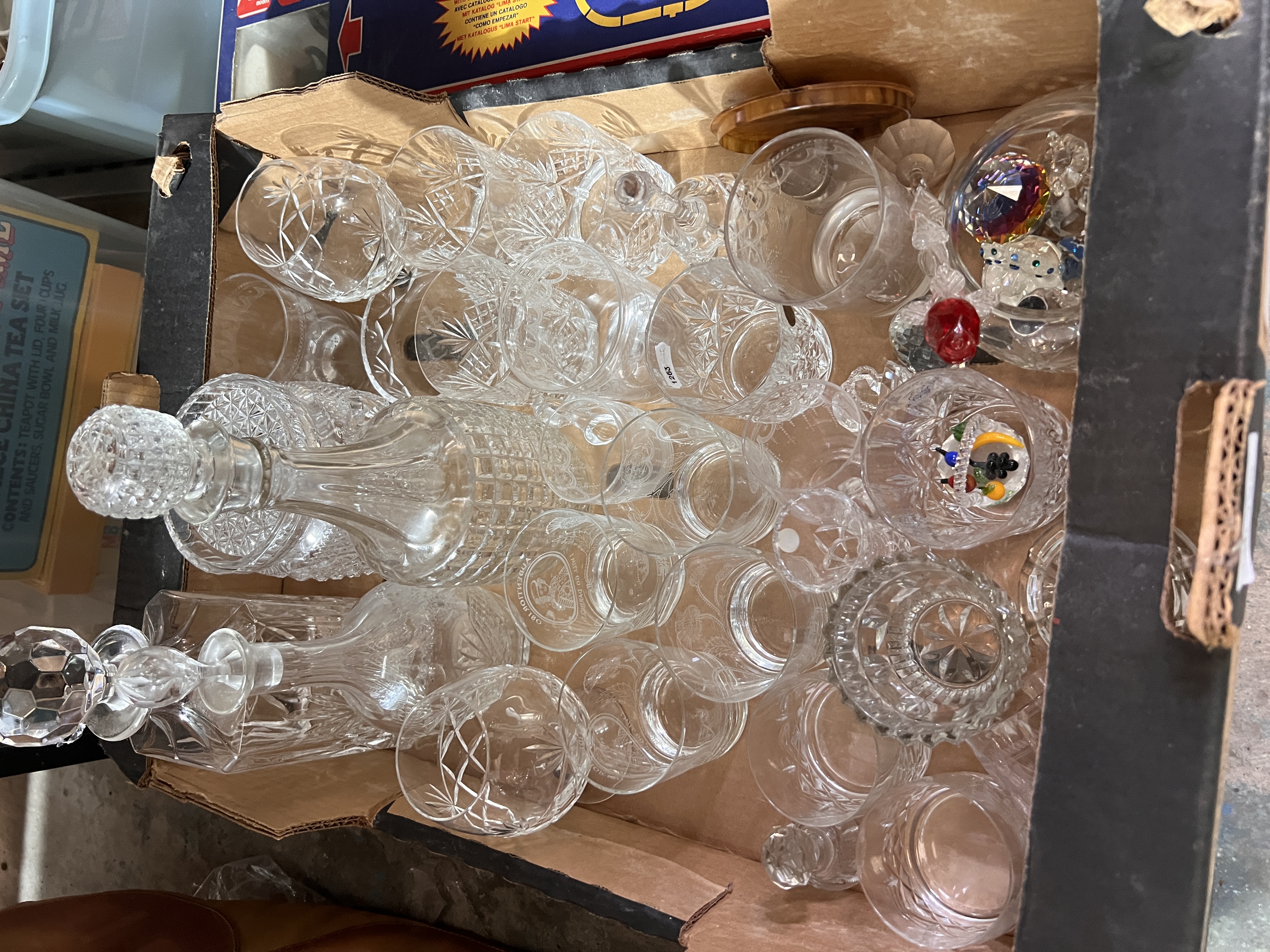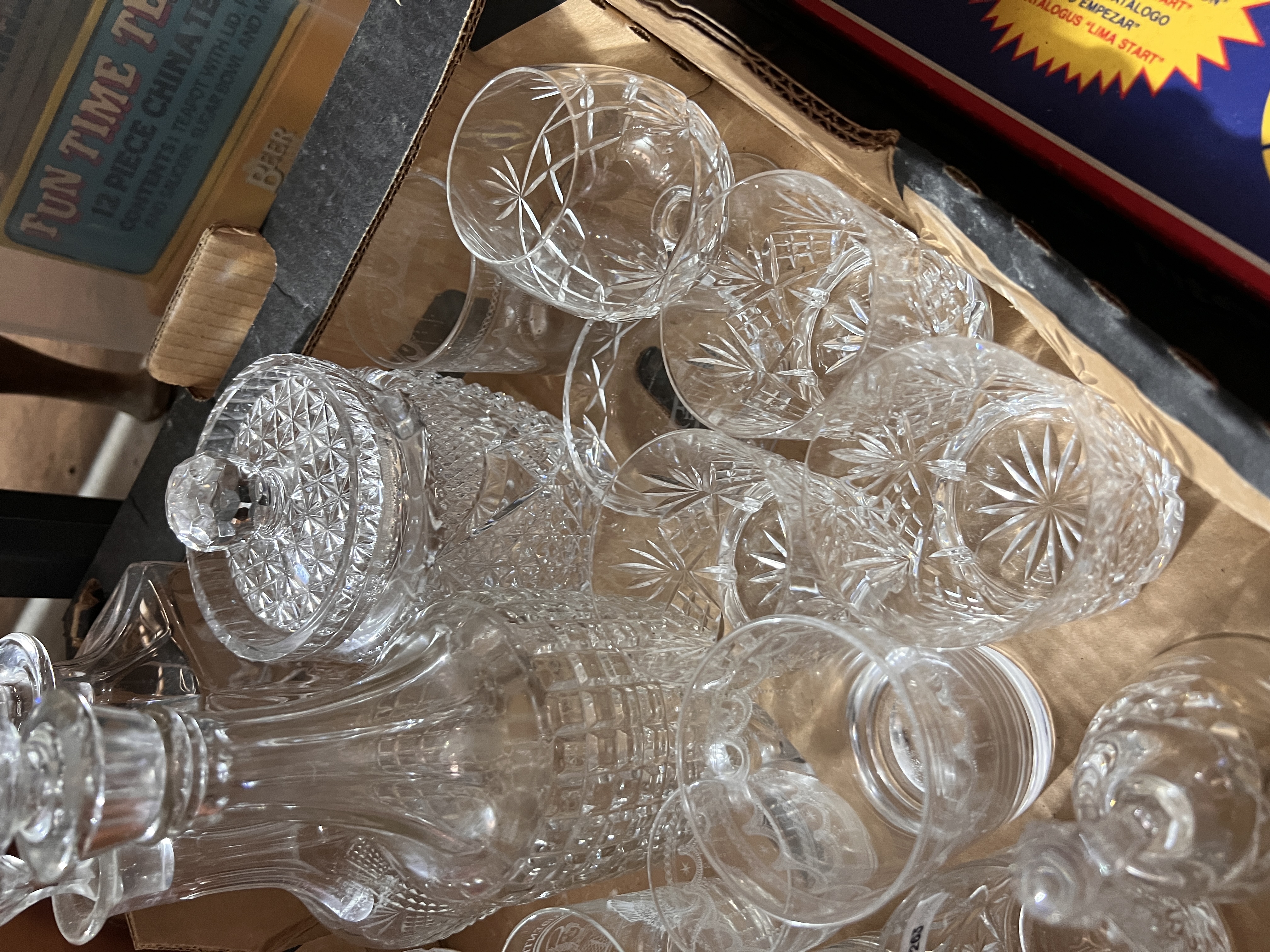 A selection of clear cut crystal glass wares including decanters, biscuit barrel and etched tumblers.