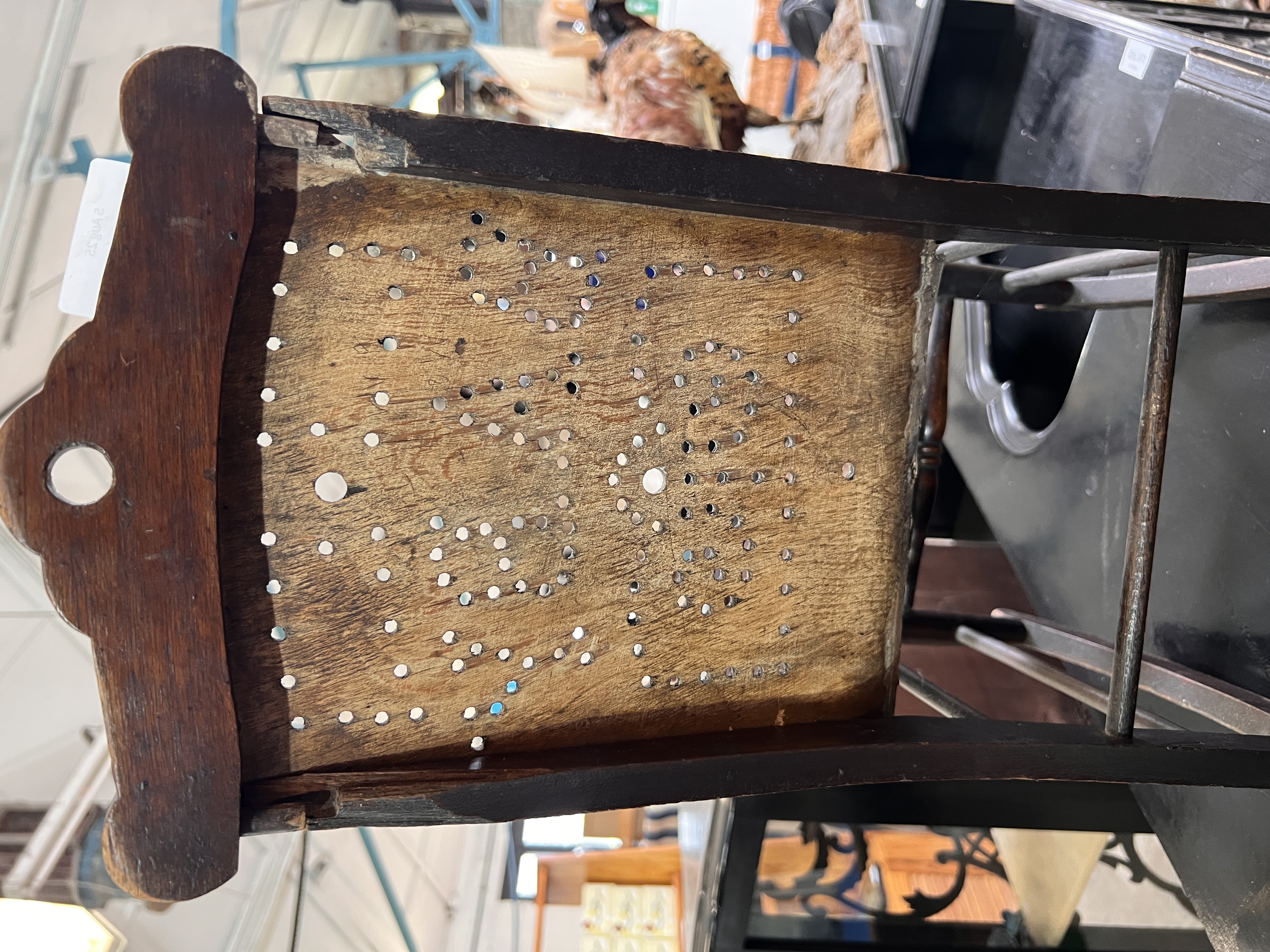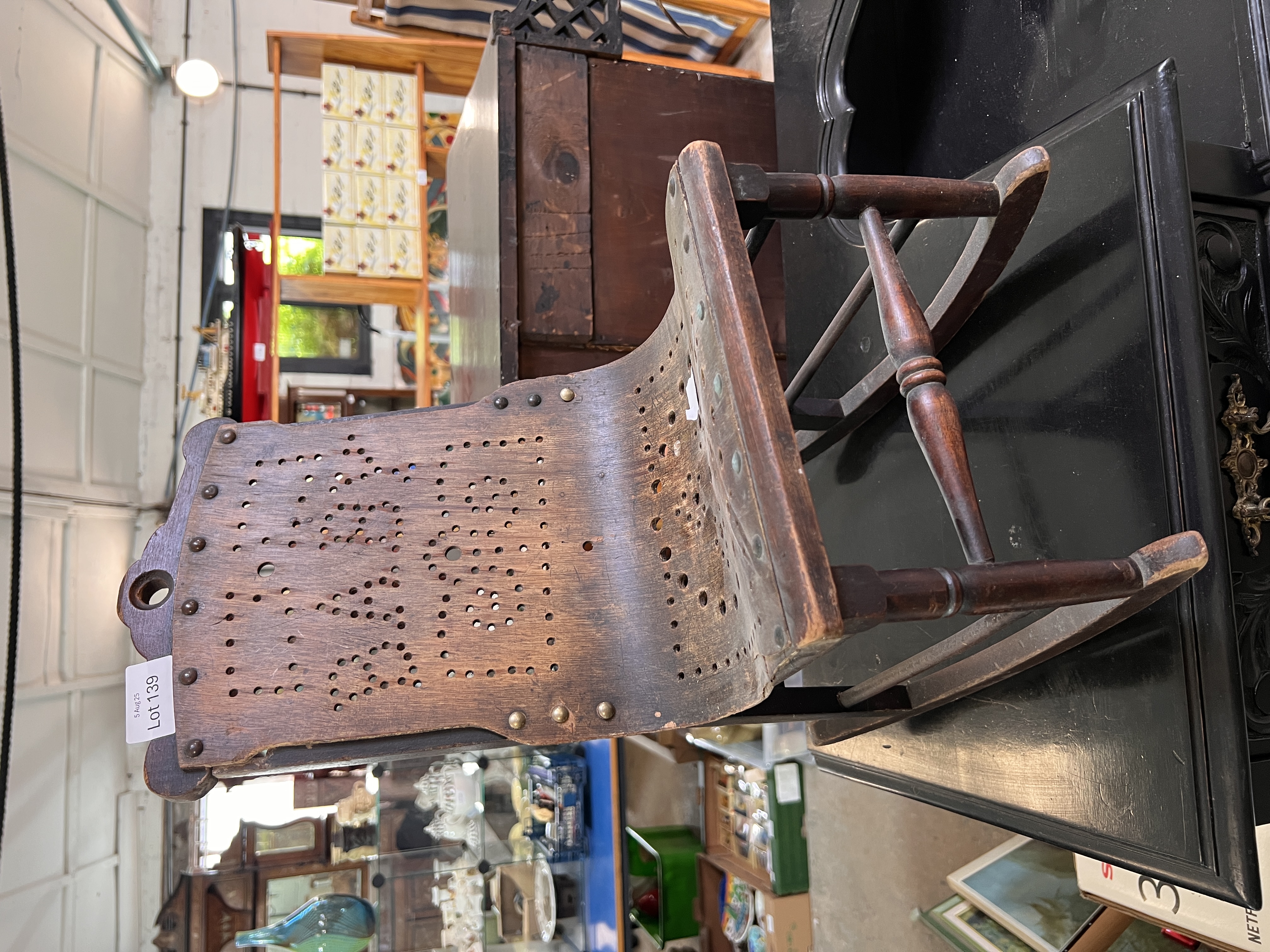 A Victorian child’s rocking chair with baby design to back.