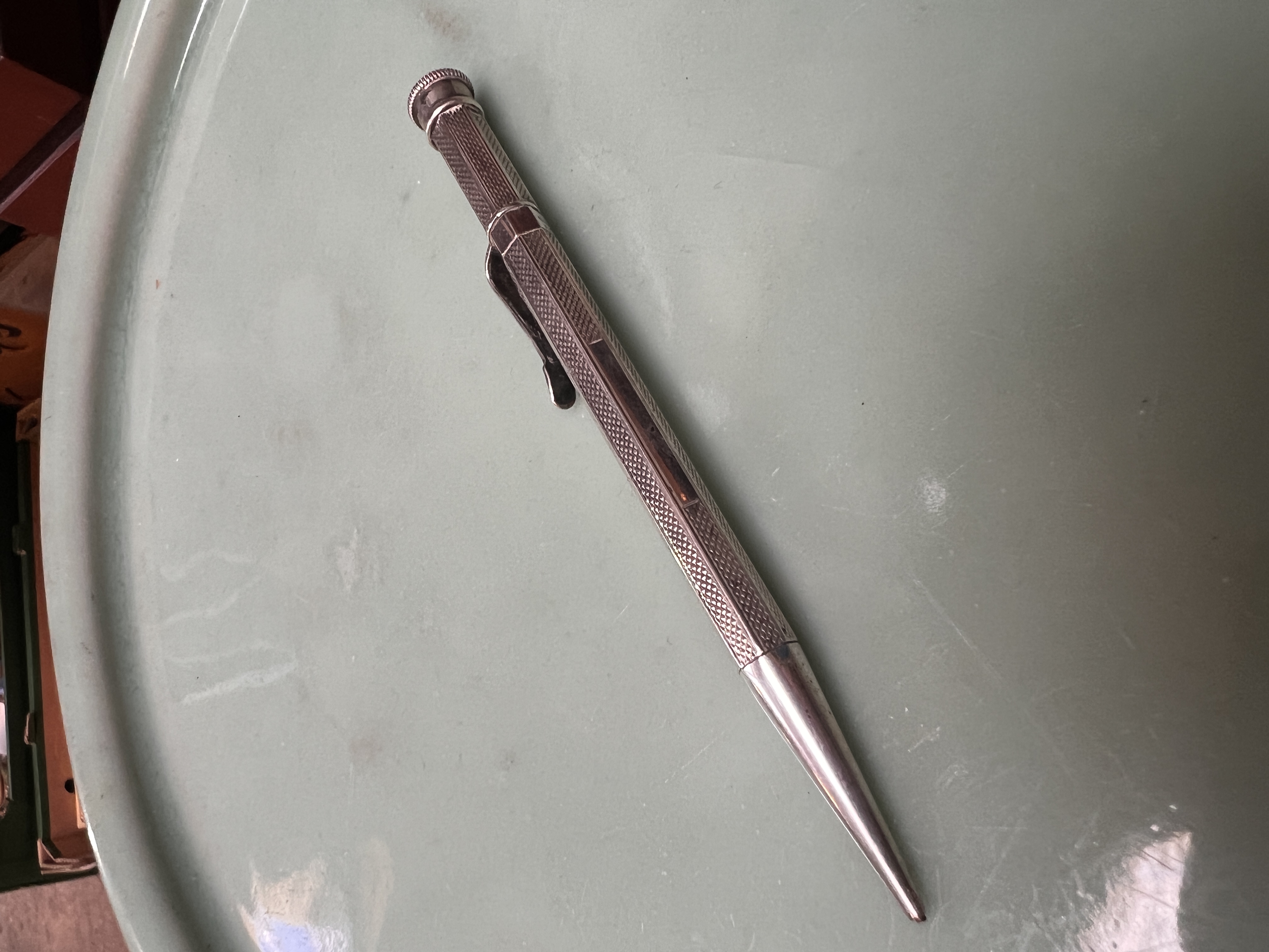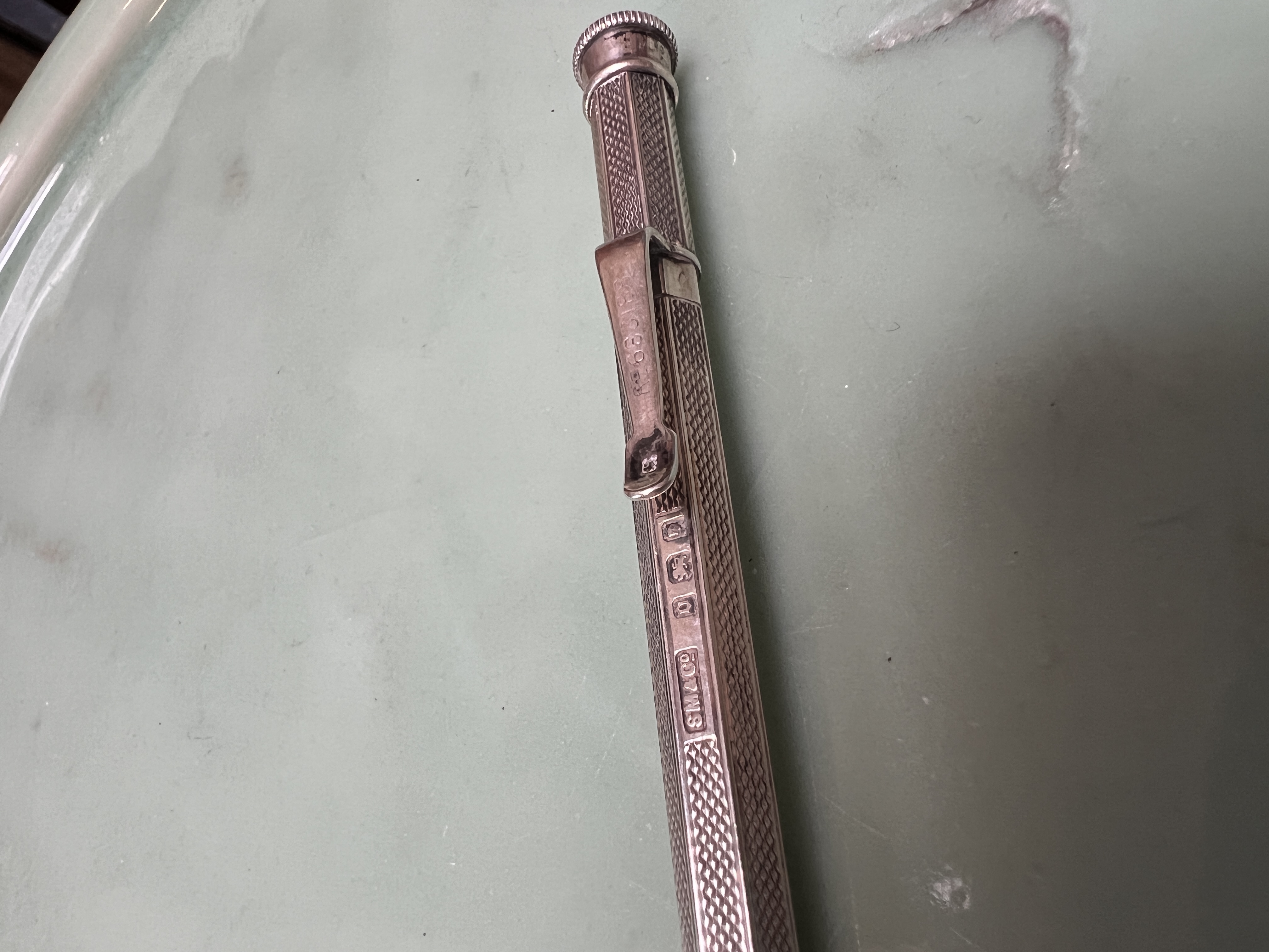 A HM silver propelling pencil having machine tooled decoration. 20g.