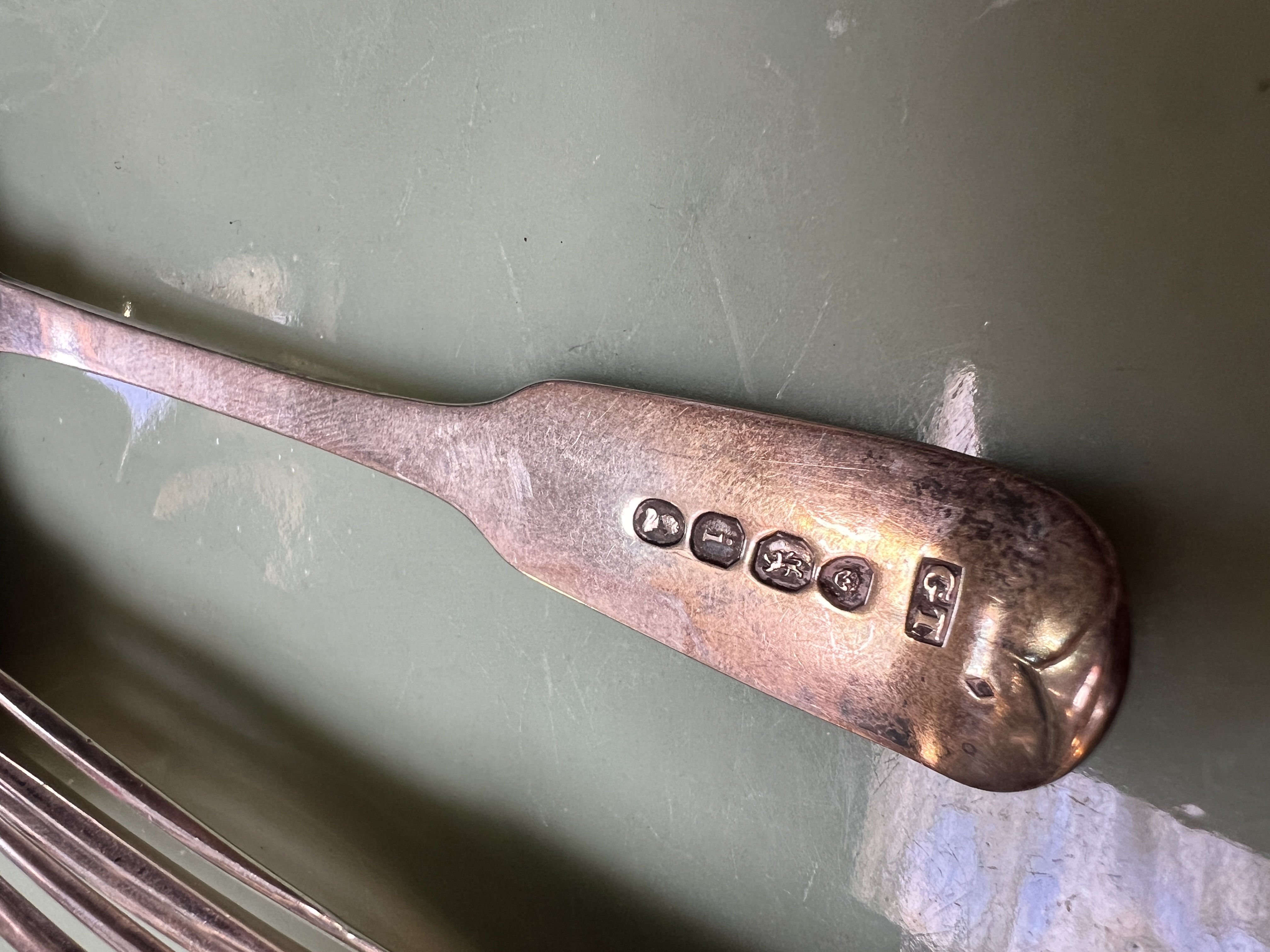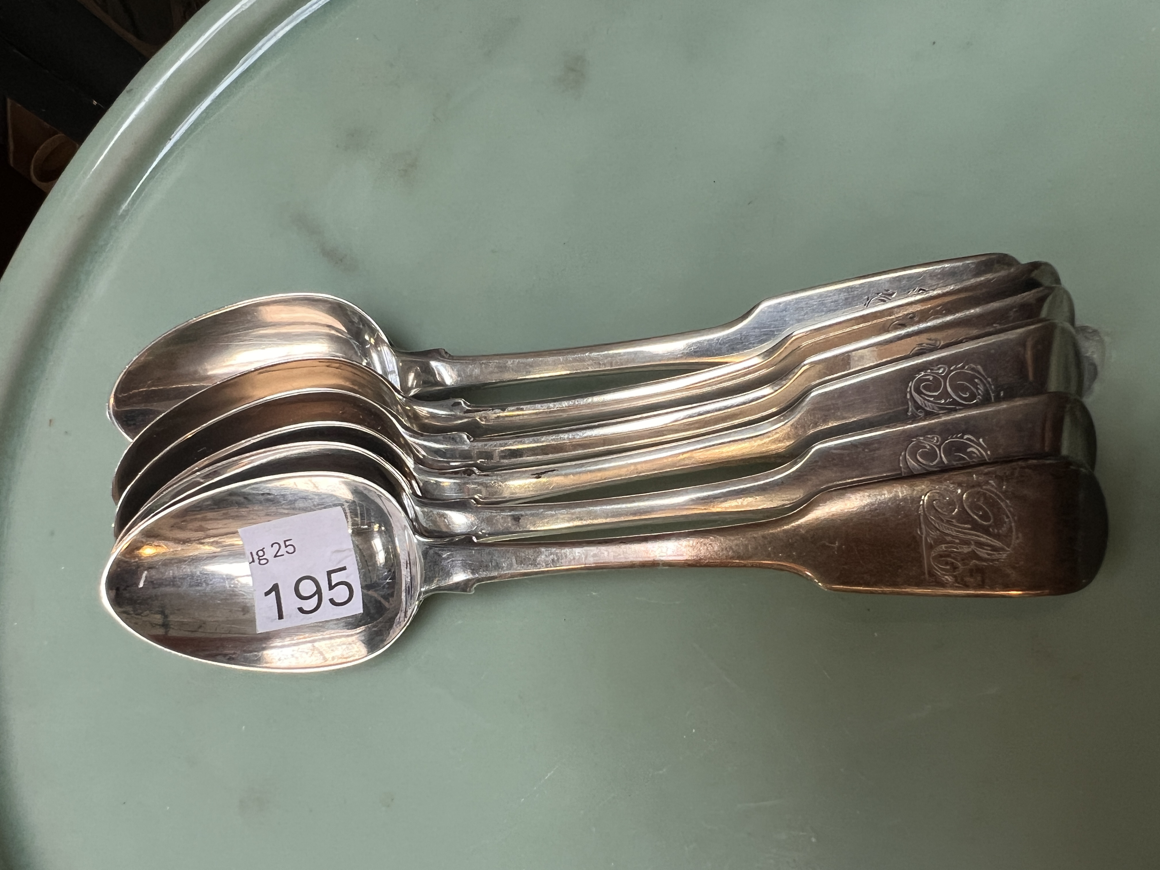 A set of six Hm silver tea spoons. 139g total.