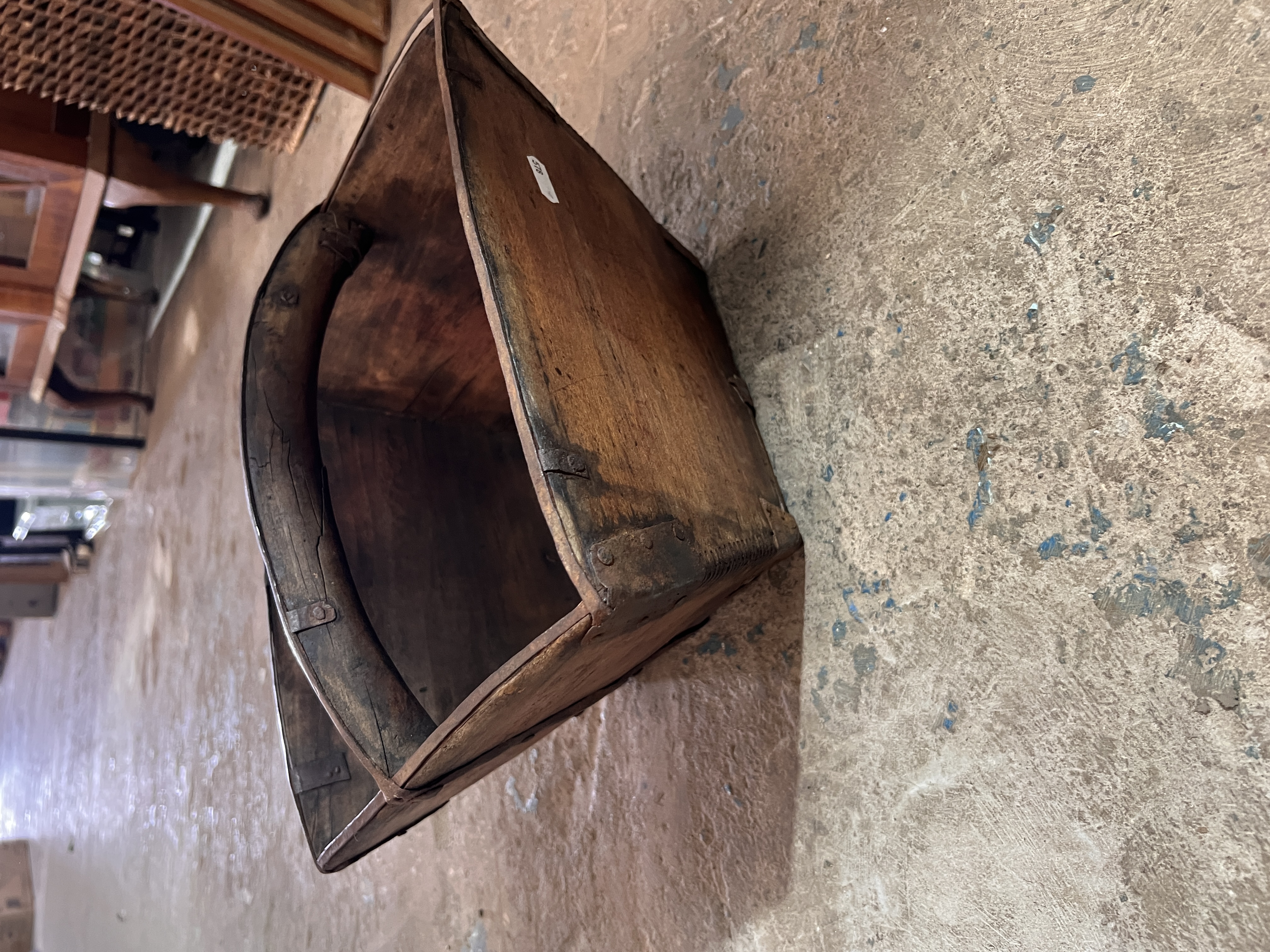 An antique wooden garden trug with metal banding.