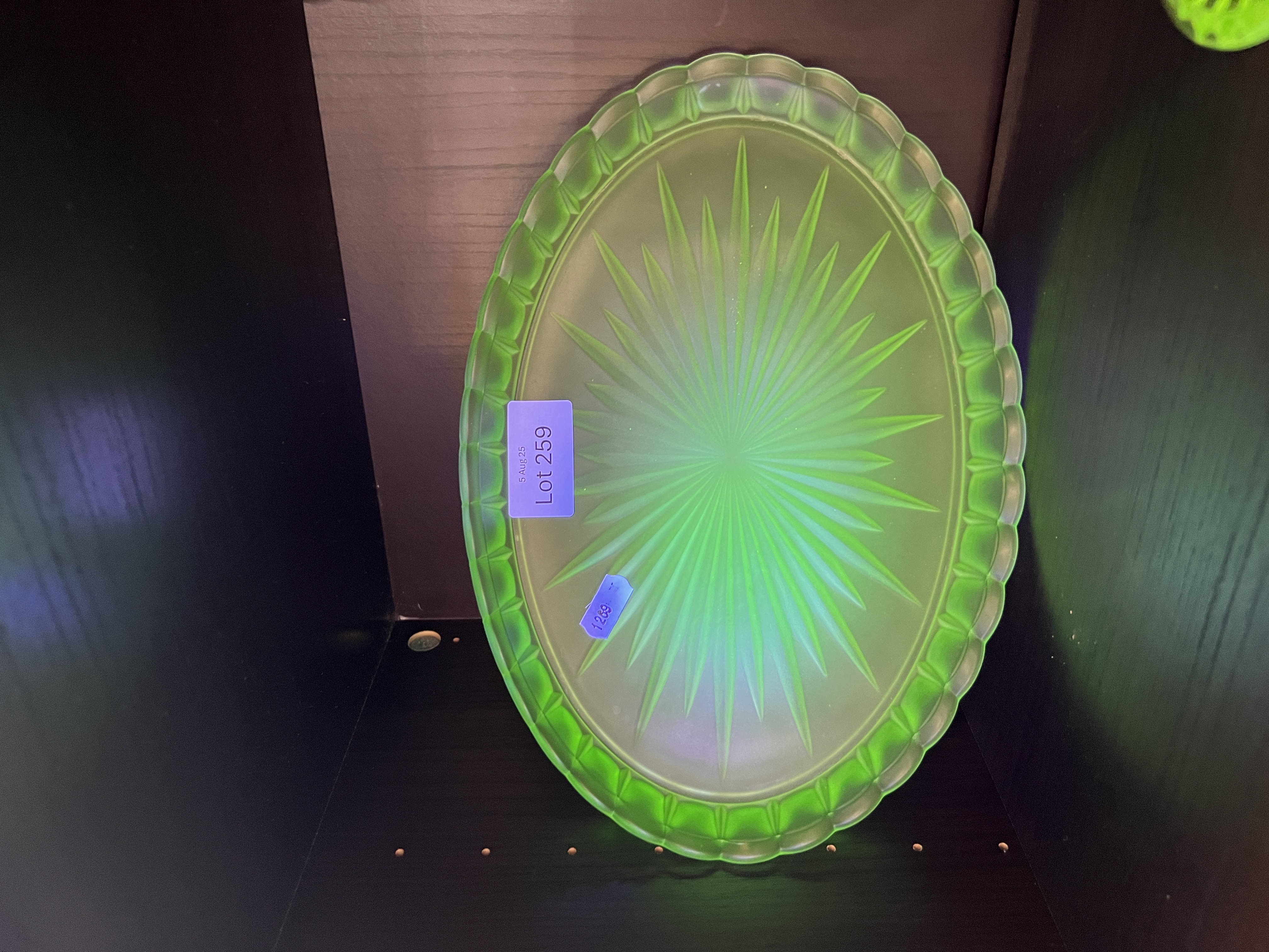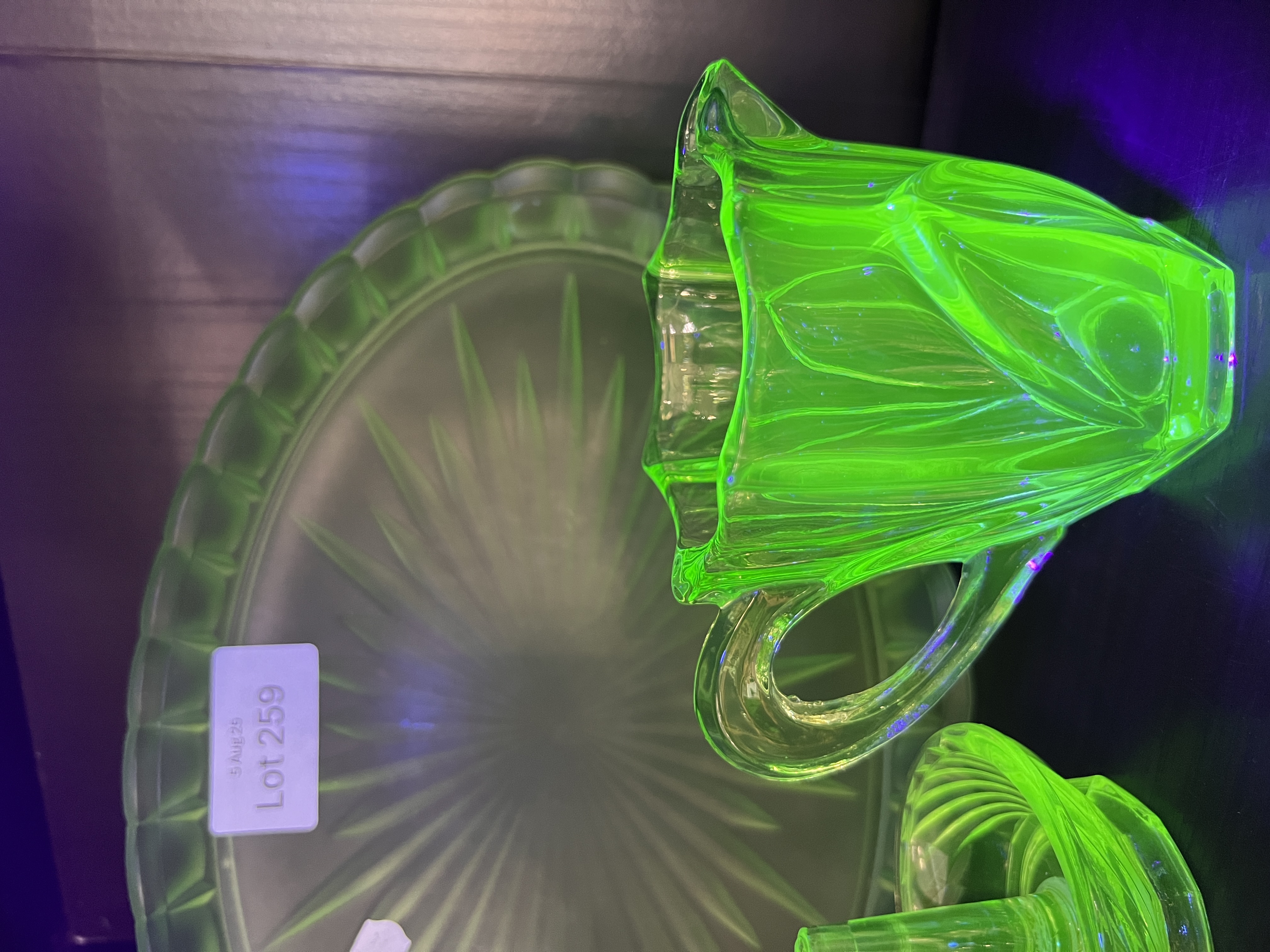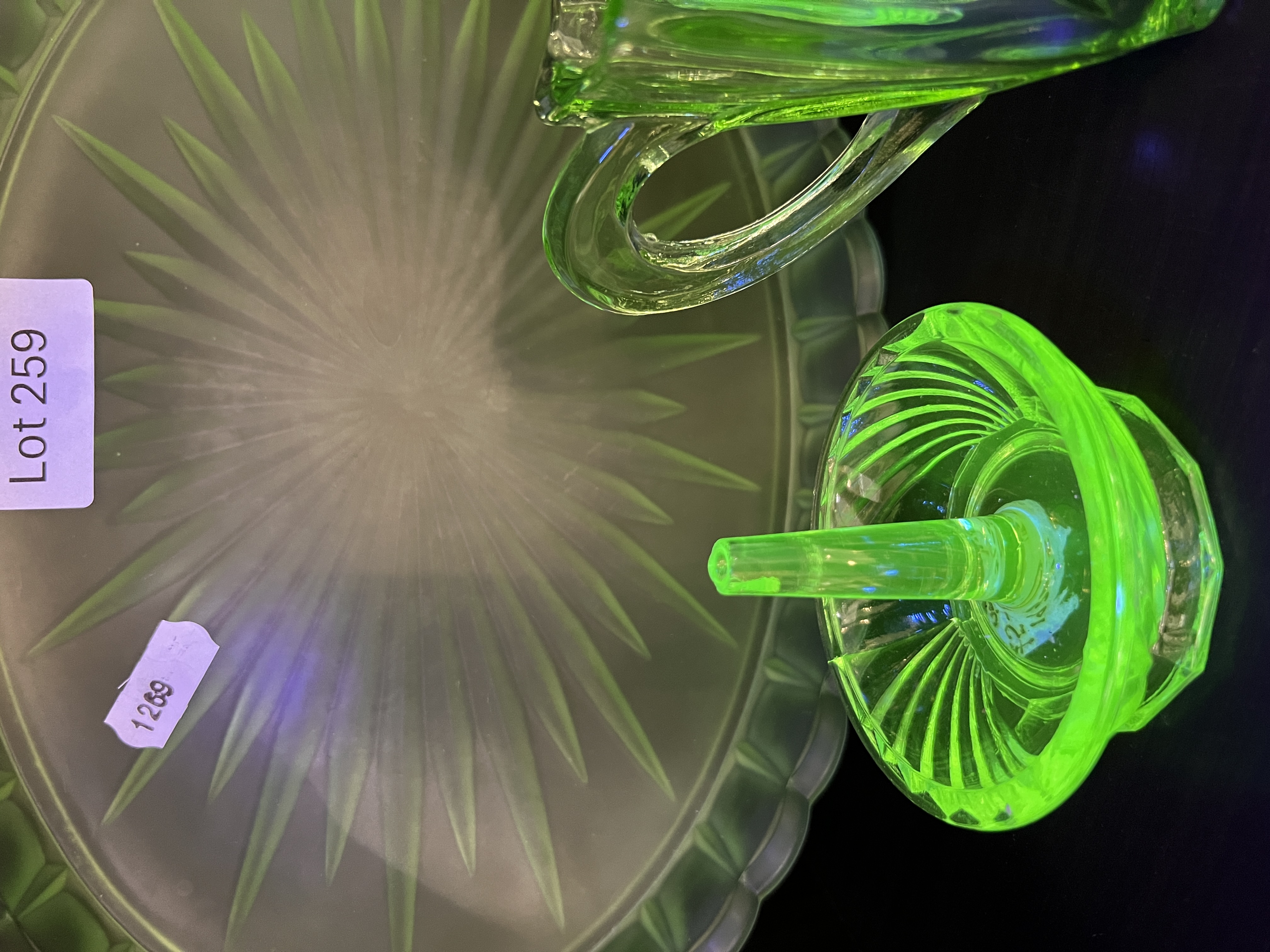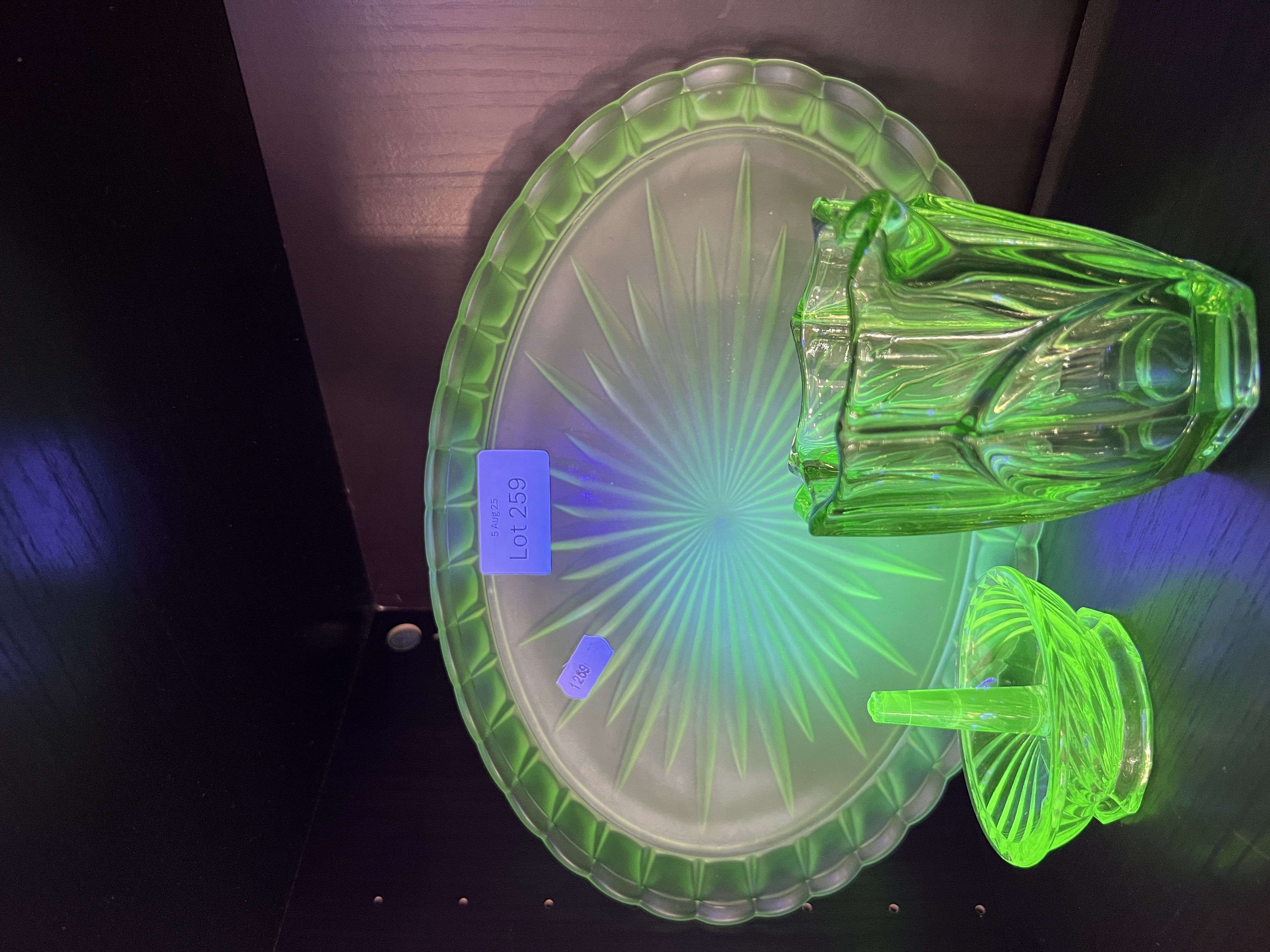 Three pieces of vintage uranium glass, including tray, ring dish and jug.