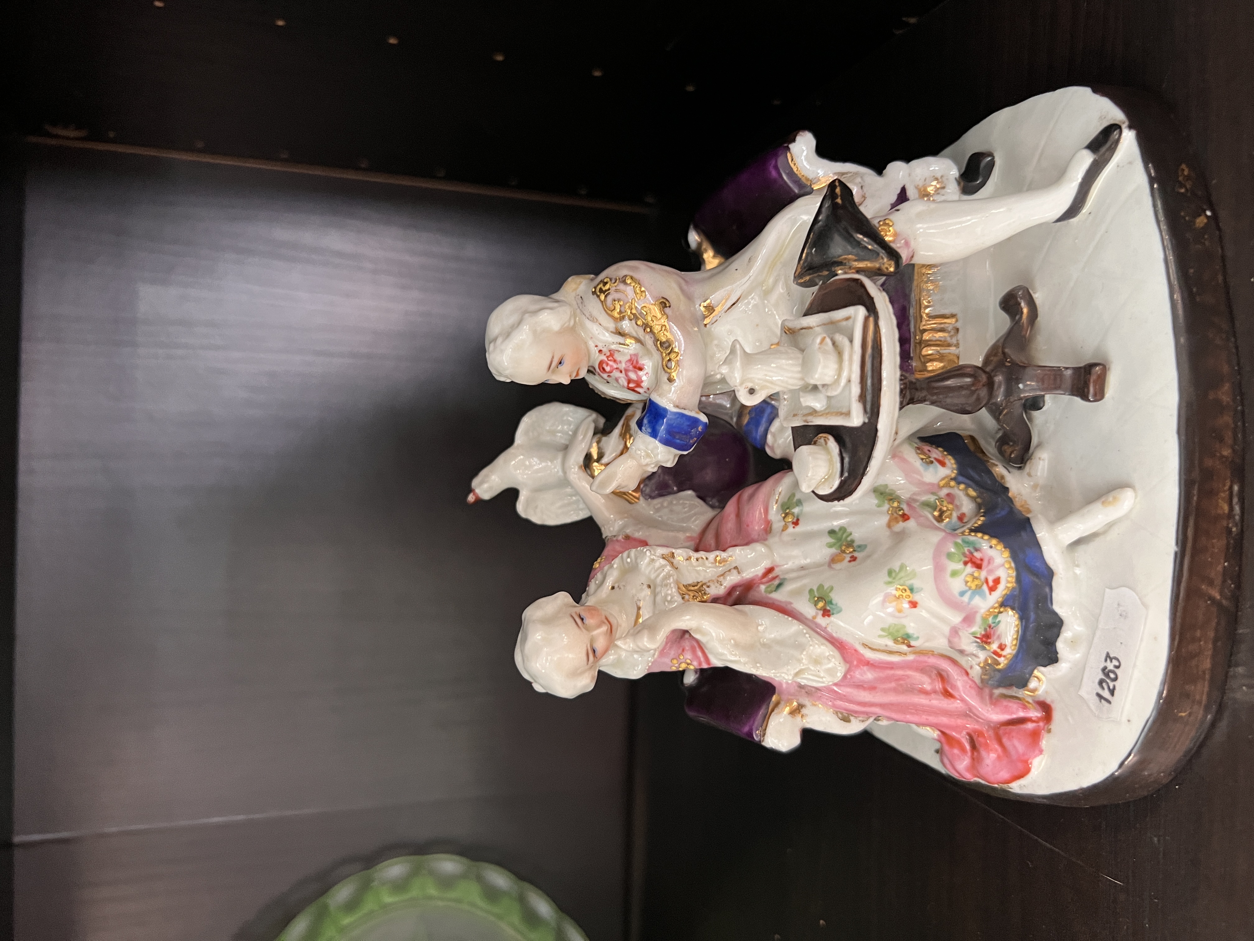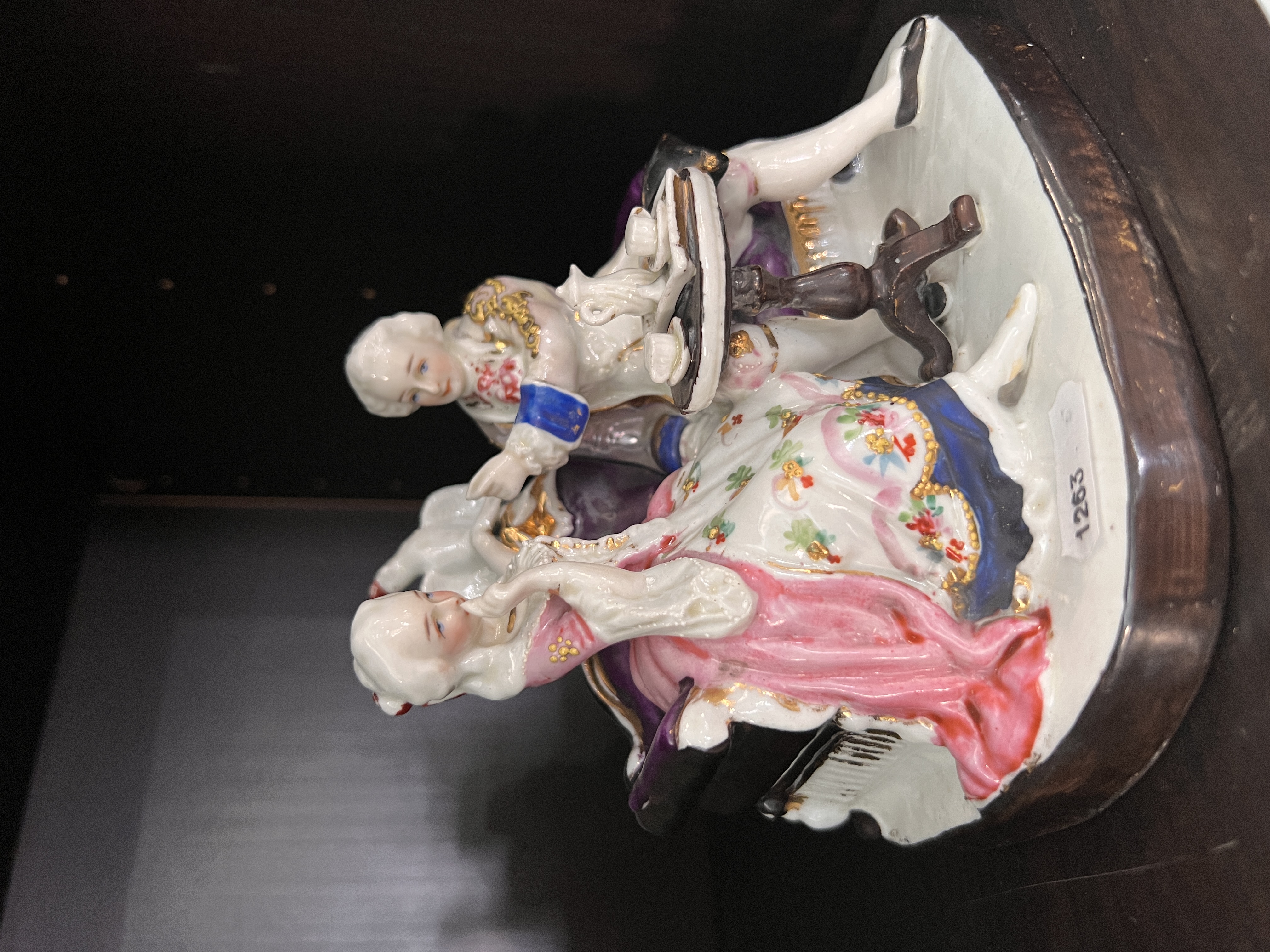An antique German porcelain Royal Dux figure group of man and lady courting.